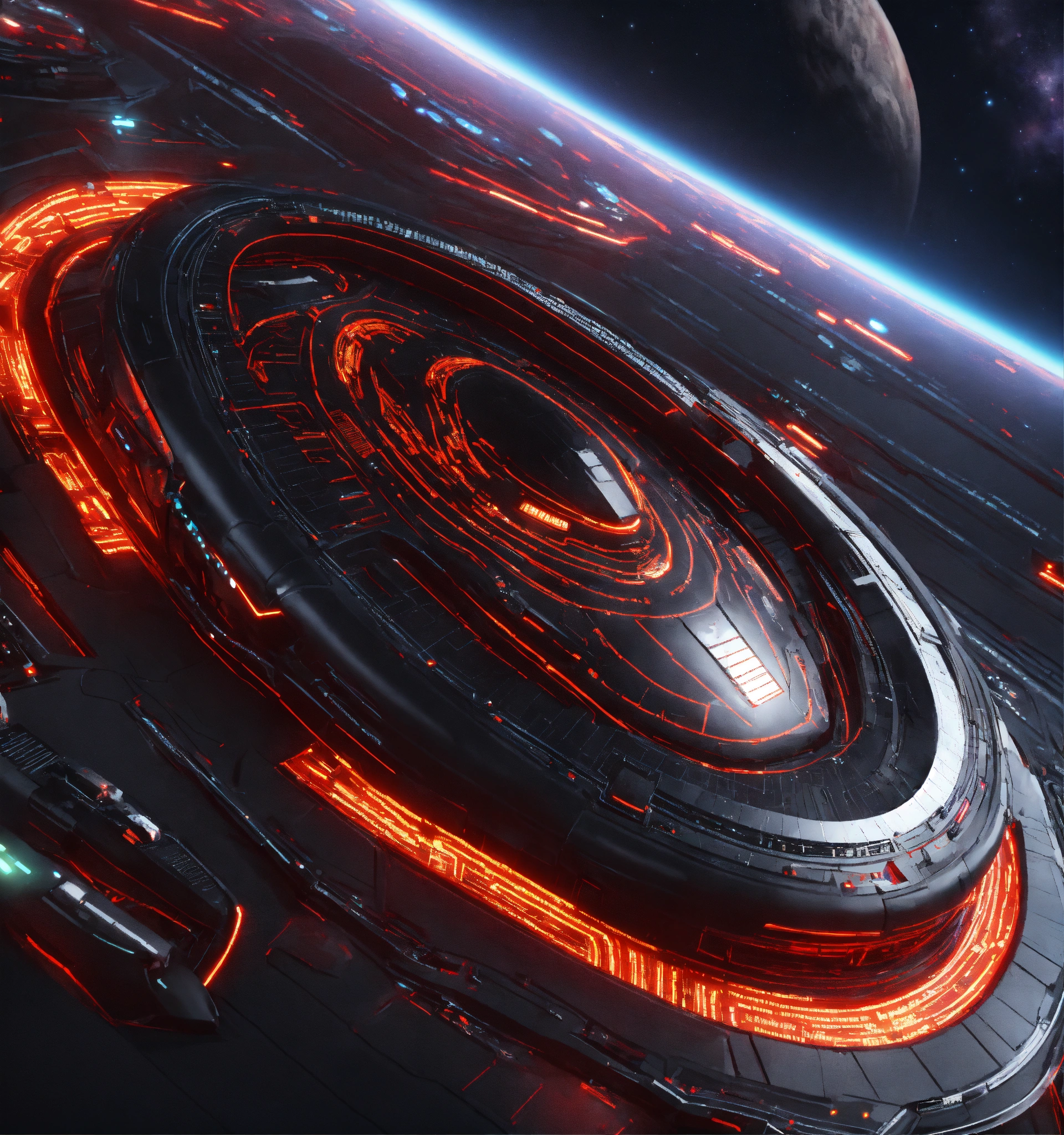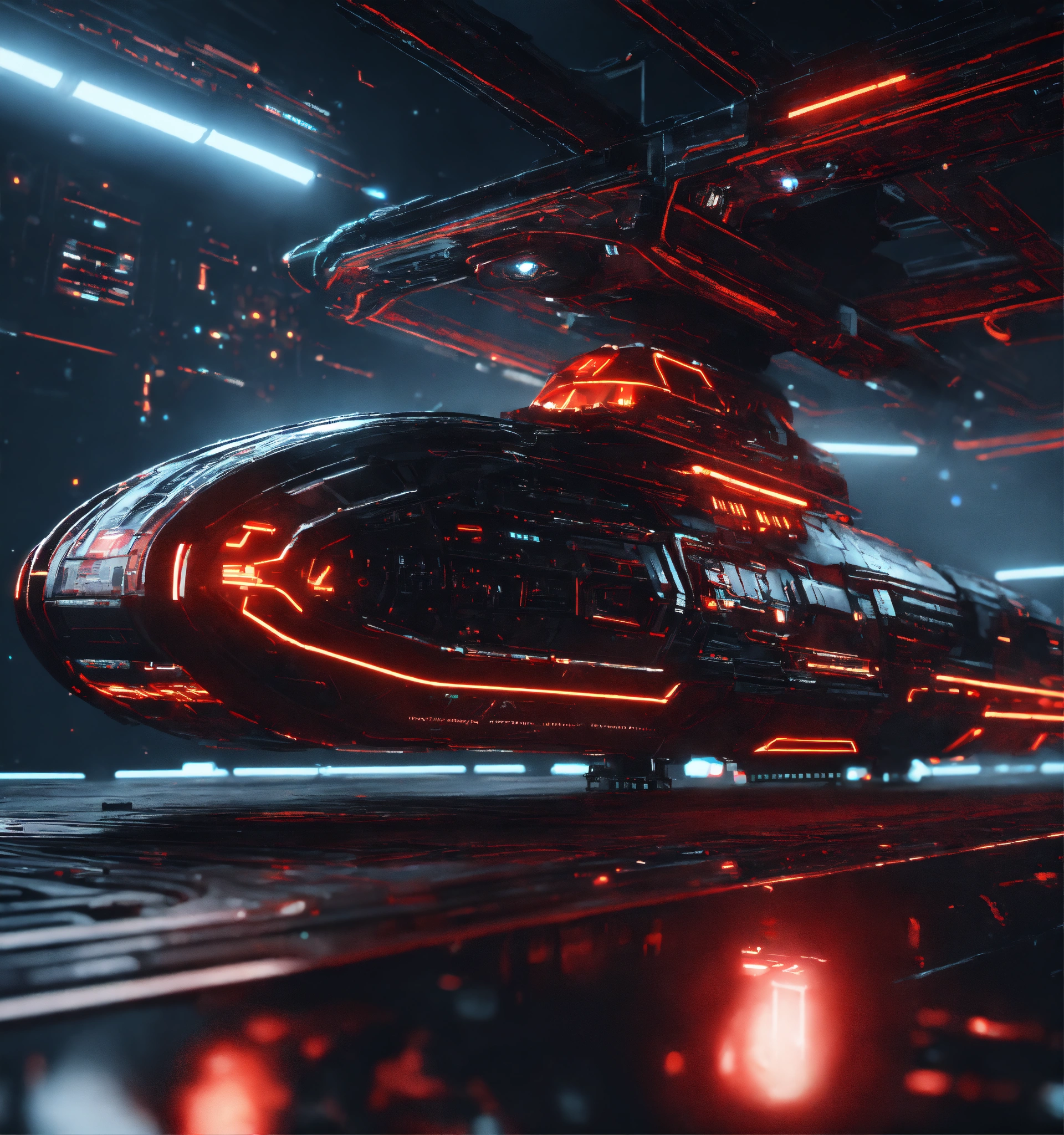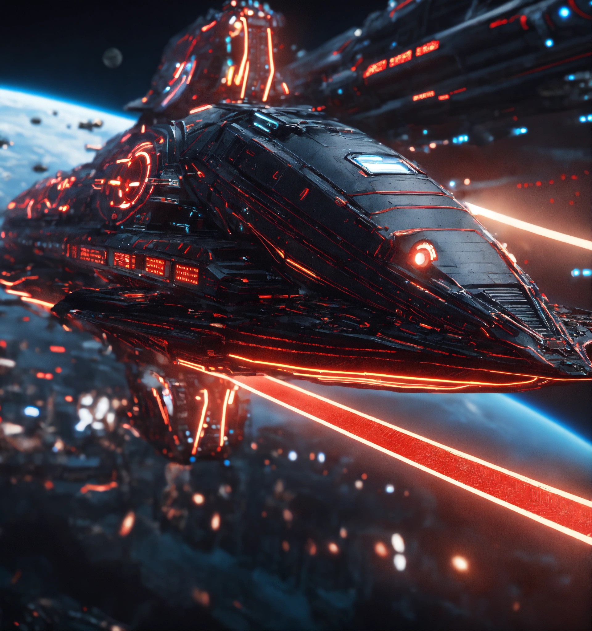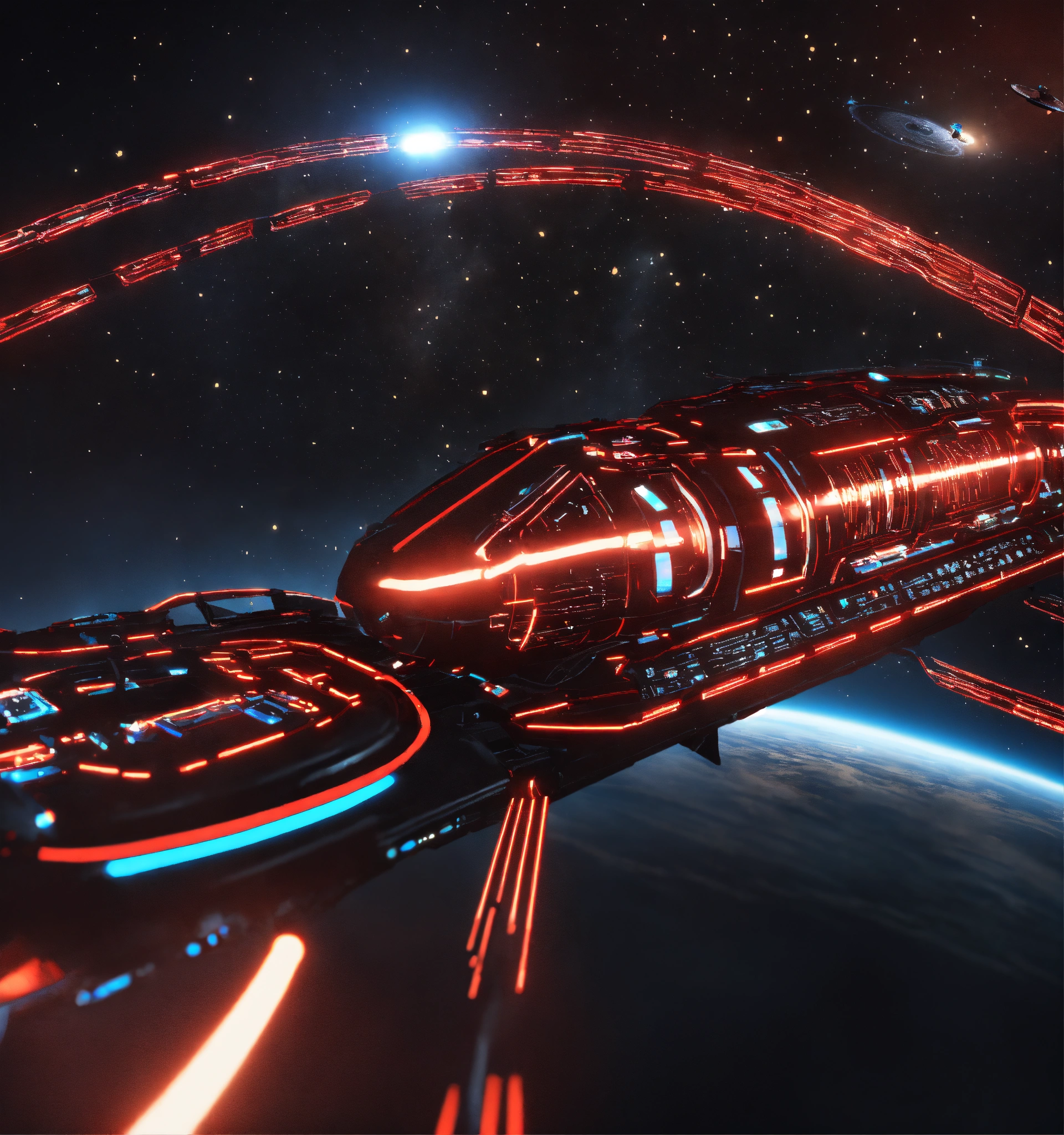 Zoom out on a long black organic worm like space ships with glowing red circuitry and markings, appear in deep space from hyperspace, realistic, 8k, tron, unreal engine