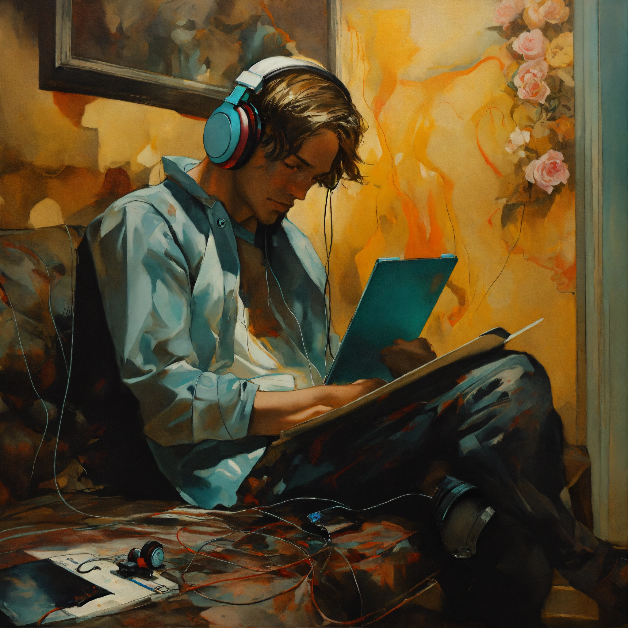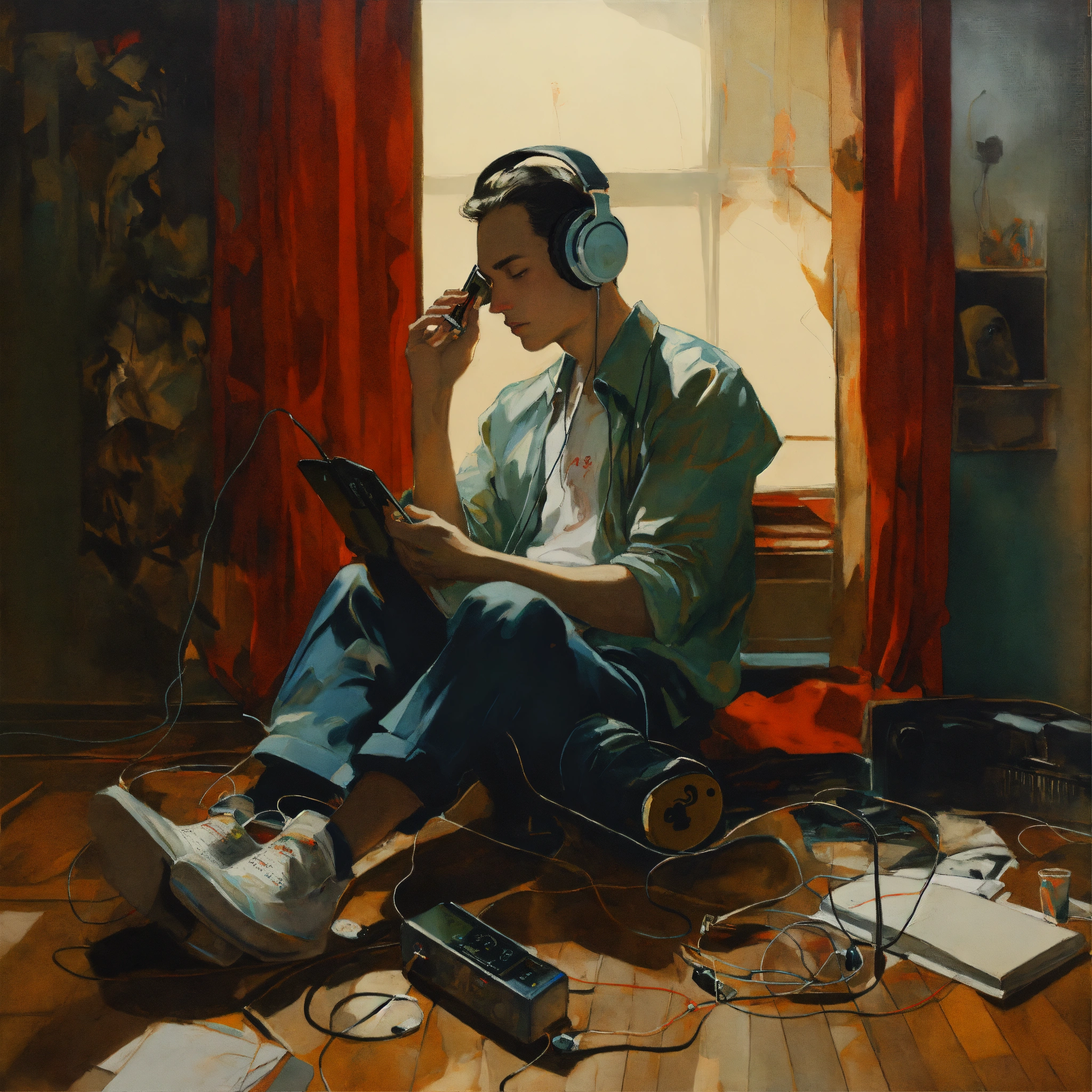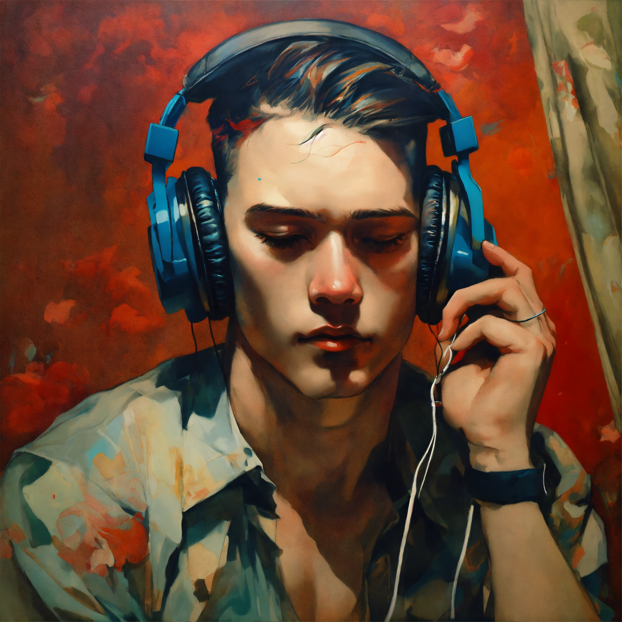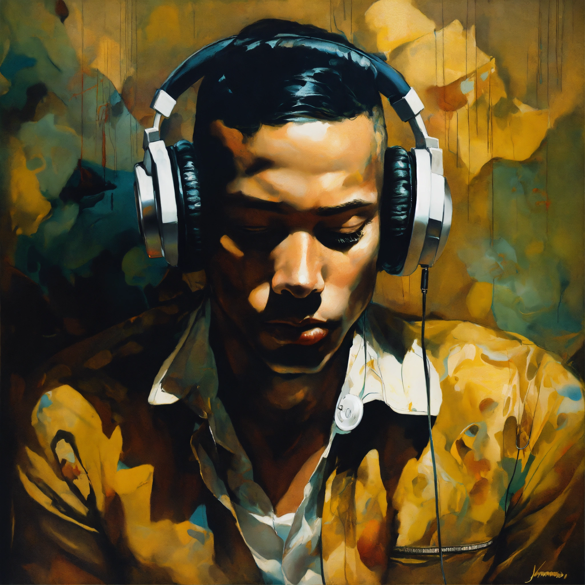 A men listening to music with headphones, in the style of adrian ghenie, esao andrews, jenny saville, edward hopper, surrealism, dark art by james jean, takato yamamoto, inkpunk minimalism