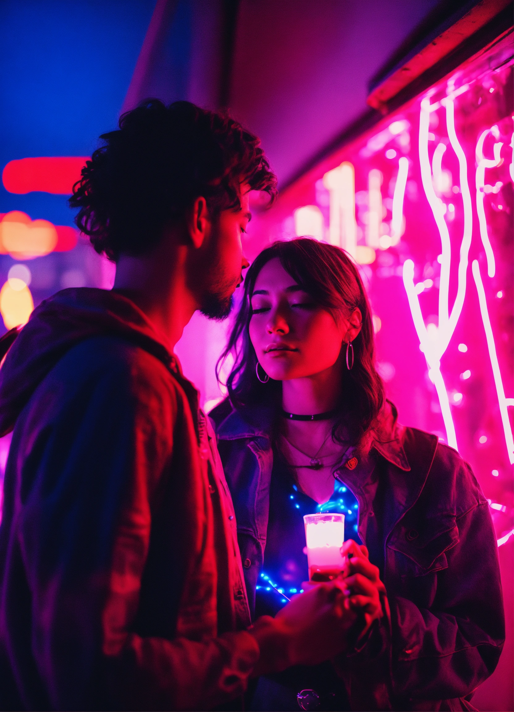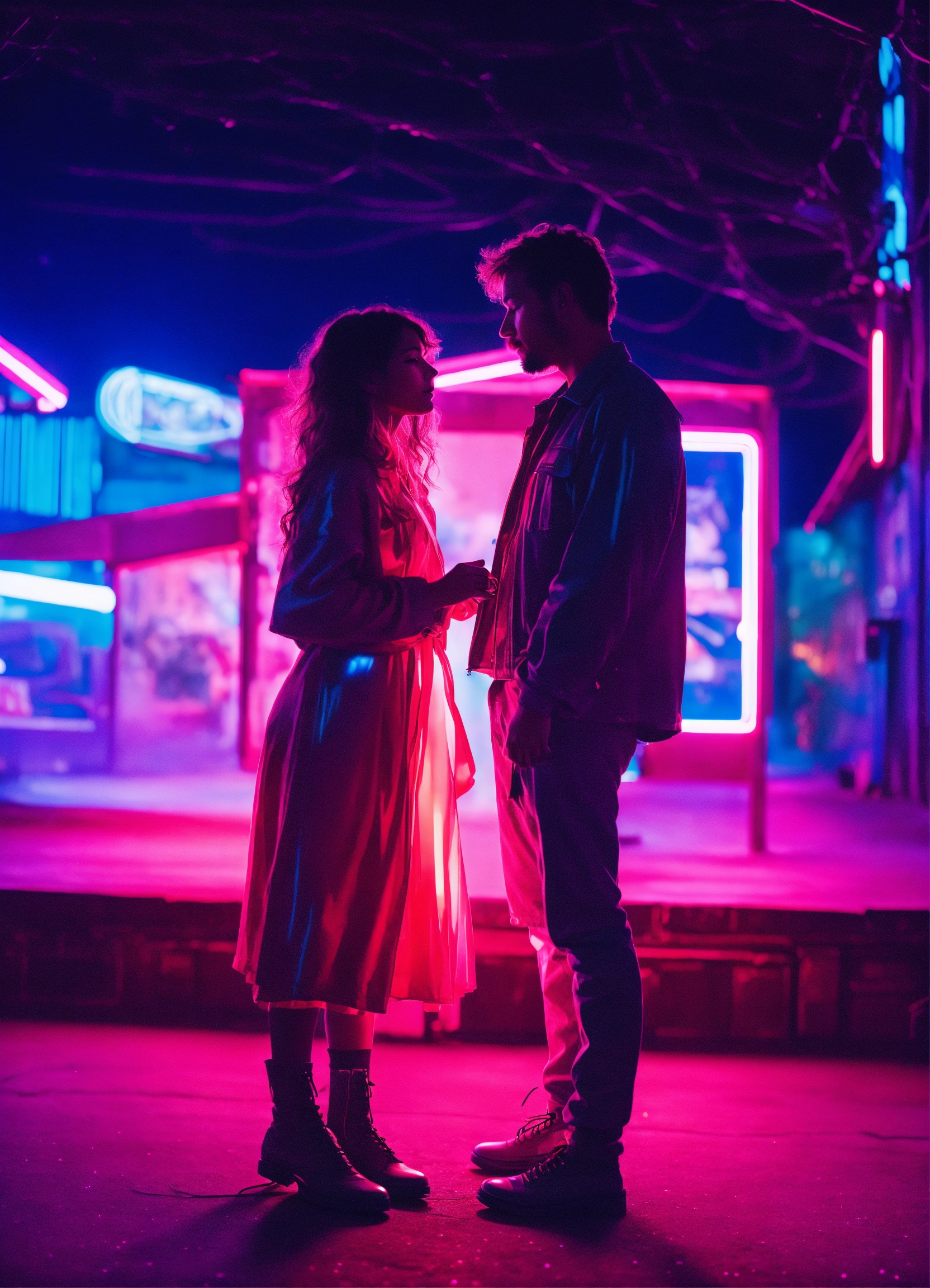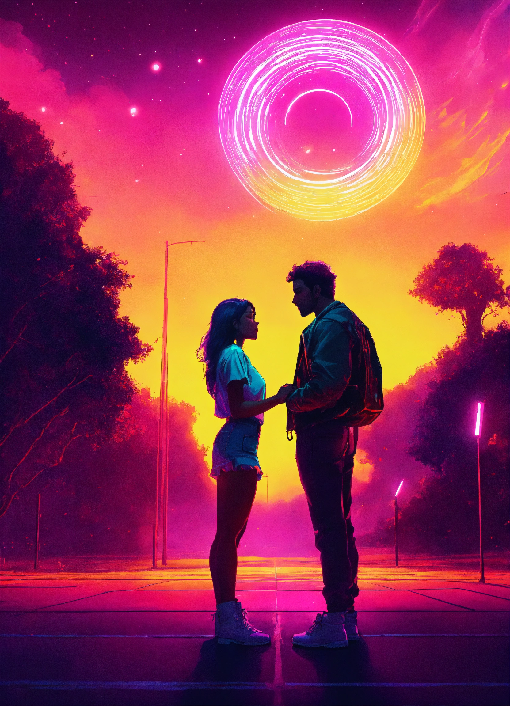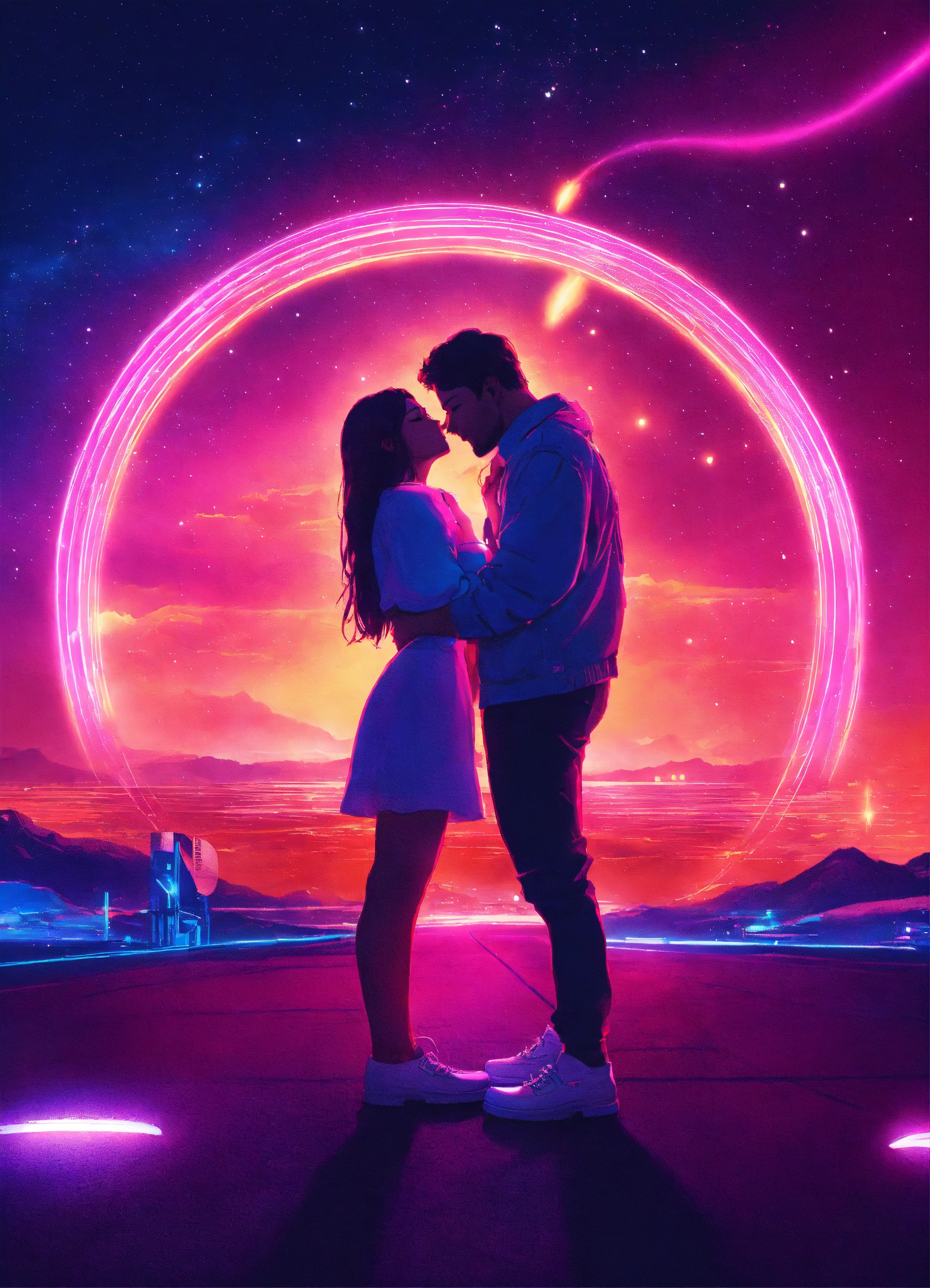 A woman and a man outside in cosmos sharing love in a spiritual way, neon lights lightly illuminate, synthwave