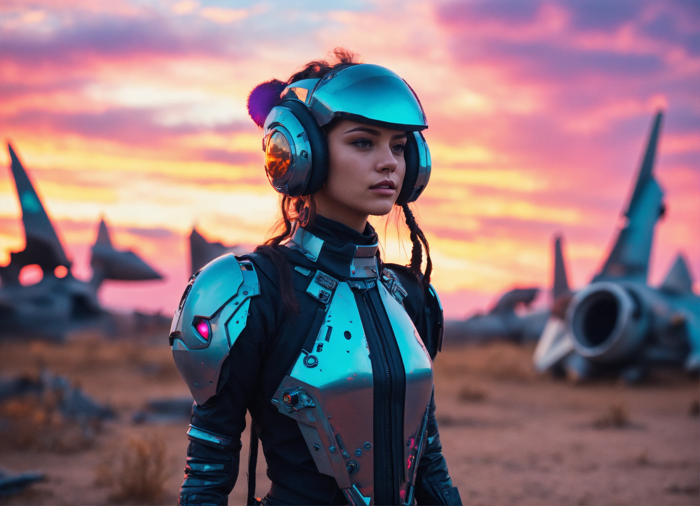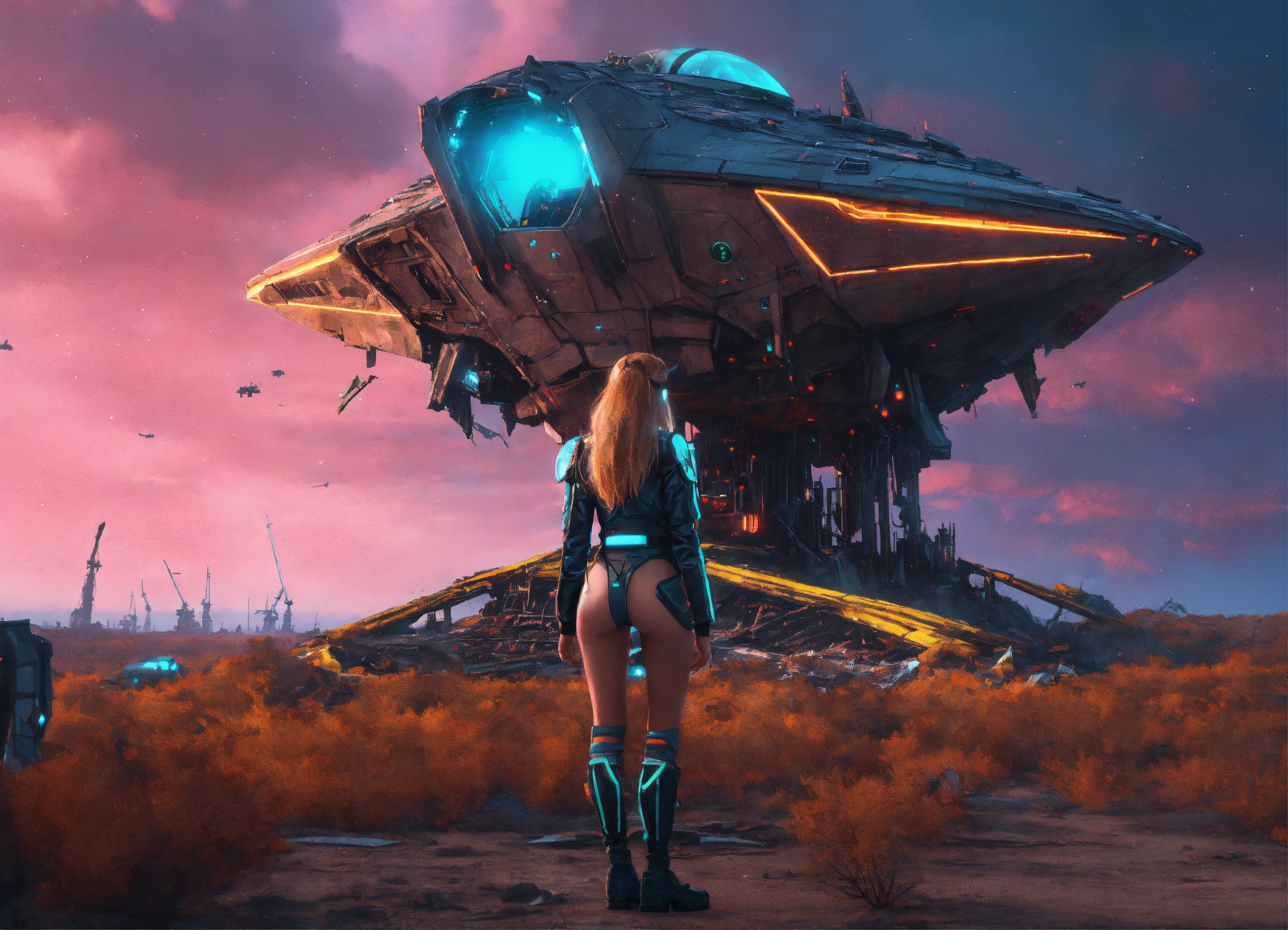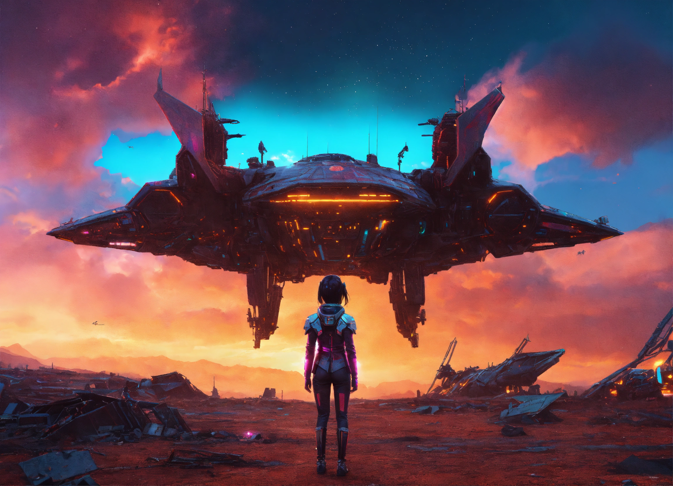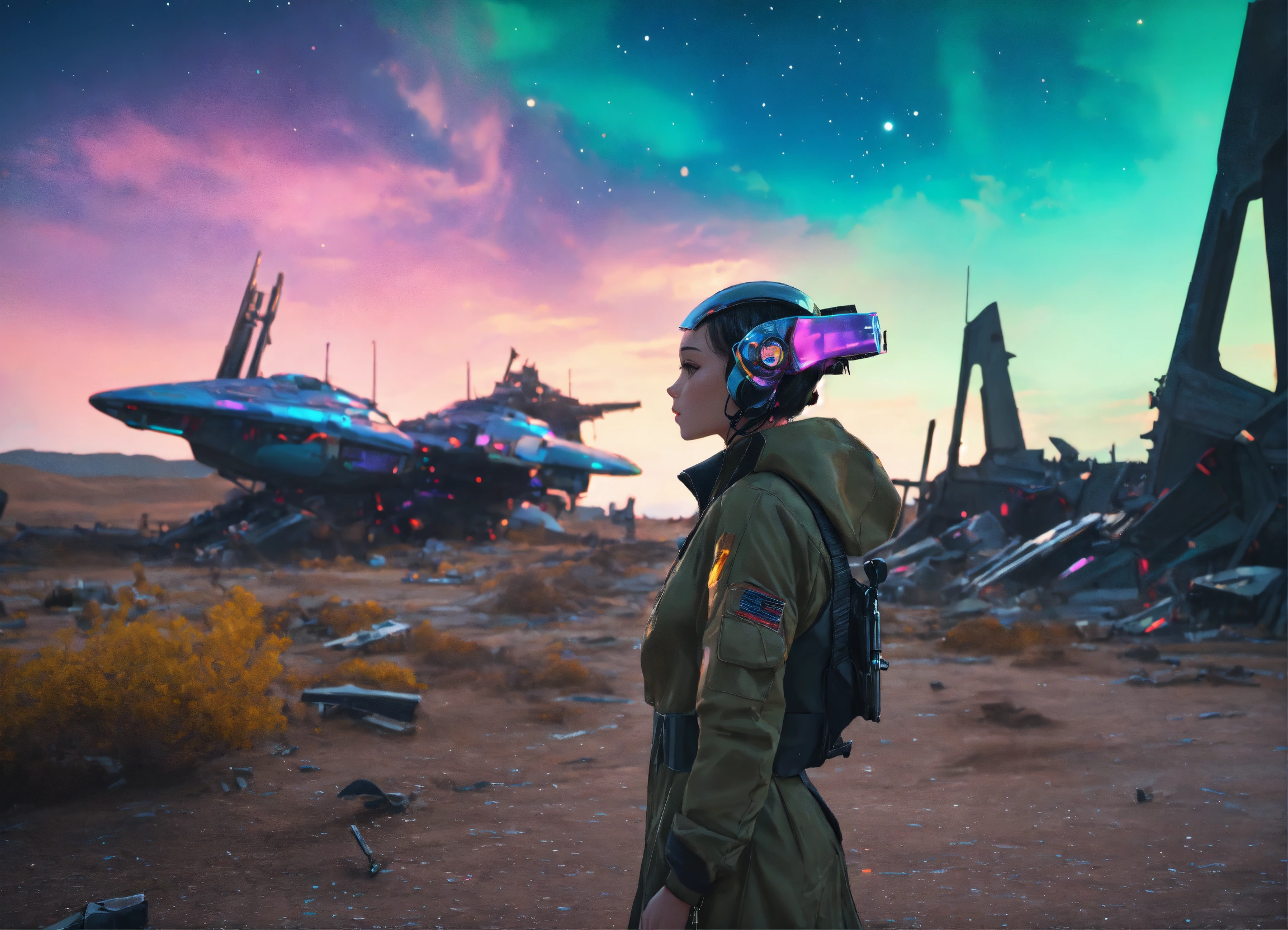 Zoom out of a girl standing outside a wrecked star fighter graveyard wearing detailed alien ear antennas with futuristic clothing, colorful sky, futuristic, sci-fi, realistic, 8k