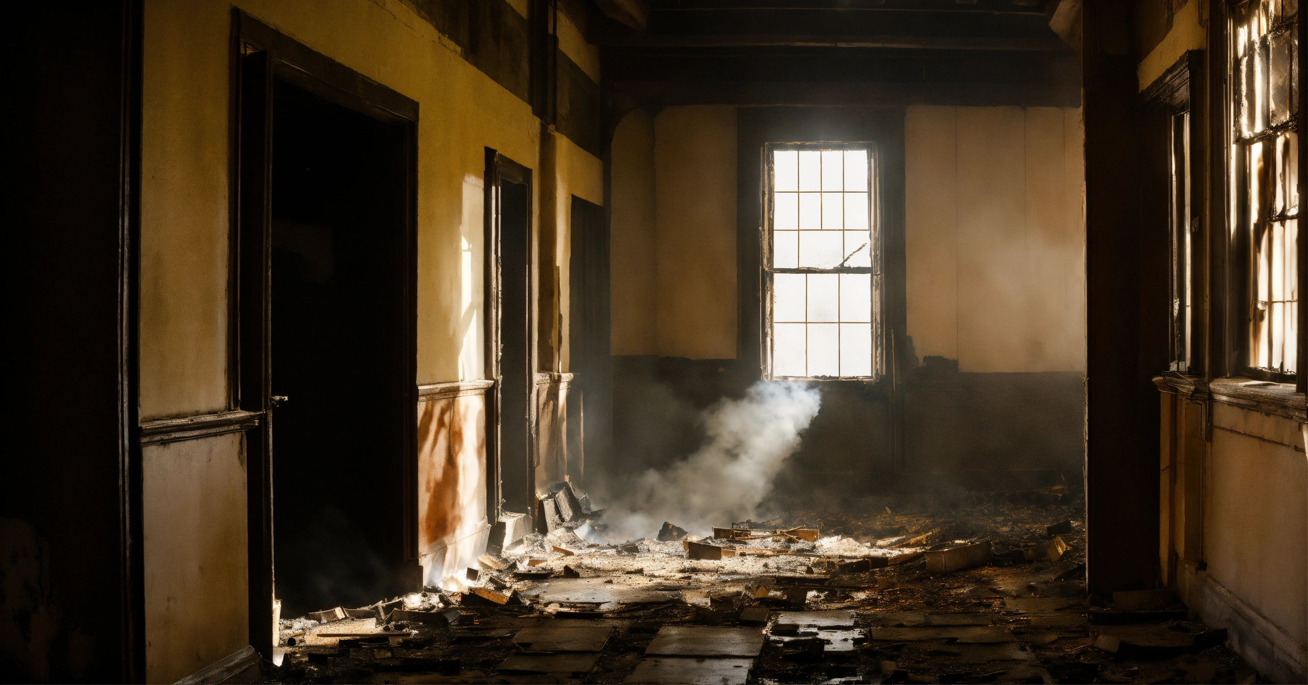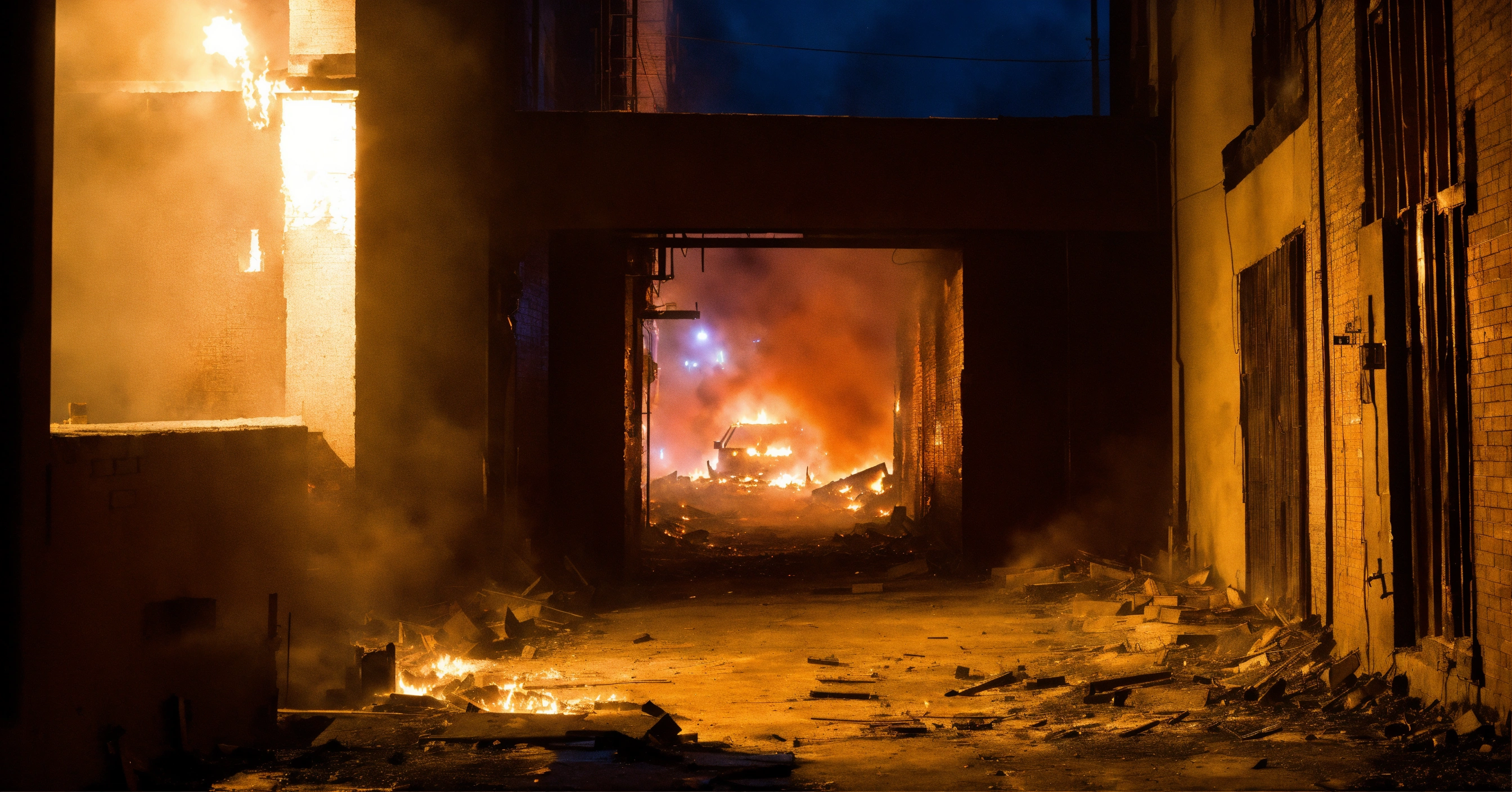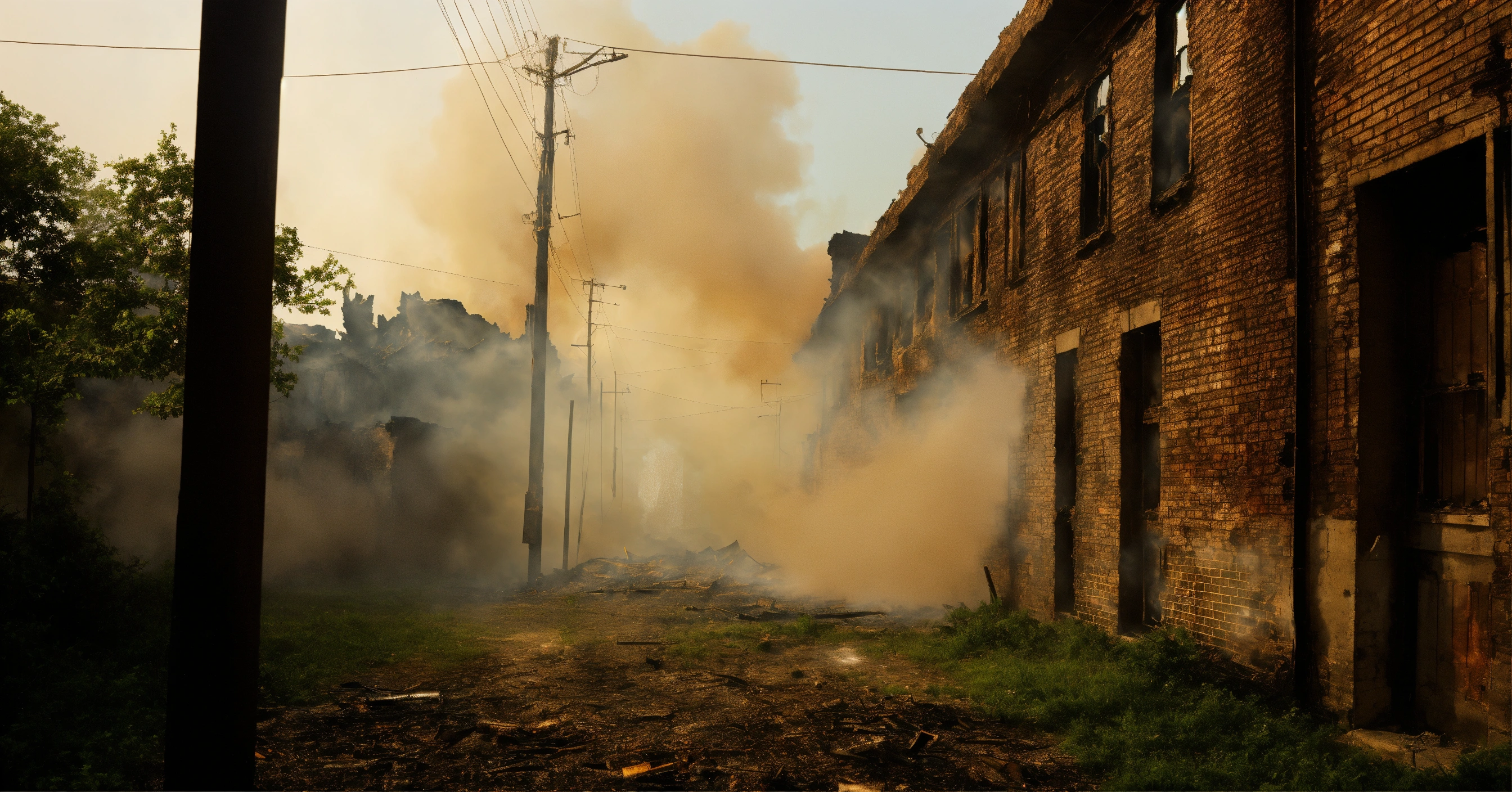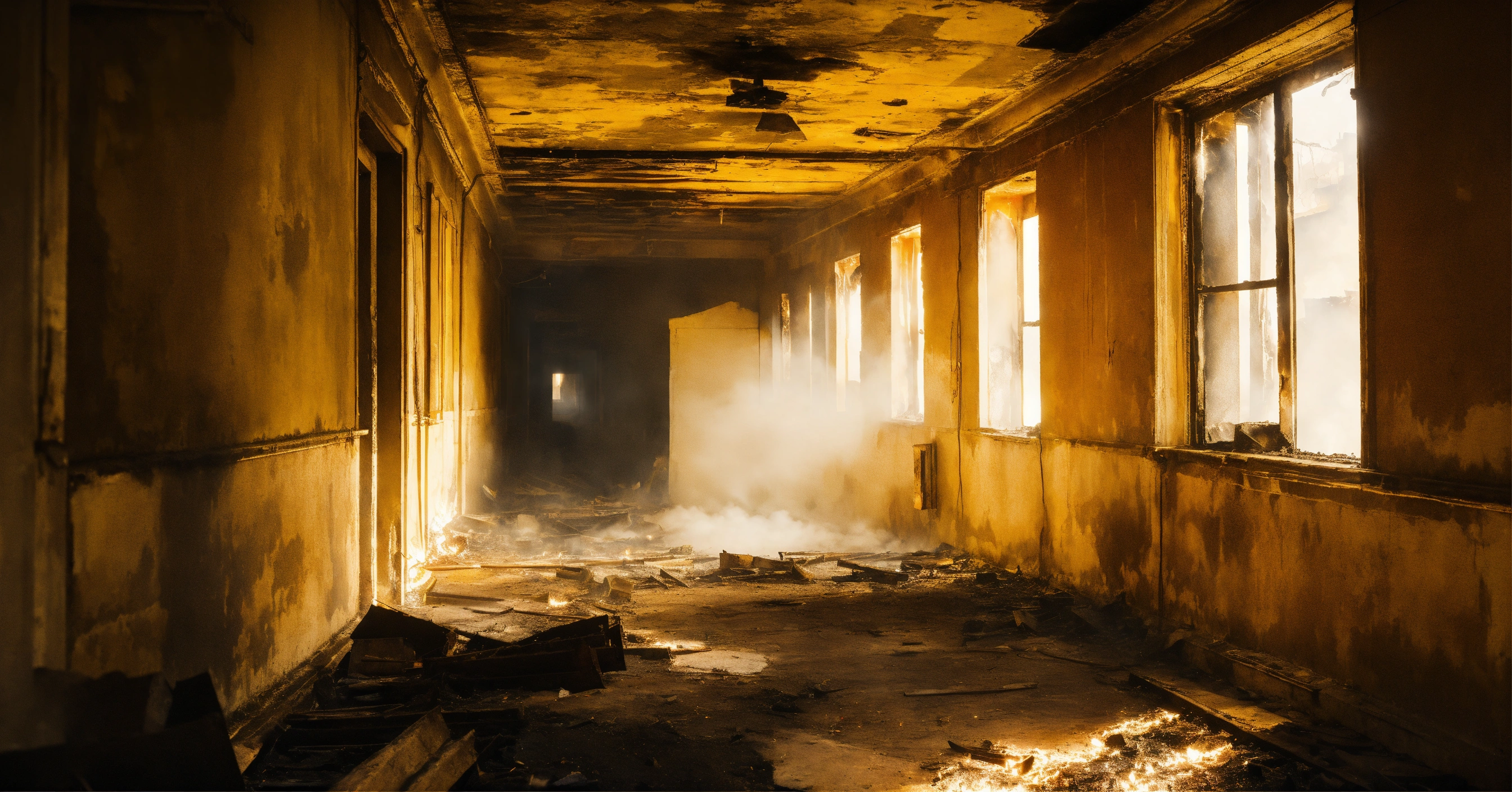 Old fire explosion fog threat obscured small narrow corridor ruins police fallen balk no windows