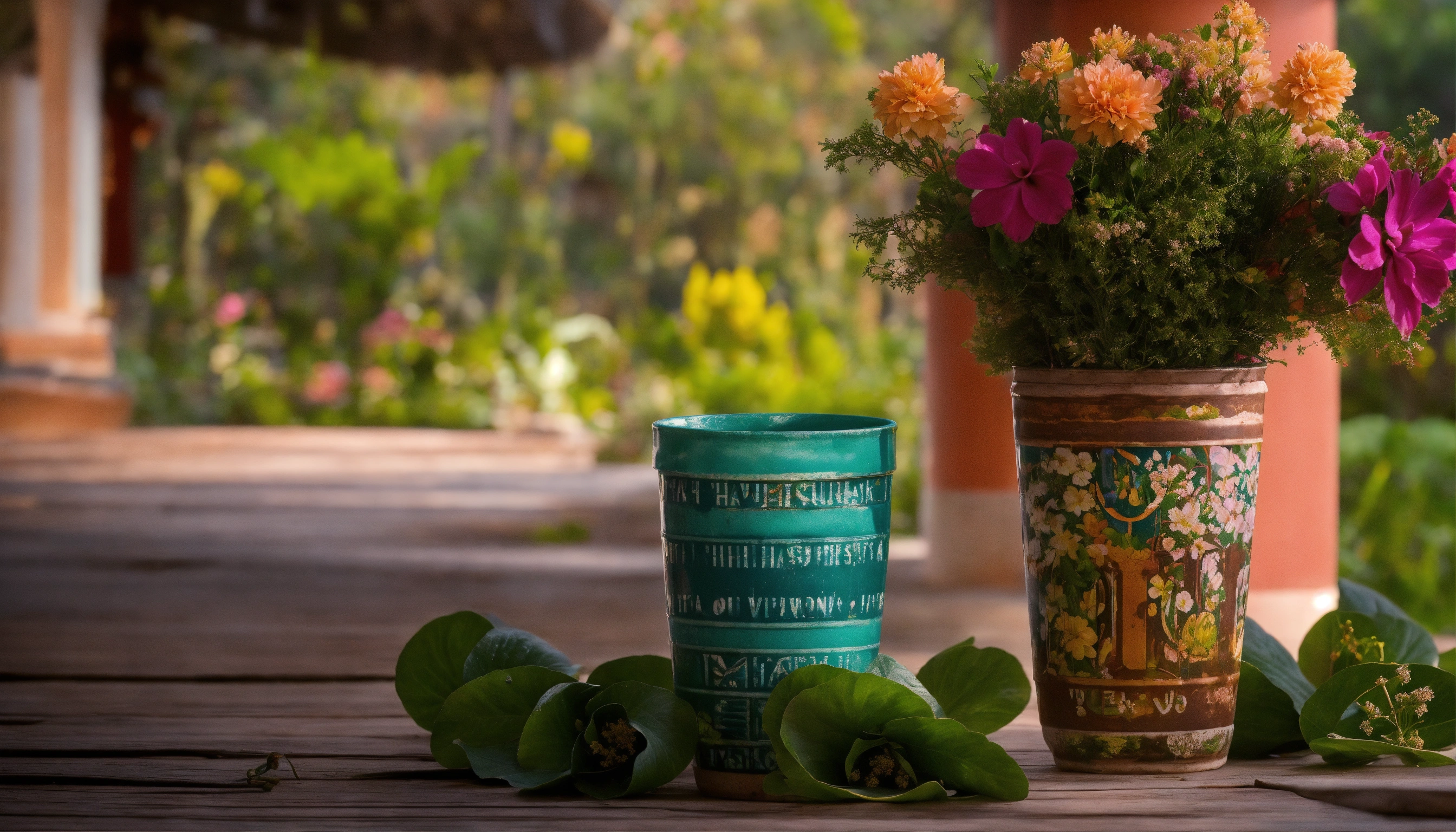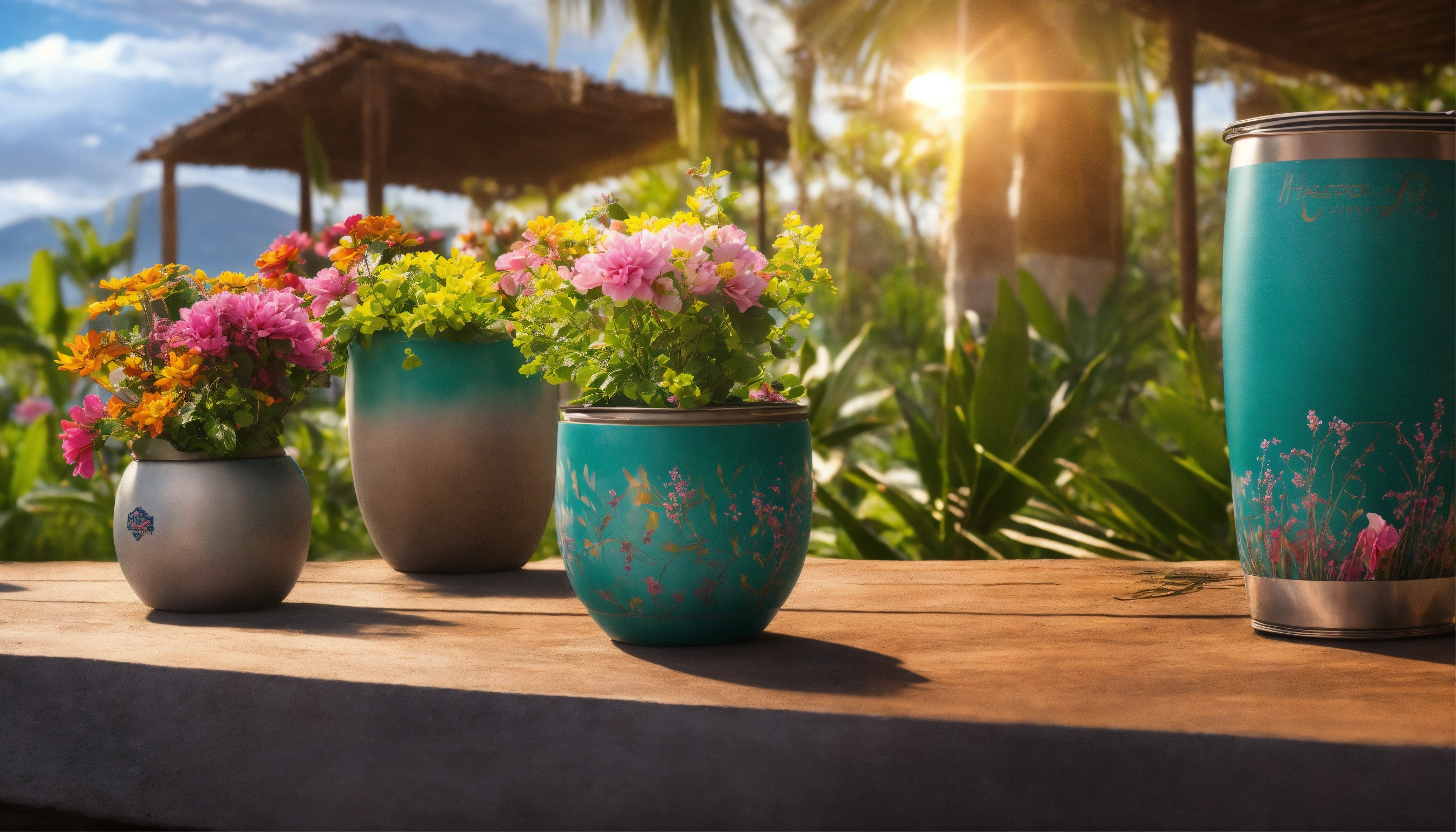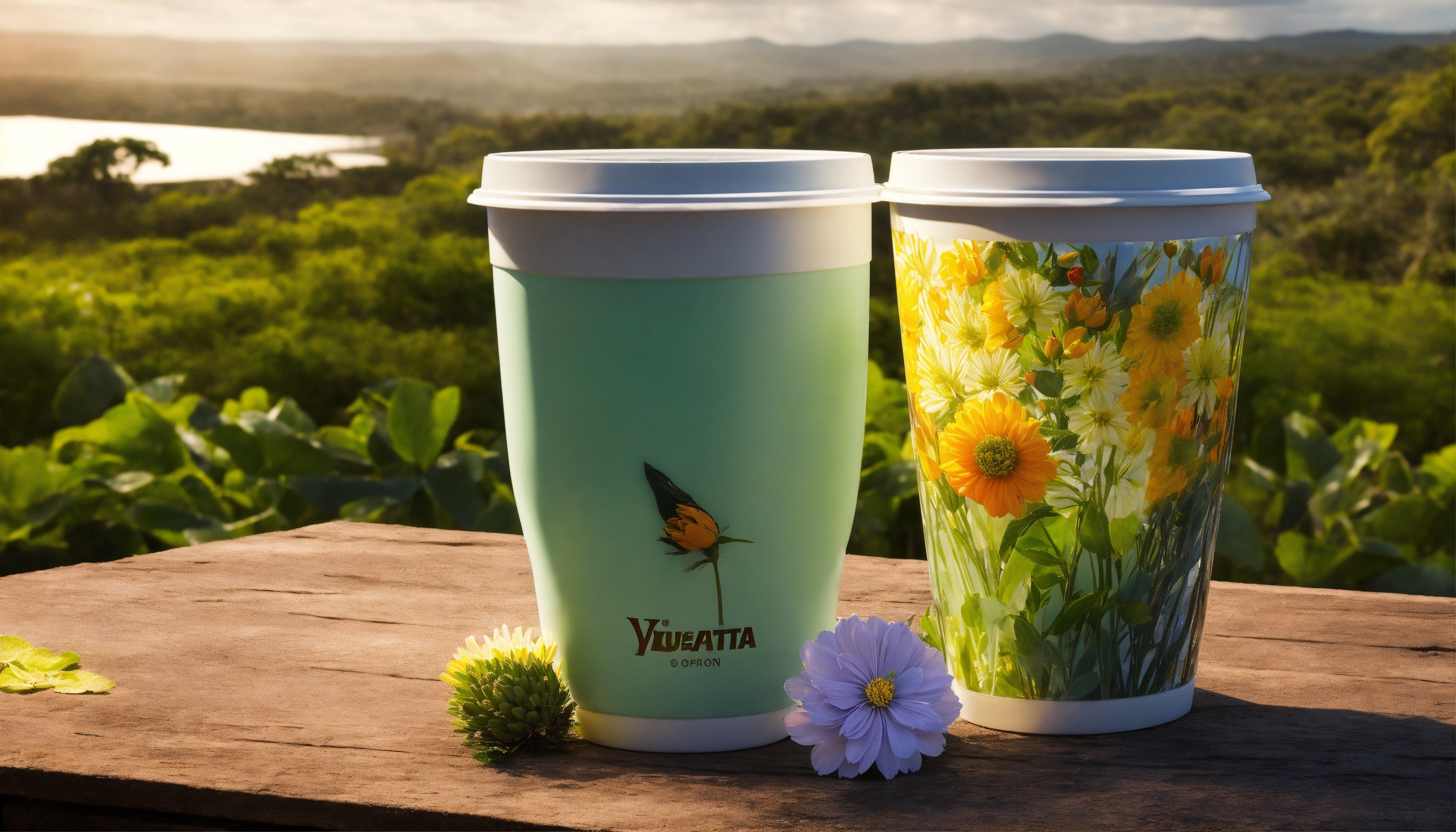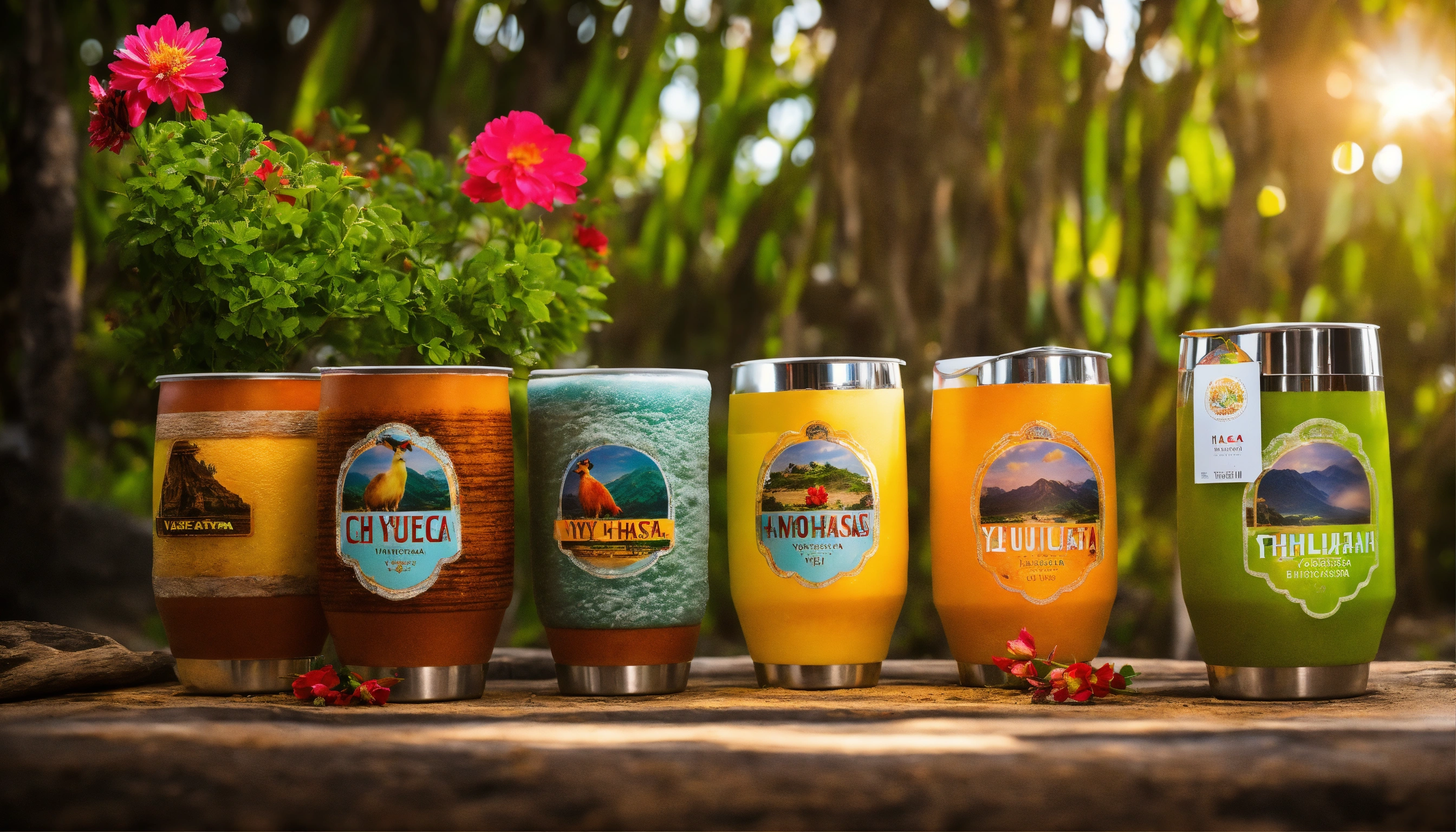 Imagen realista tipo fotográfica de producto de vasos tipo yeti en locaciones y ambientacion yucateca como haciendas y flores