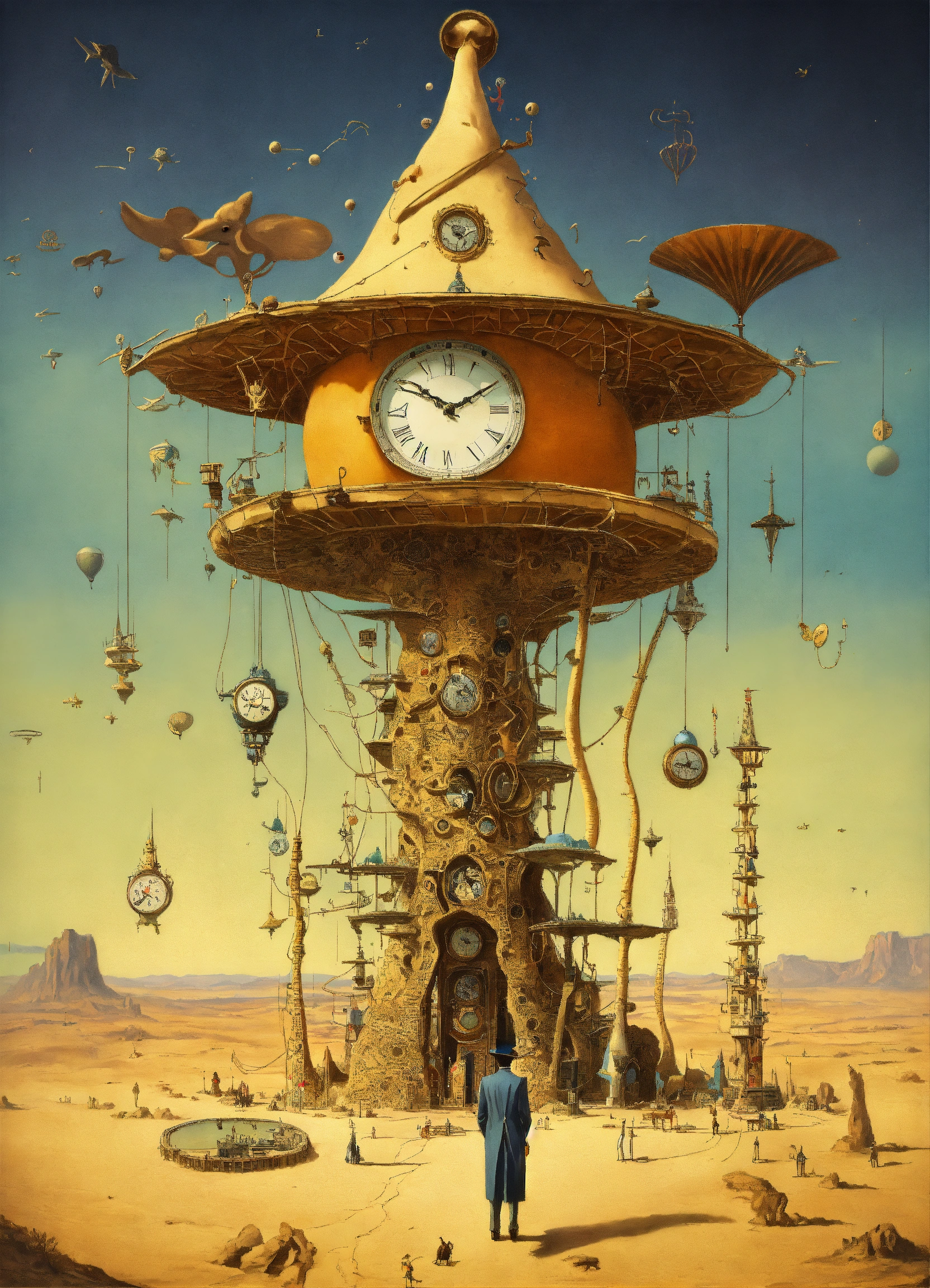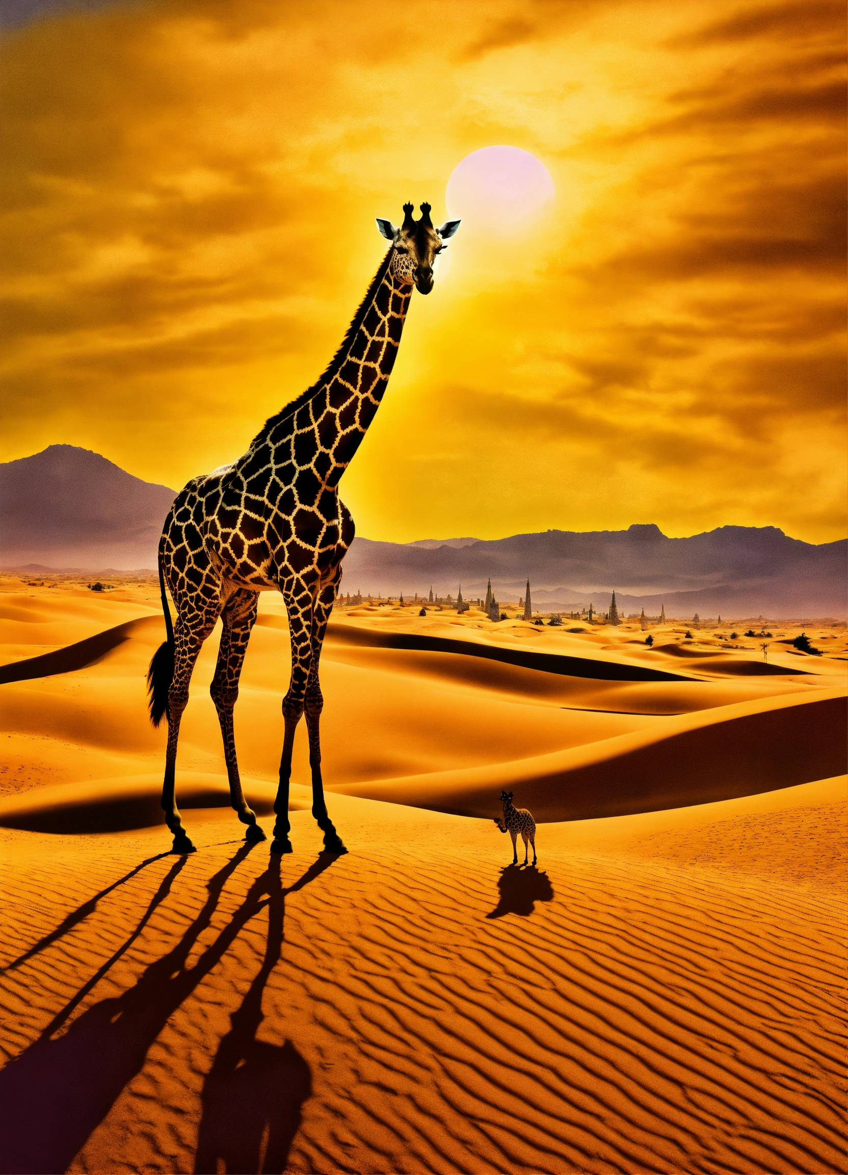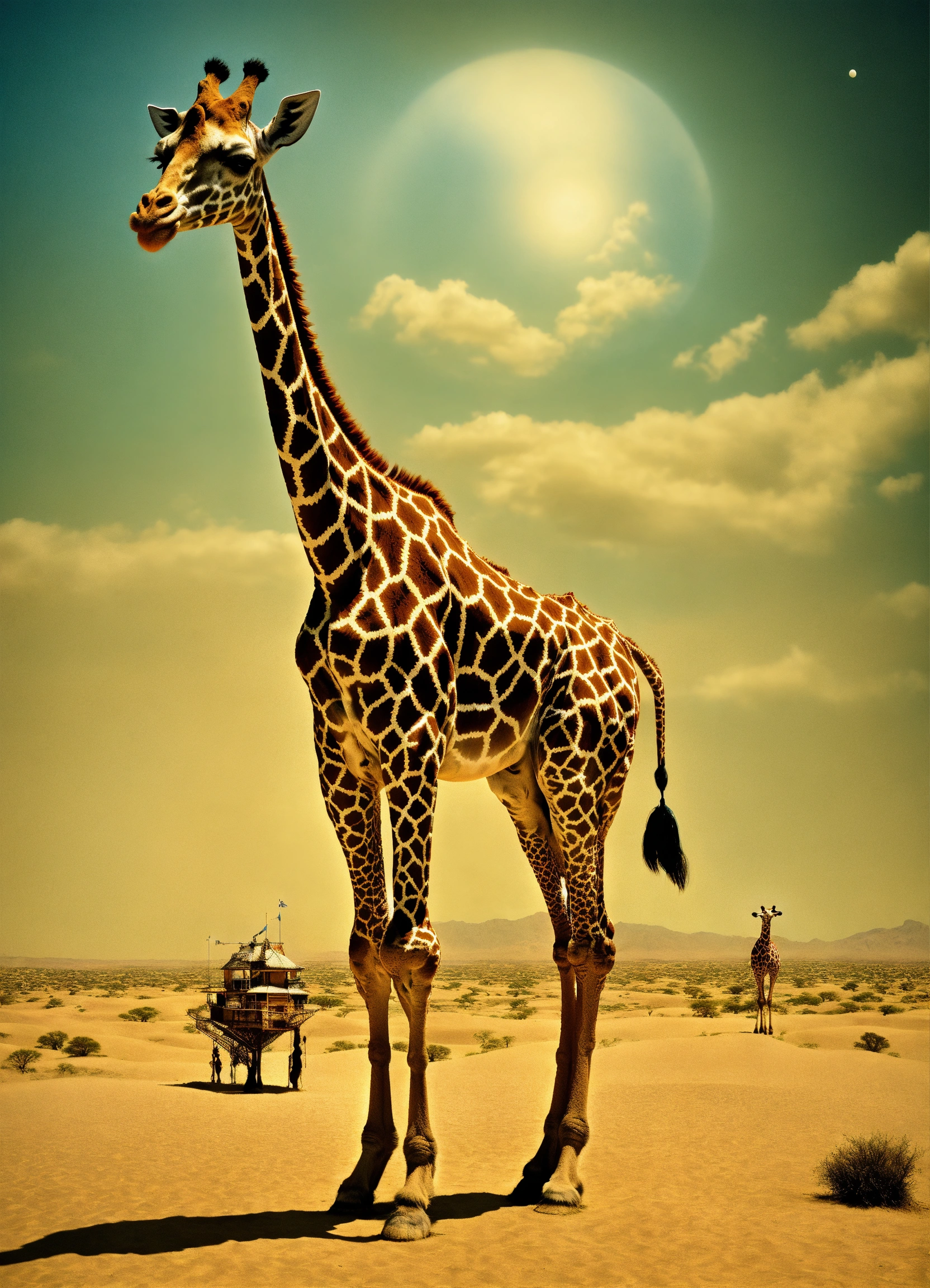 "surrealist image of a desert, whimsical, salvador dalí, yves tanguy, rené magritte, yoshikata amano, sui ishida, intricately detailed, surrealist artwork, long legged whimsical giraffe, clocks, towers, wide-angle lens, beautiful, astral, landscape, mysterious, complementary colors"