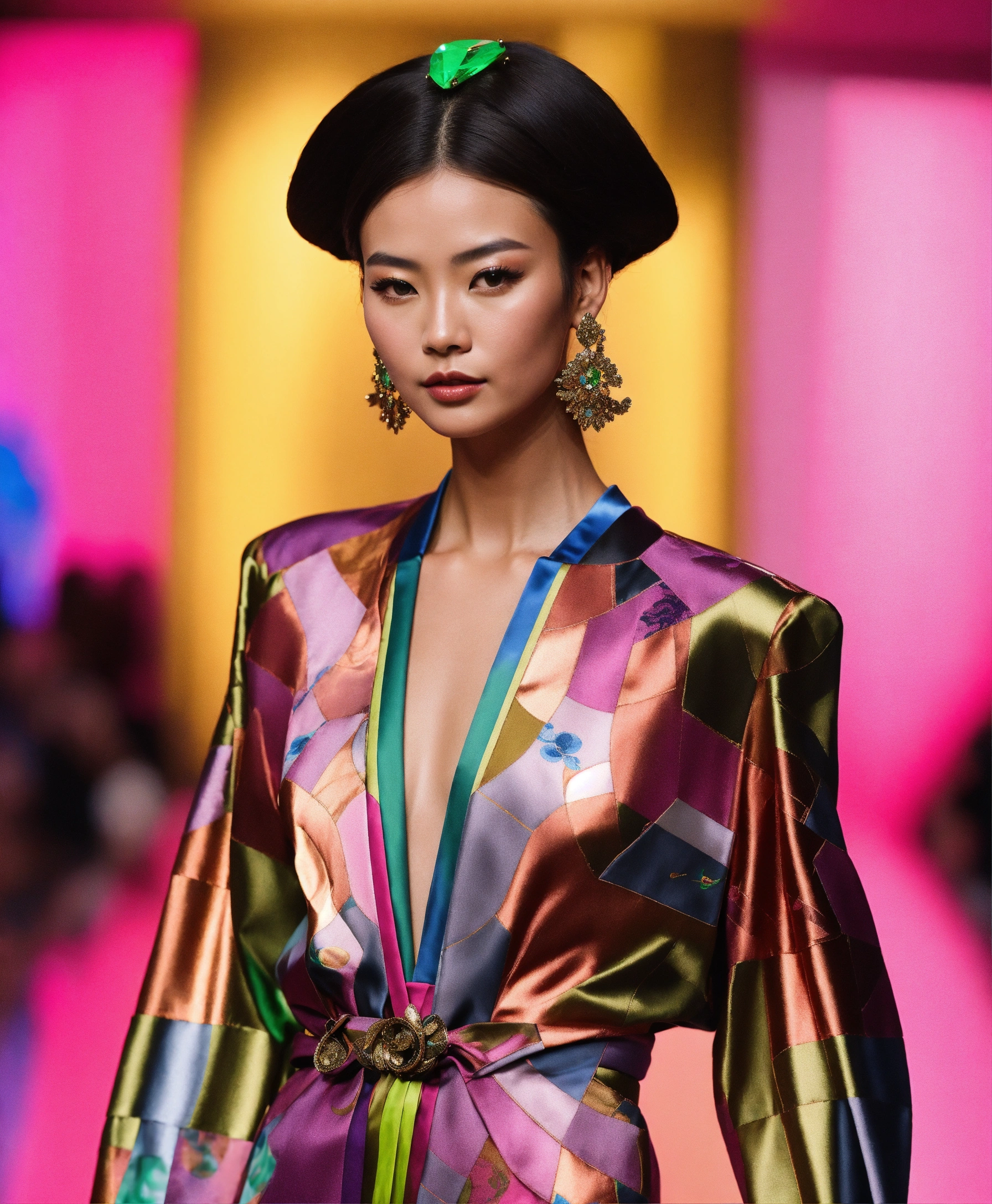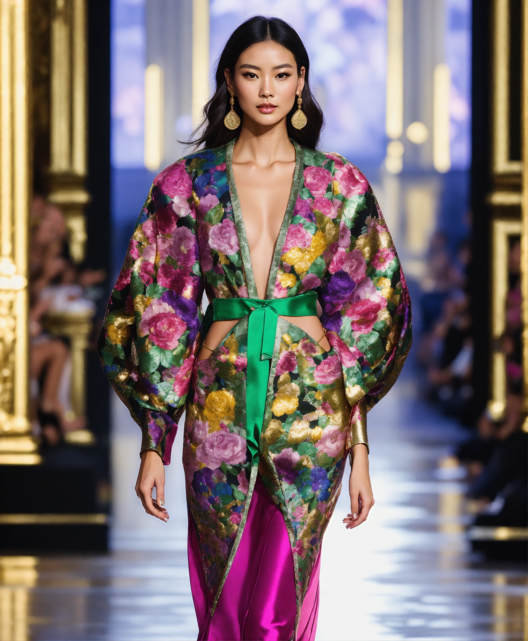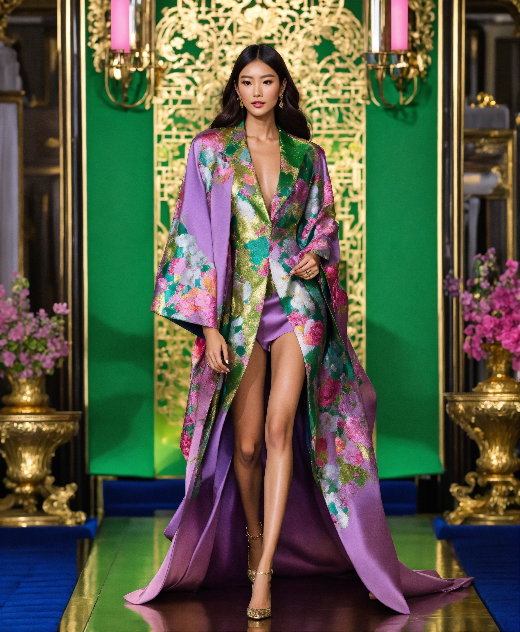Ultra realistic full body photo of a stylish japanese brunette model walking the runway modeling summer designer formal evening dolman sleeve outfit brave, paris versailles details cutouts and and gold geometric pattern floral structured tailored jacket pink gold green lilac peridot silver magenta lime fuchsia yellow blue black gray copper mauve bronze haute couture ultimate elegance beautiful luxurious awesome wealthy opulent resplendent magnificent sublime 12k