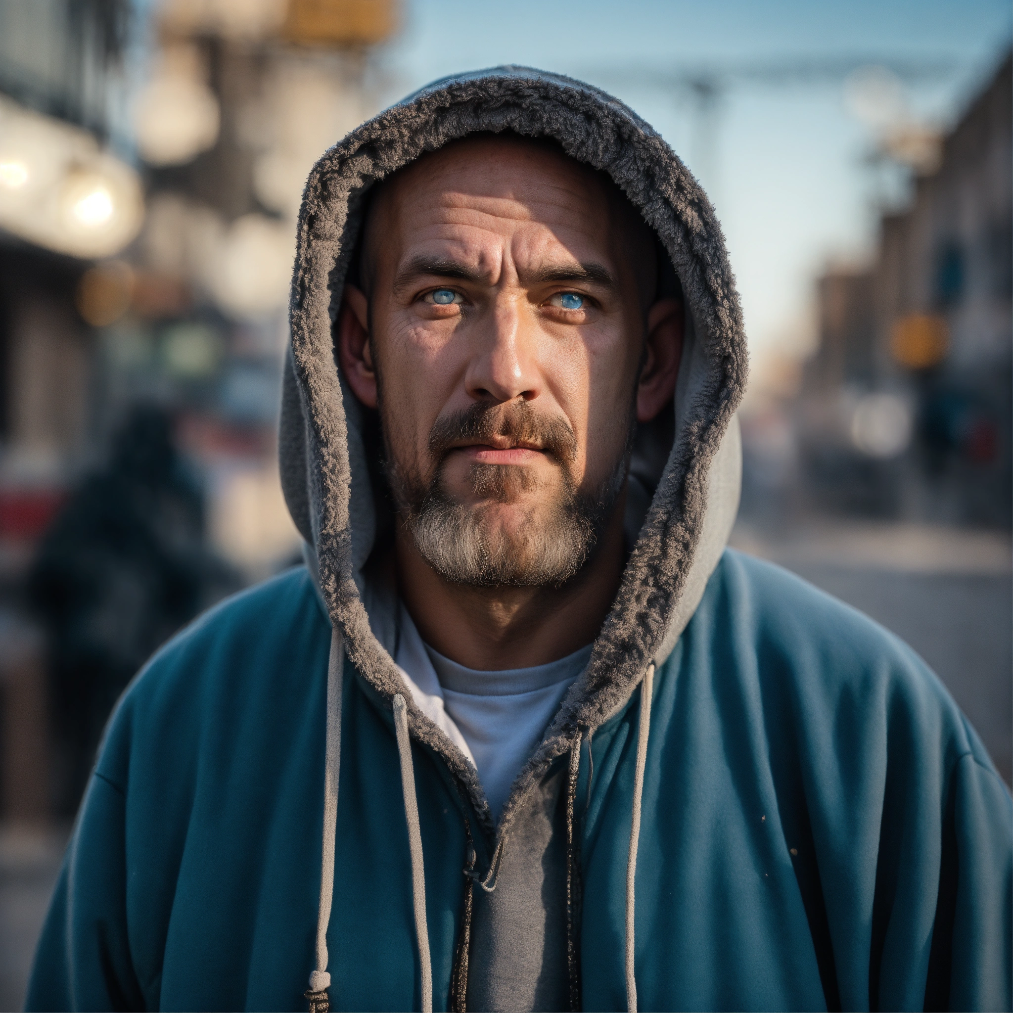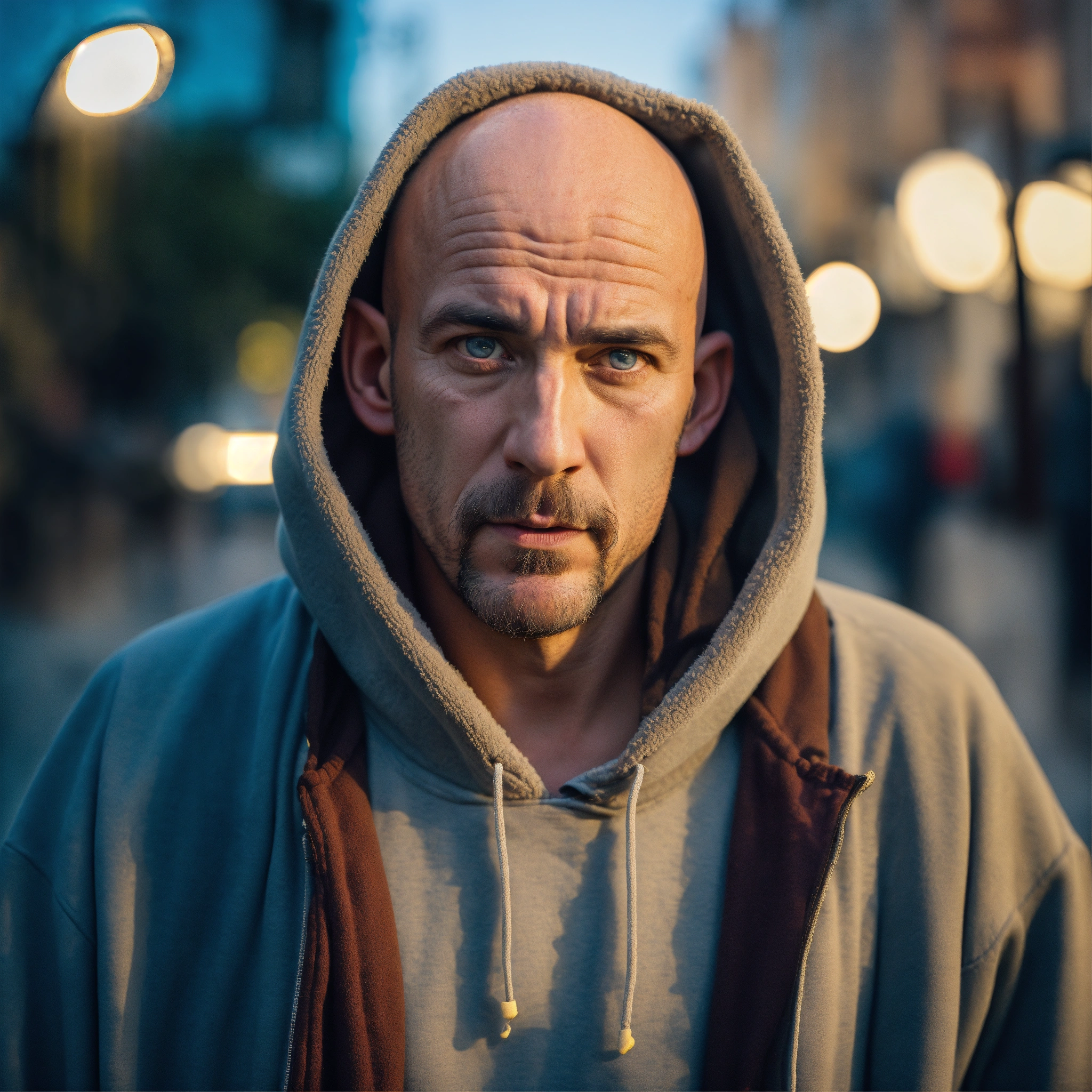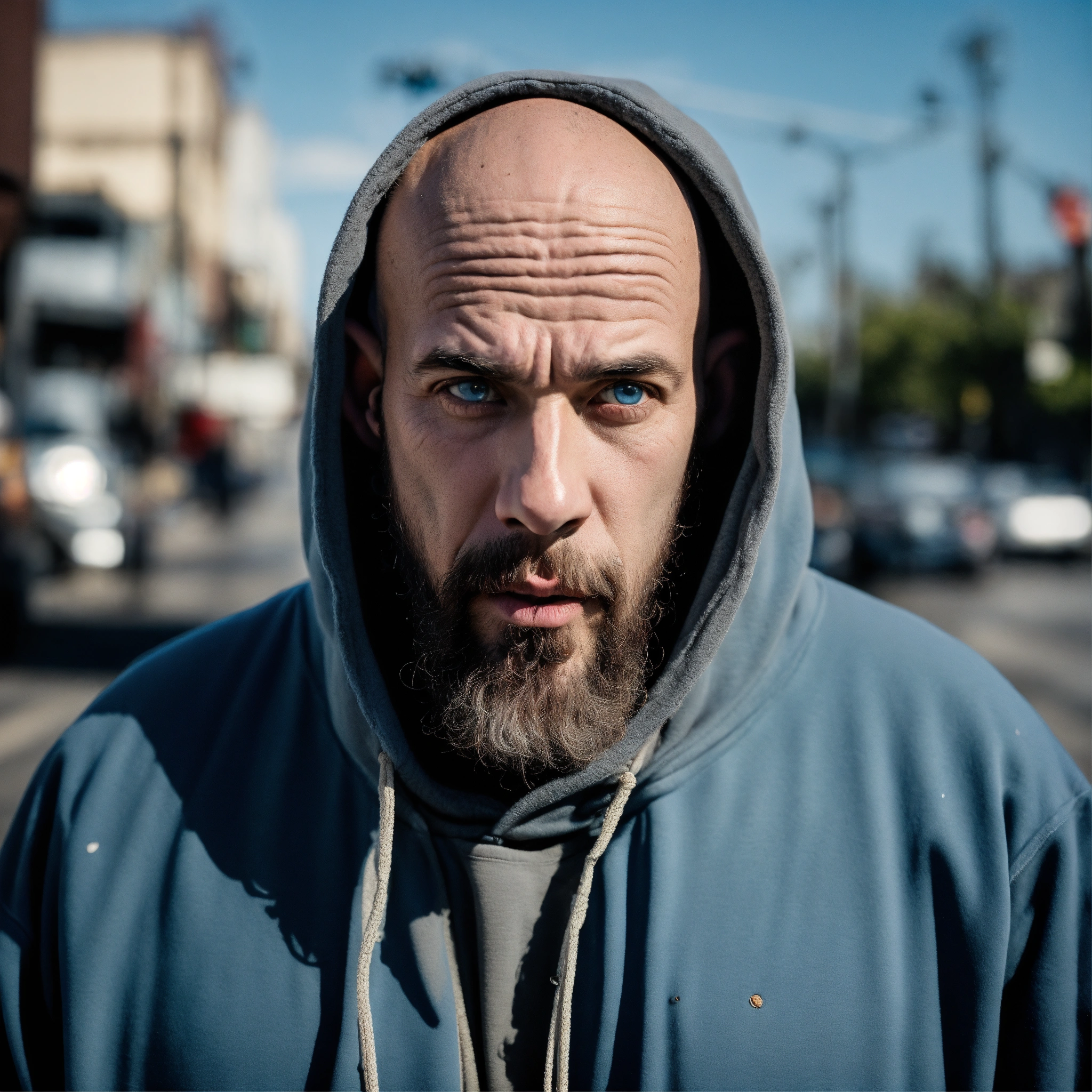 A homeless huge man with a huge lumpy bald head, a tiny goatee, protruding forehead, sunken light gray-blue eyes, crooked mouth, large ears, wearing a hoodie up over his head, standing in the street