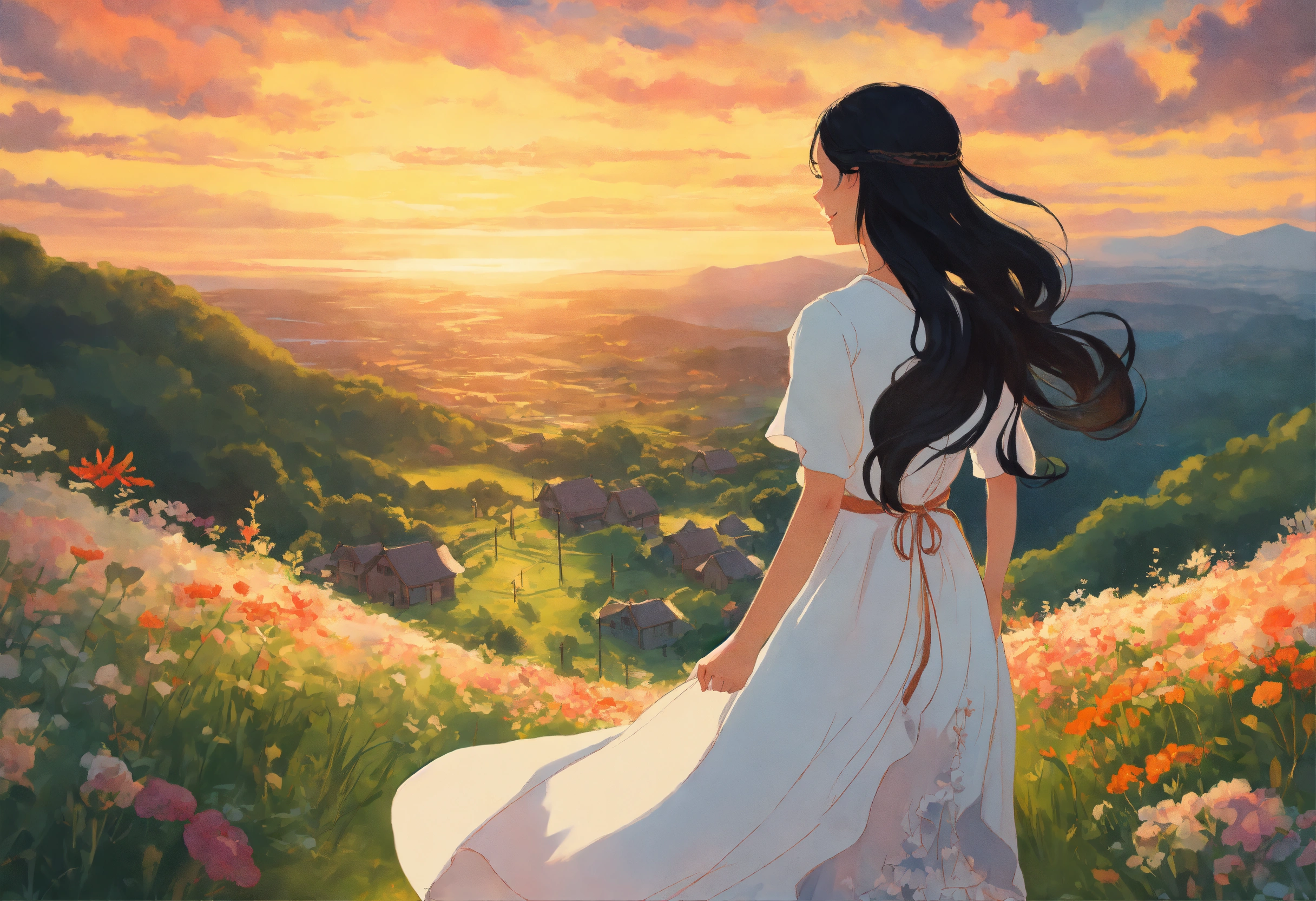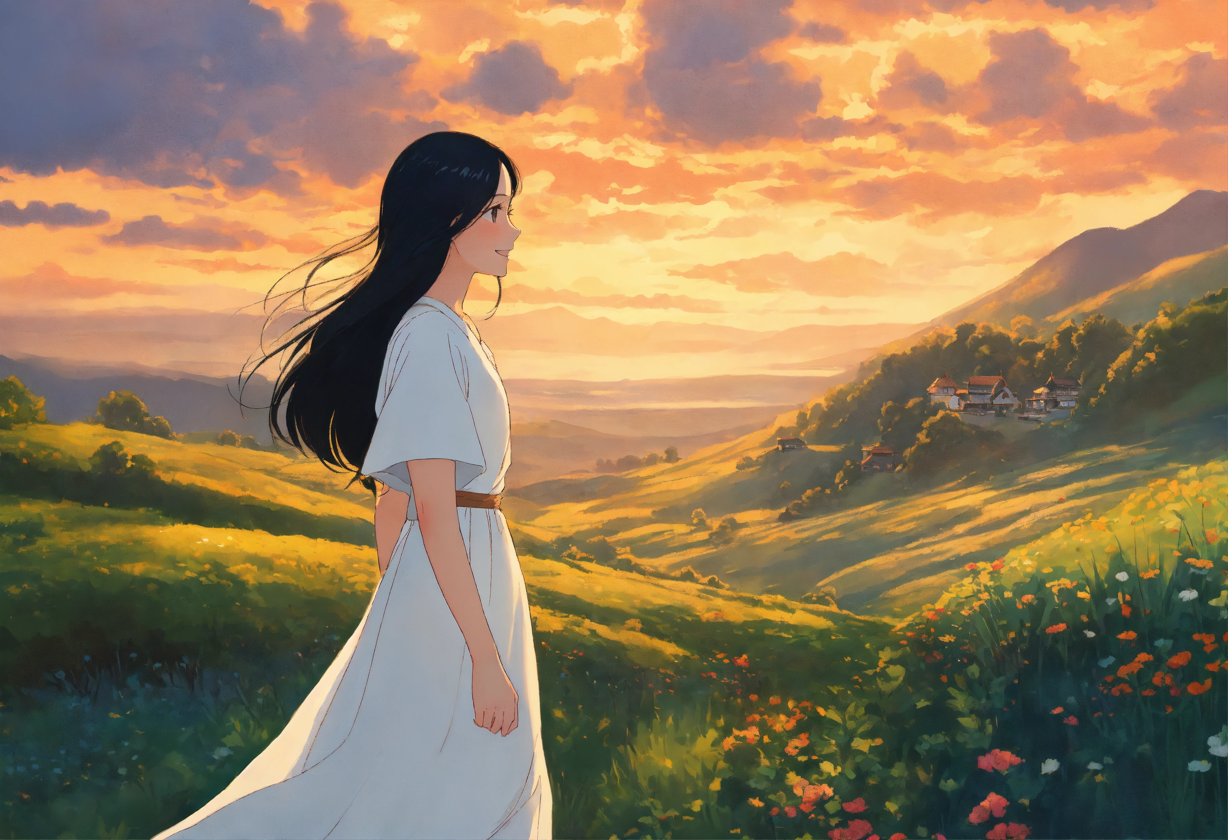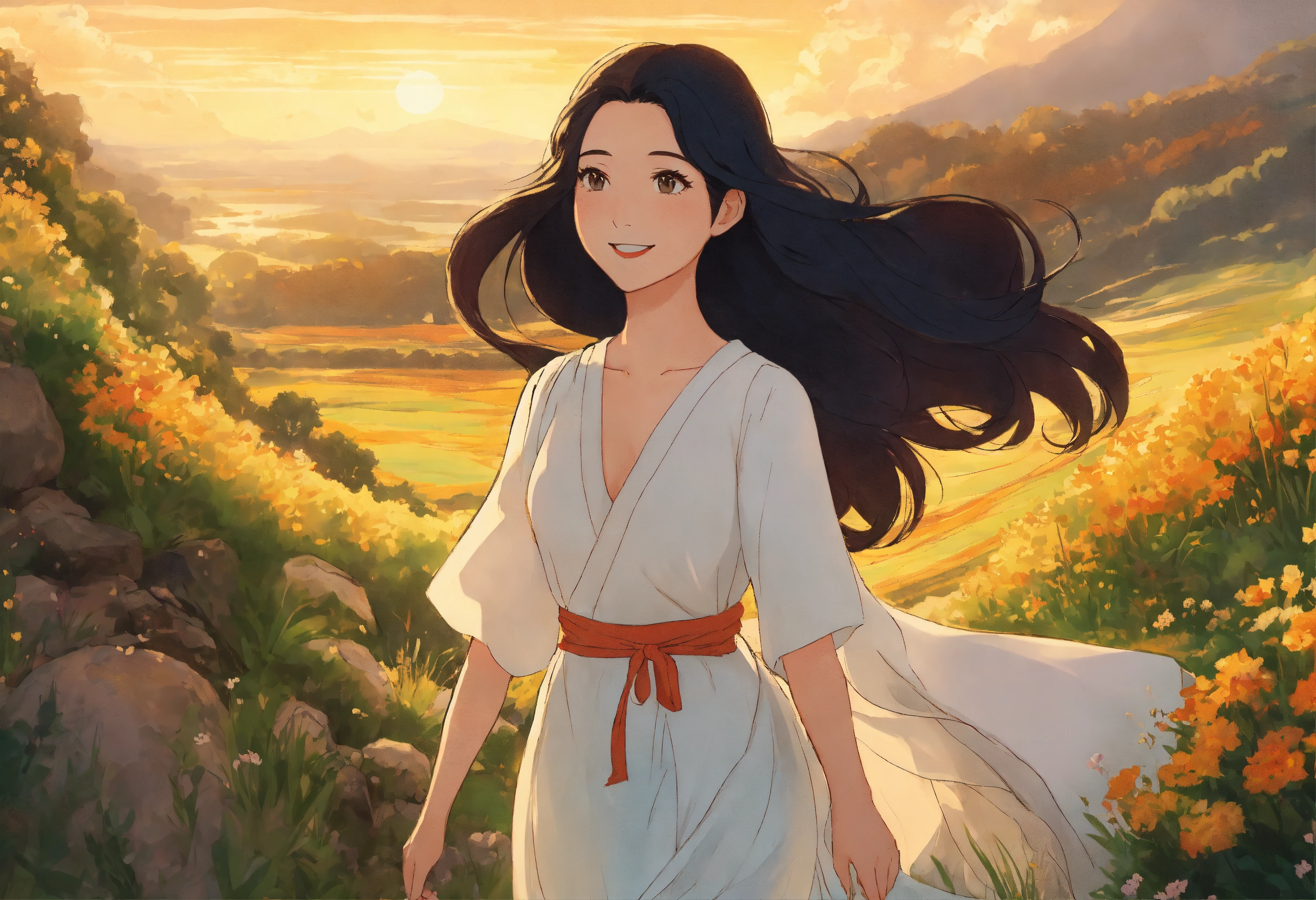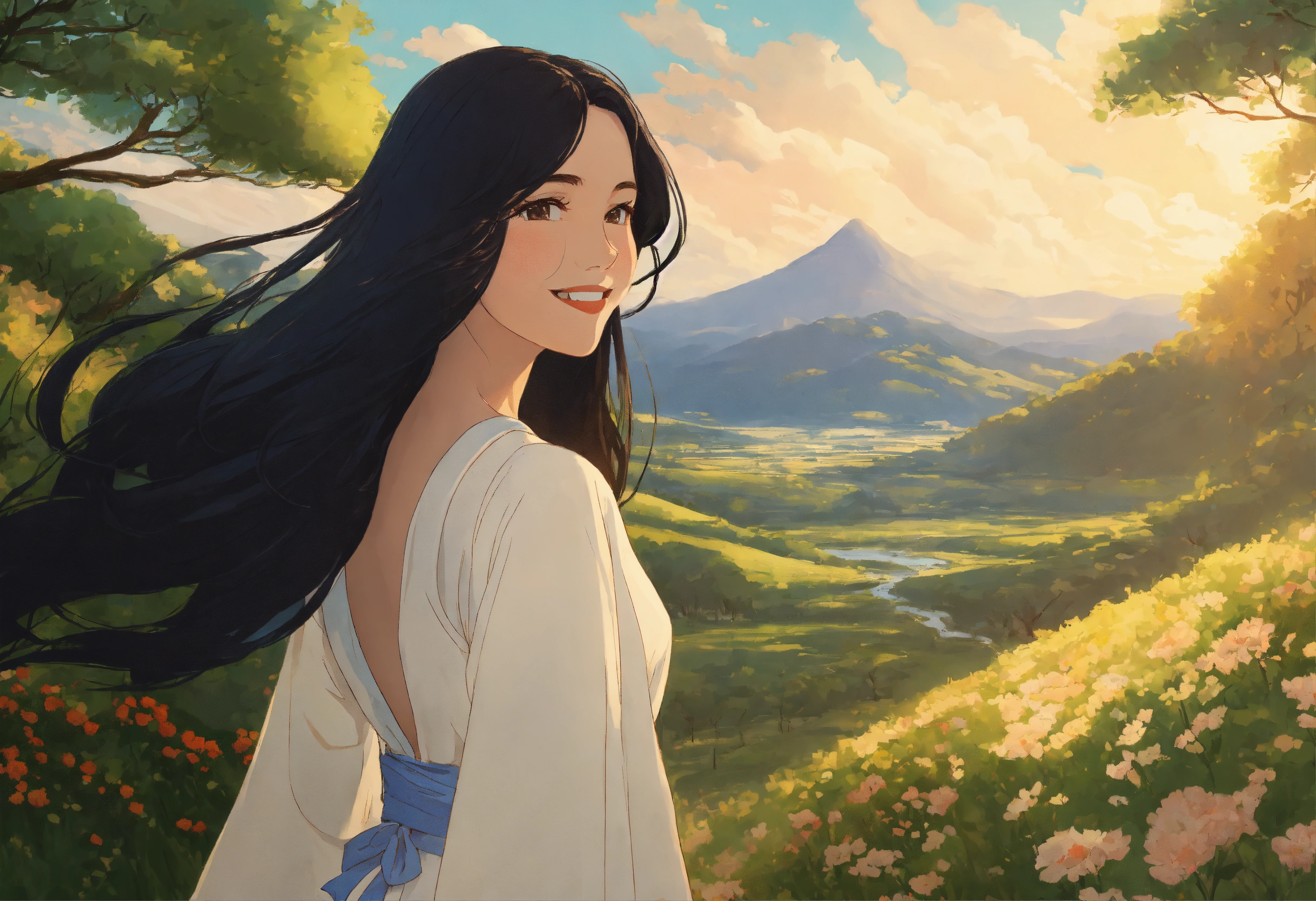In a style inspired by studio ghibli, i'm depicting a woman with long black hair, wearing a white dress, journeying through a breathtaking landscape with a radiant smile on her face