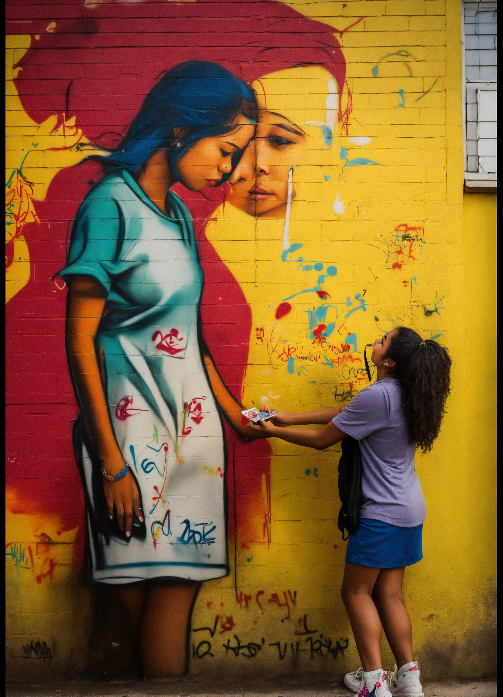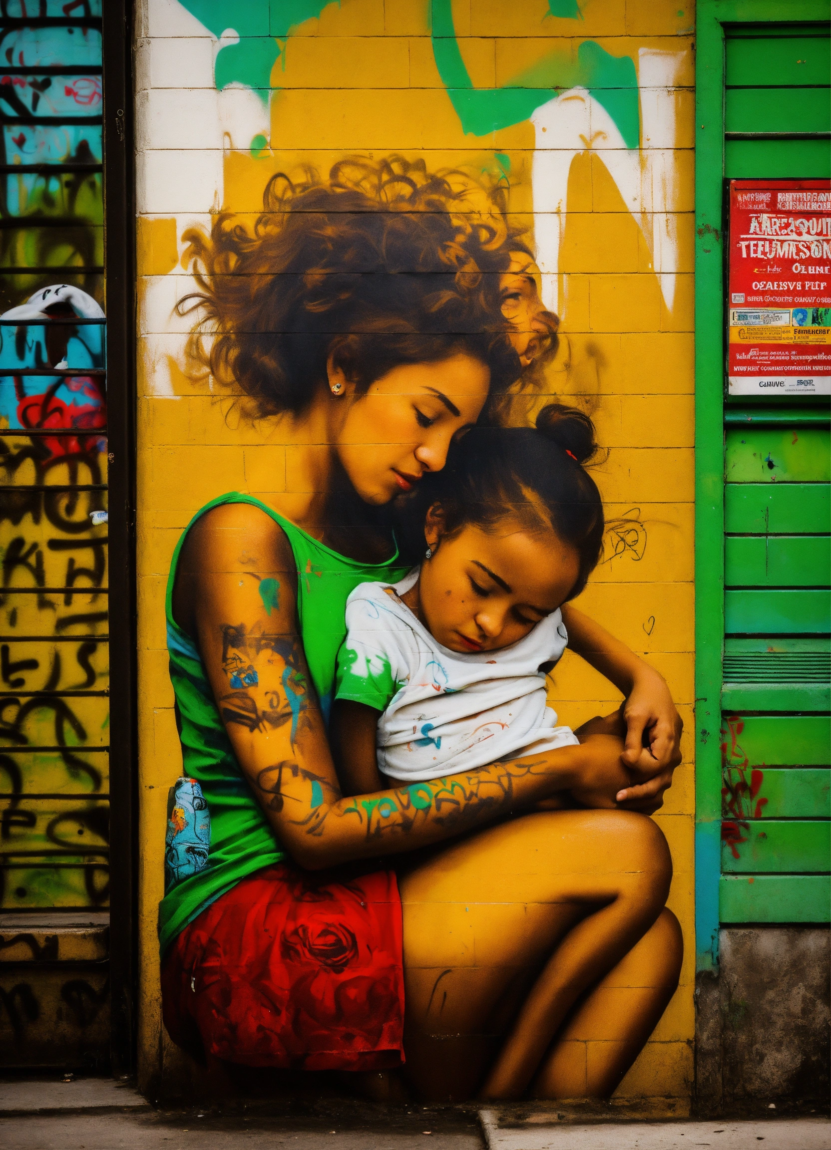 Afiche that showcases compassion osea the emotional involvement of a person in a reality outside of their own, usually in the feelings of another person, graffiti. abrazo entre dos mujeres, cariño, altruismo