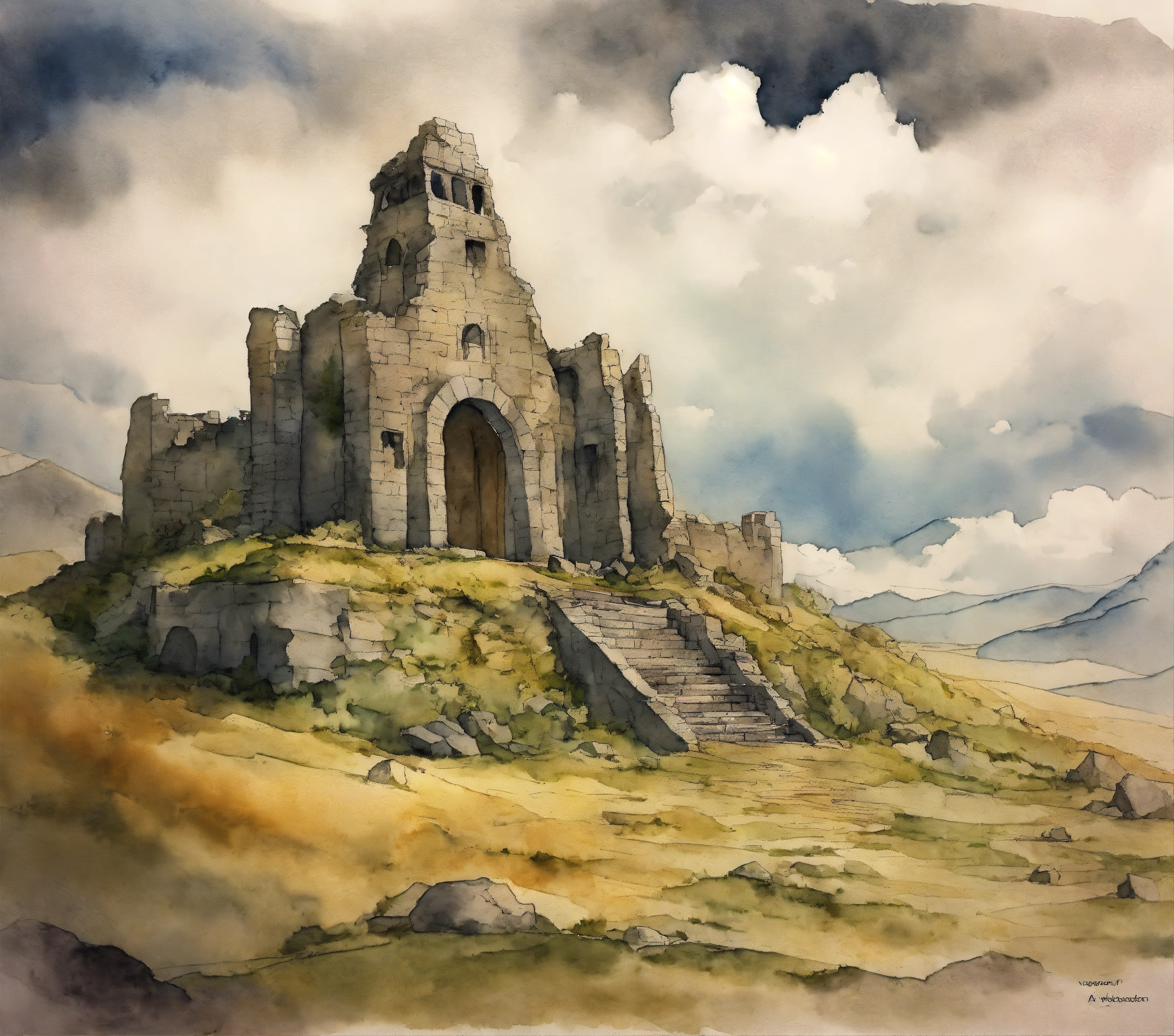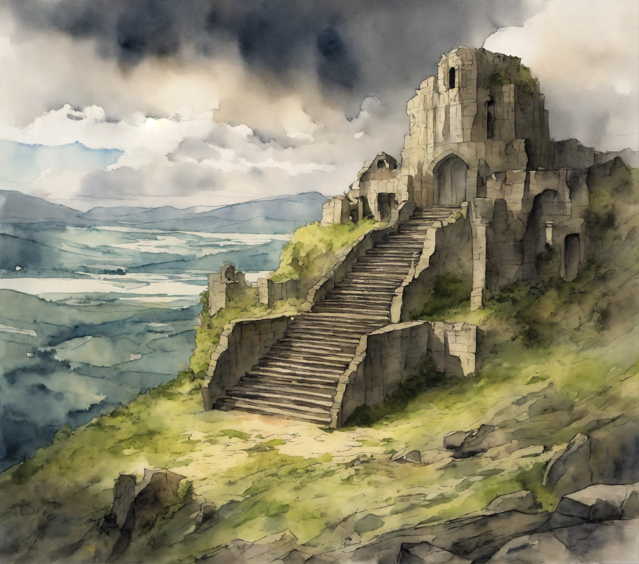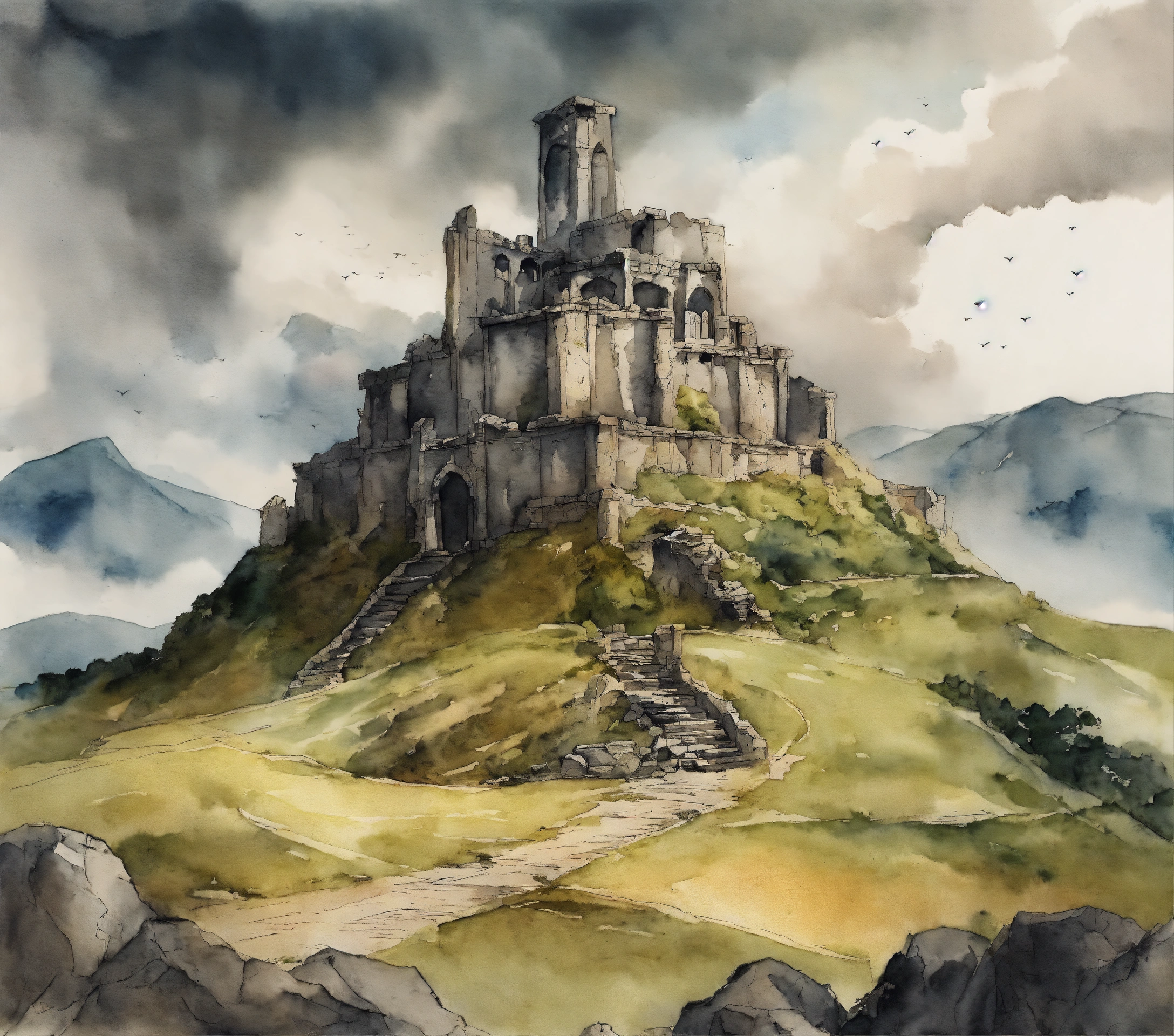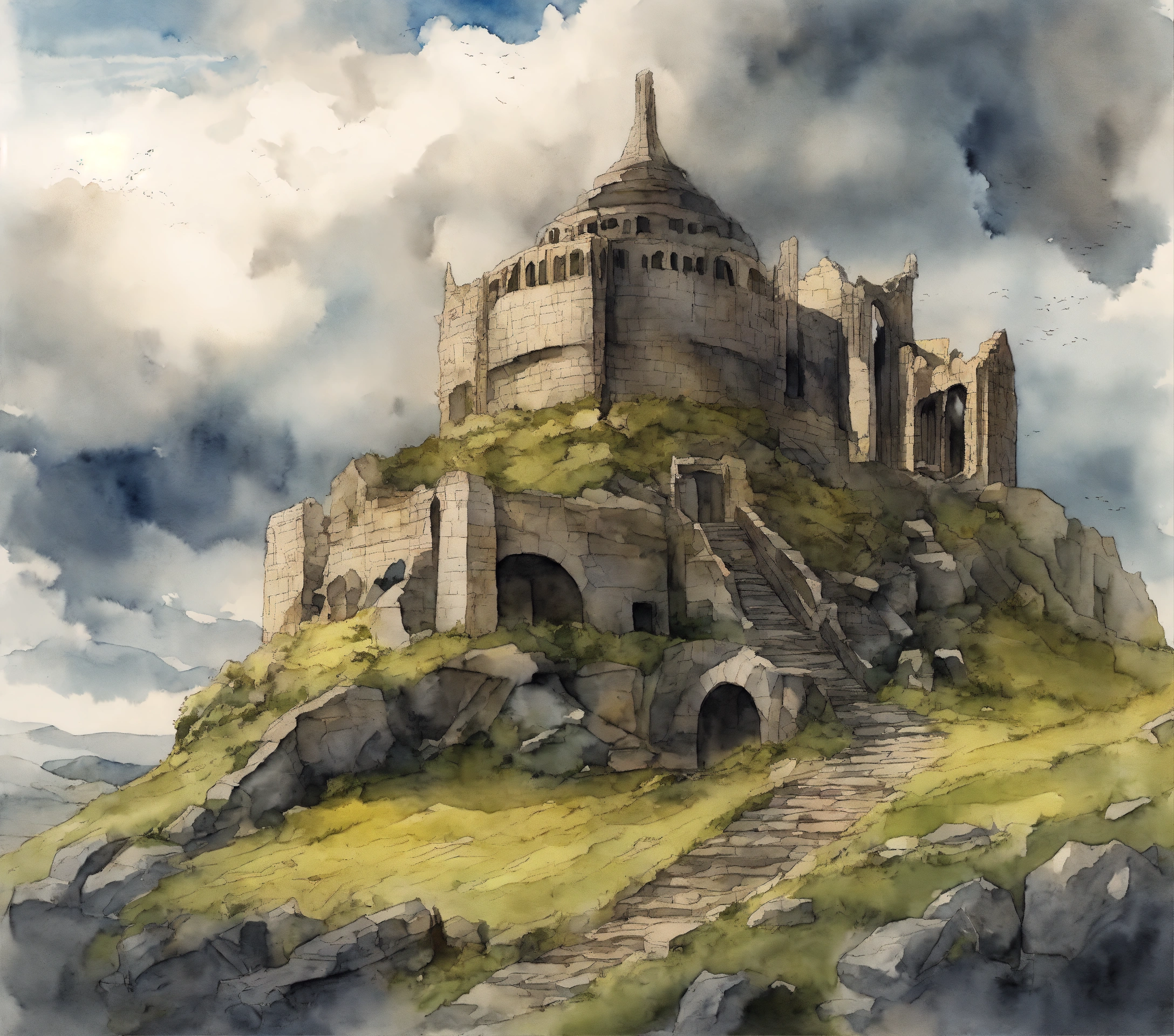 The ruins of amon sul from lotr in vagabond manga drawing art style, watercolor, with grey clouds the background