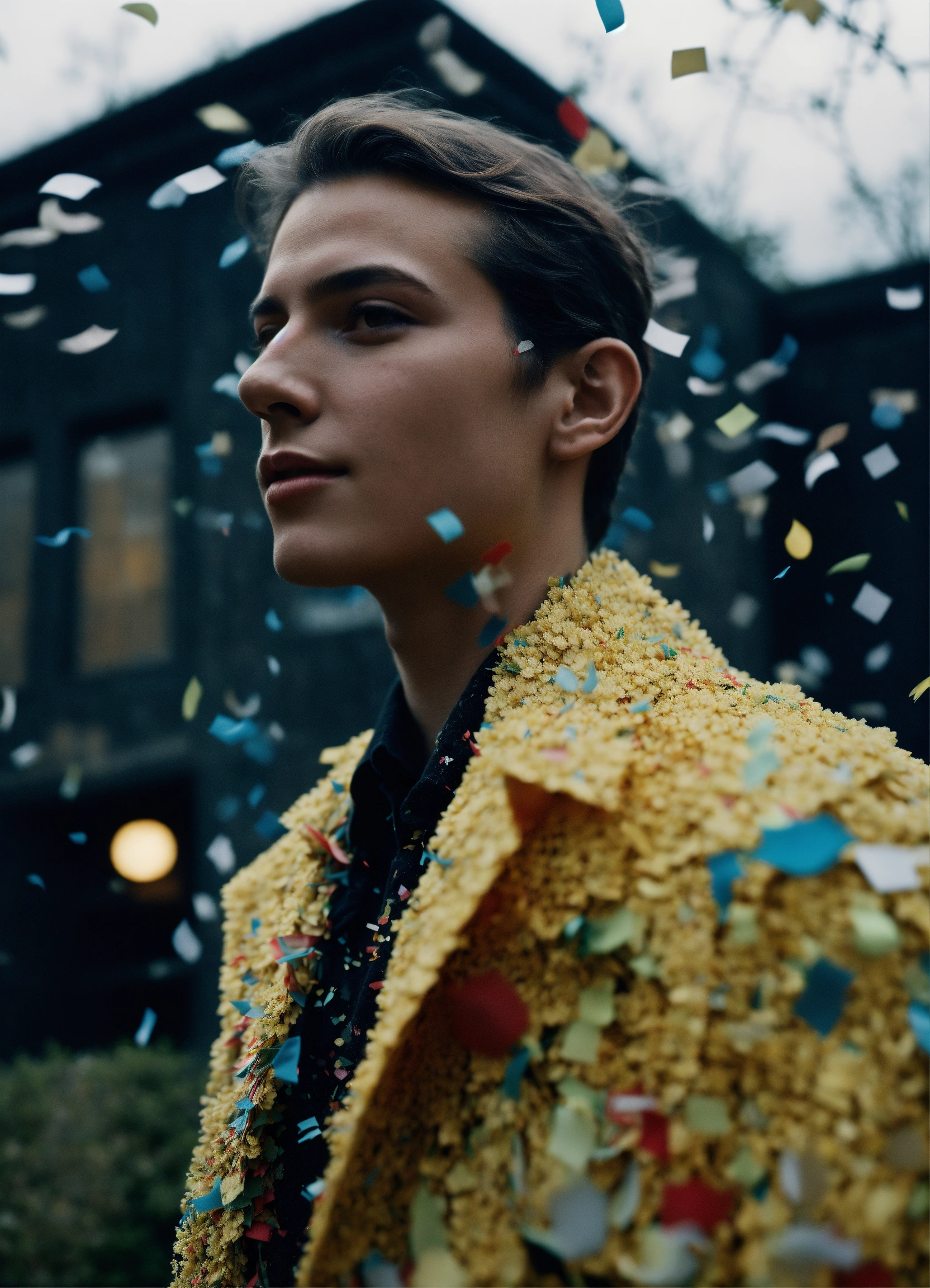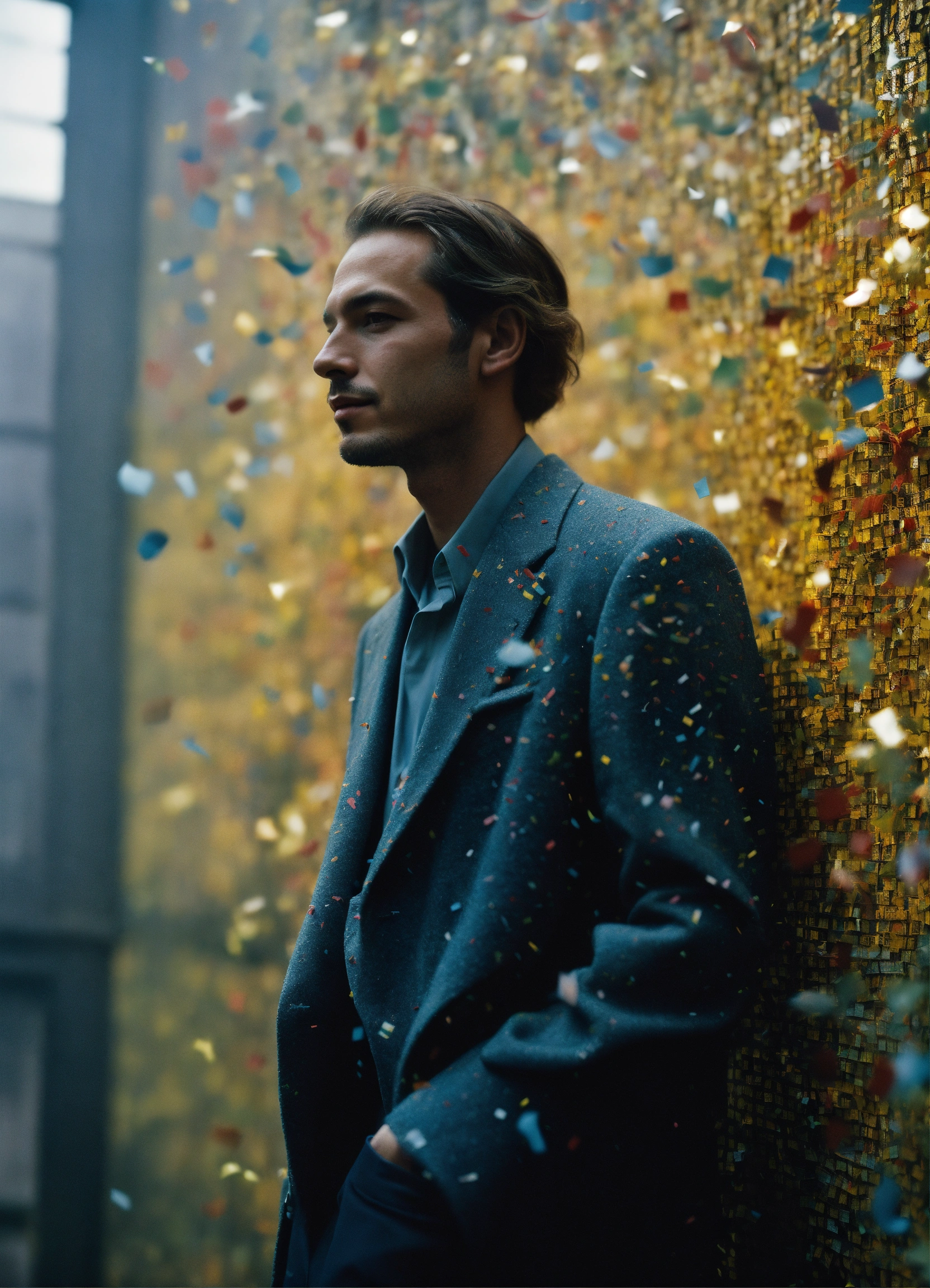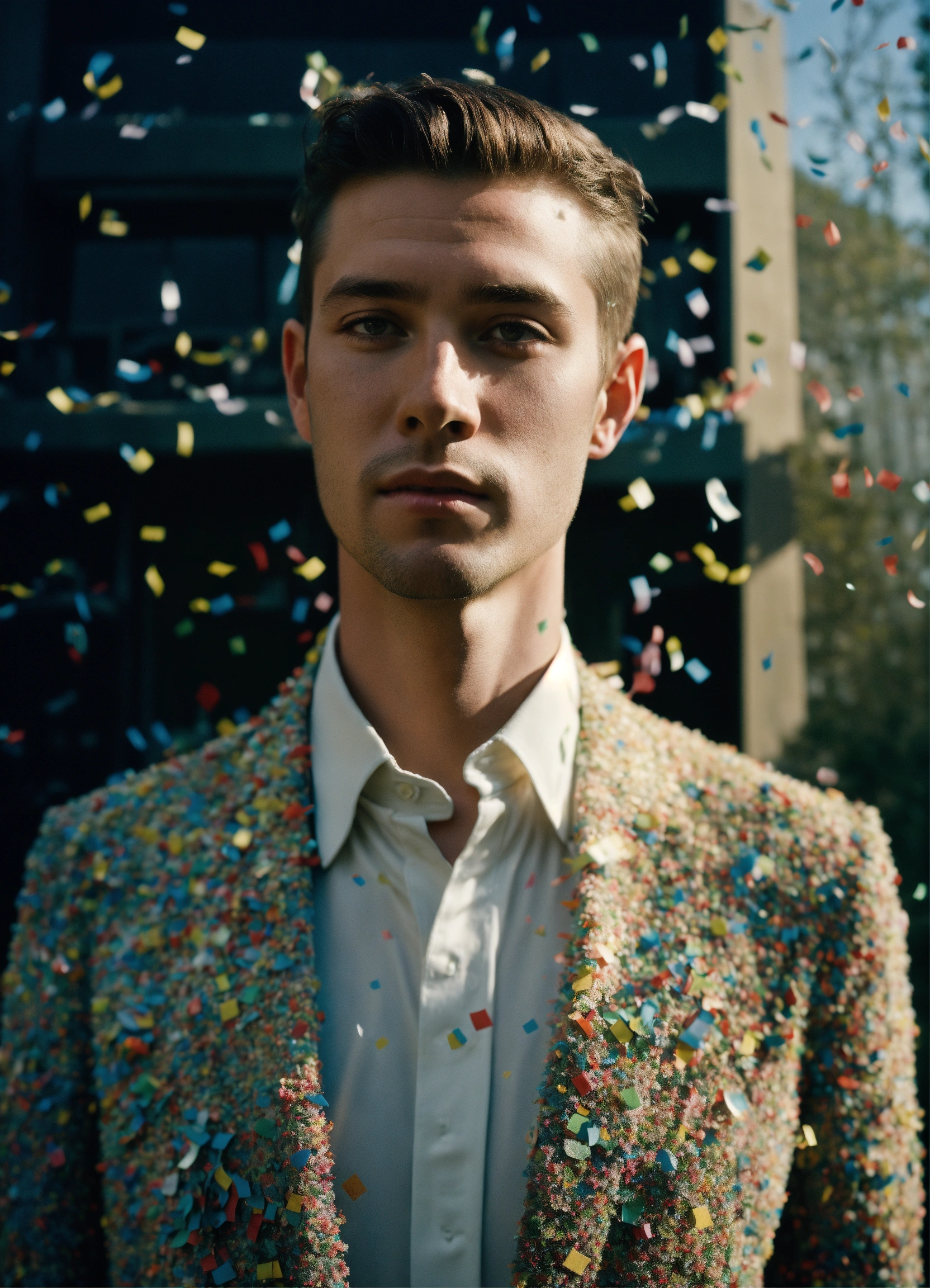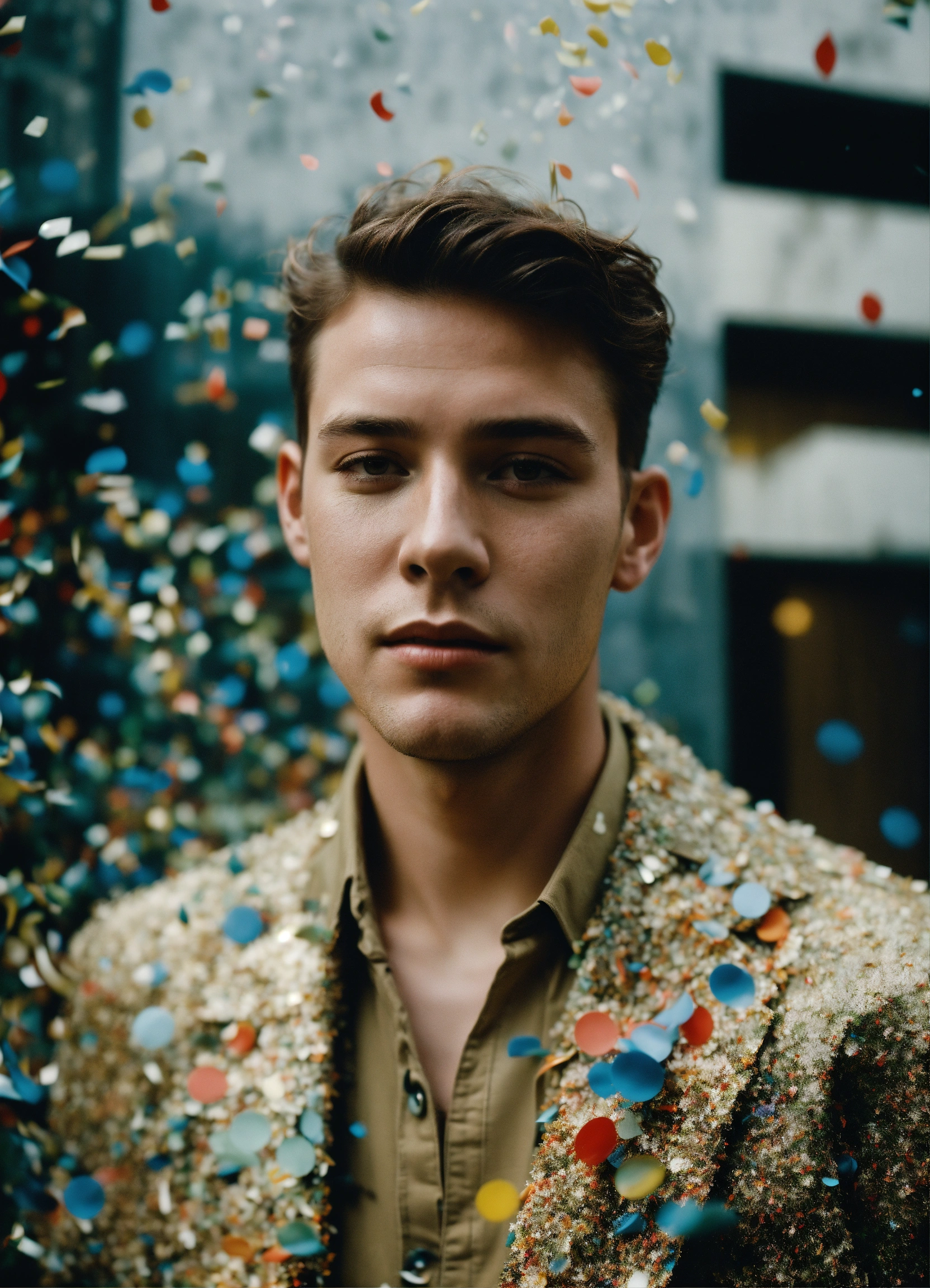 Portrait of a man made of confetti, ethereal dreamy foggy, photoshoot by annie leibovitz, editorial fashion magazine photoshoot, fashion poses, in front of brutalist building architecture. kinfolk magazine. film grain. a soft smile