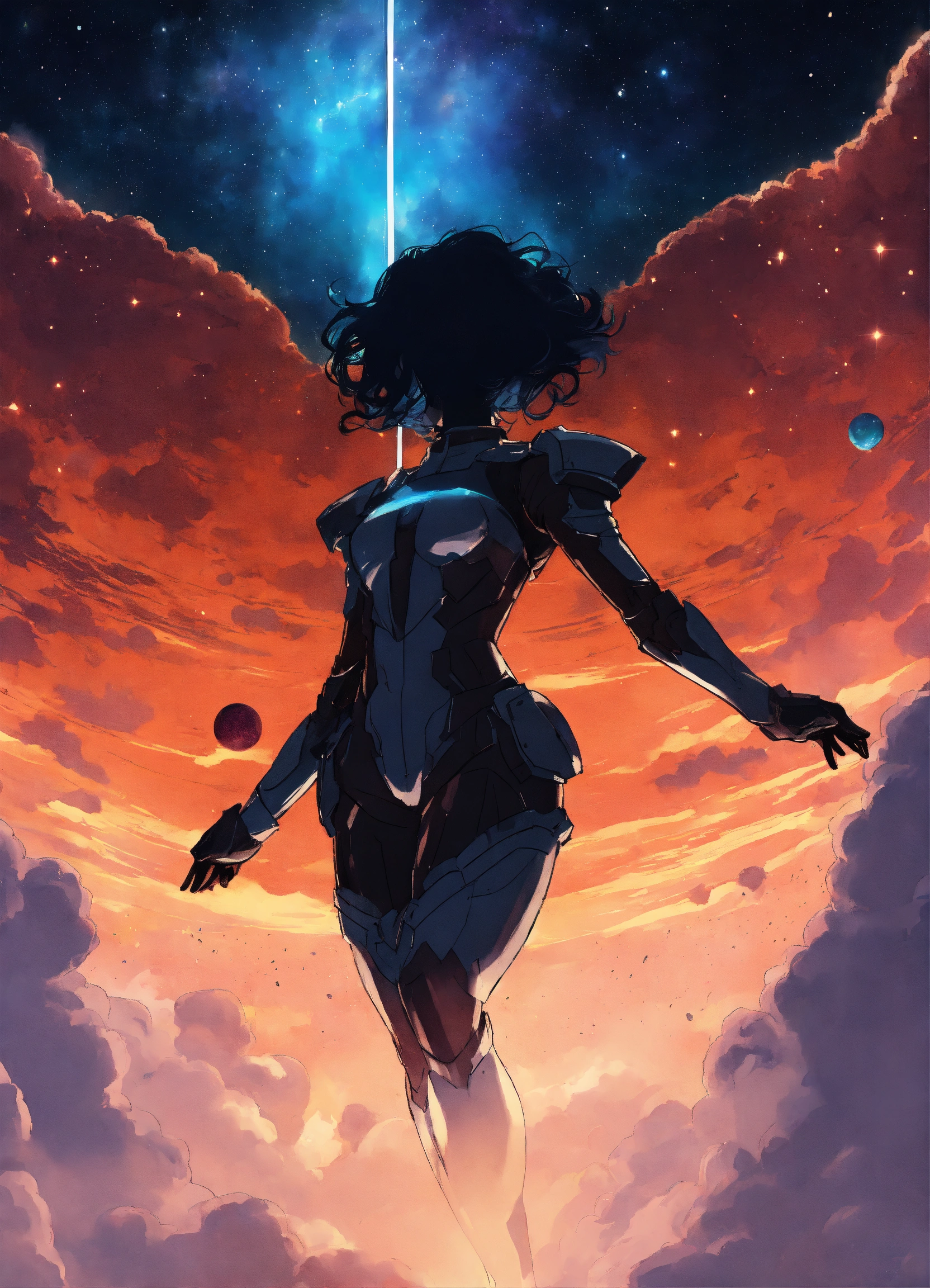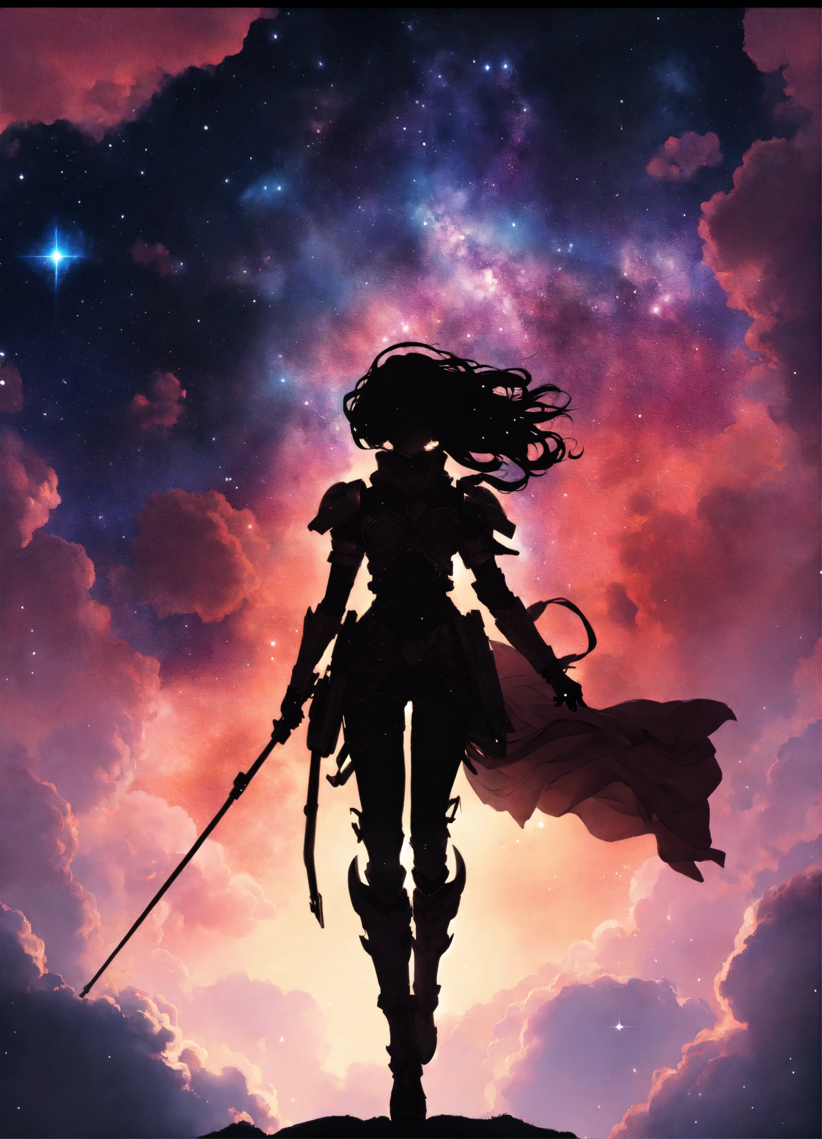 Silhouette of inner cosmos woman, celestial armor, suspended in air, nebula-filled backdrop, 2d manga anime style.