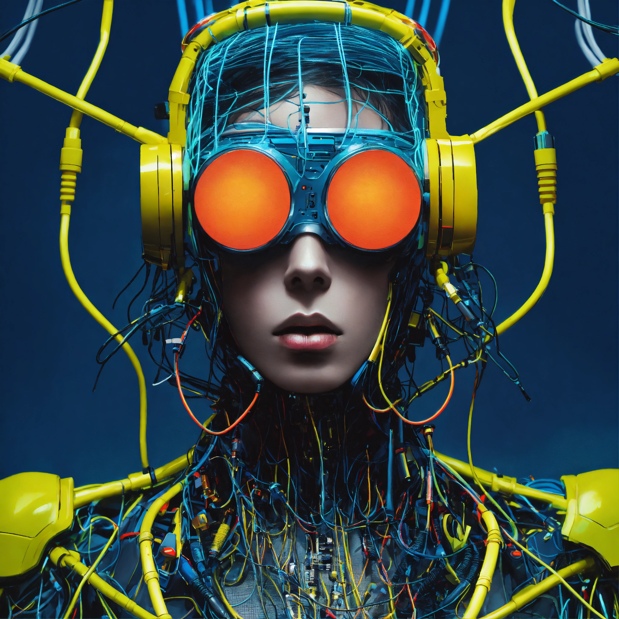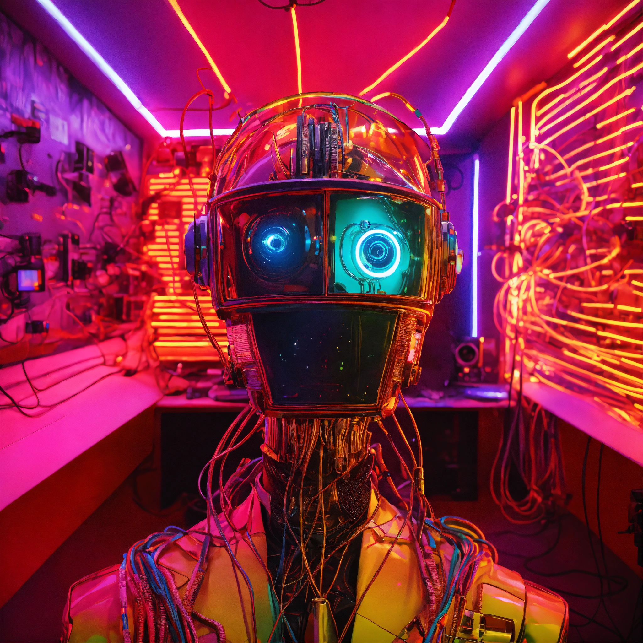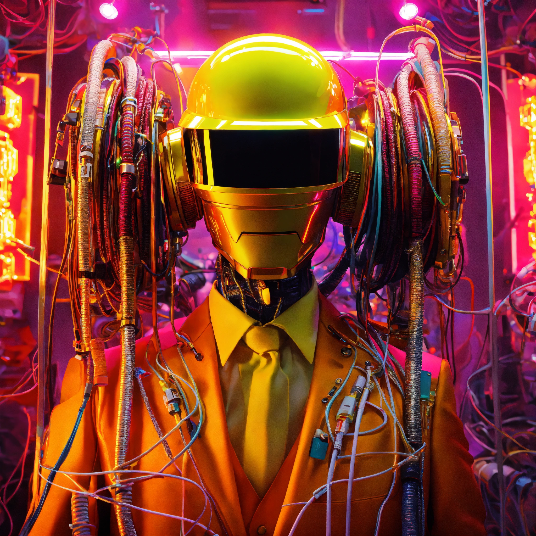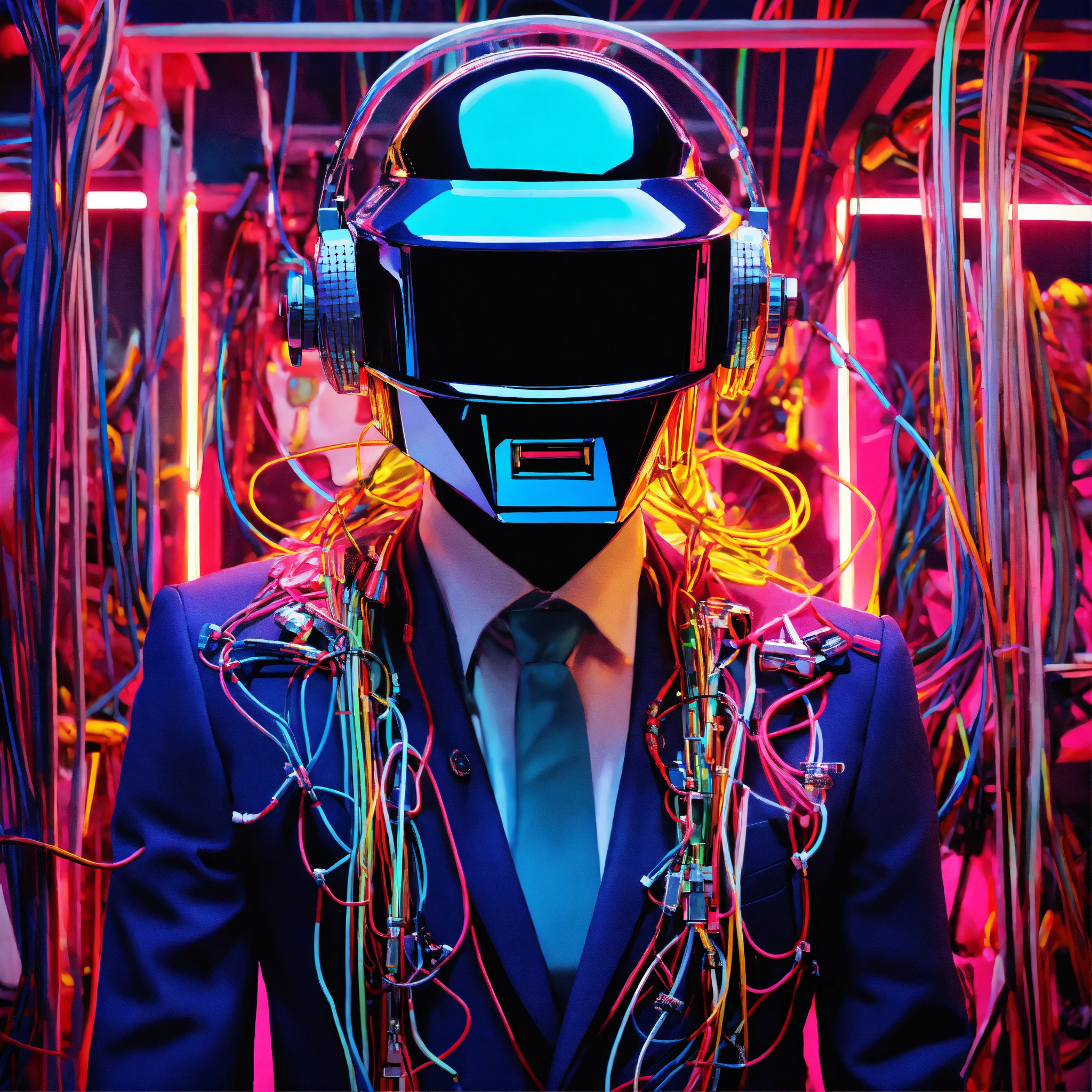 Close up portrait photography, one of the daft punk robots dressed in suits, in a neon music studio full of cables and wires and led, 80 degree view, art by sergio lopez, natalie shau, james jean and salvador dali