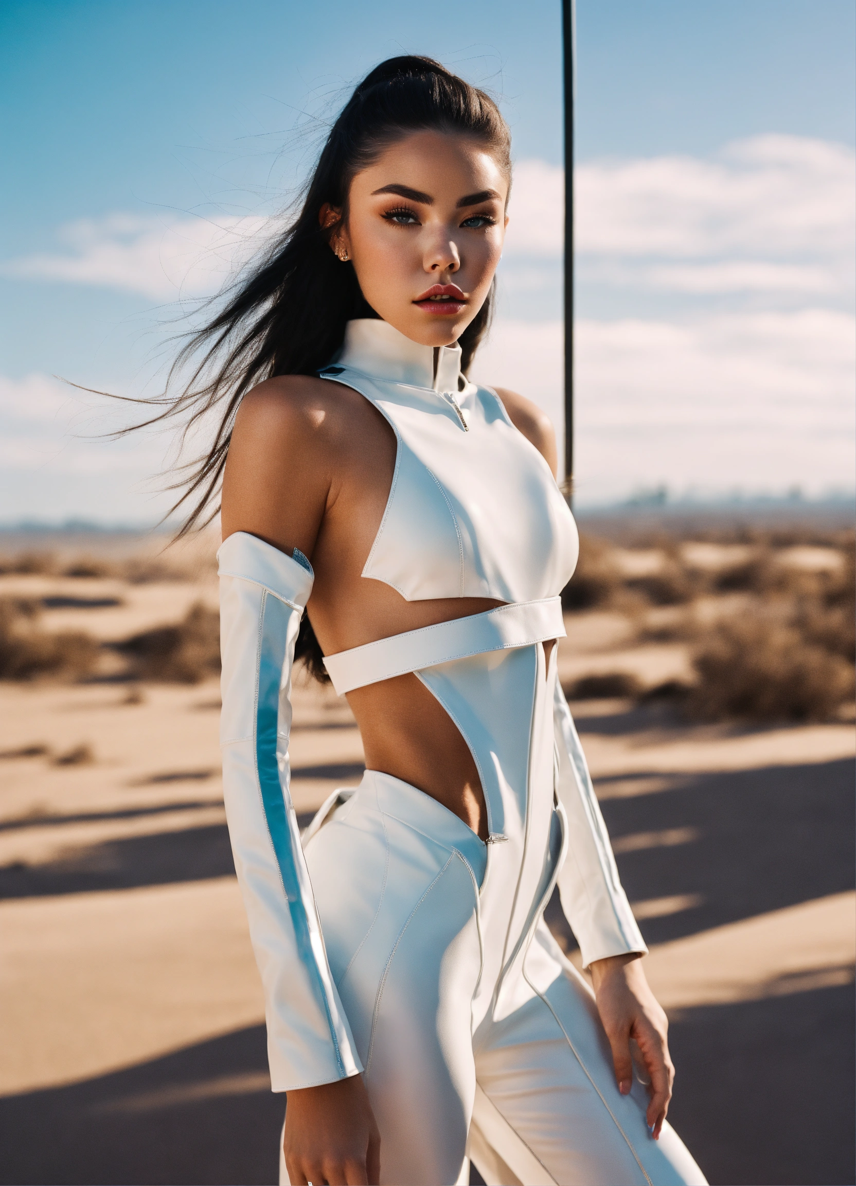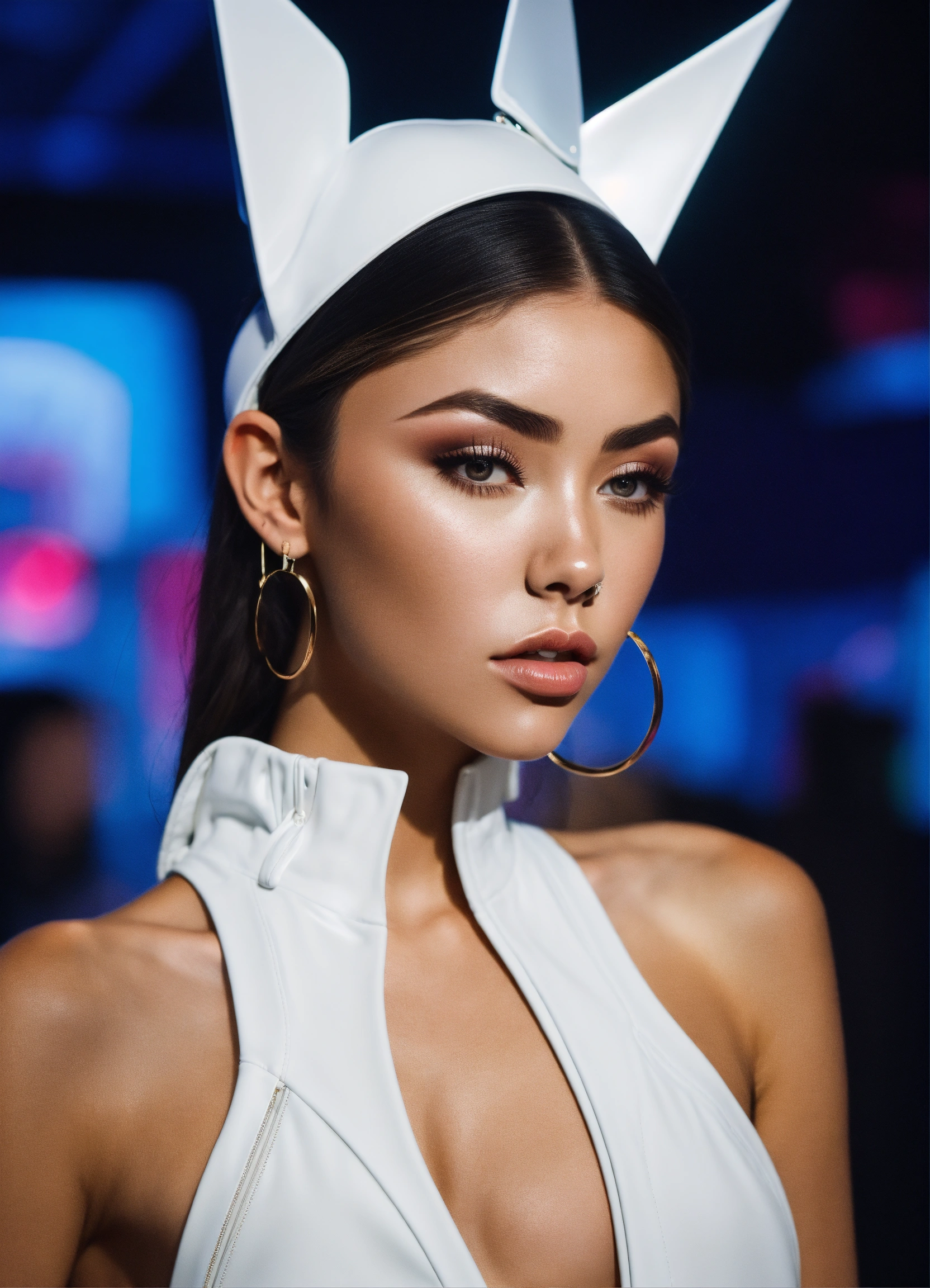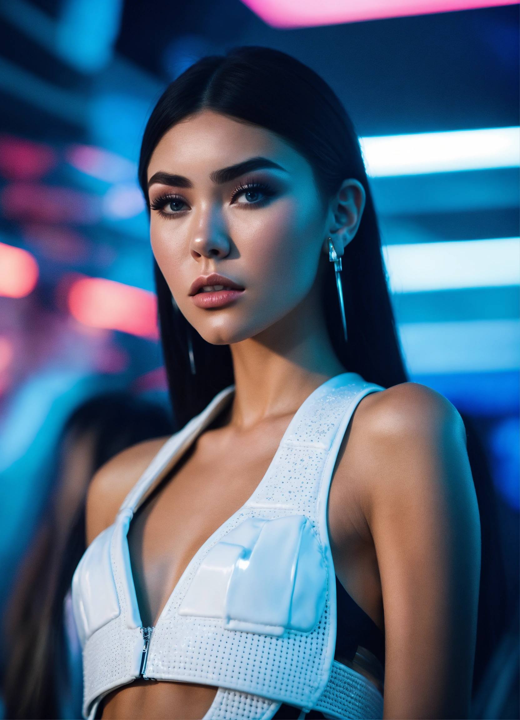 Madison beer in a white sleek futuristic outfit, details, design, clean makeup, with depth of field, fantastical edgy and regal themed outfit, captured in vivid colors, embodying the essence of fantasy, minimalist, film grain