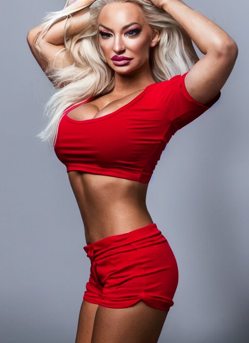 Portrait of lindsey pelas wearing red t shirt and hot pants, by charlotte grimm, natural light, detailed face, beautiful features, symmetrical, canon eos c 3 0 0, ƒ 1. 8, 3 5 mm, 8 k, medium - format print