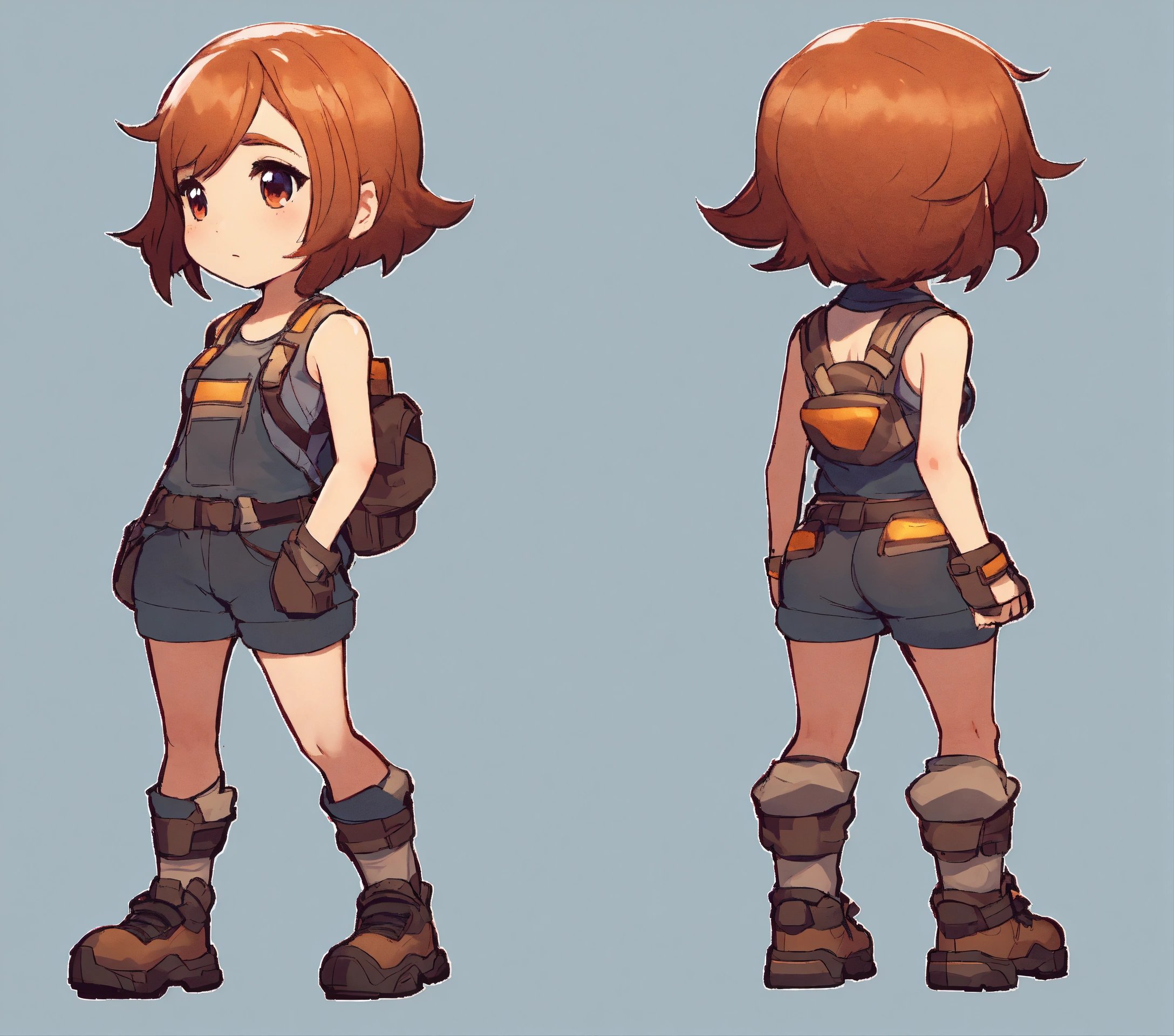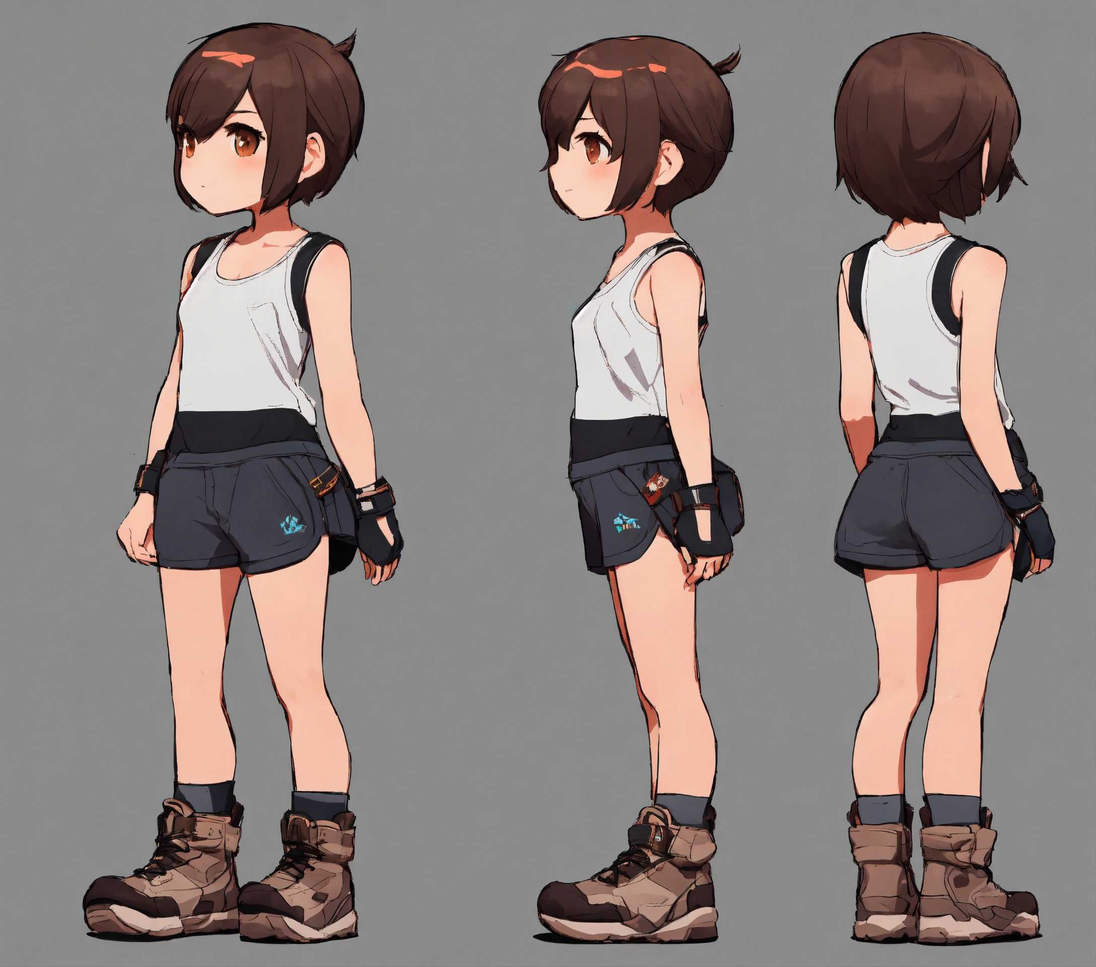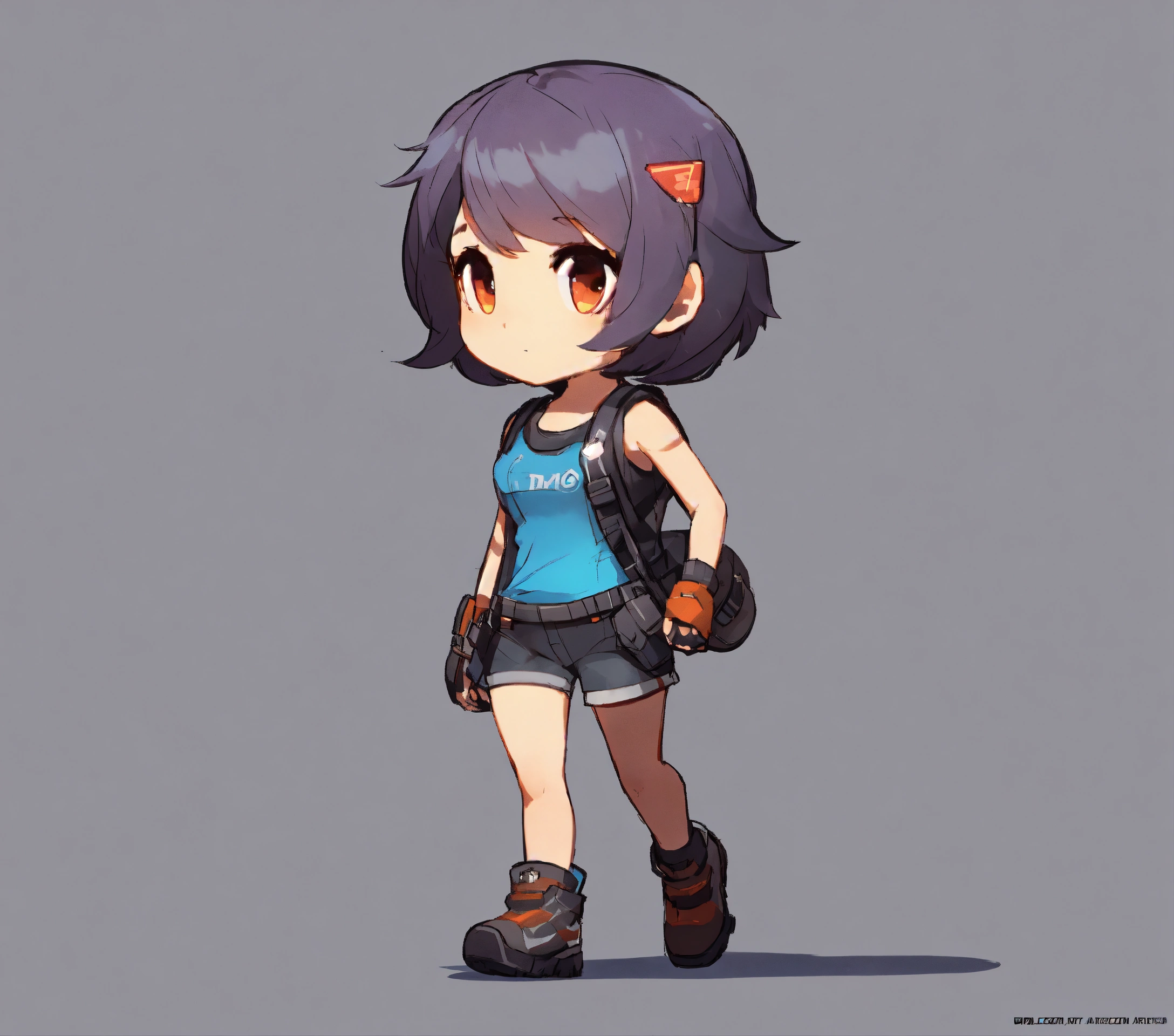 Game assets, concept art, girl, short hair, tank top, shorts, walking, full body view, side view, blank background, chibi proportions, artstyle by blizzard entertainment