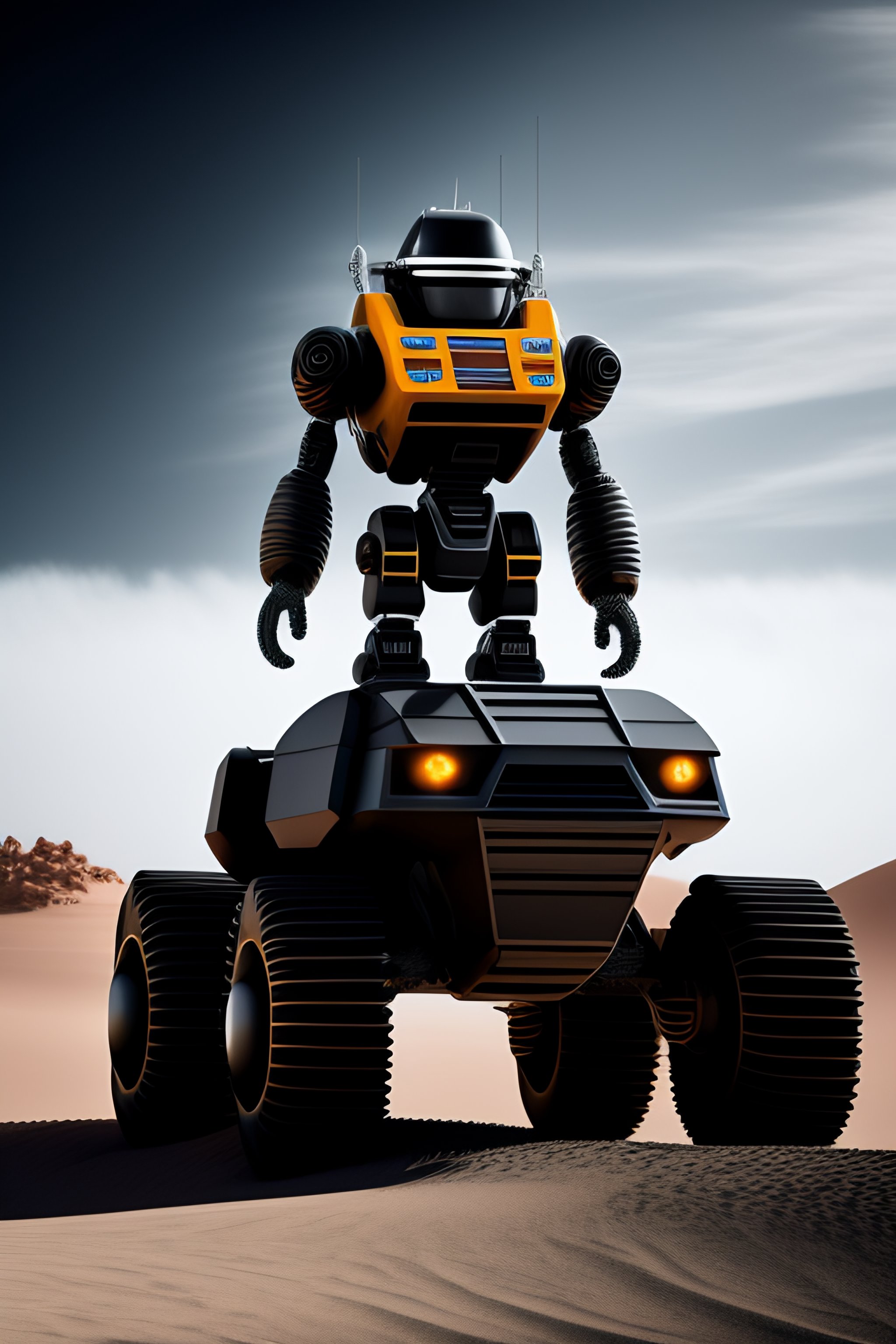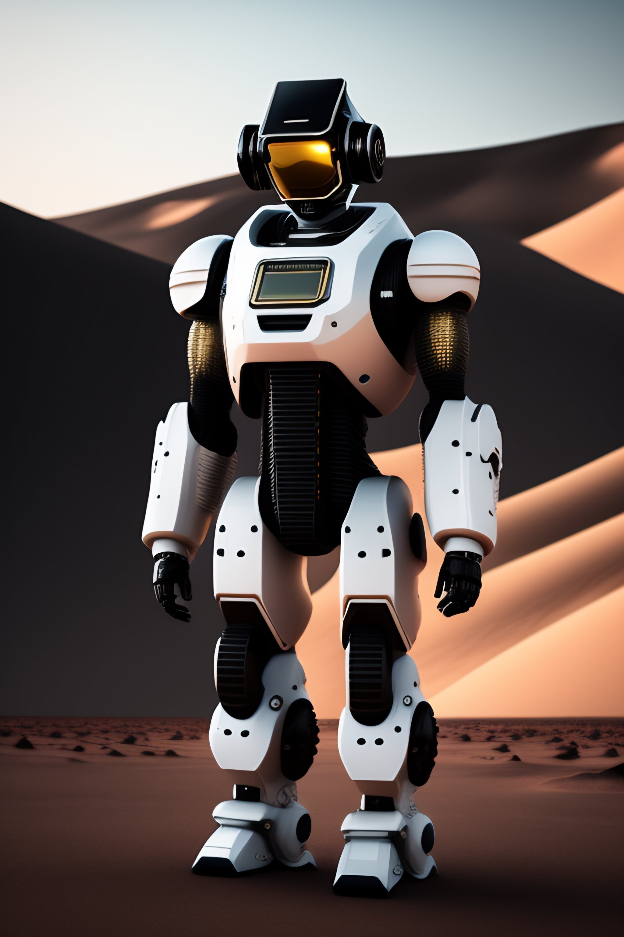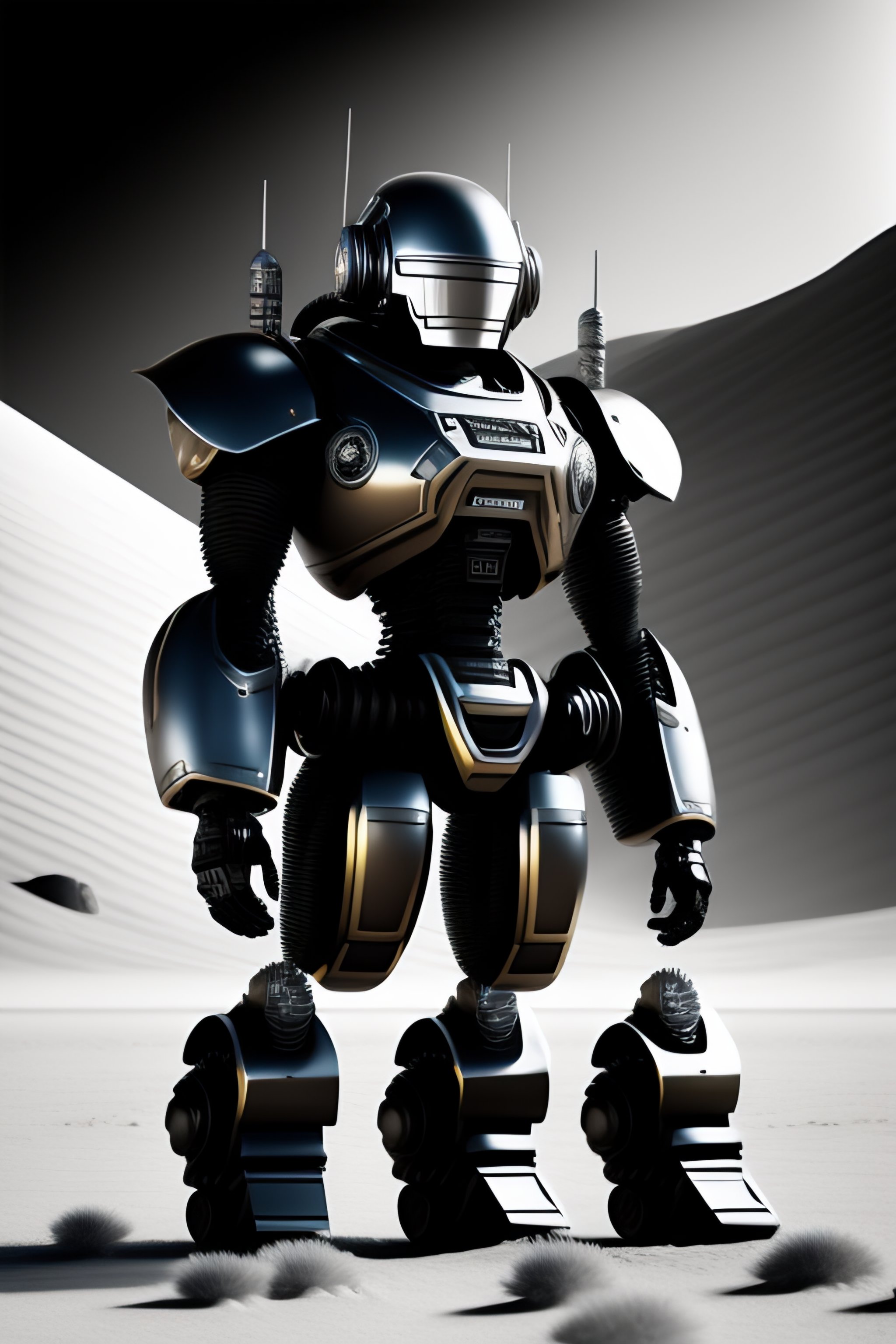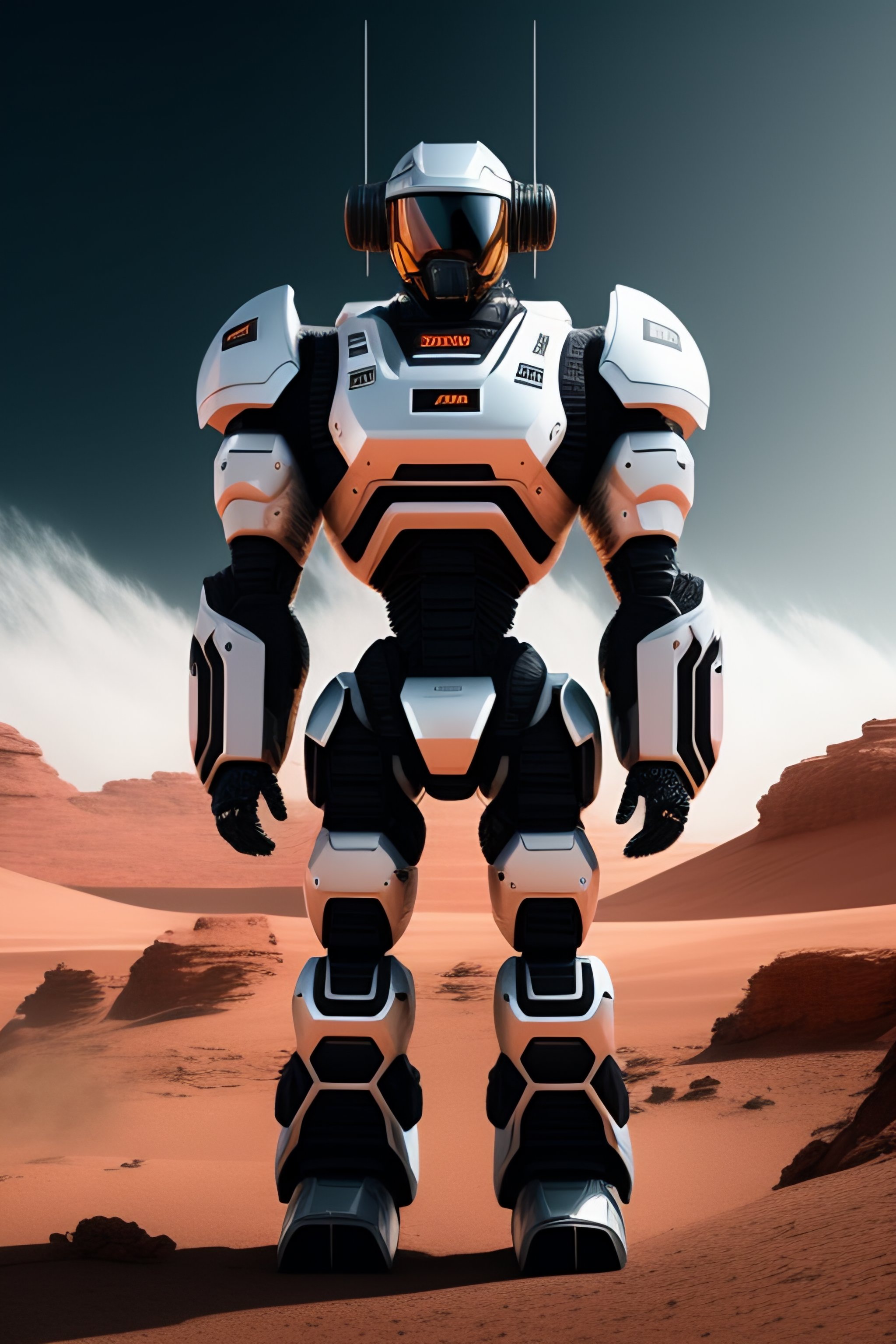 Son of arnold schwarzenegger on mars in black and white in a robot armour with hard edges connected to a super computer