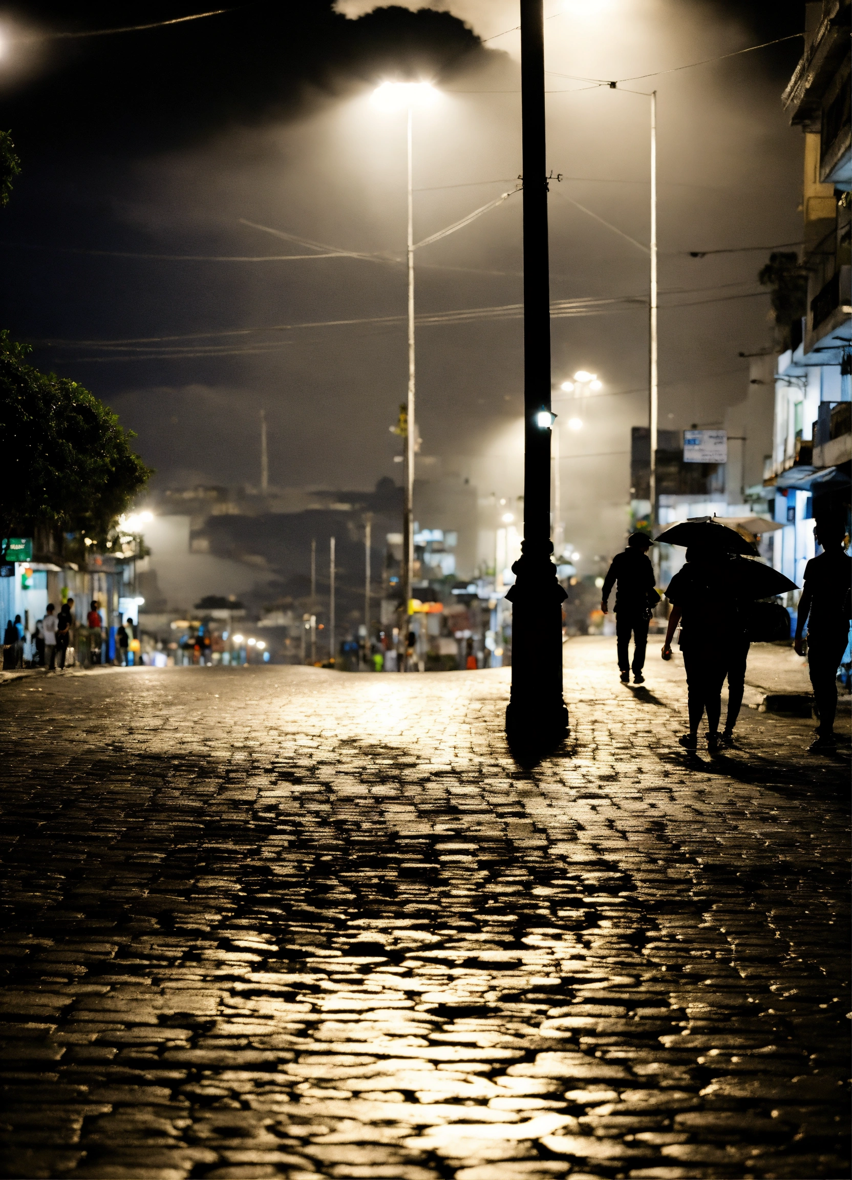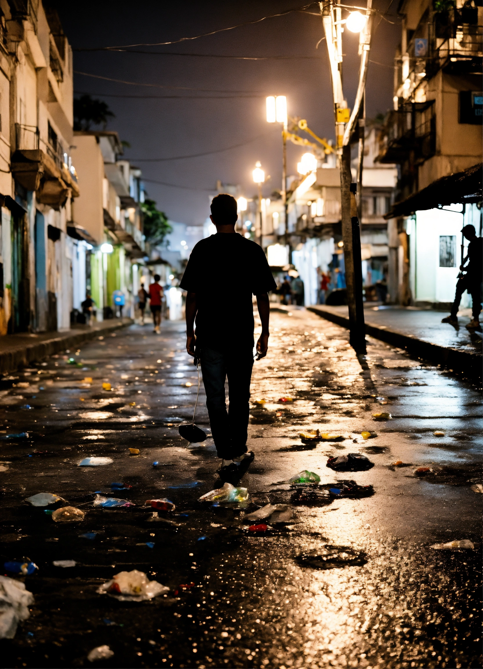Fotografia de menino de rua, descalço em preto e branco de uma noite chuvosa em rio de janeiro, reflexos no pavimento molhado.