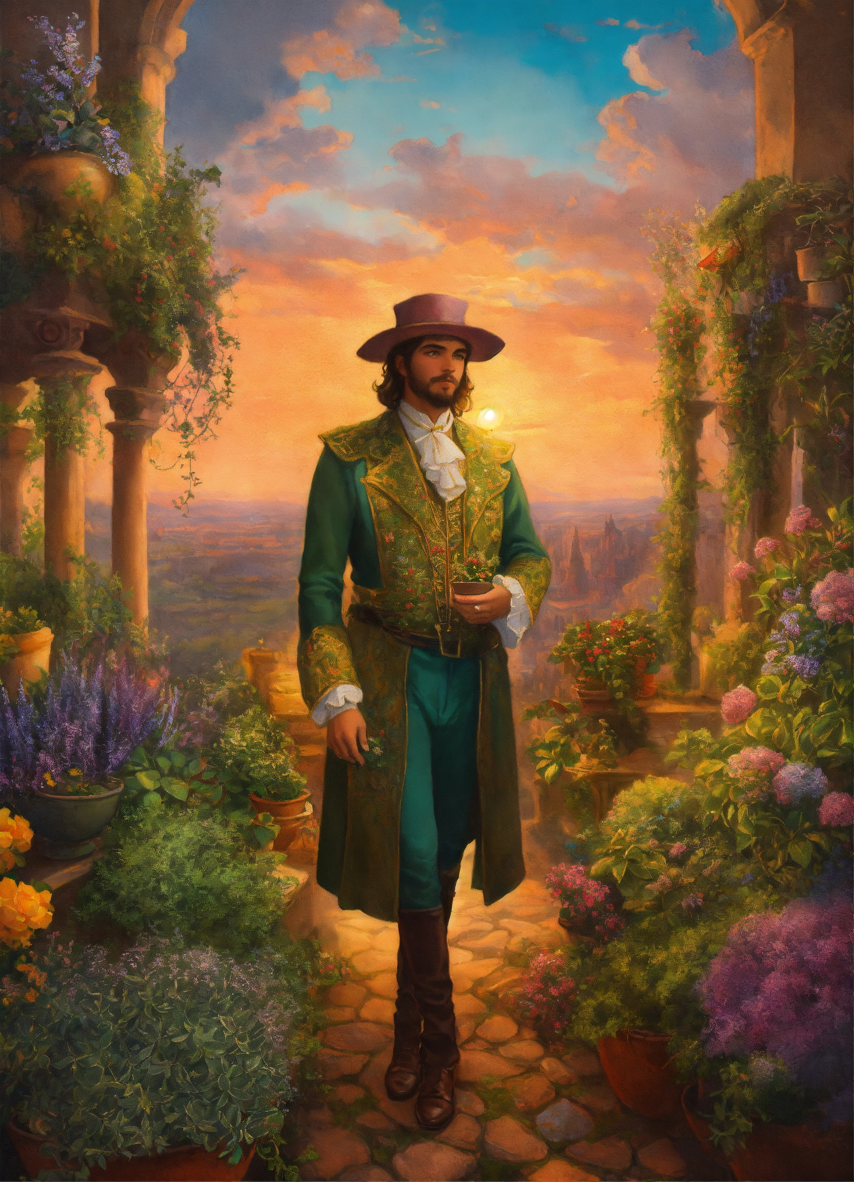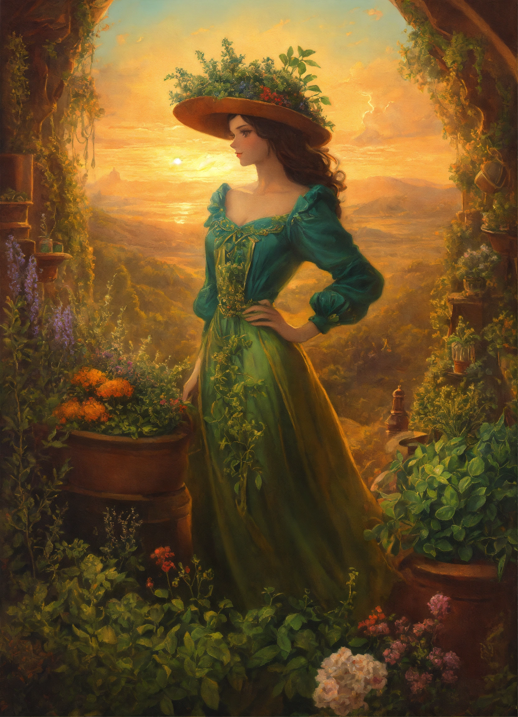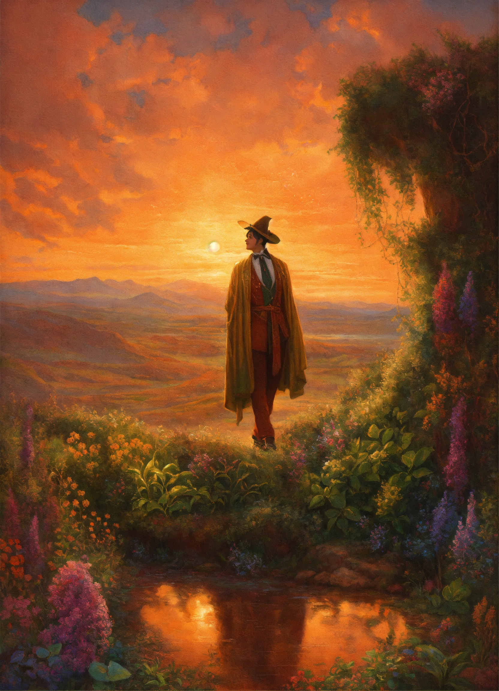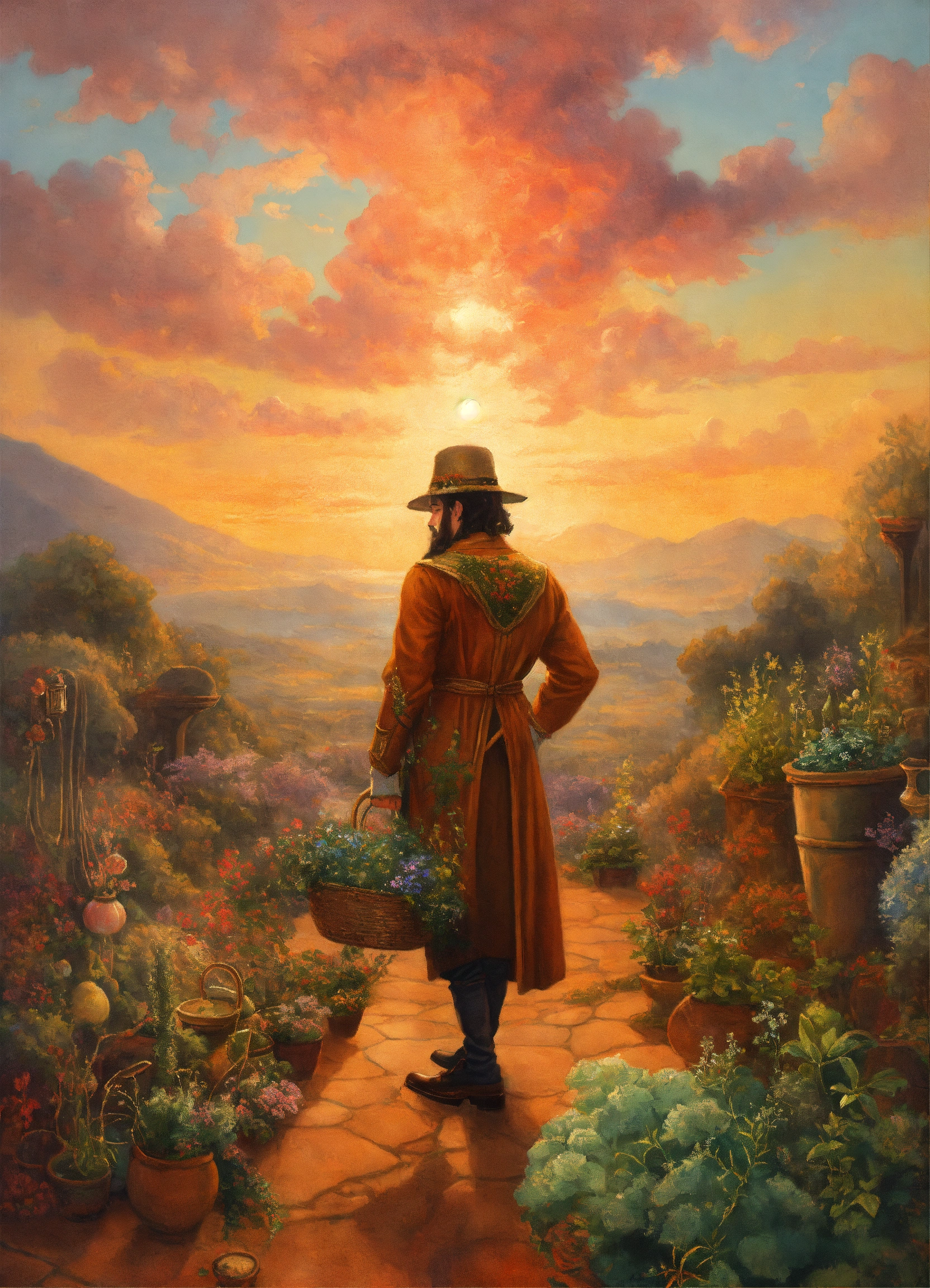 A vintage painting with a fantasy world of various thyme and plants, in which there is a figure of a human, dressed in something magical and impressive, inside this clothes infinity is all in sunset light