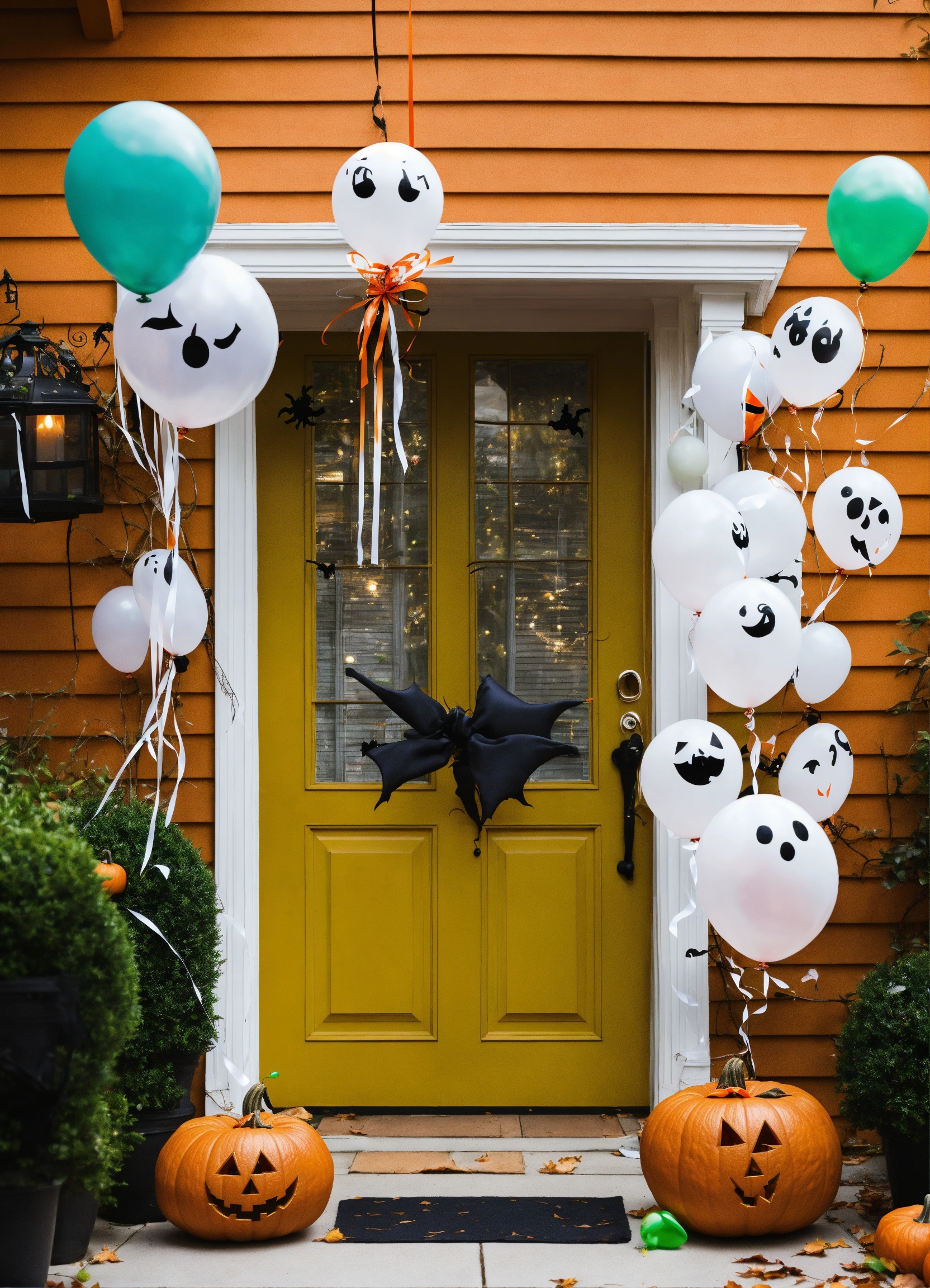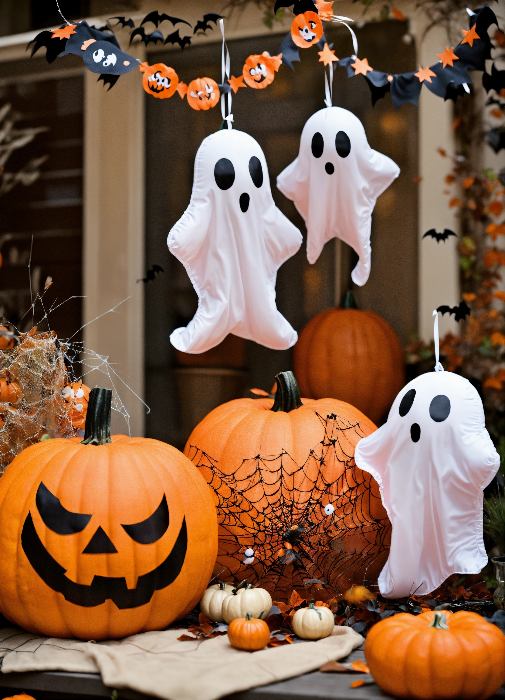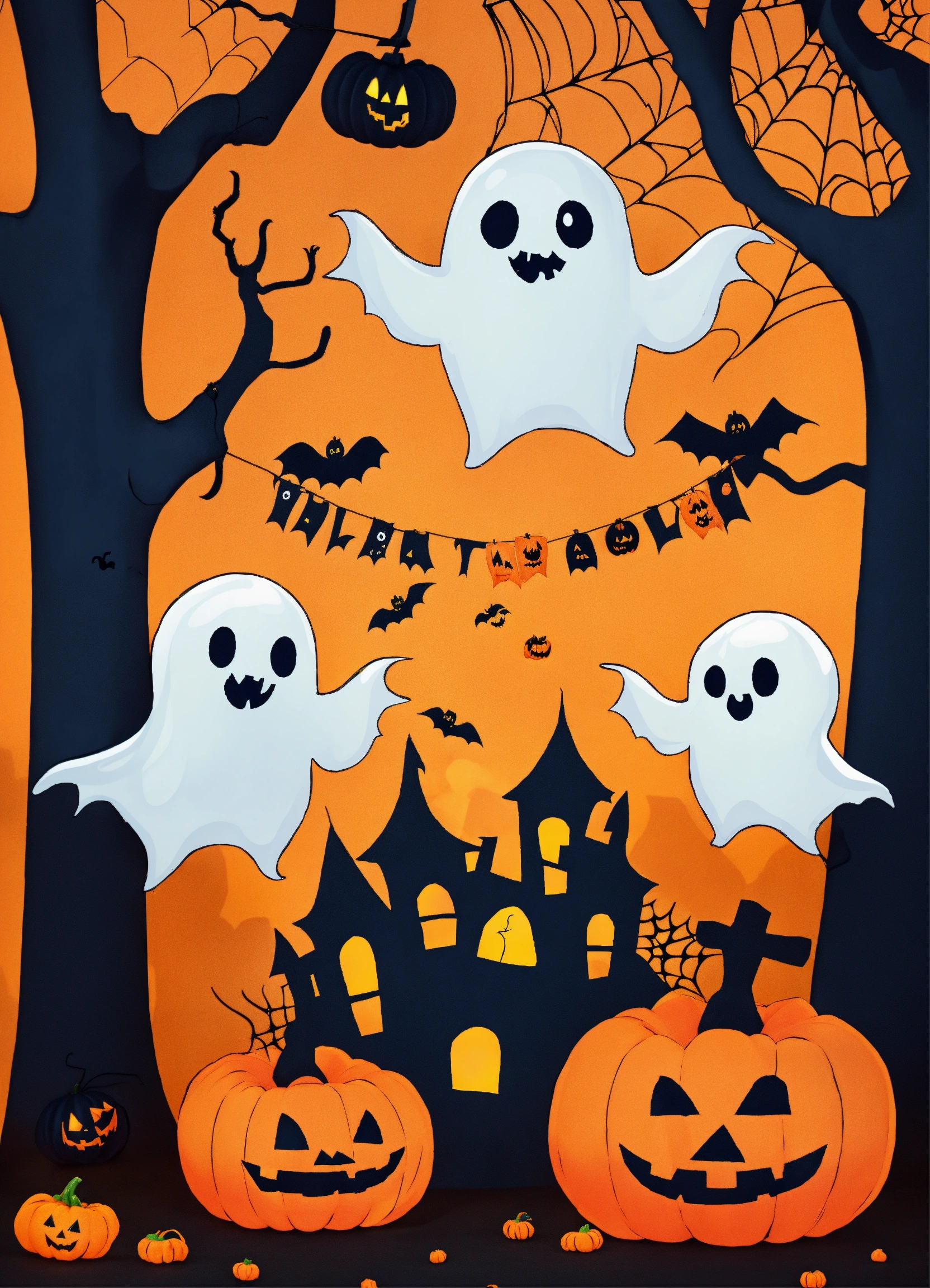 A funny and cute hallowen decoration for kids, cute ghosts, treat or tricks panels, ballons, spider webs