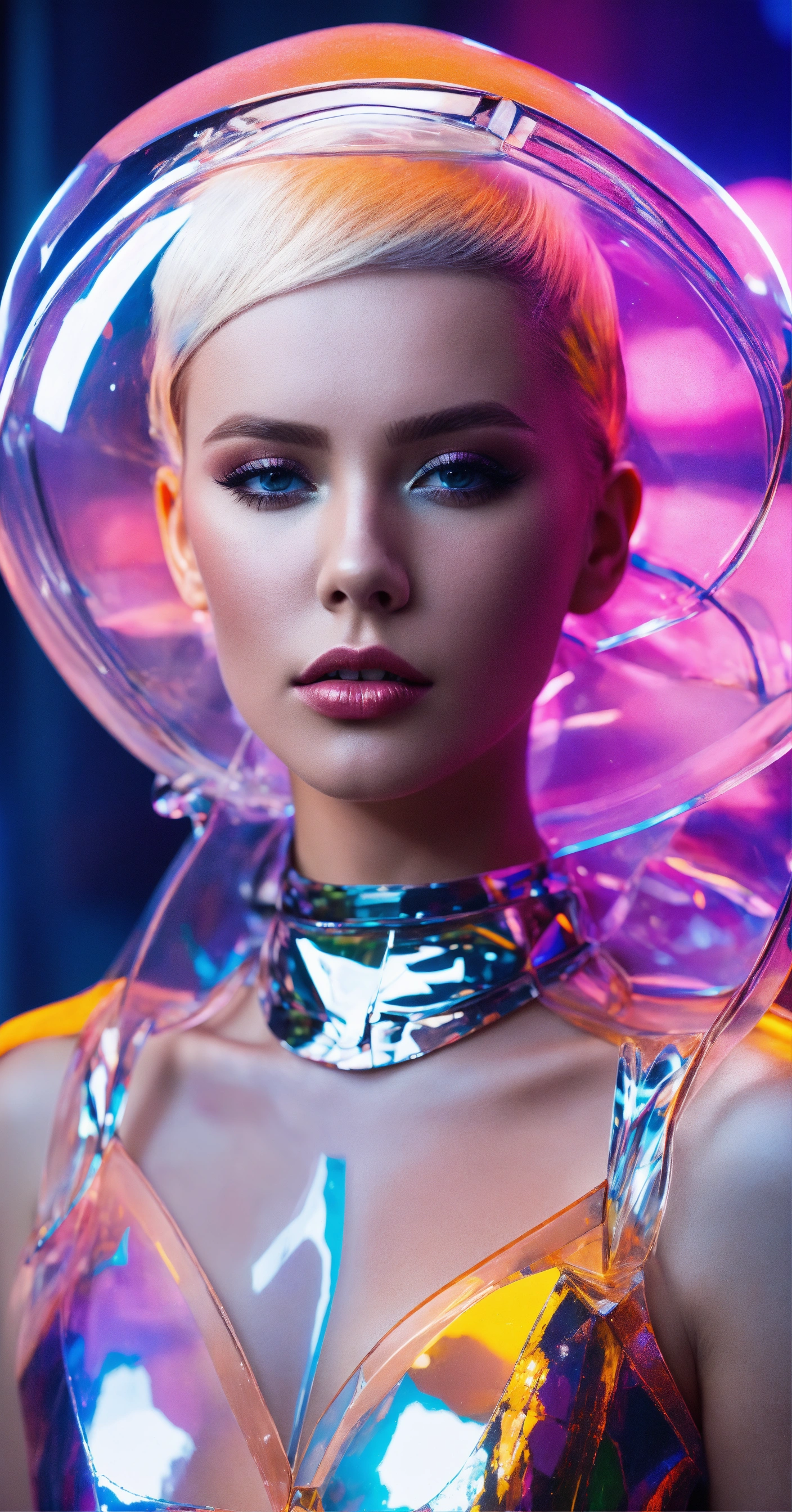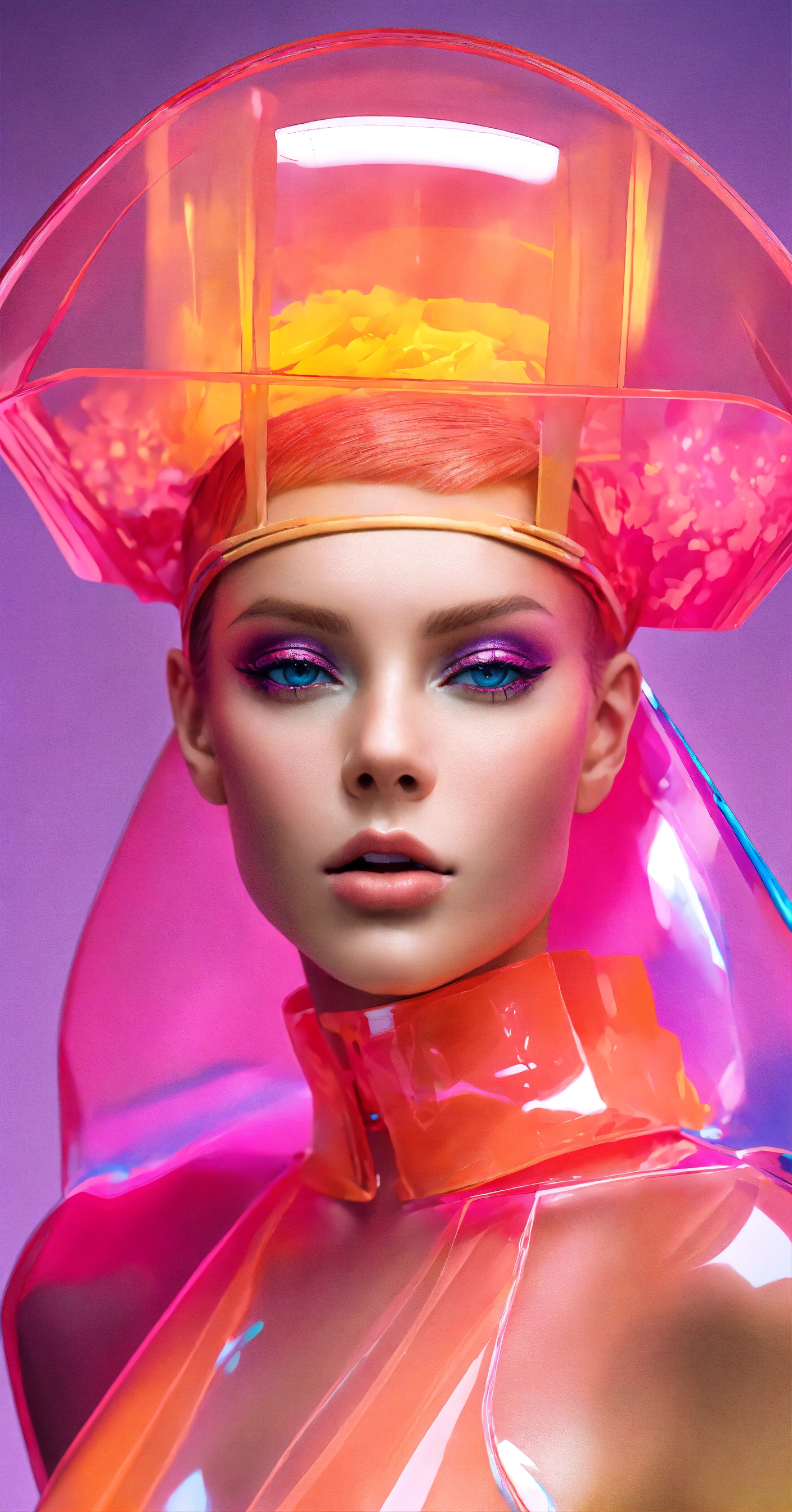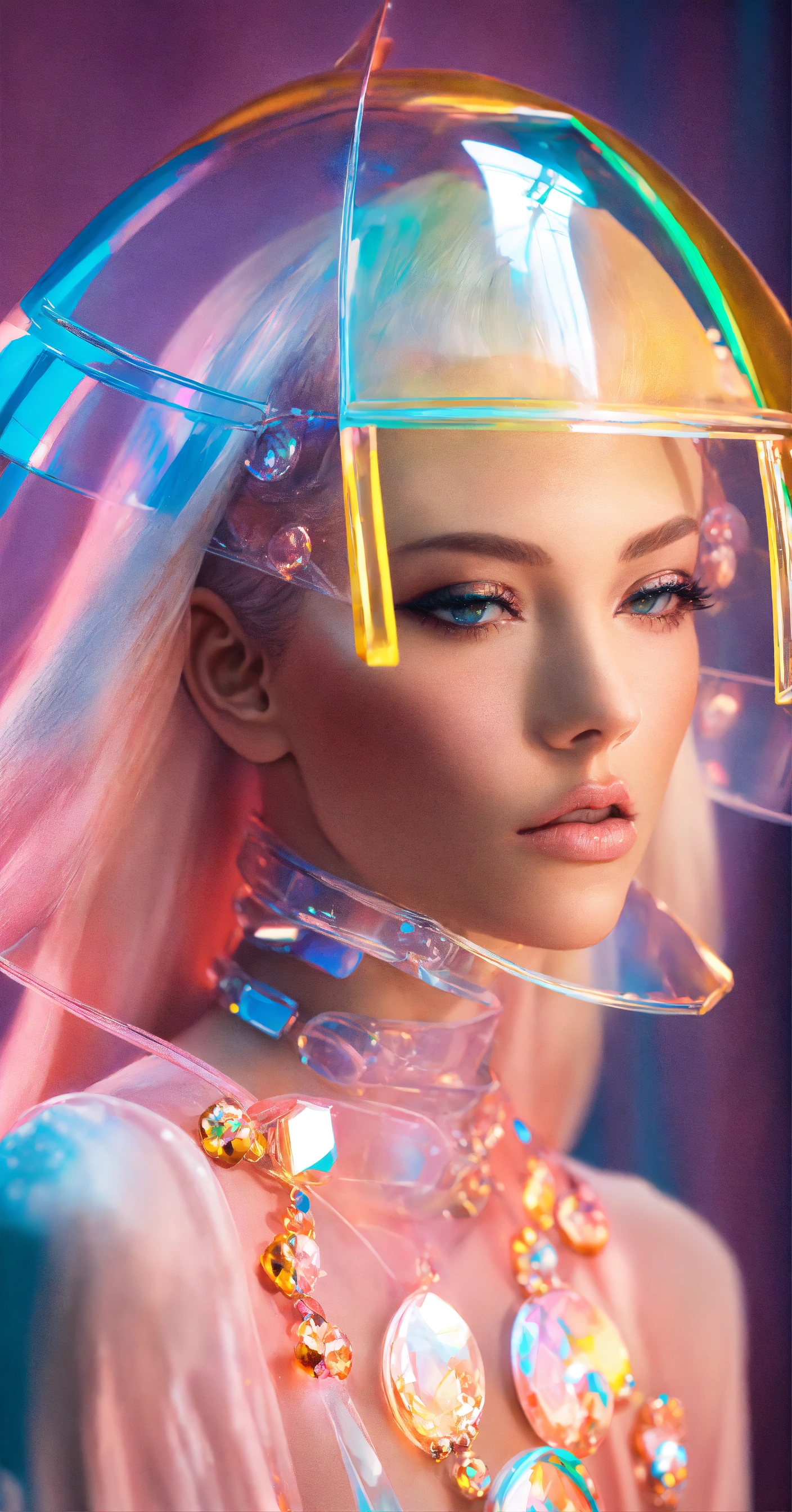 rechercher des détails 311 / 5 000 résultats de traduction résultat de traduction a beautiful blonde pop artist with a futuristic, transparent, elegant, pastel outfit, with a huge centerpiece headpiece, sleek makeup, with depth of field, plexiglass fantasy outfit, bold and regal, captured in bright colors, embodying the essence of fantasy, minimalist