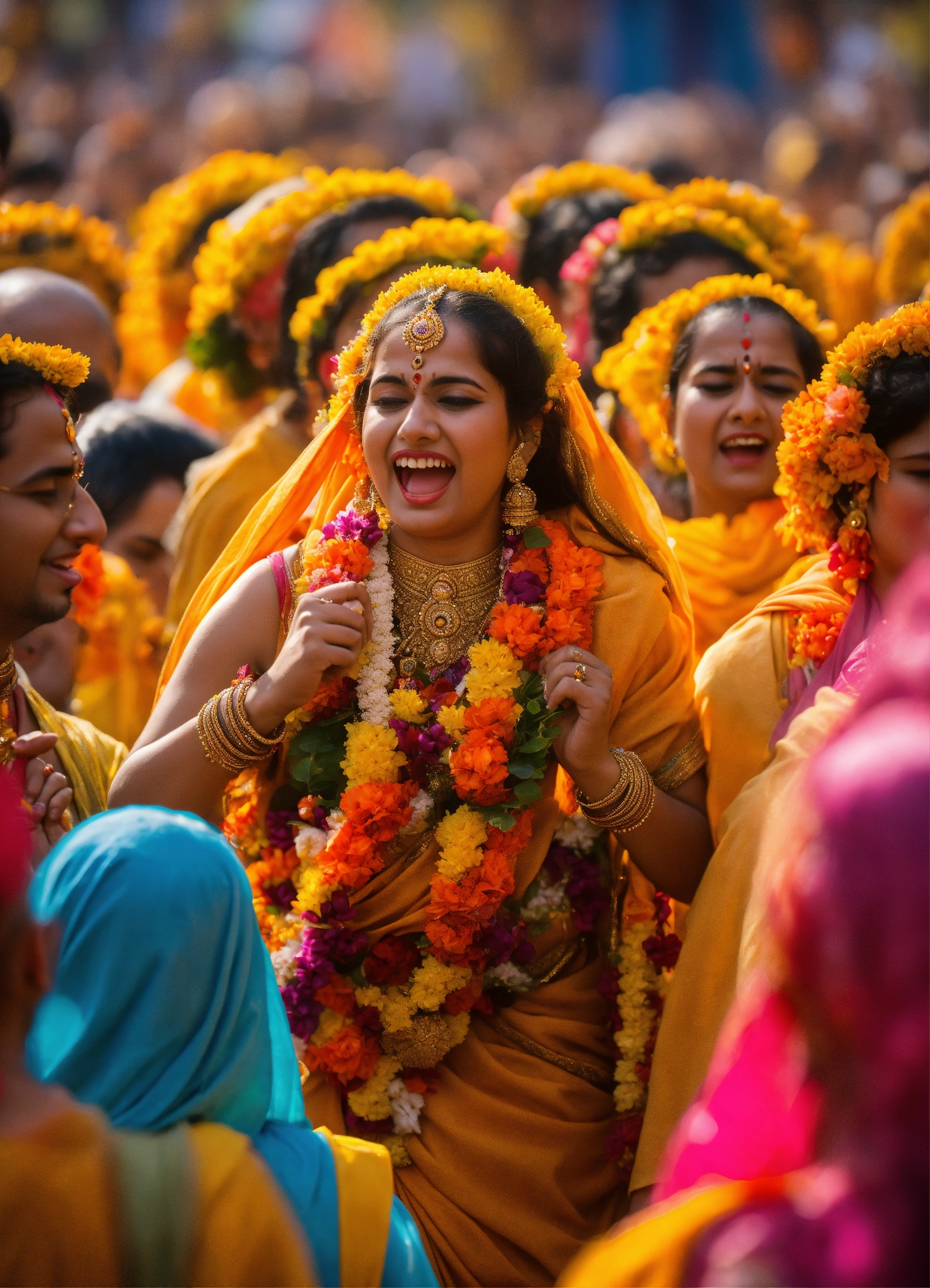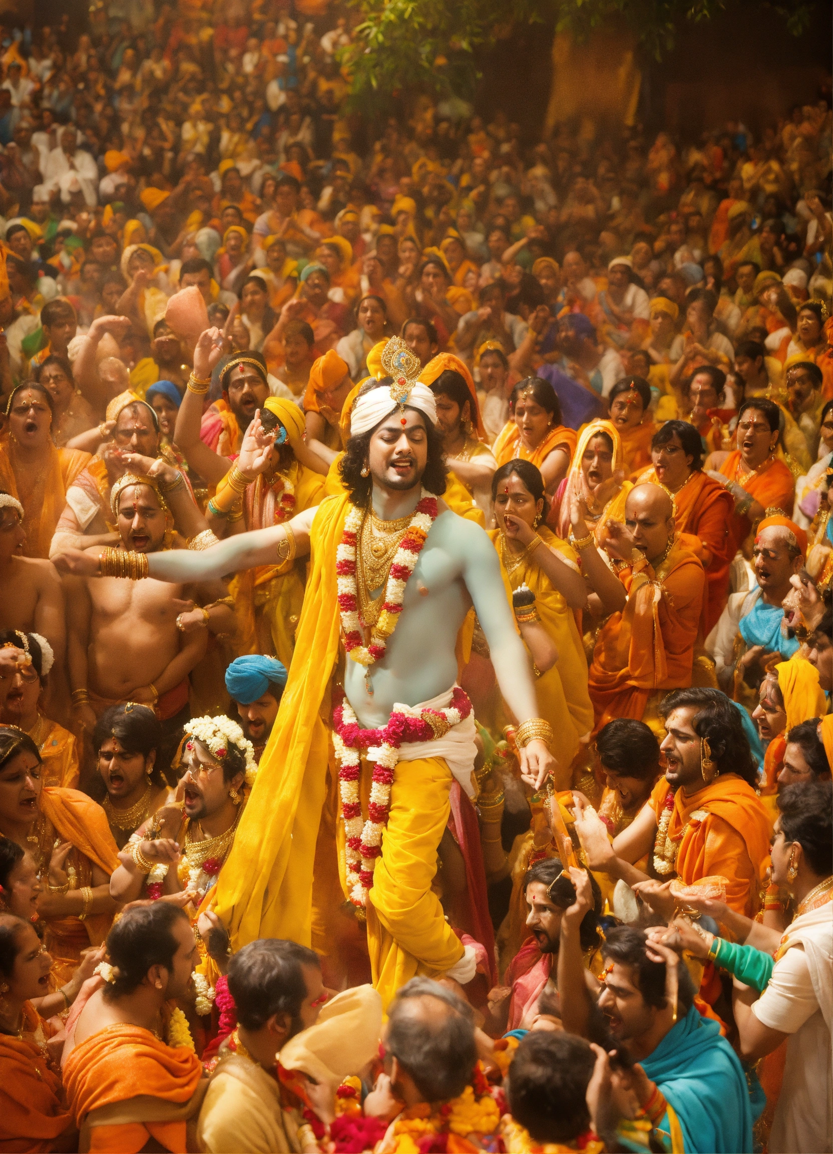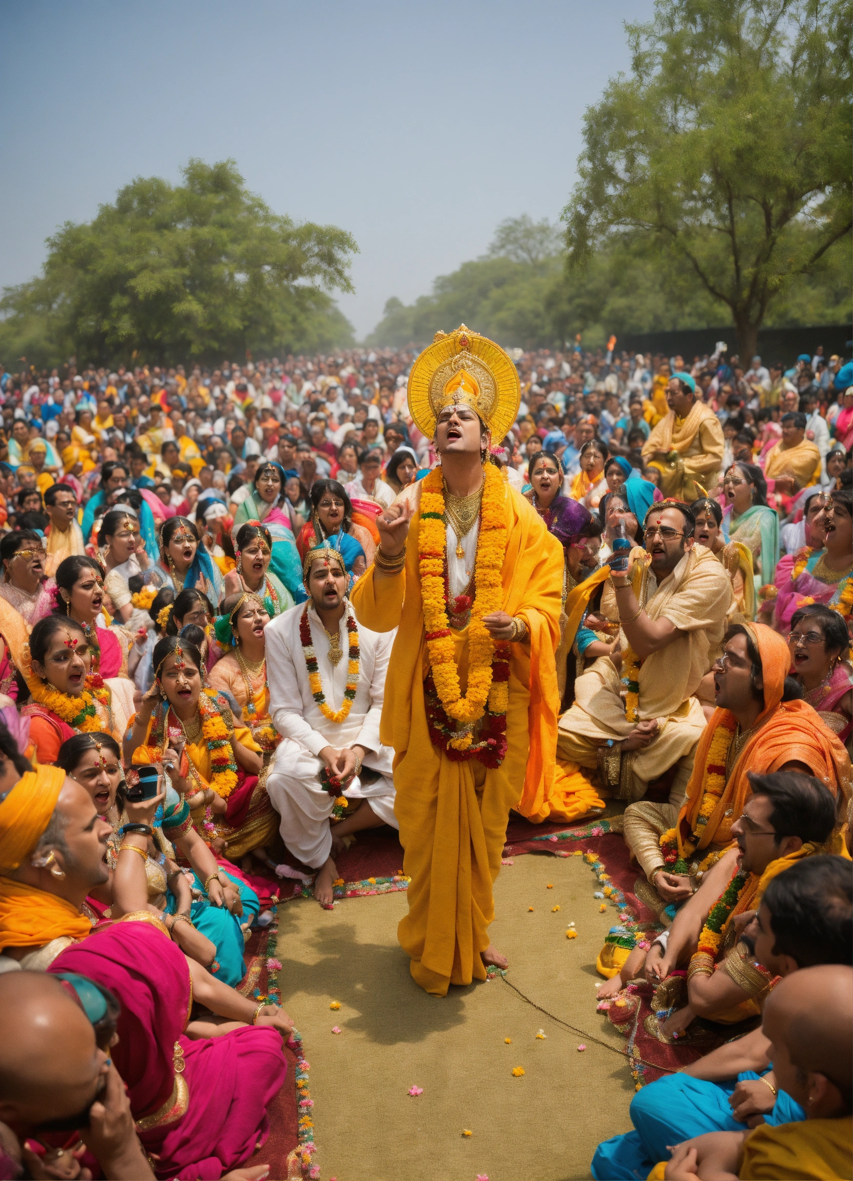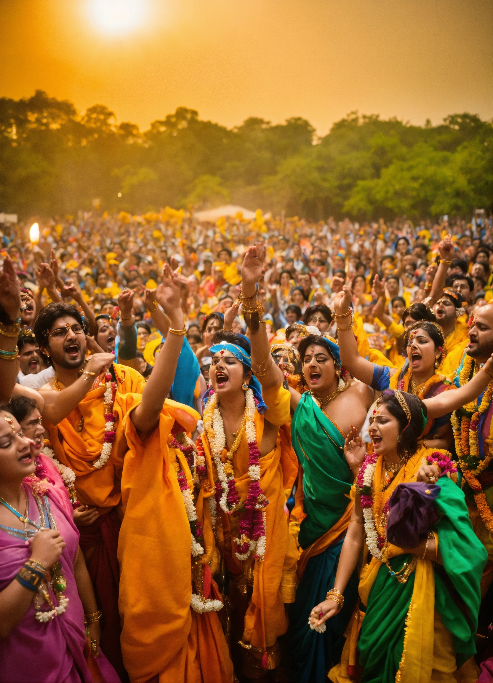Crowd singing hare krishna, hare krishna, krishna krishna, hare hare, rama rama, hare hare & worshipping lord krishna