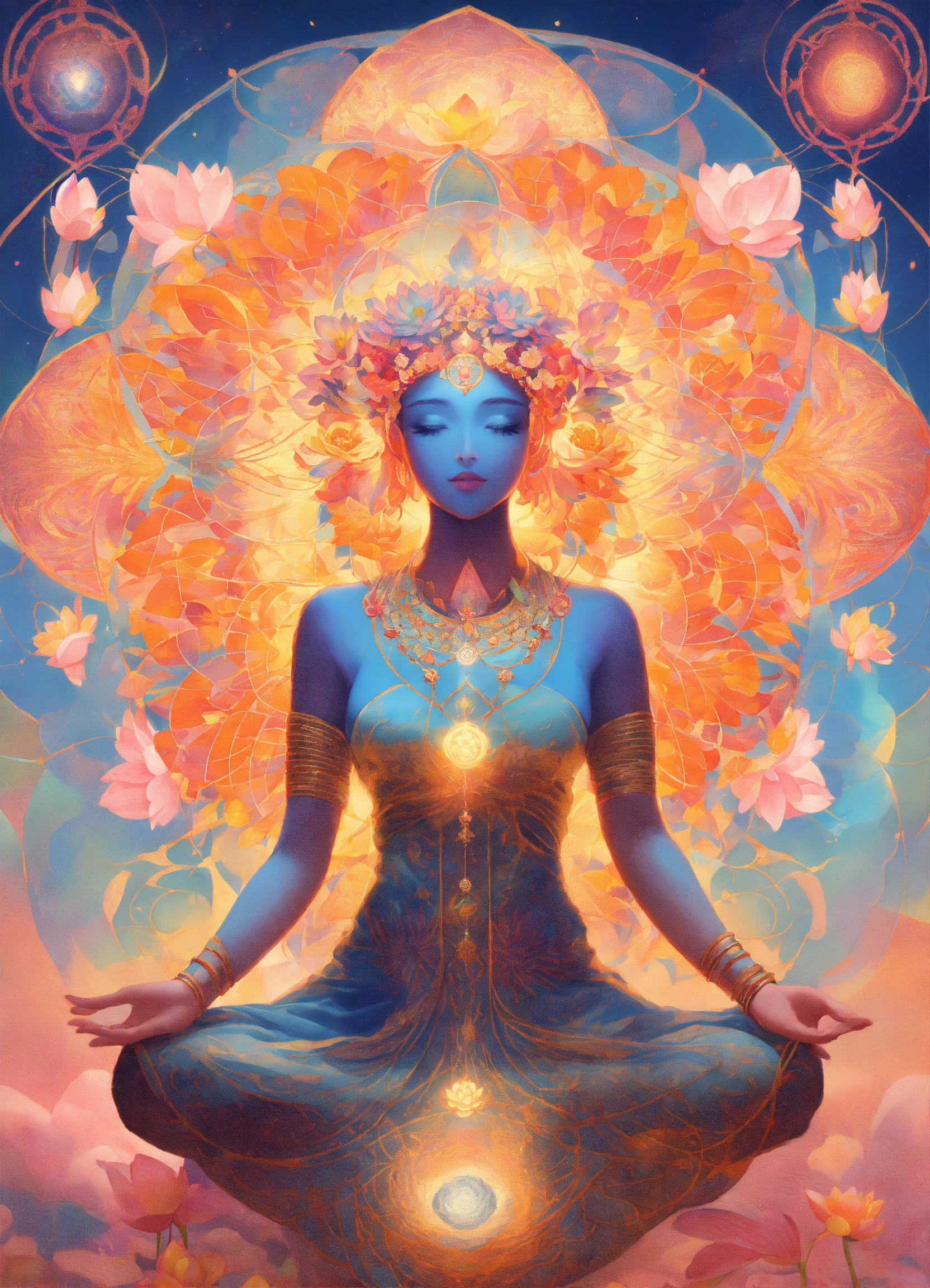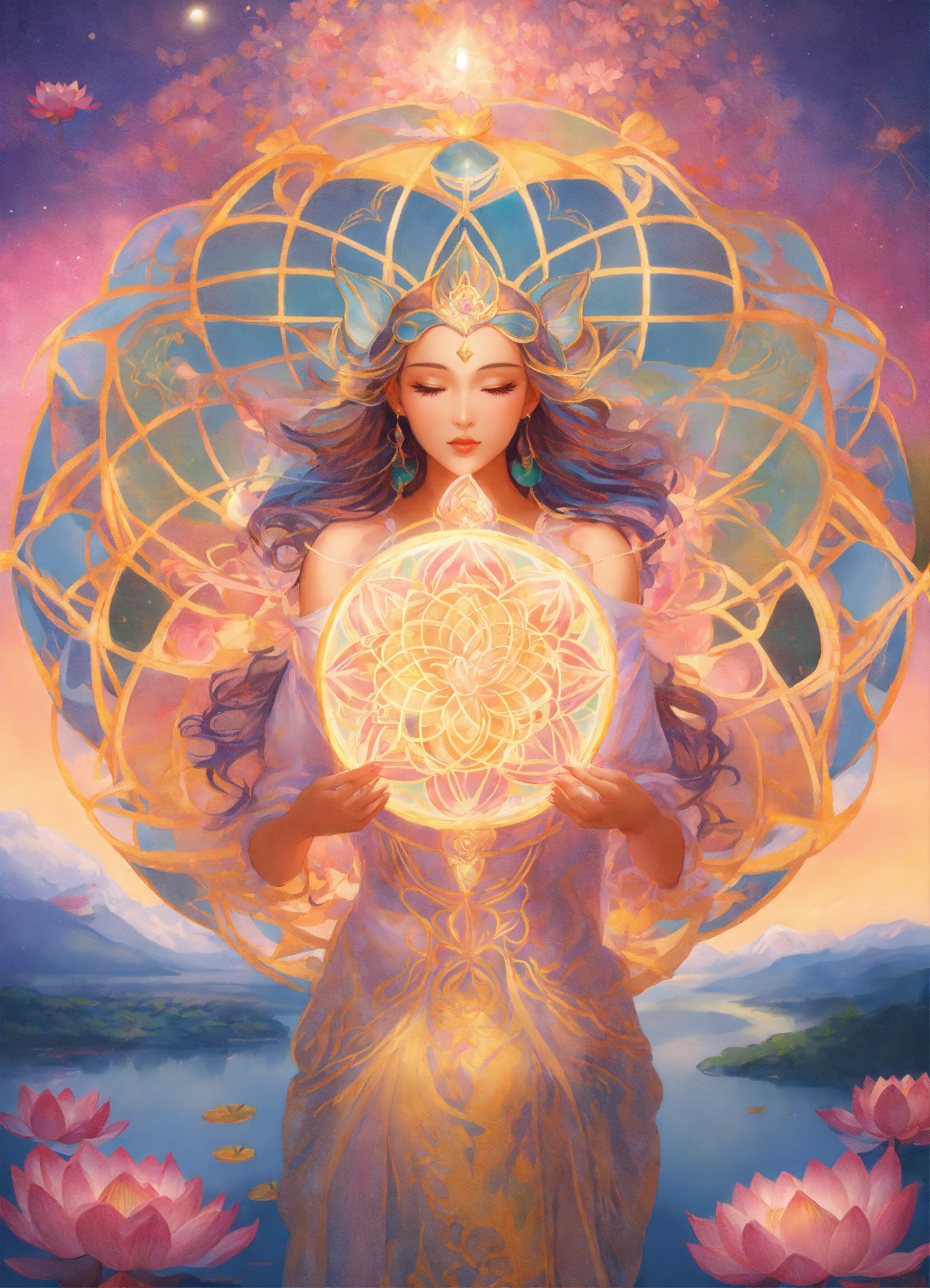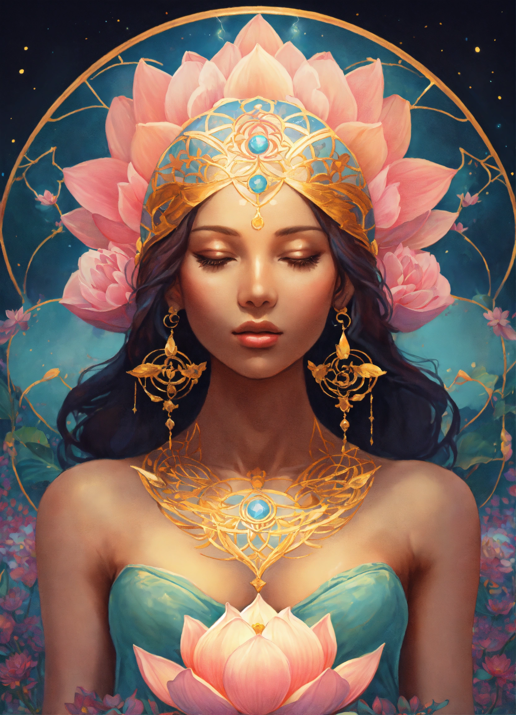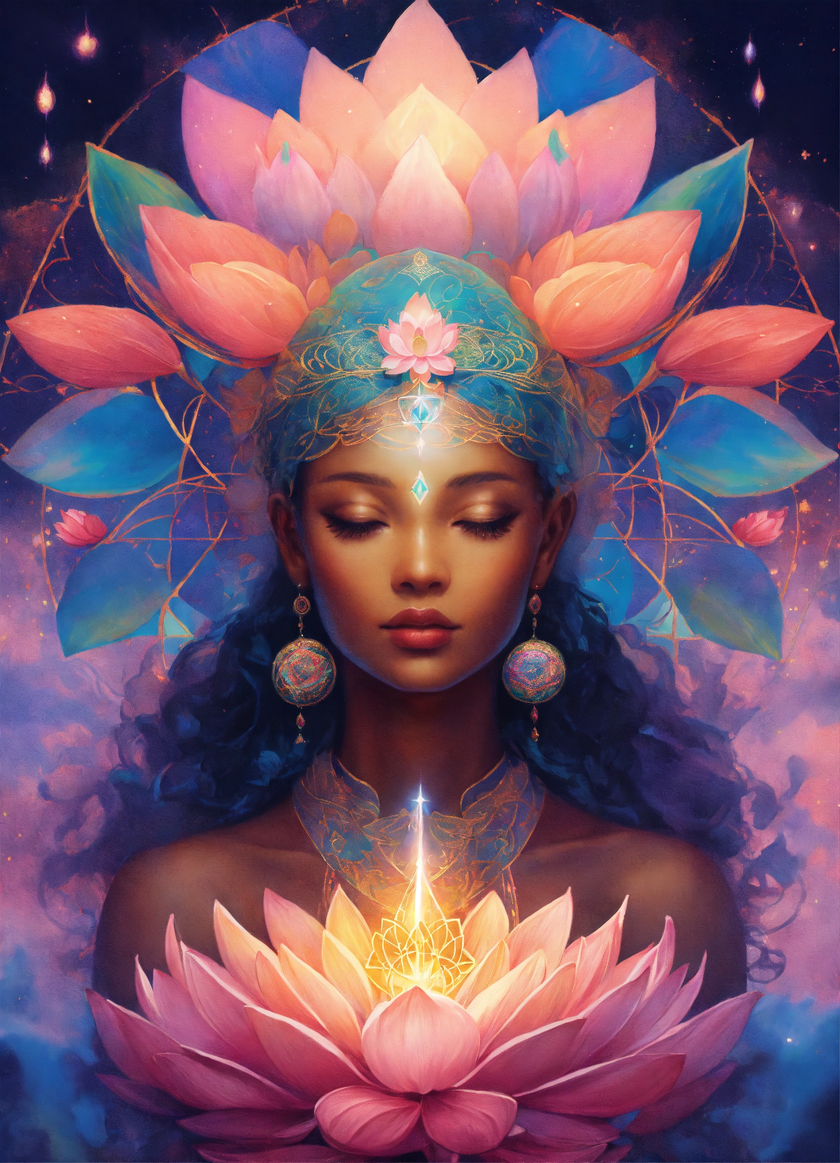 Illustrated like francois batet goddess of lotus flowers, multi cultural beautiful, arms open, symbole spirituel, adn, connected to other universes, to the invisible worlds, pastel colors, shinning light, sacred geometry