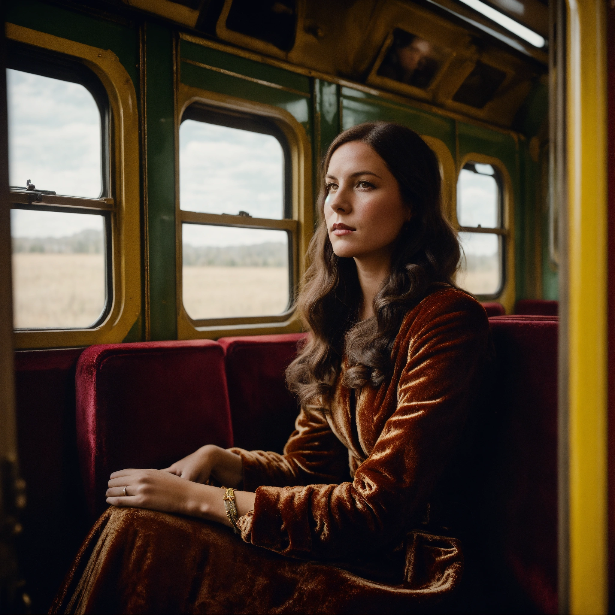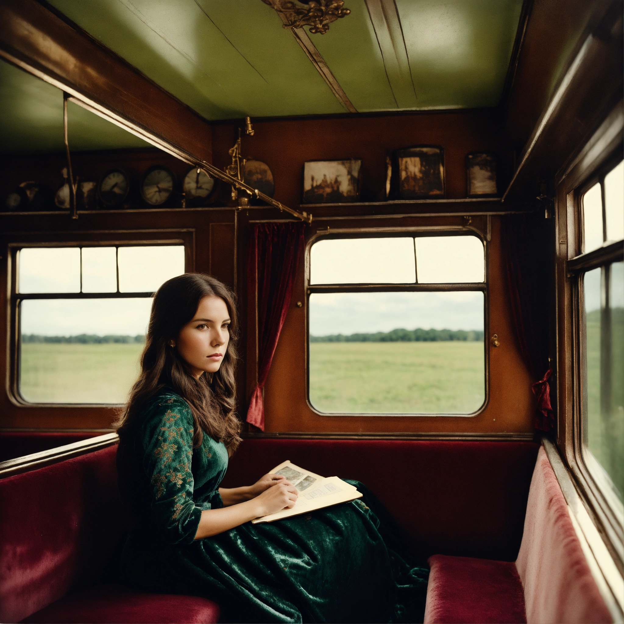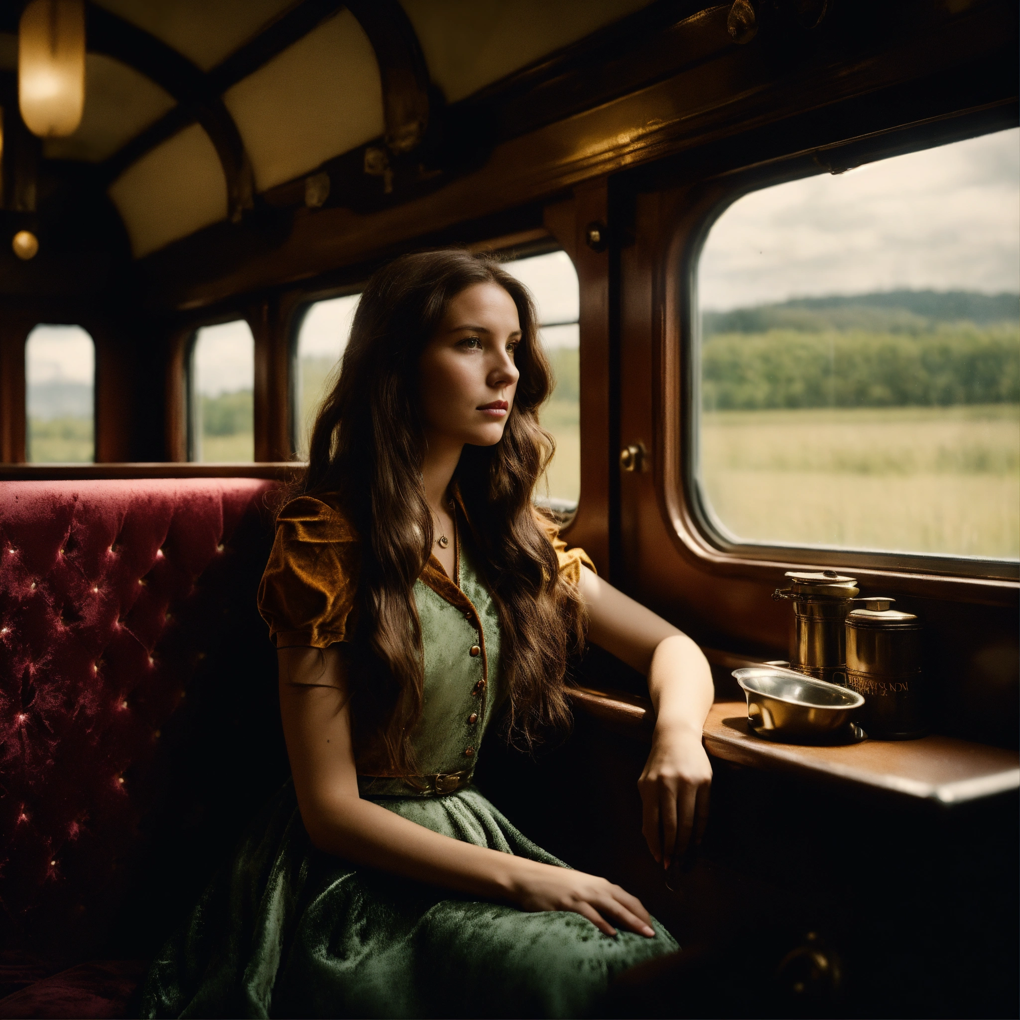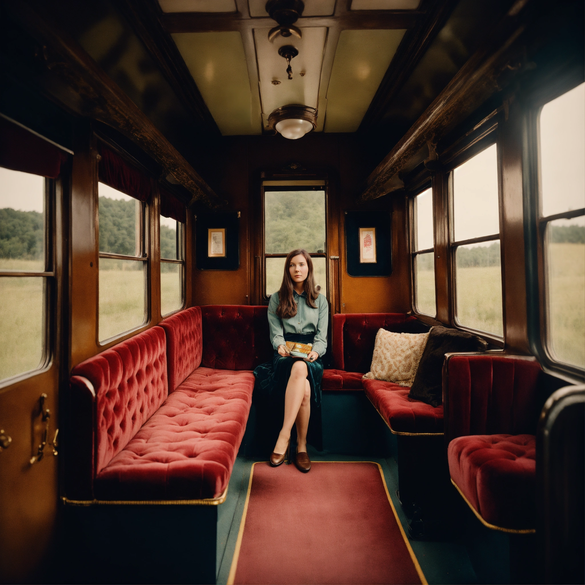 A tintype photograph of a woman with long brown hair sitting in a vintage train carriage with velvet seats on either side of the window, wes anderson colour grading, the woman is looking out of the window