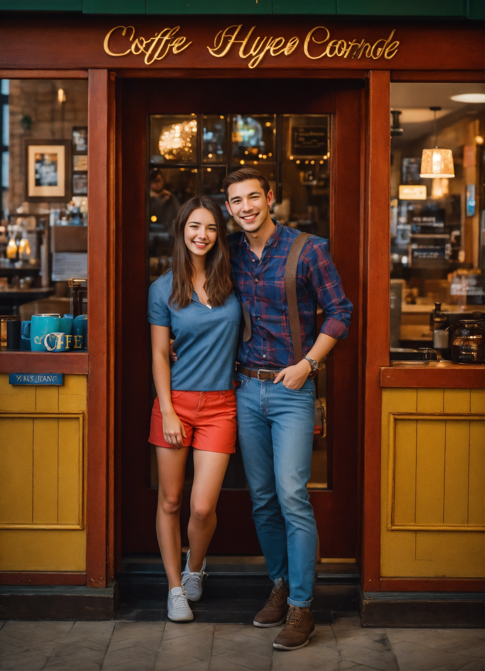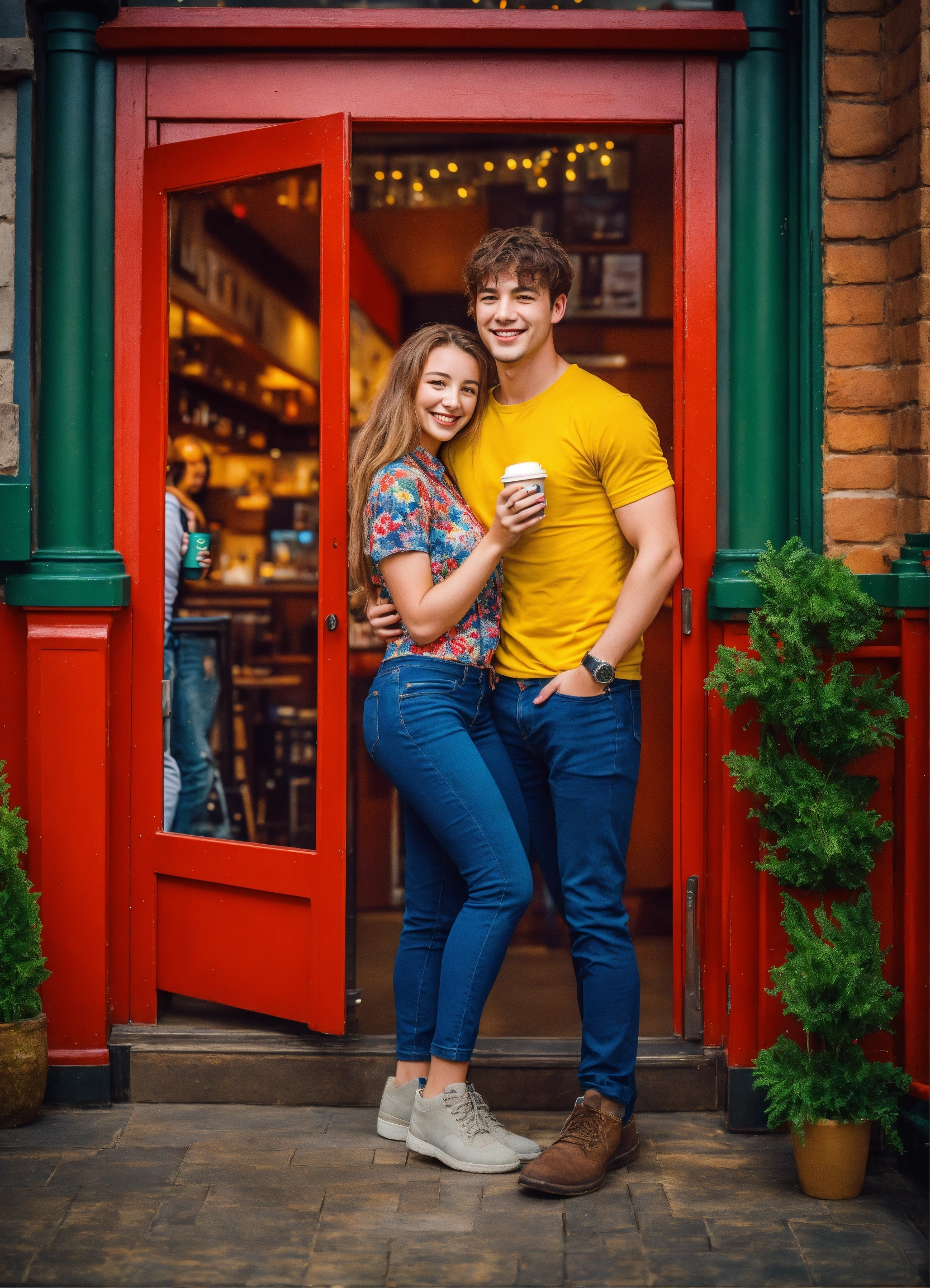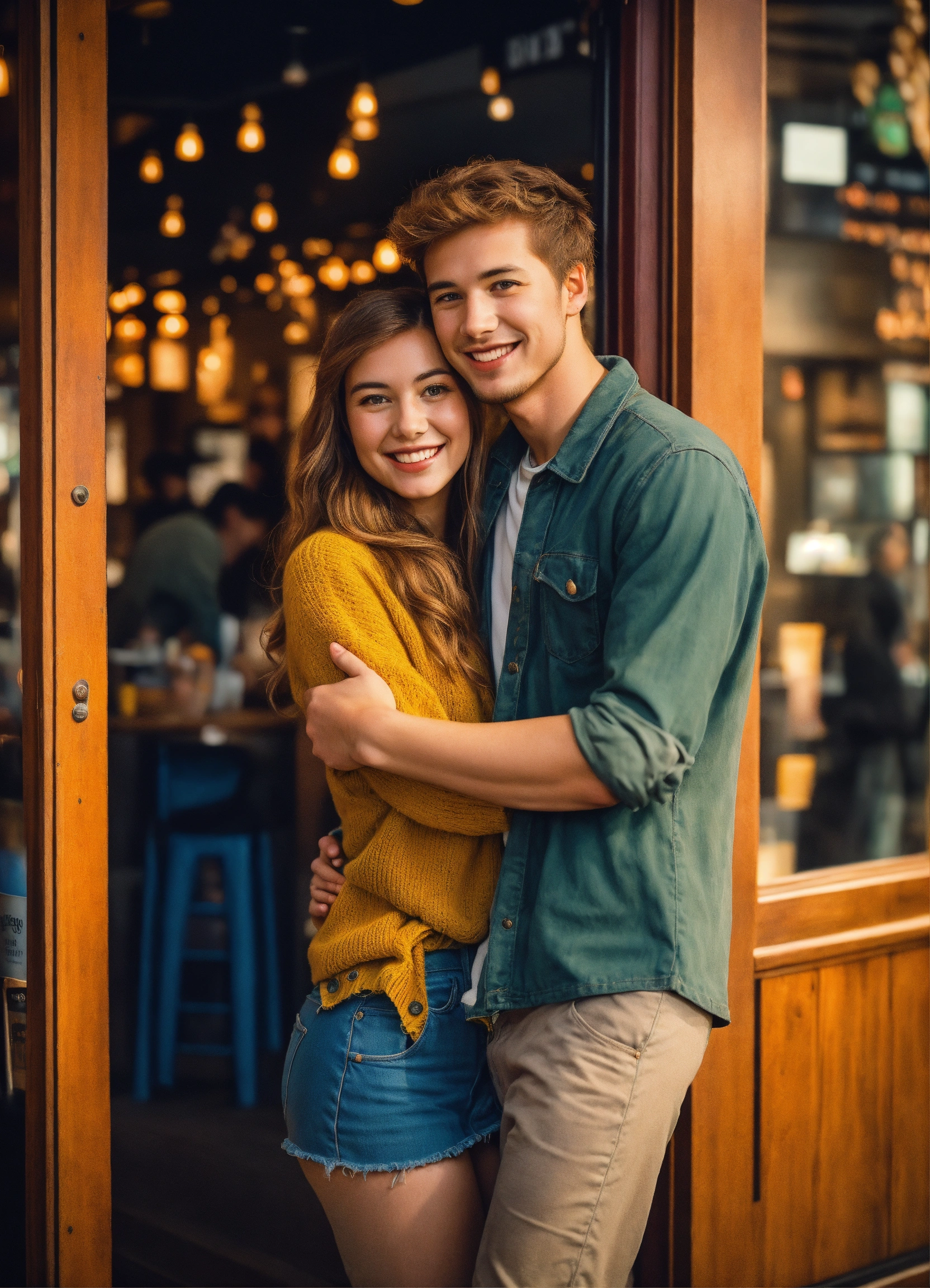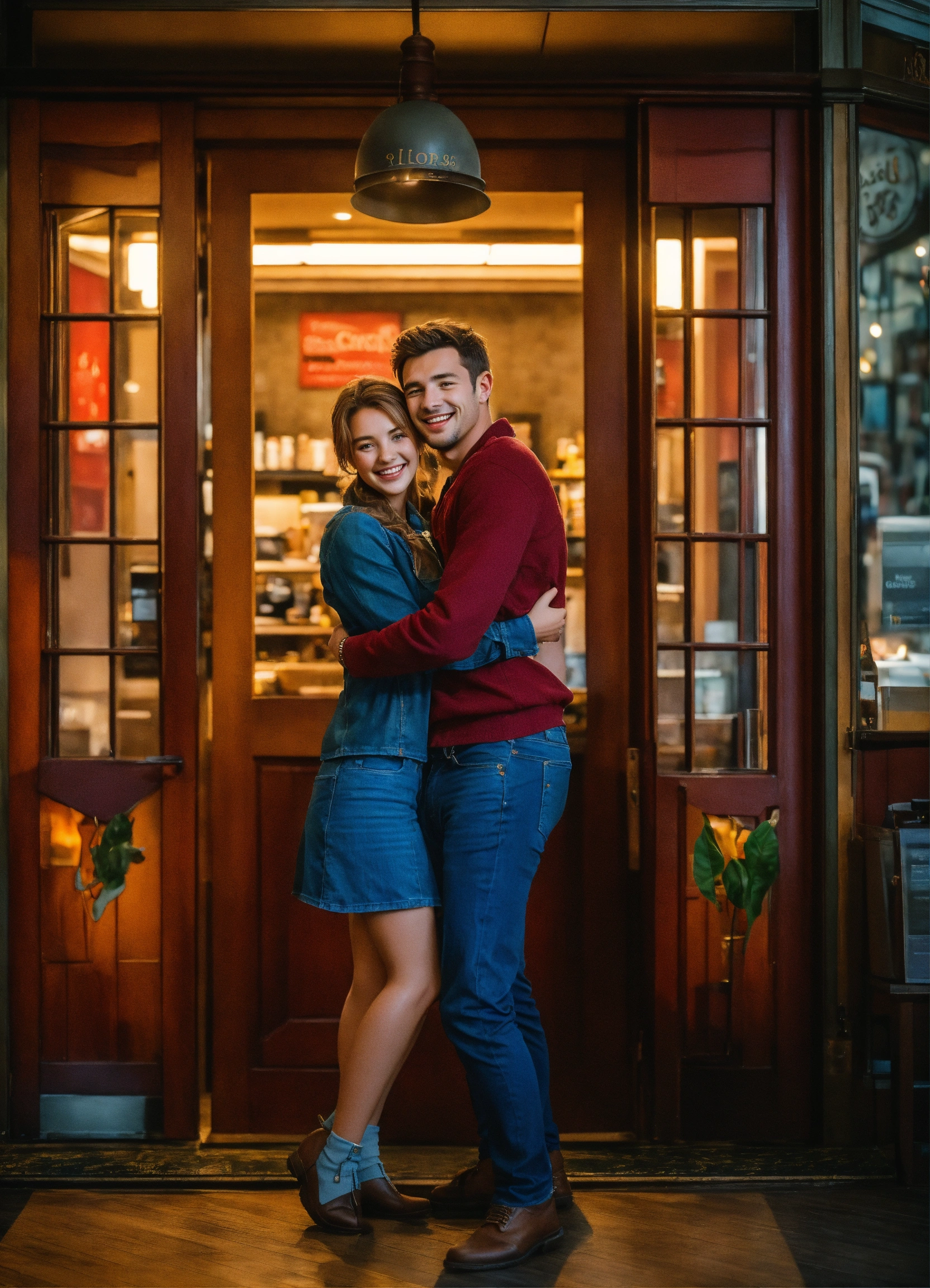 Lucy a young woman and james a young man dressed casually share a friendly hug on the coffee shop entrance with a warm smile. in the style of photo real, hyper-realistic, high dynamic range, rich colors, lifelike textures, 8k uhd, high color depth, nikon d 850, kodak portra 400, fujifilm xt