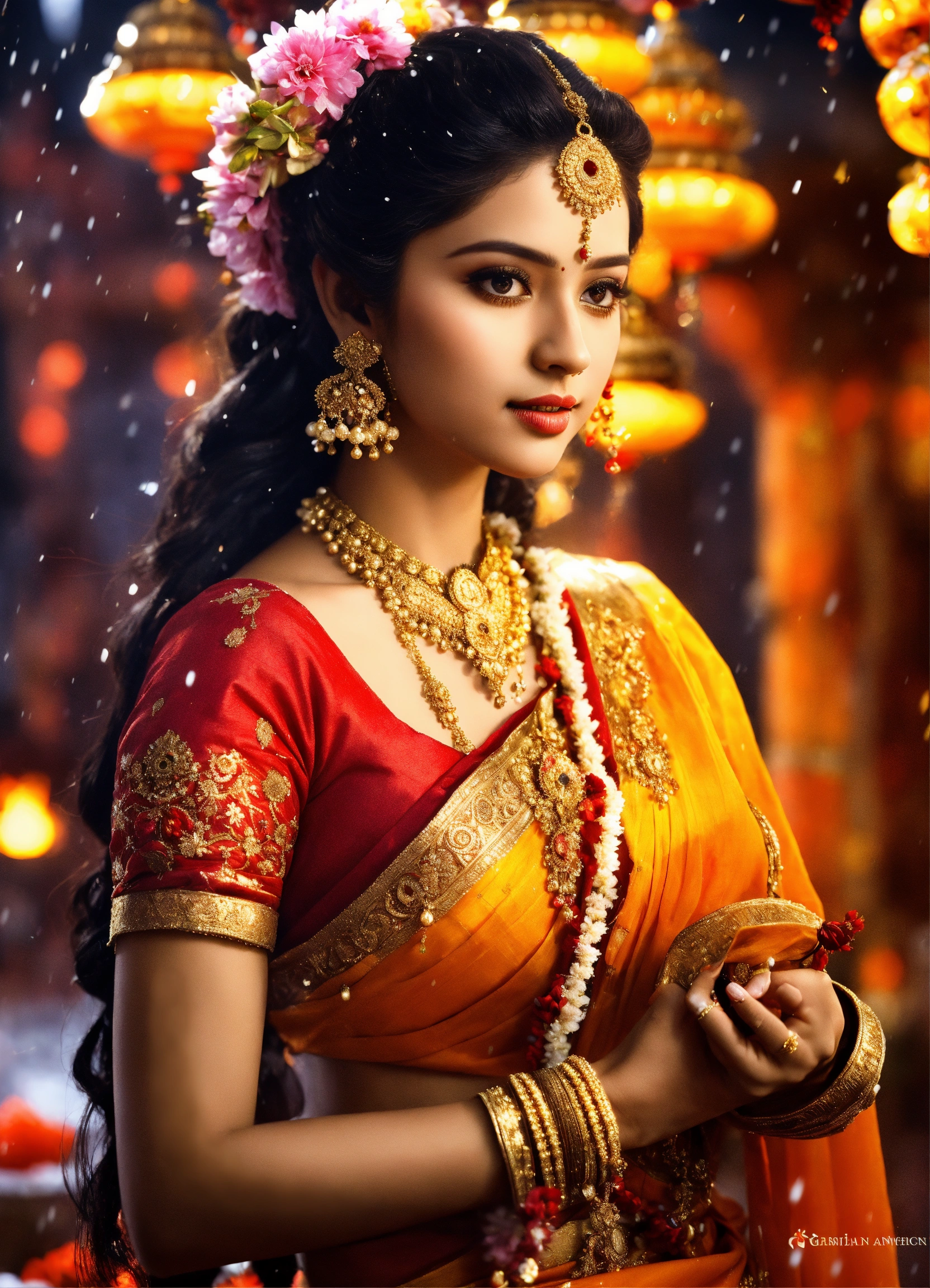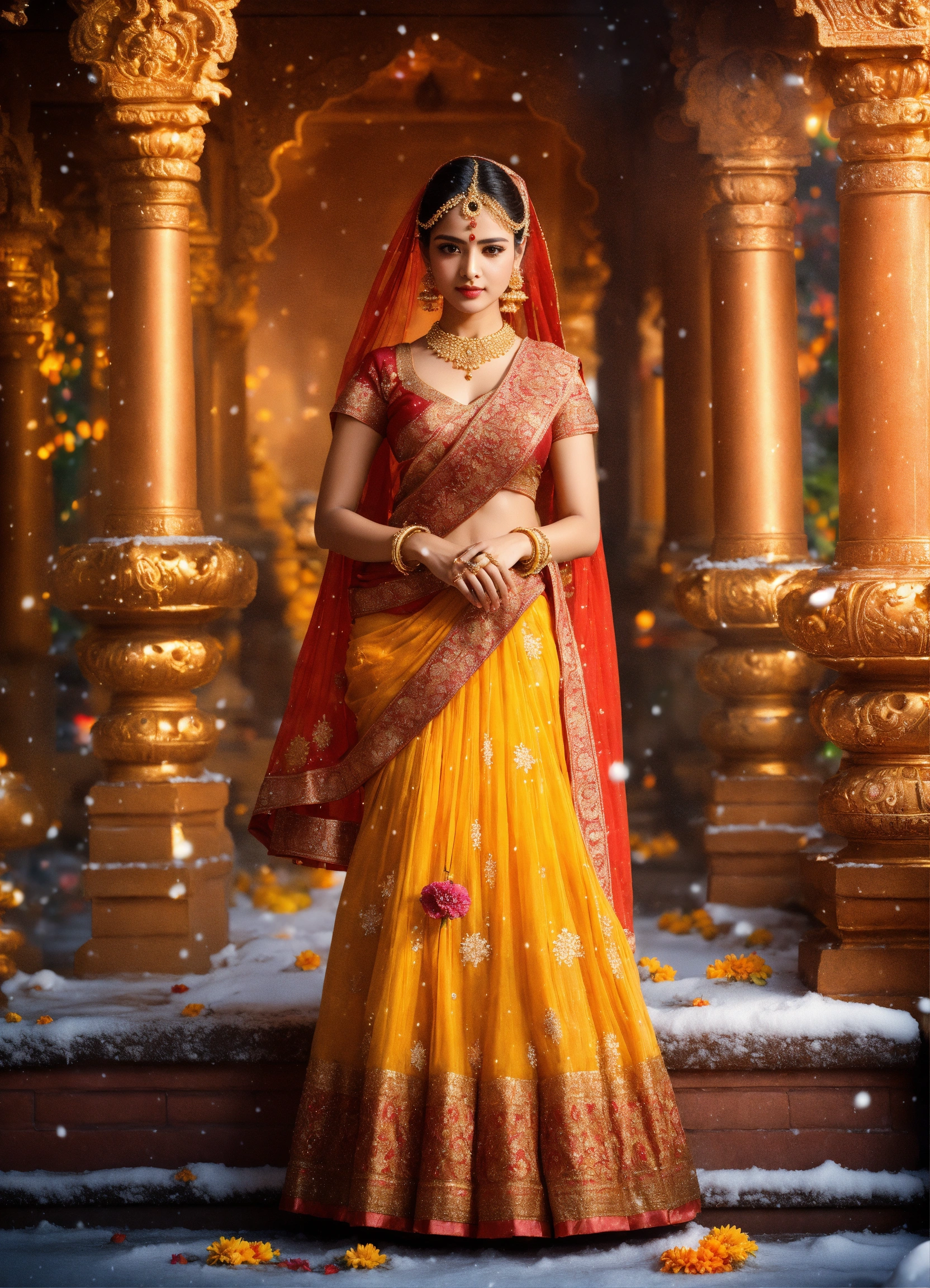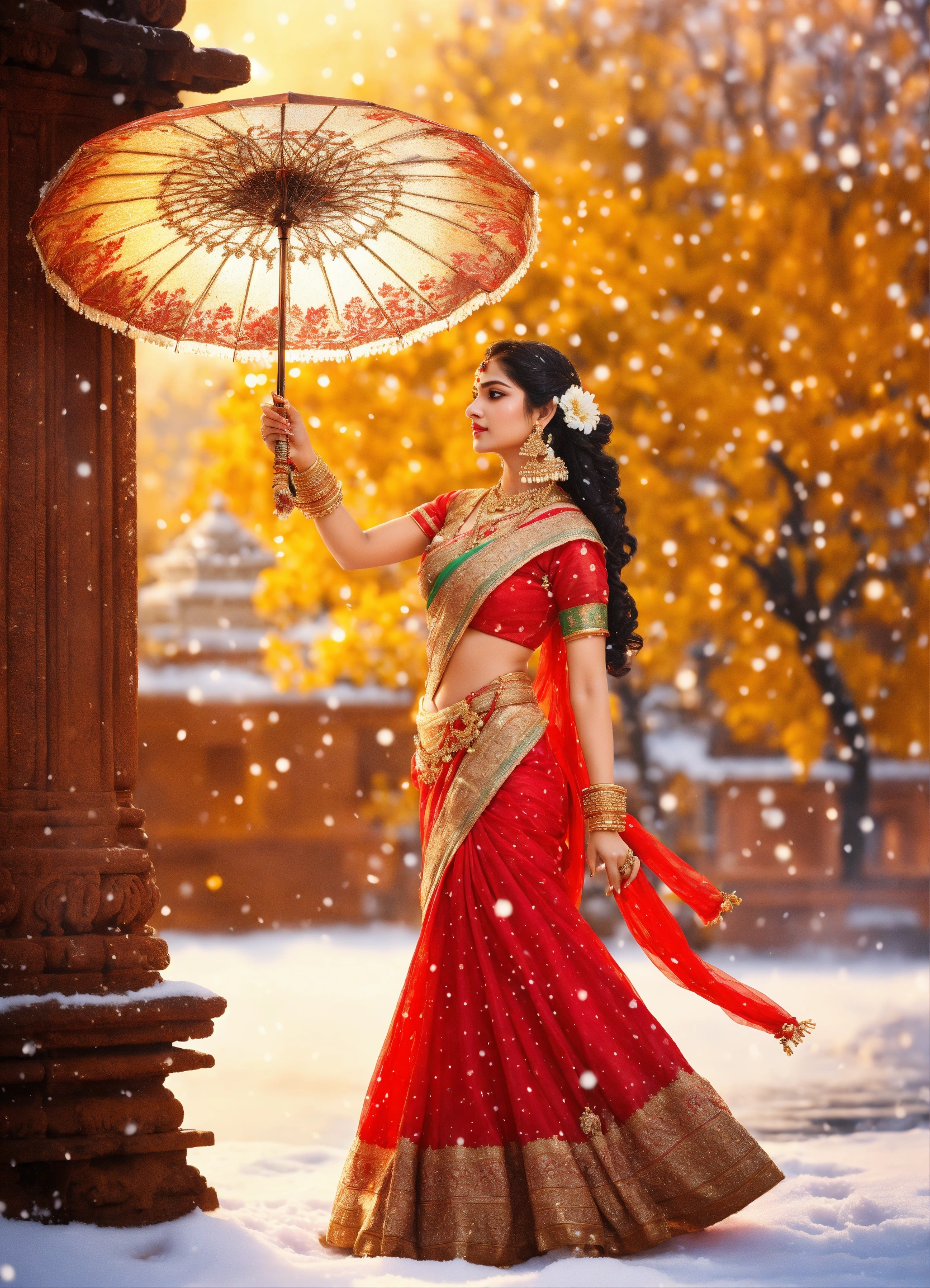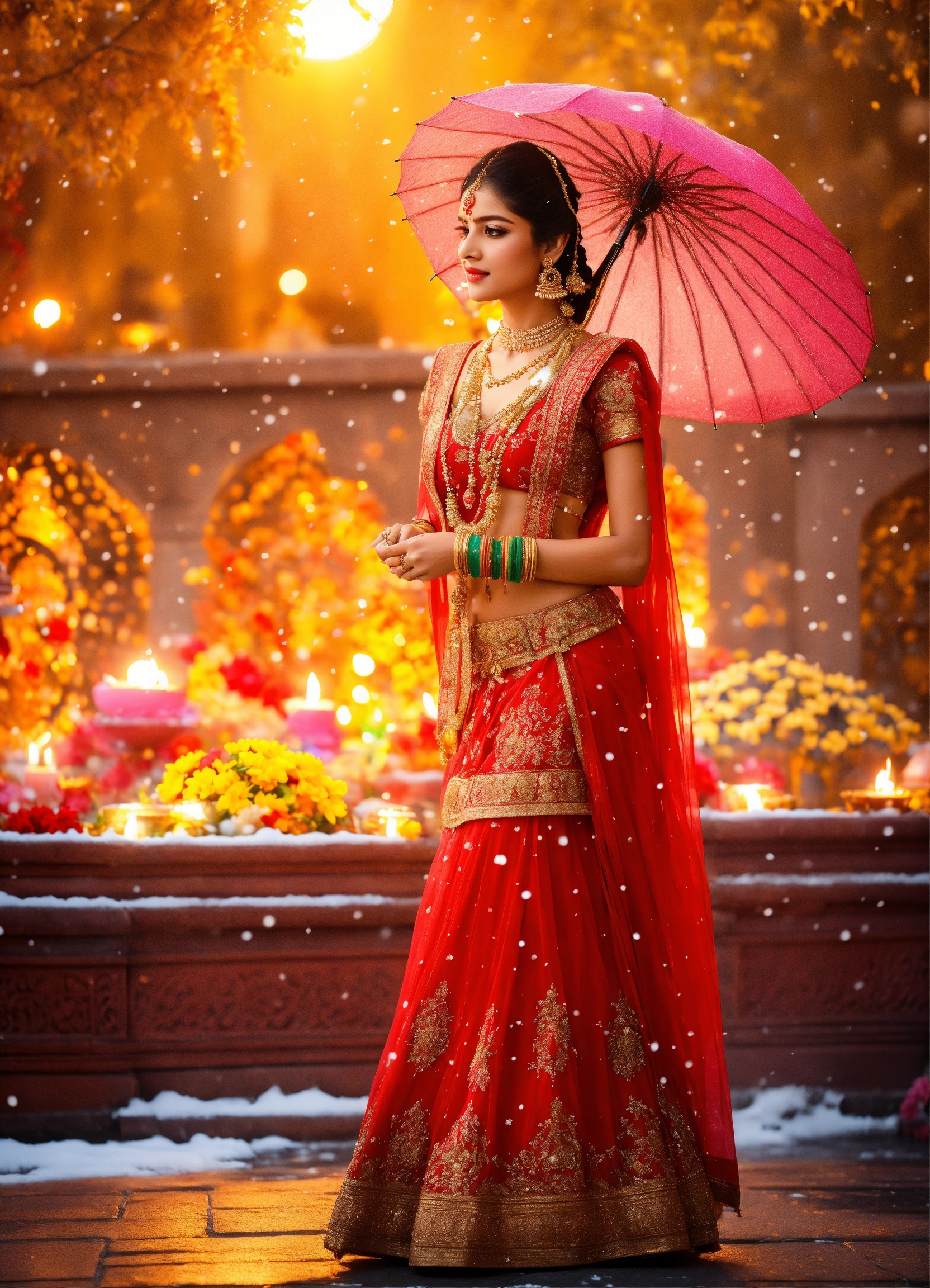 Diwali celebrations. beautiful picture, ancient costume beauty, the most beautiful cg, water tender, water, pour city, beautiful, beauty, beauty, lengyan, meticulous depicting, wearing ancient costume, gorgeous dress, dignified appearance, a flower umbrella, umbrella, background ancient hindu temple in snow area, snow, depict golden snow falling, detailed characterization, crystal, ball hair, delicate characterization eyes, whole body, high-definition, 16k, ornaments, highlight effects, full backlight, depth detailed characterization features stereo, detailed depict eyes, the accurate proportion, the size balance, perfect masterpiece
