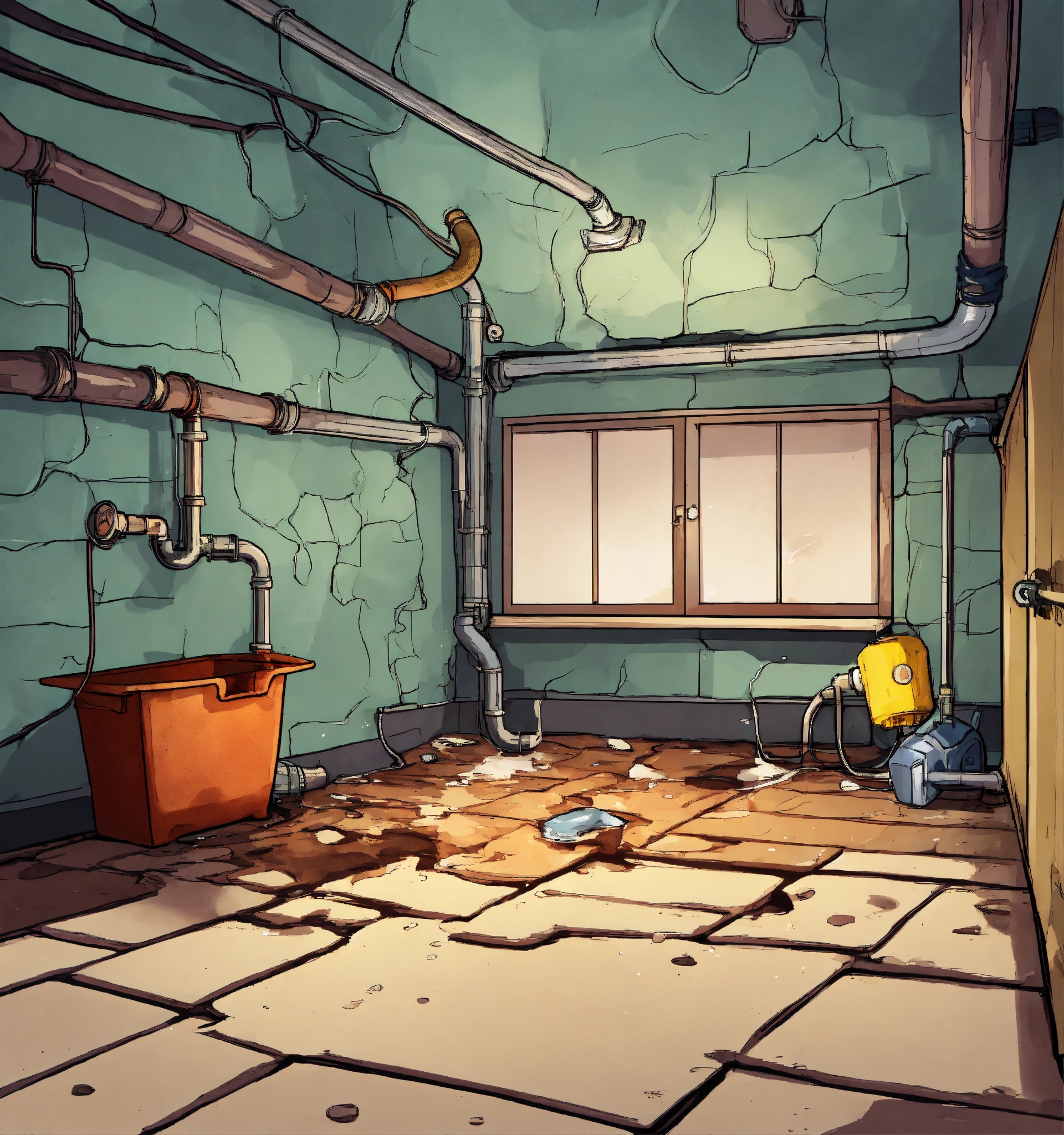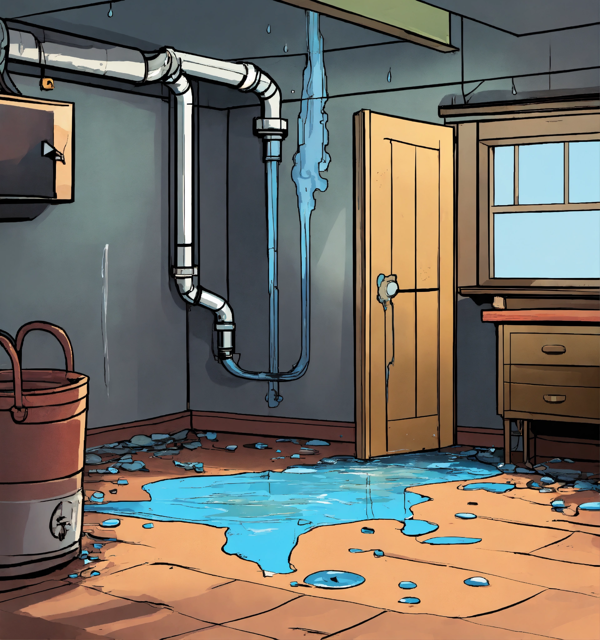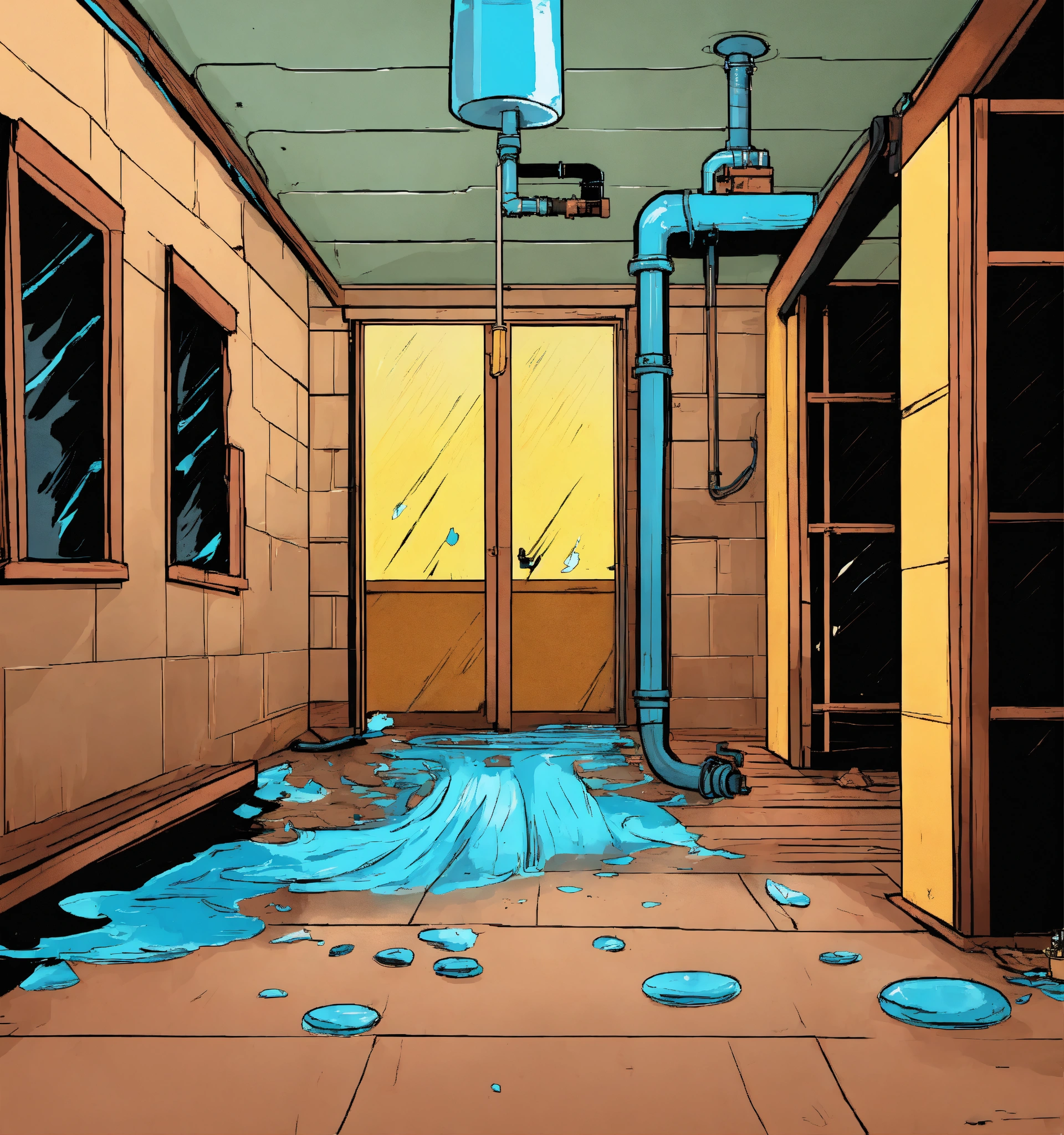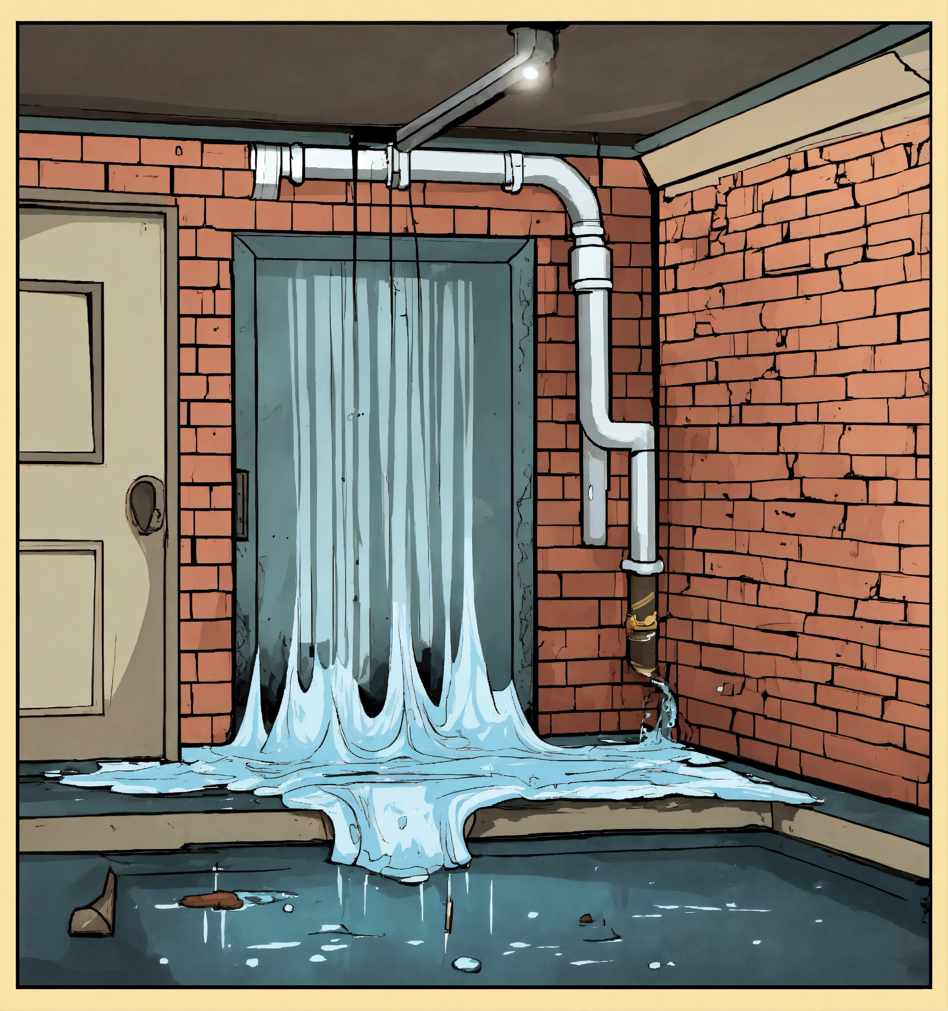 A broken pipe at a ceiling insinde of a basement is leaking water