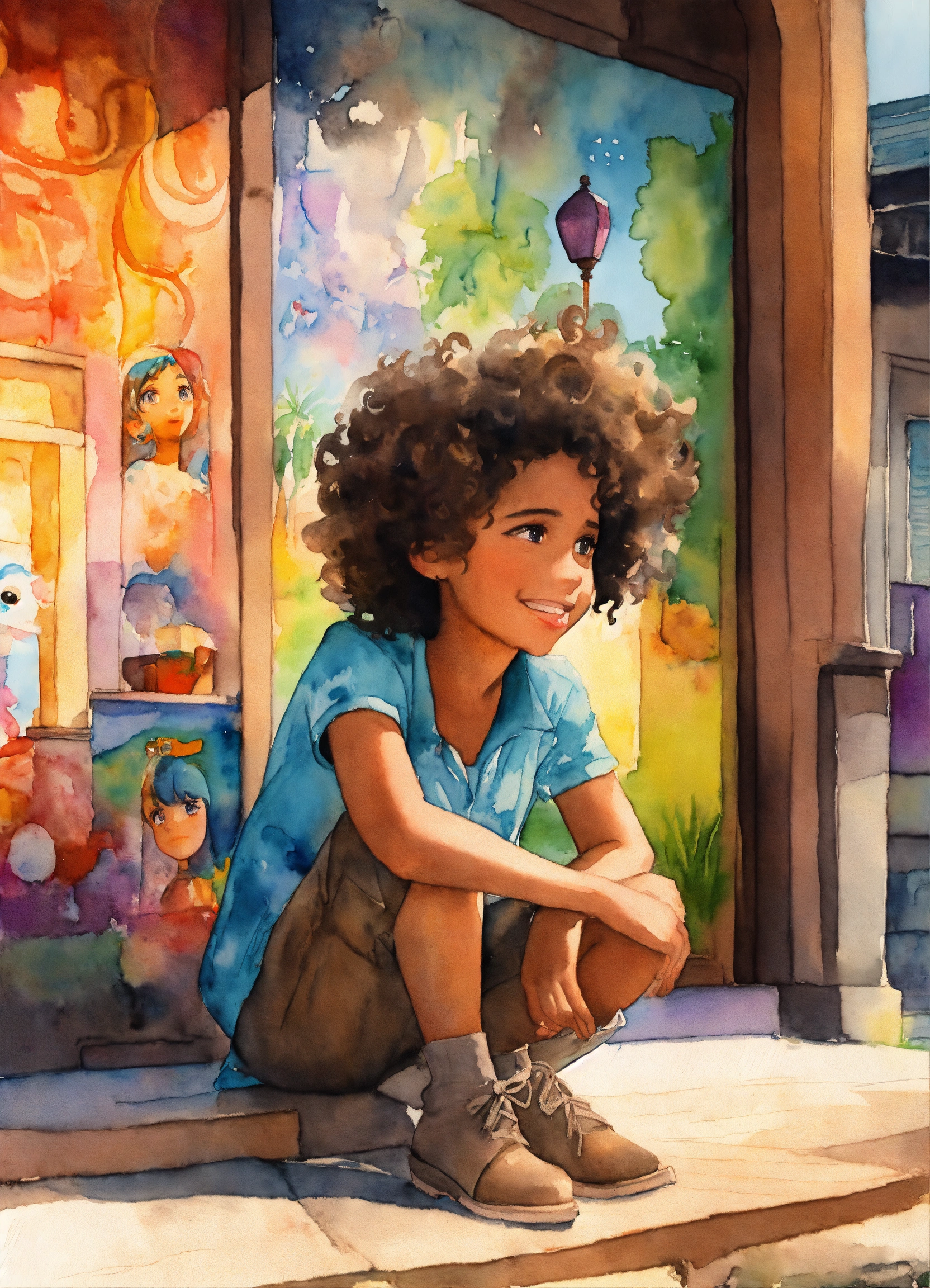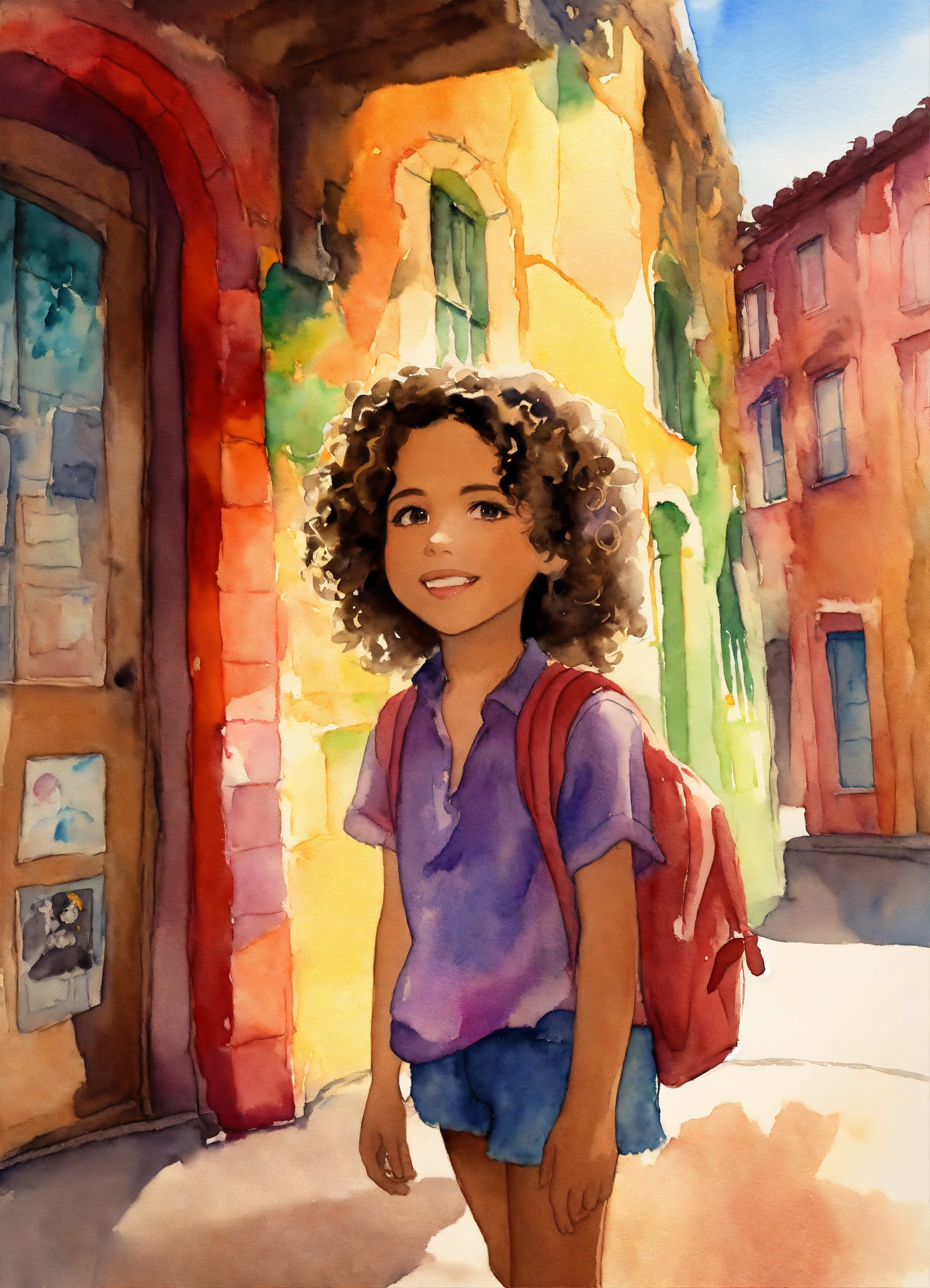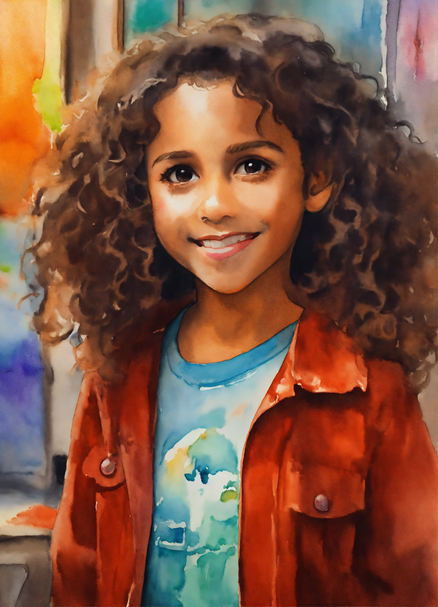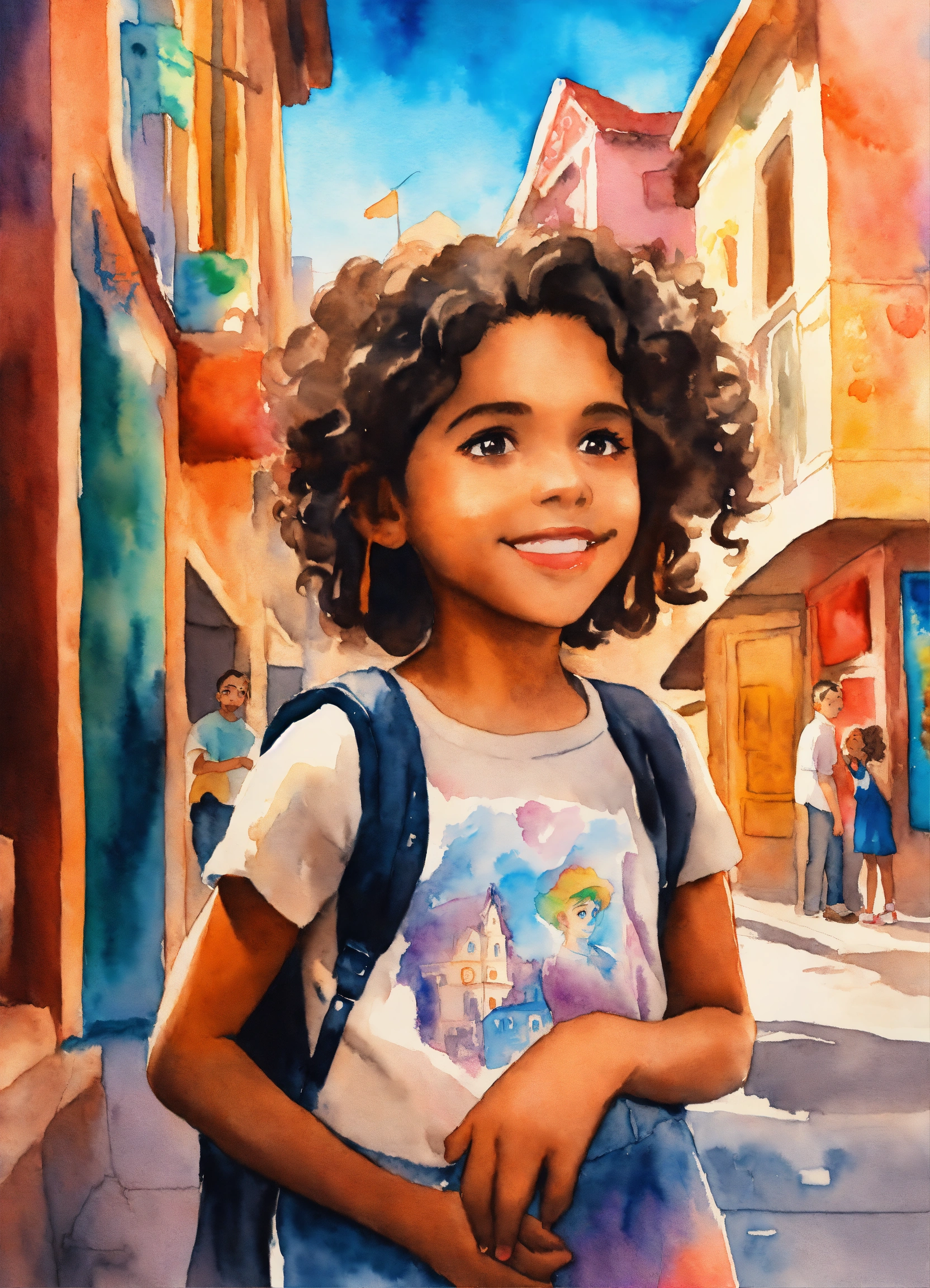 Watercolor pixar painting of hispanic 8 year old halle berrywitn curly dark brown hair talking to local artists with colorful murals in the background, watercolor pixar style cartoon