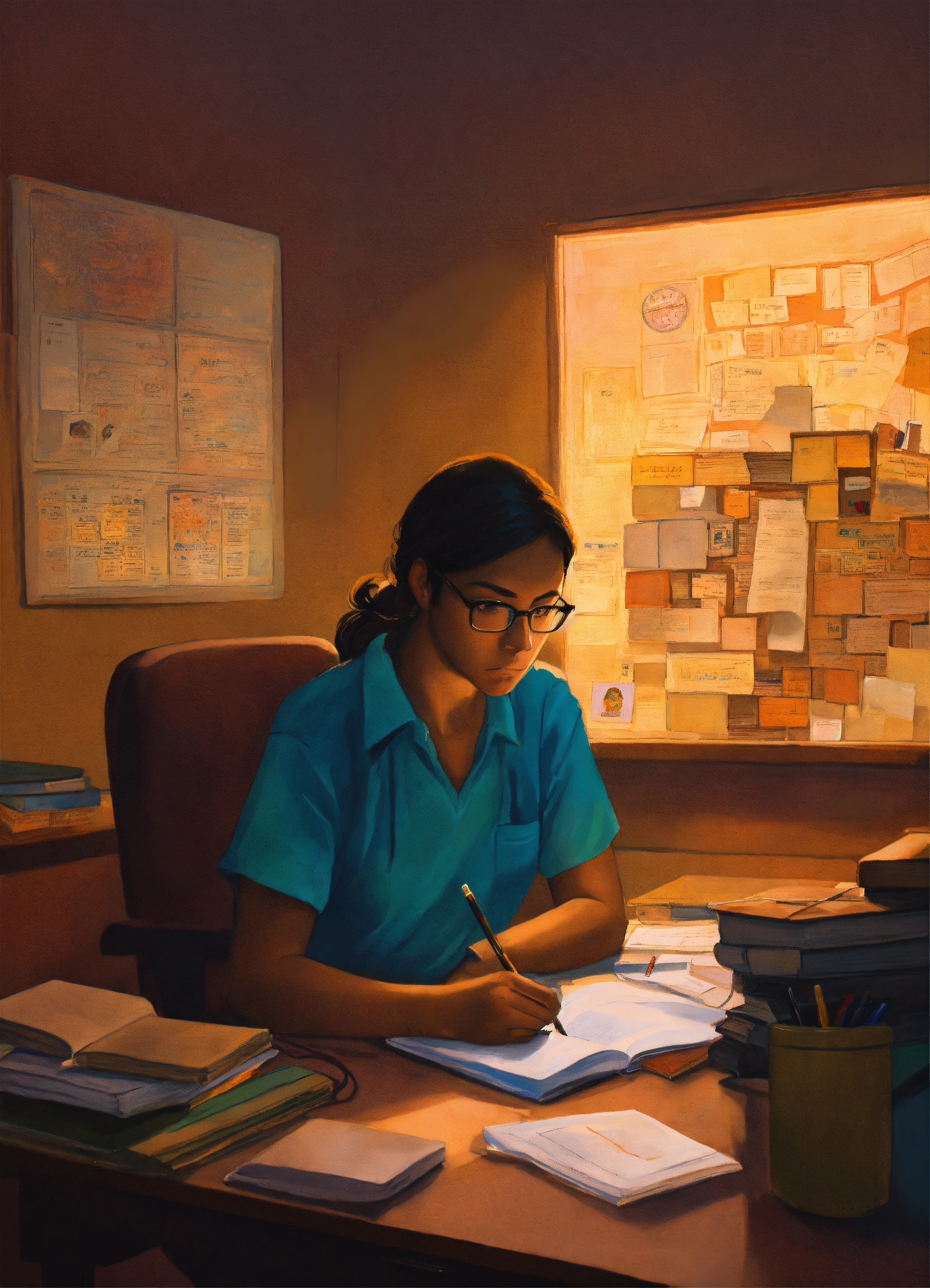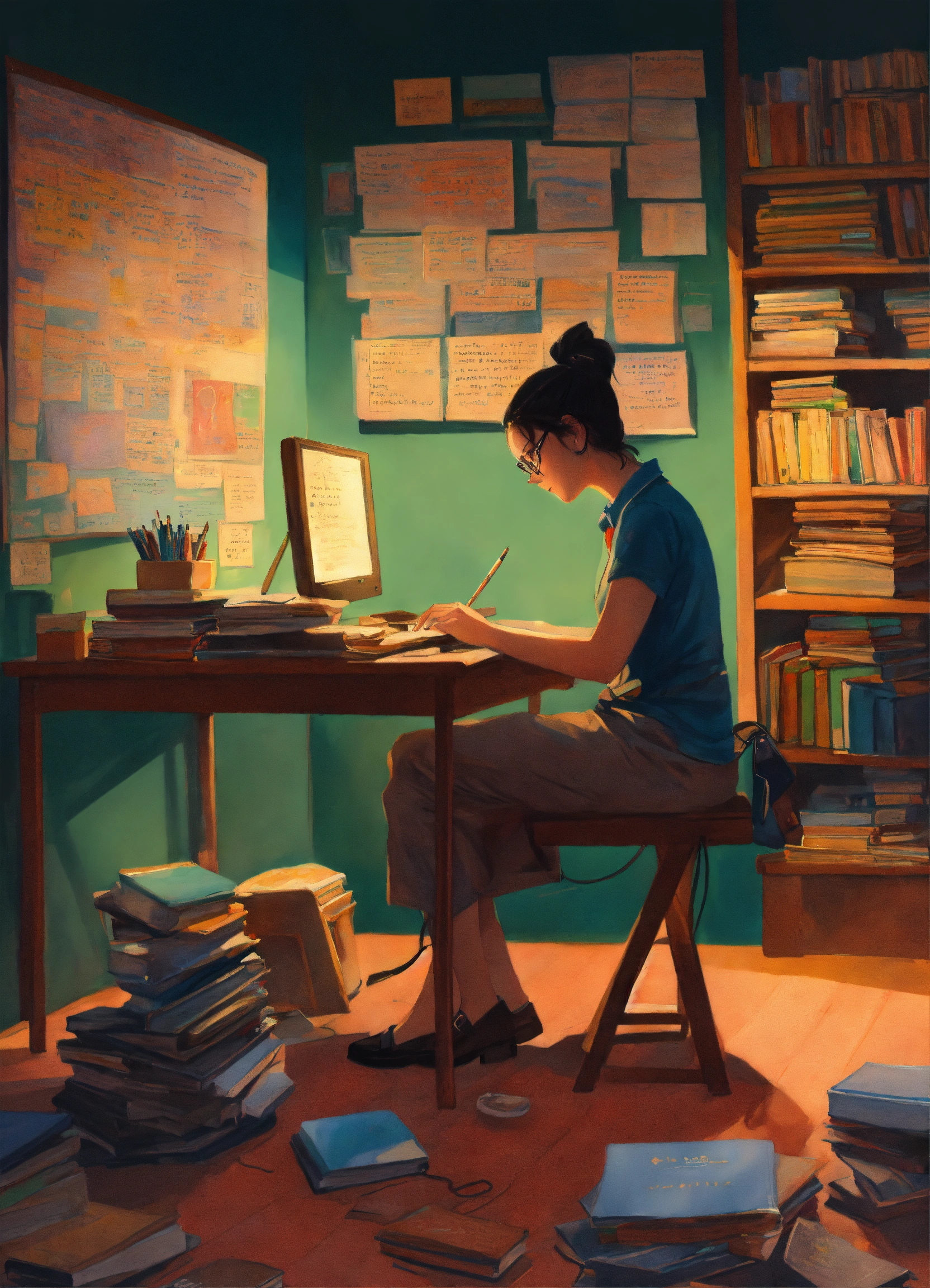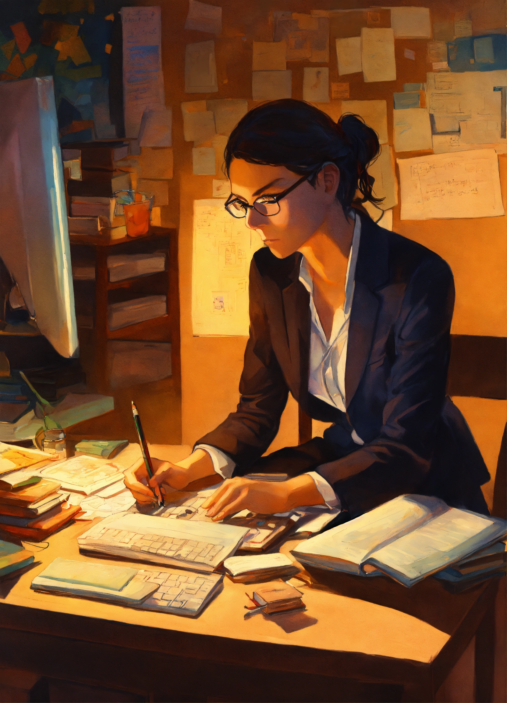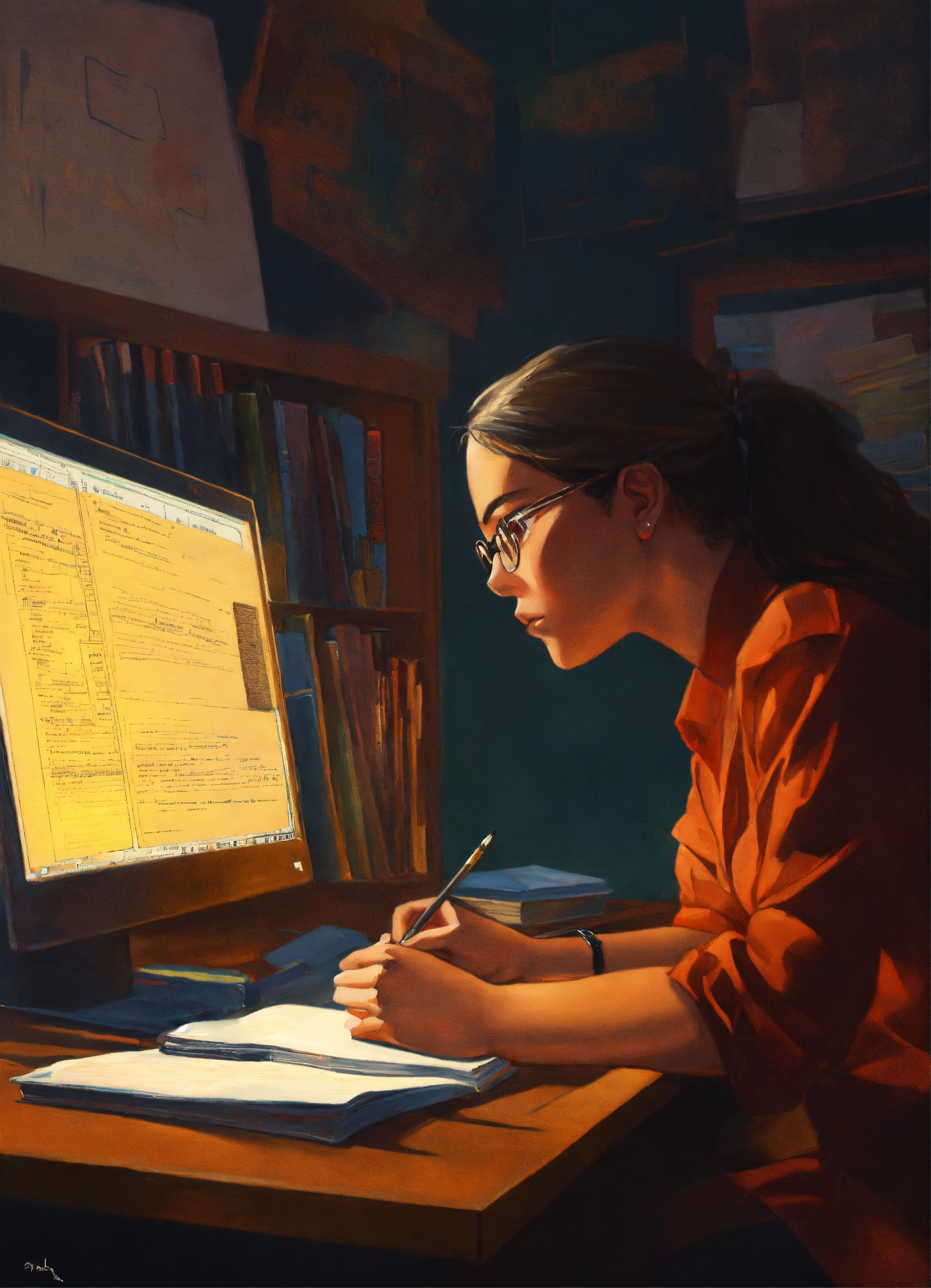 In the painting, a dedicated teacher sits at a cluttered desk, softly illuminated by the warm glow of a computer screen. the teacher is hunched over, deep in concentration, with a stack of textbooks beside them. the computer displays lines of code and the logo of lexica, symbolizing the software project. the teacher's tired but determined expression reflects the sacrifices made to ensure the project's success. the background is dim, emphasizing the teacher's solitary late-night effort. this painting captures the essence of a teacher's sacrifice for the sake of creating a proper write-up for lexica