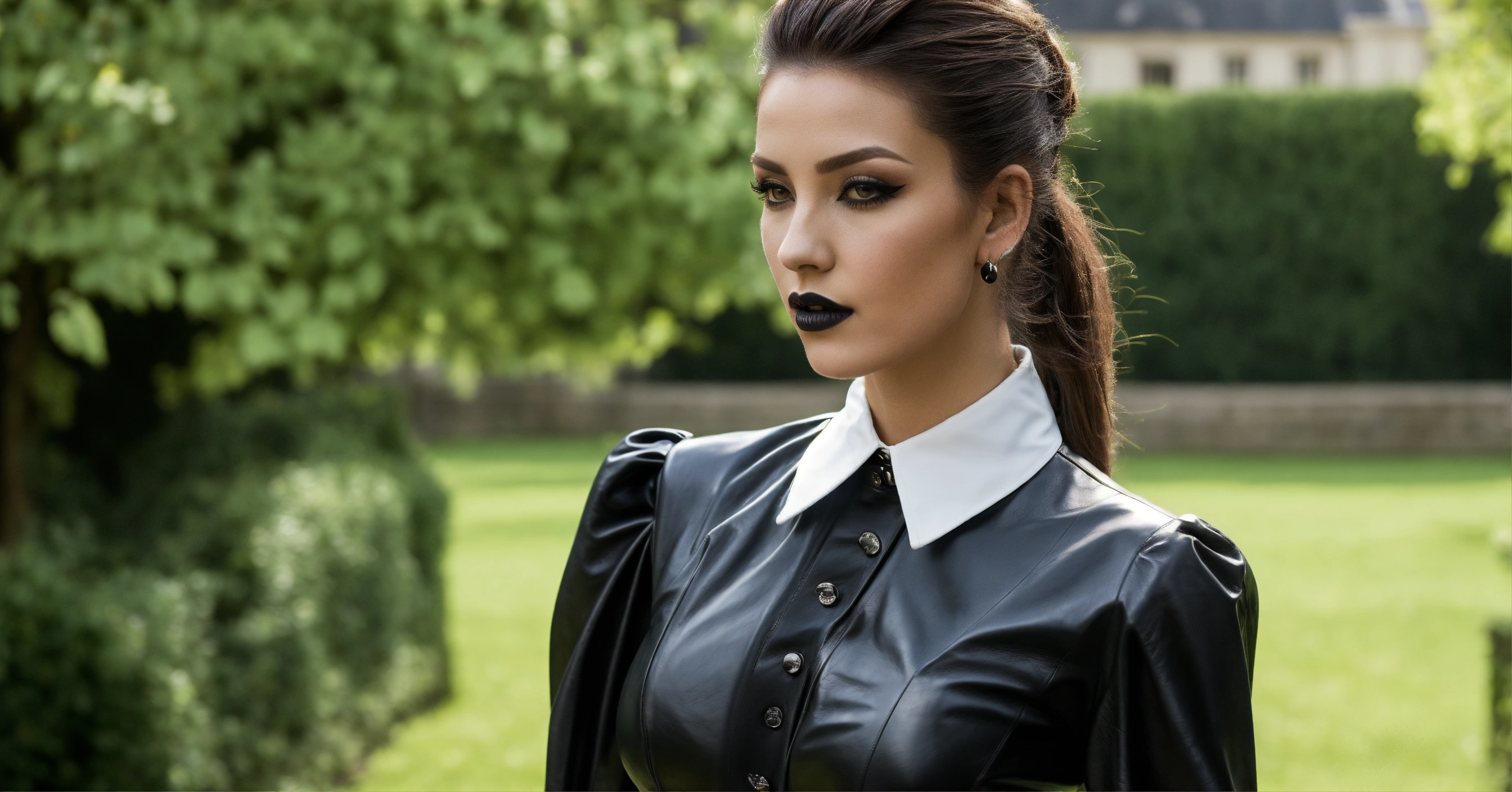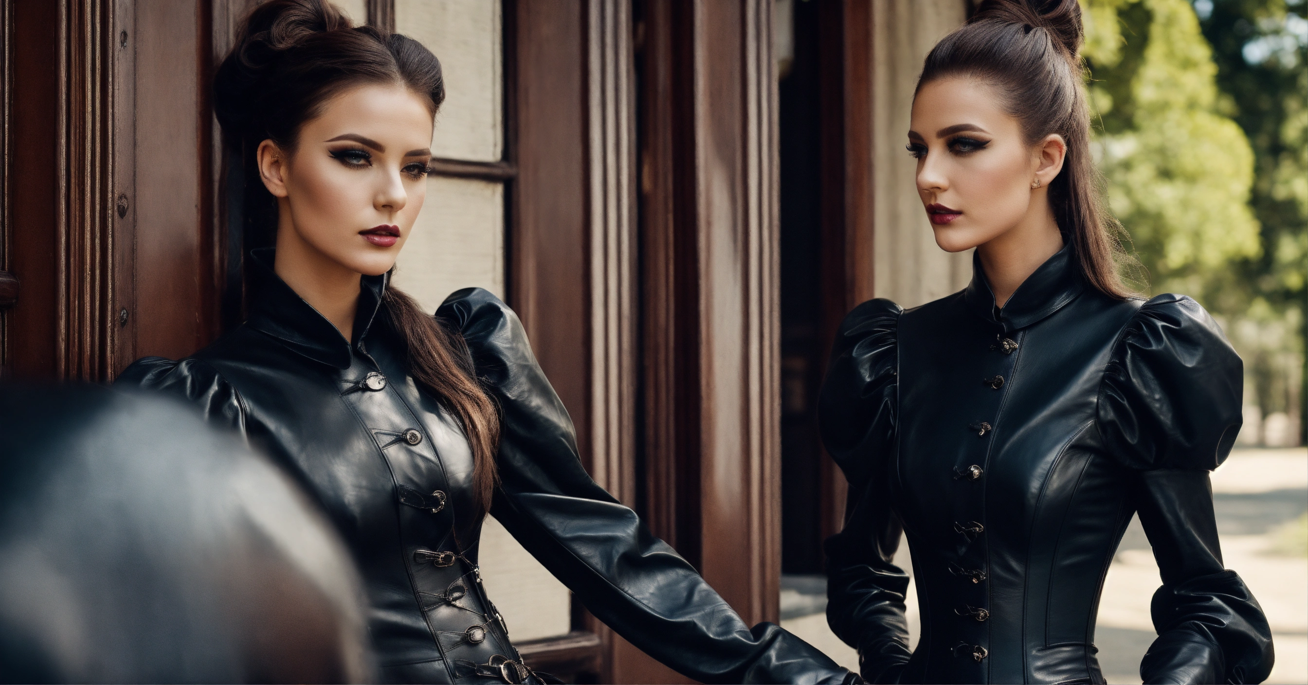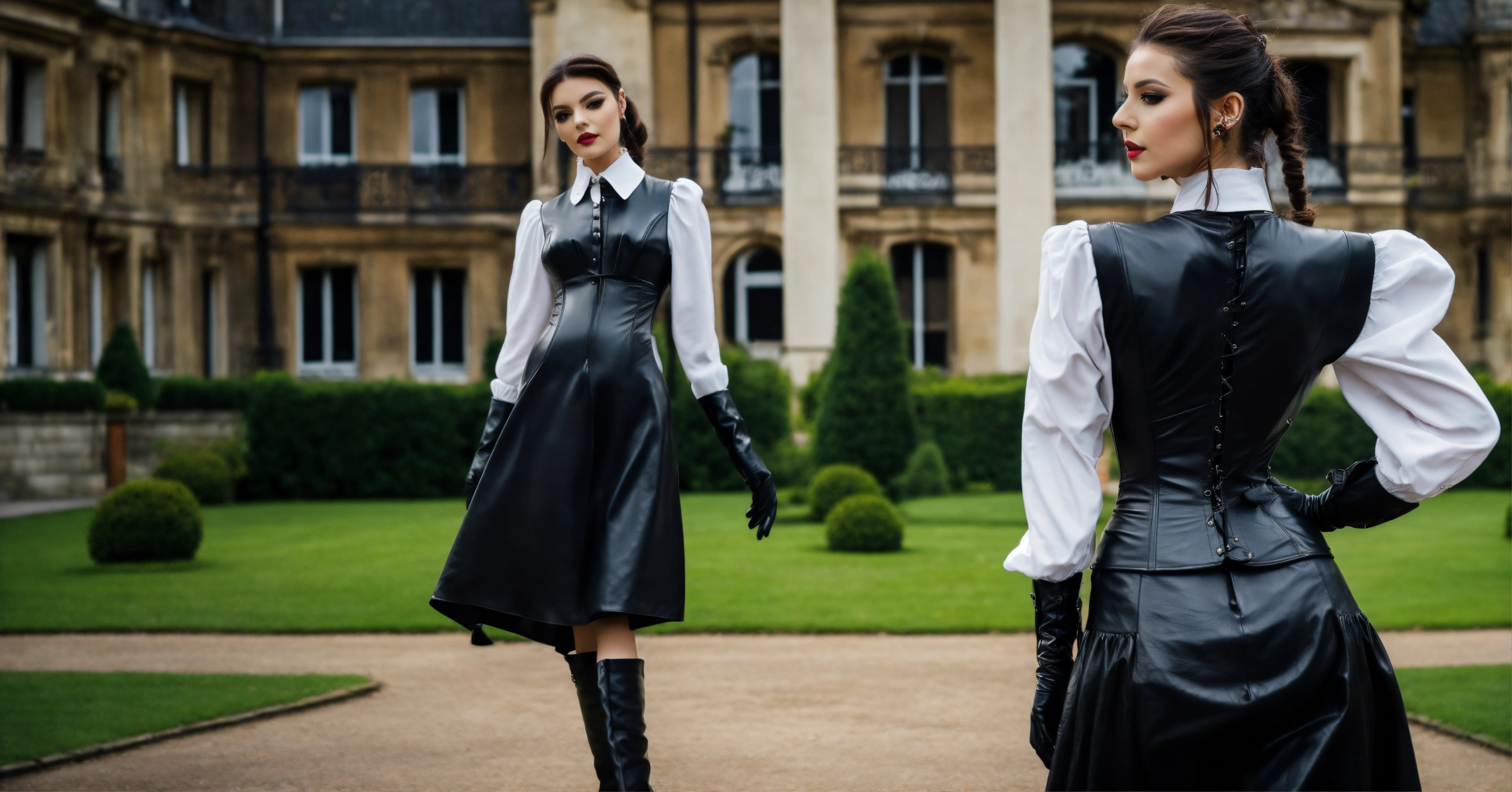 Two stunning french seductress women fashion model, brunette straight high ponytail, black leather corset, long strict victorian governess wide black long leather shirt dress with long big puff sleeves and big buttons, mansion park with sunny daylight, white office shirt collar, leather gloves, eyeliner makeup, black leather boots