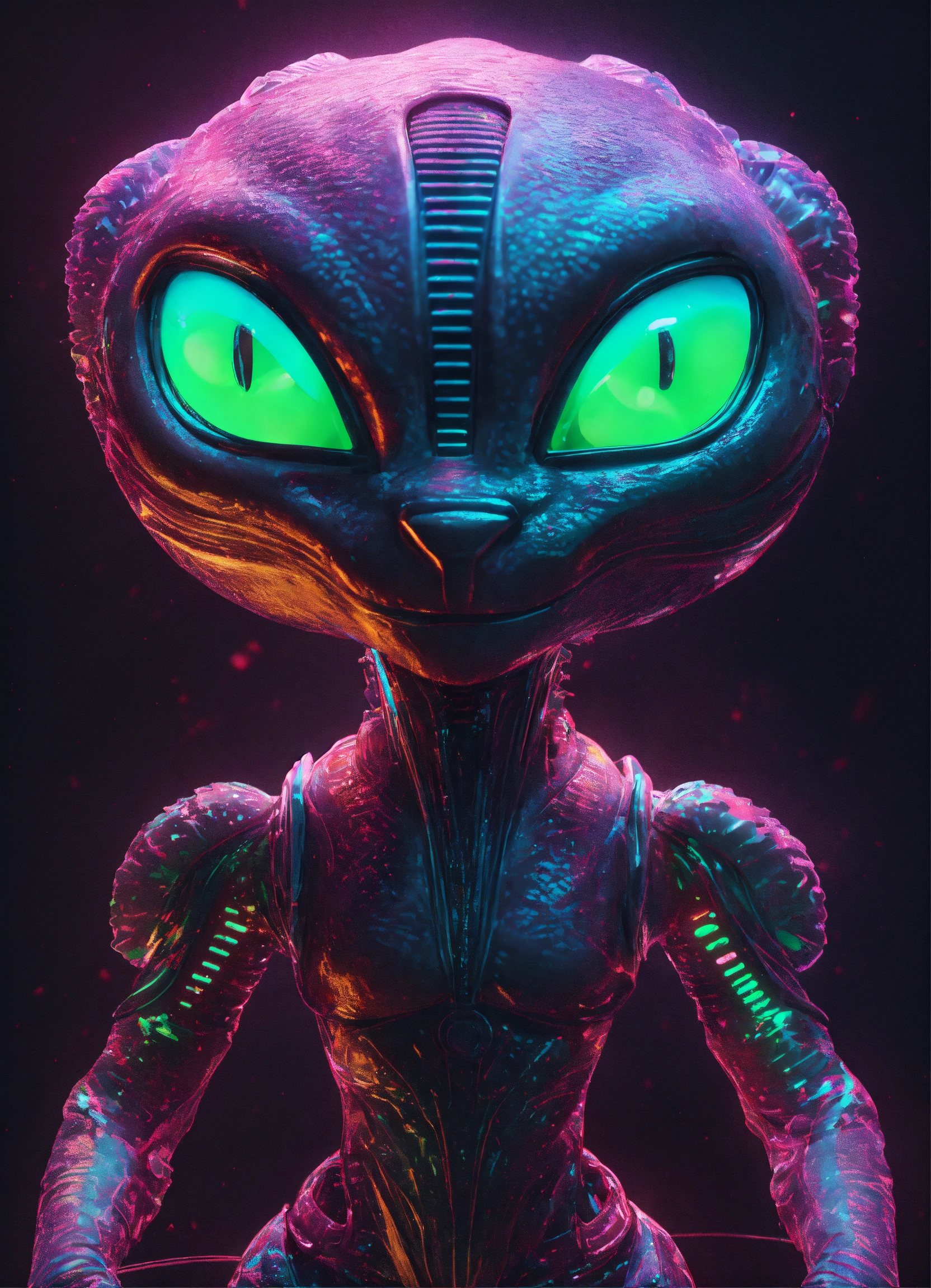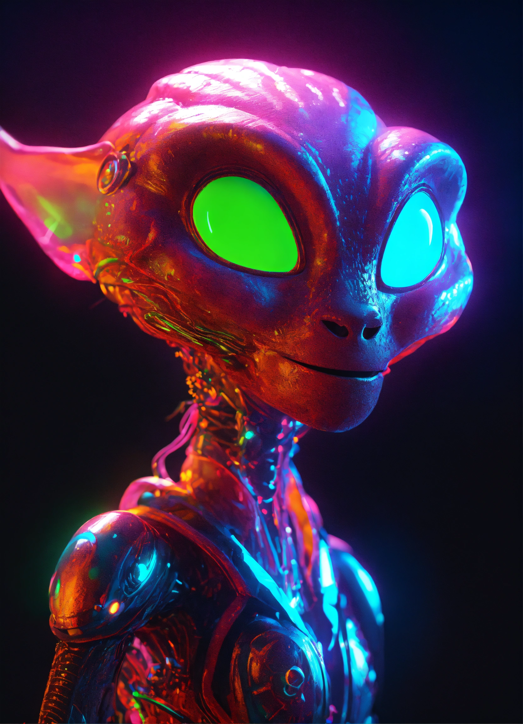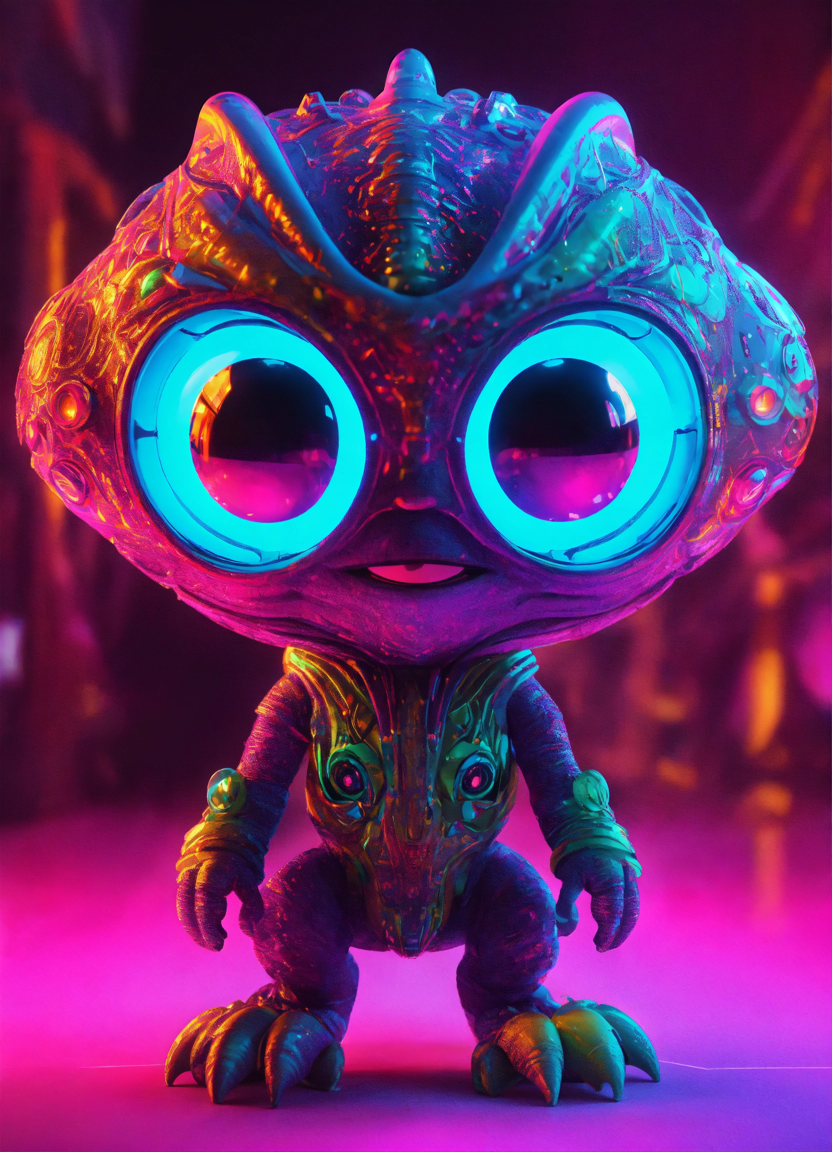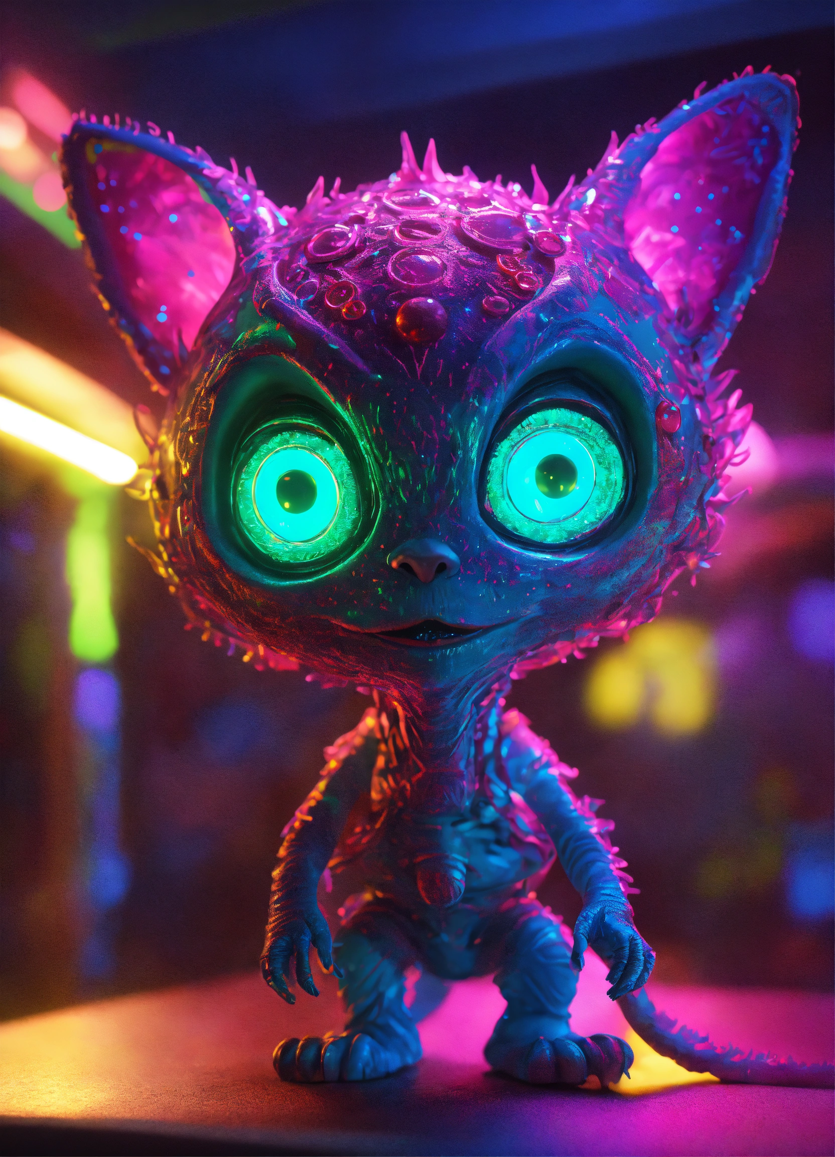 Gelly cute alien monster, full-body, neon glow colors, highly intricate details, 3d, cgi, realistic light, trending on cgsociety, glowing eyes, facing camera, neon details, ultra realistic details, portrait, sci fi atmosphere, global illumination, shadows, octane render, 8 k, ultra sharp, cat attributes, no whiskas