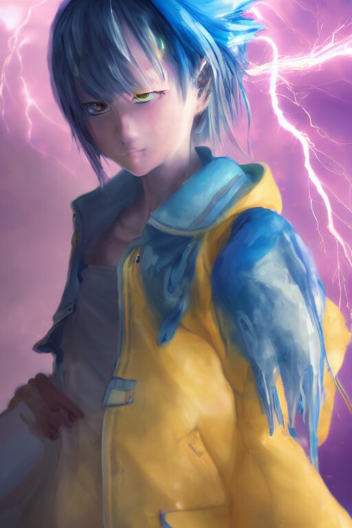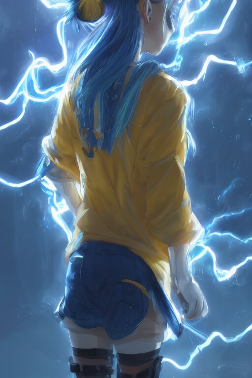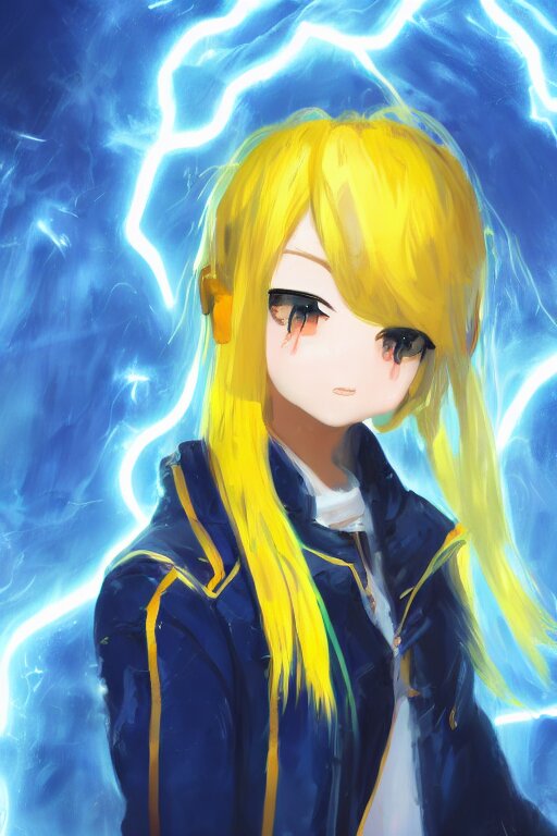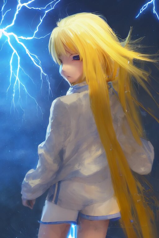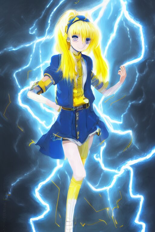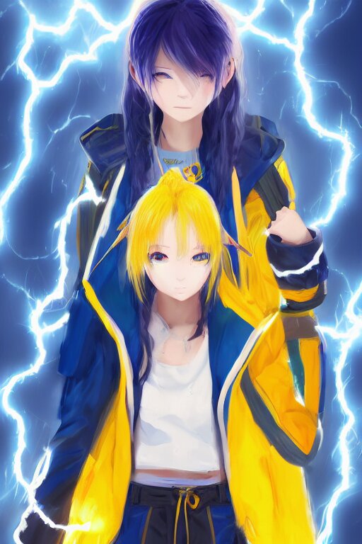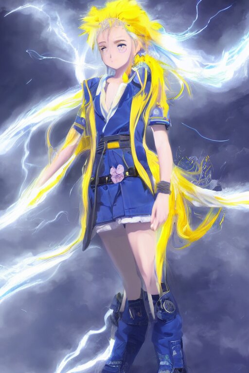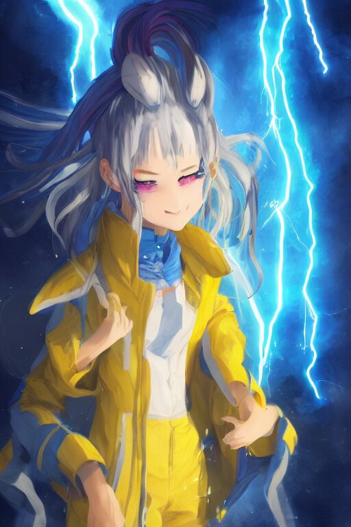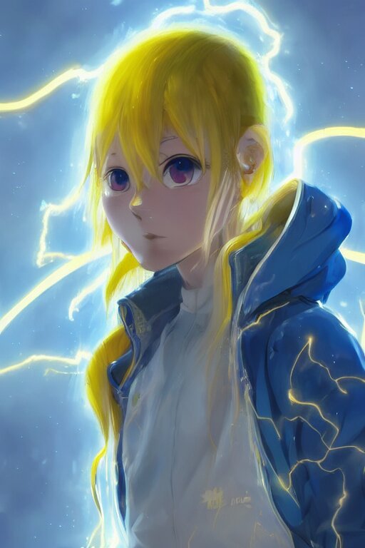 Anime young girl with yellow ponytail and blue hairtie wearing white and blue long jacket in a confident stance surrounded by lightning streaks, wlop, concept art, digital painting, trending on artstation, highly detailed, epic composition, 8 k uhd