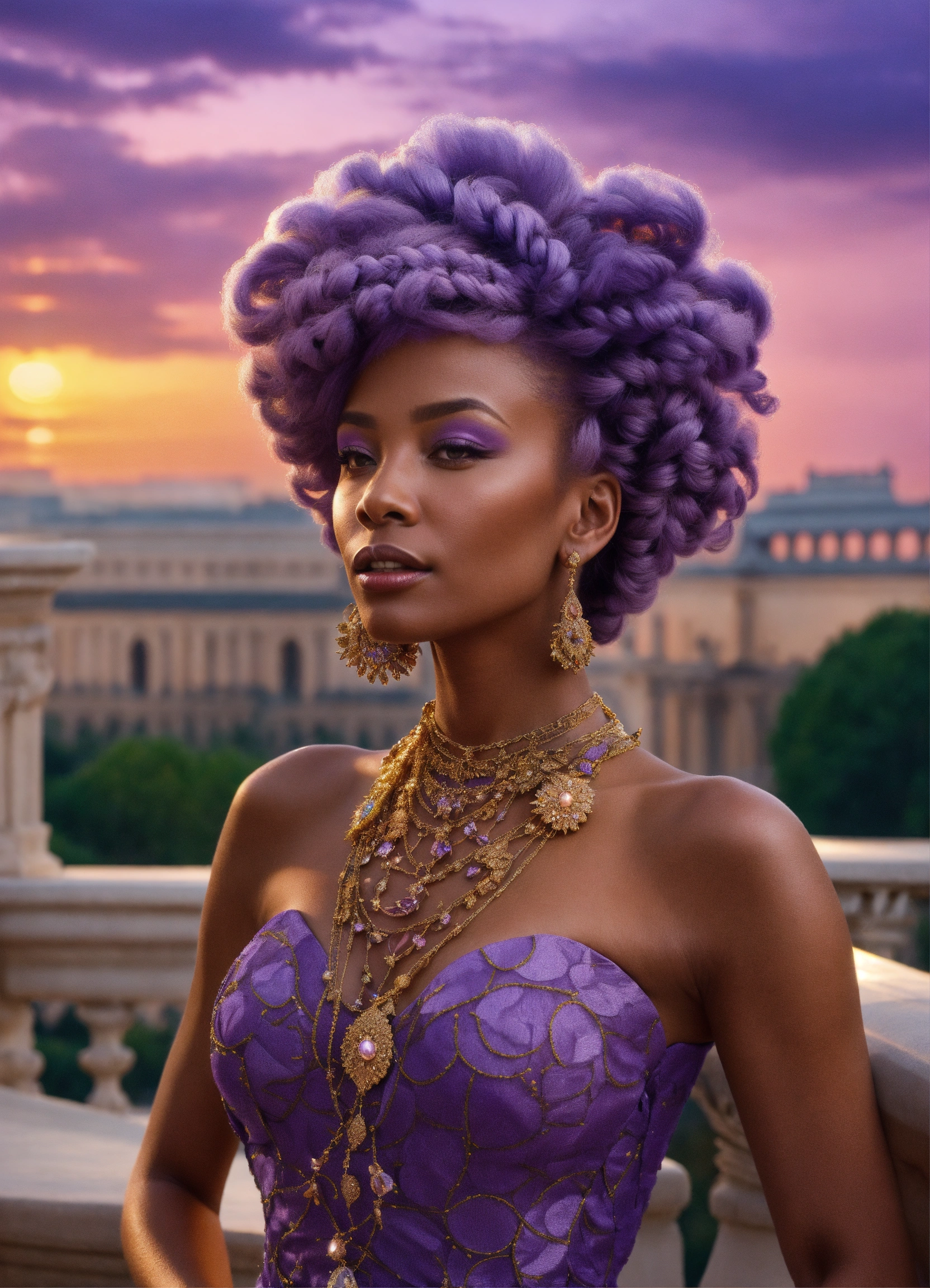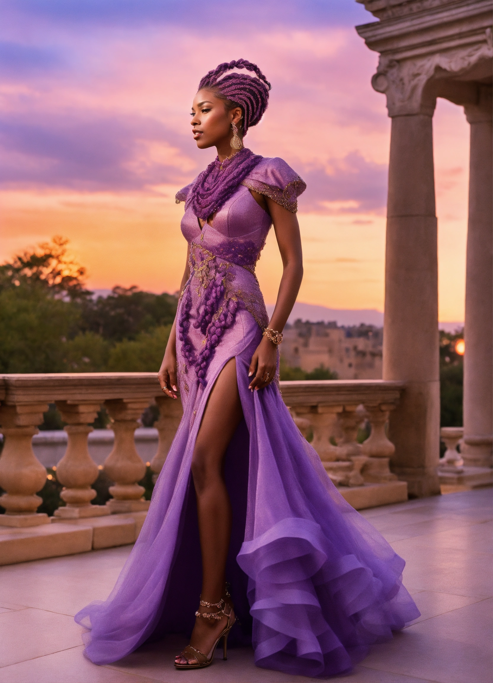 Lavender-skinned alien female, amethyst braided hair, 50-year-old, african-american features, haute couture dress and heels standing on a sumptuous palace terrace at sunset. charismatic demeanor.