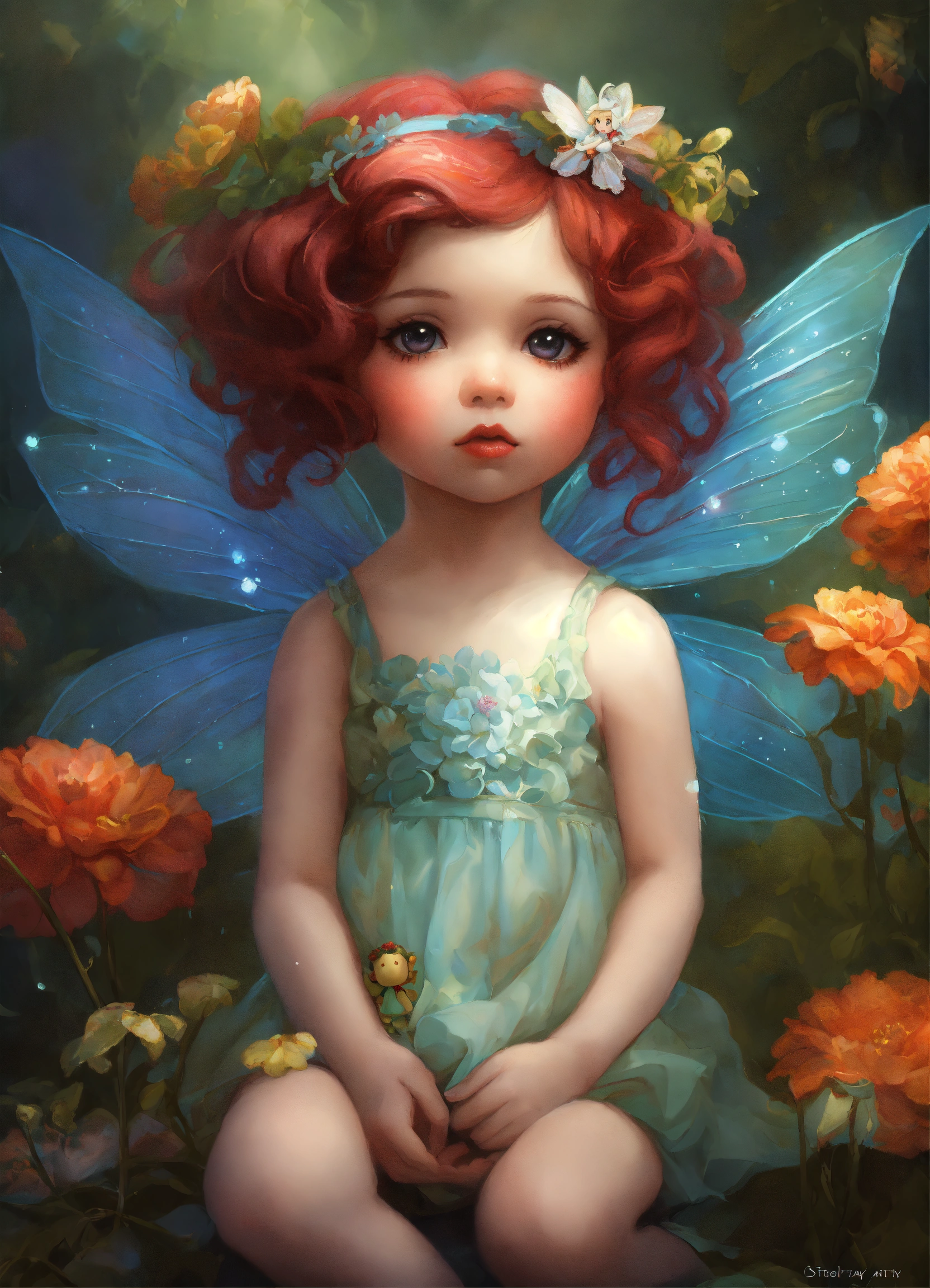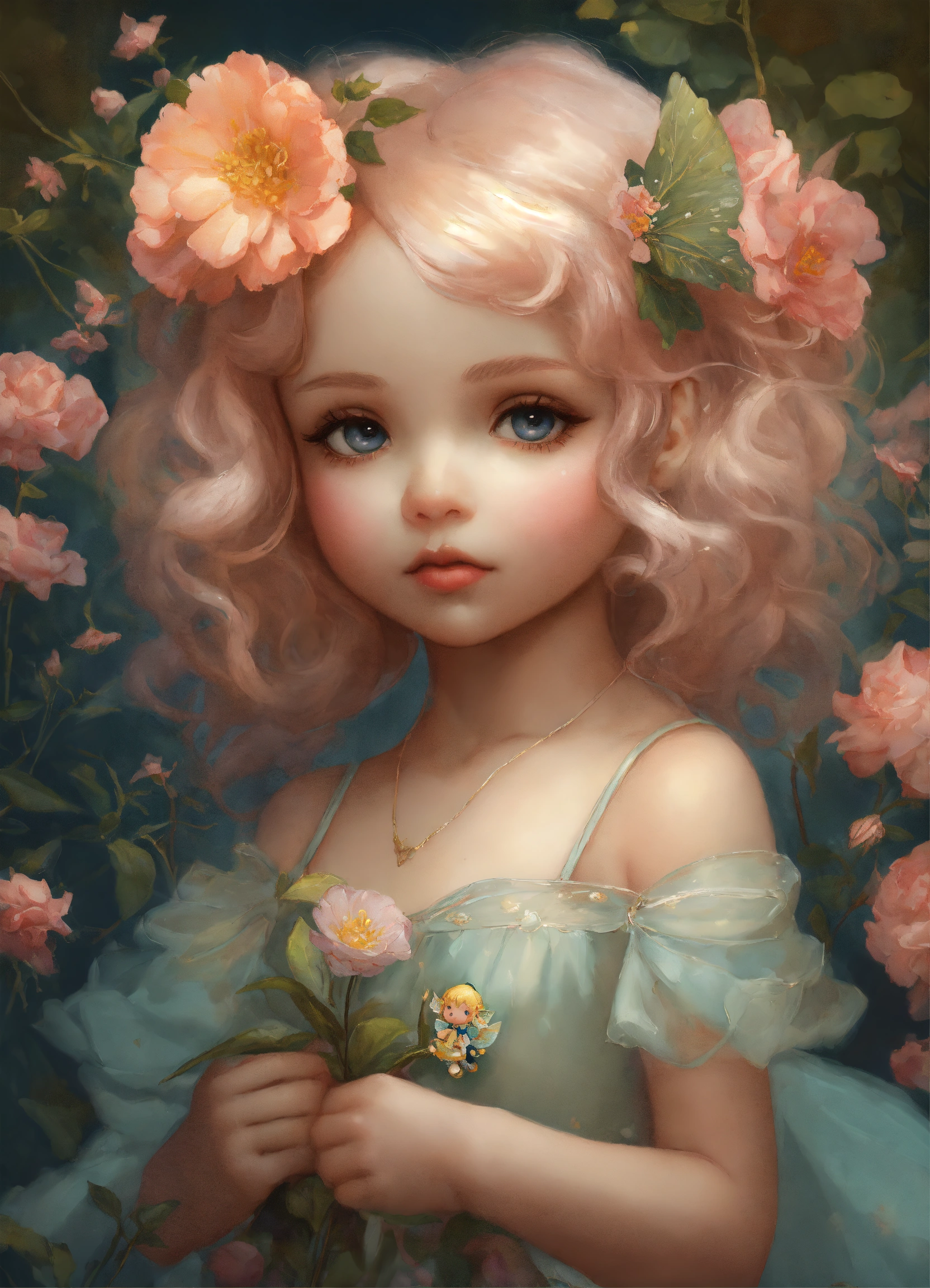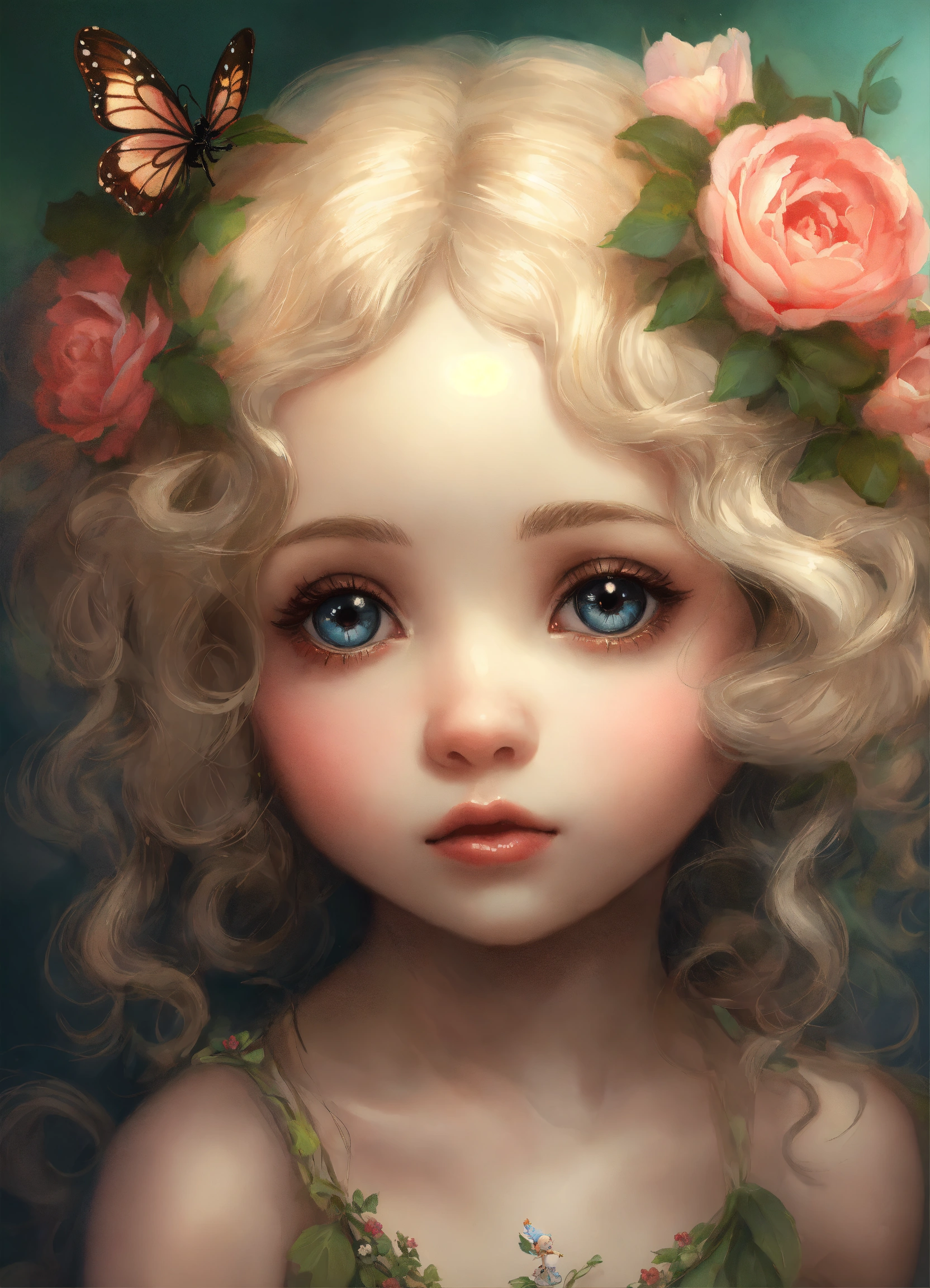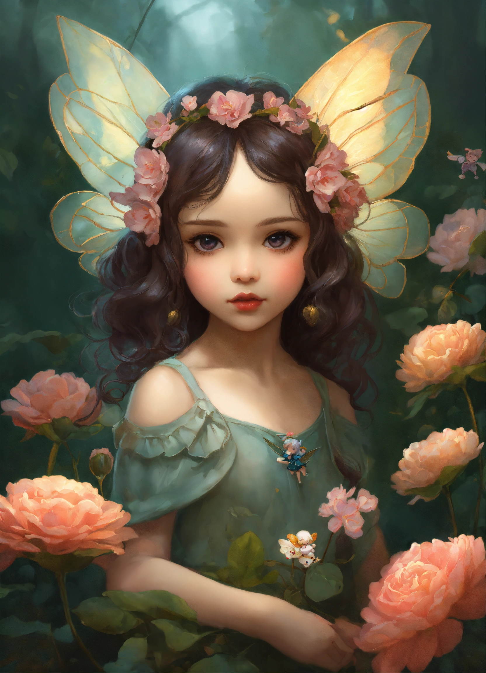 Portrait of a very cute fairy gothic chibi girl kewpie fairy clothes, fairy magics wings, doing magic, long curly hair oil paint vray, and flowers by stanley artgerm and tom bagshaw
