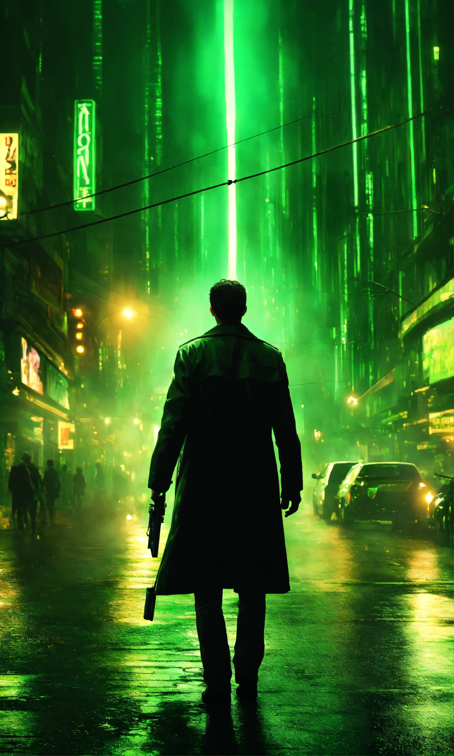 Night street, photo realistic, matrix ambience, big explosion in the background, green light, dark ambiance, hight detailed, matrix movie inspiration