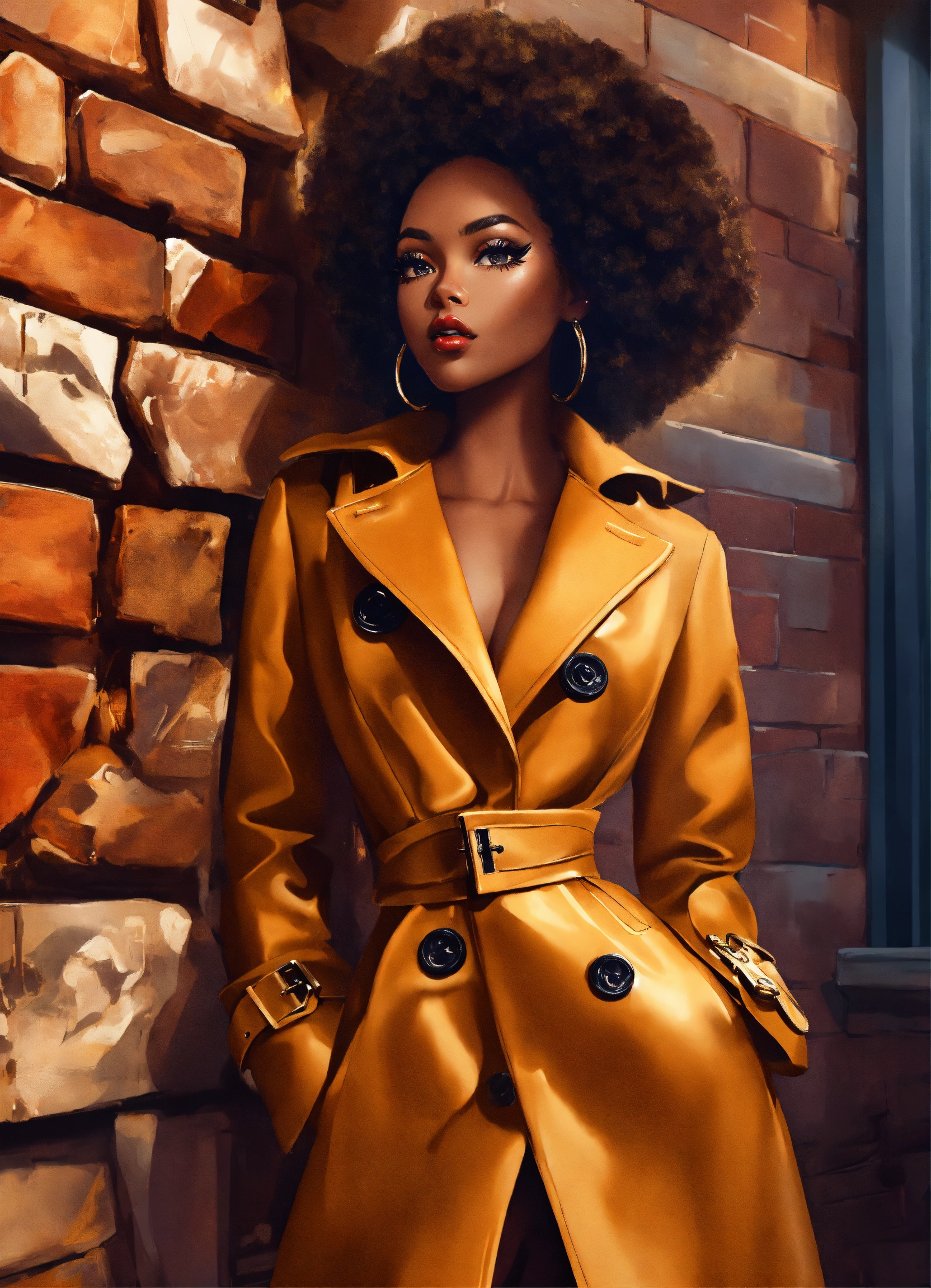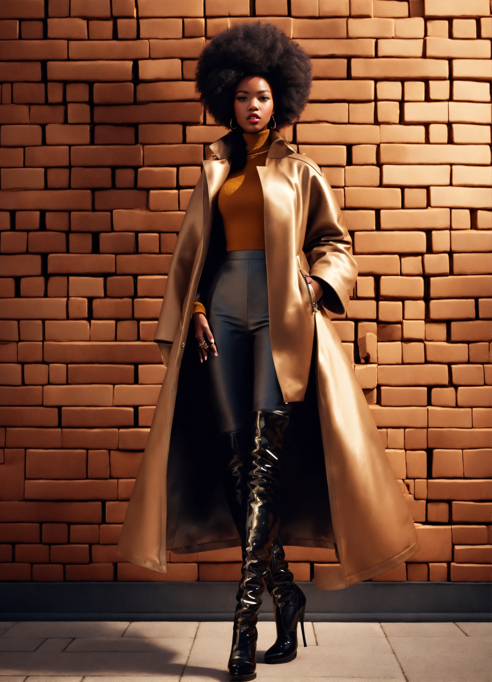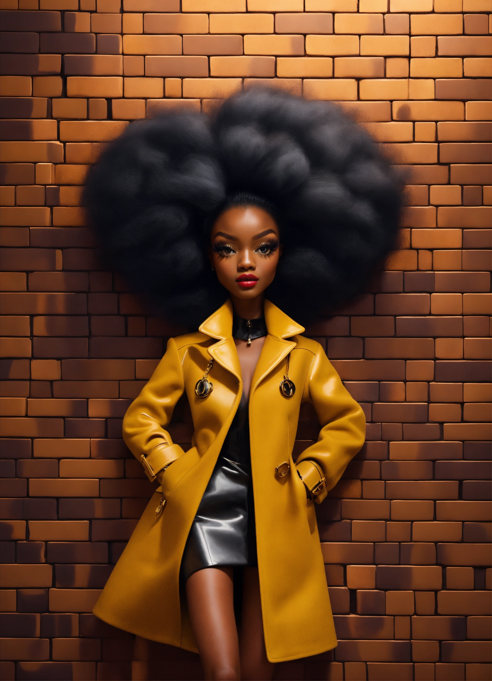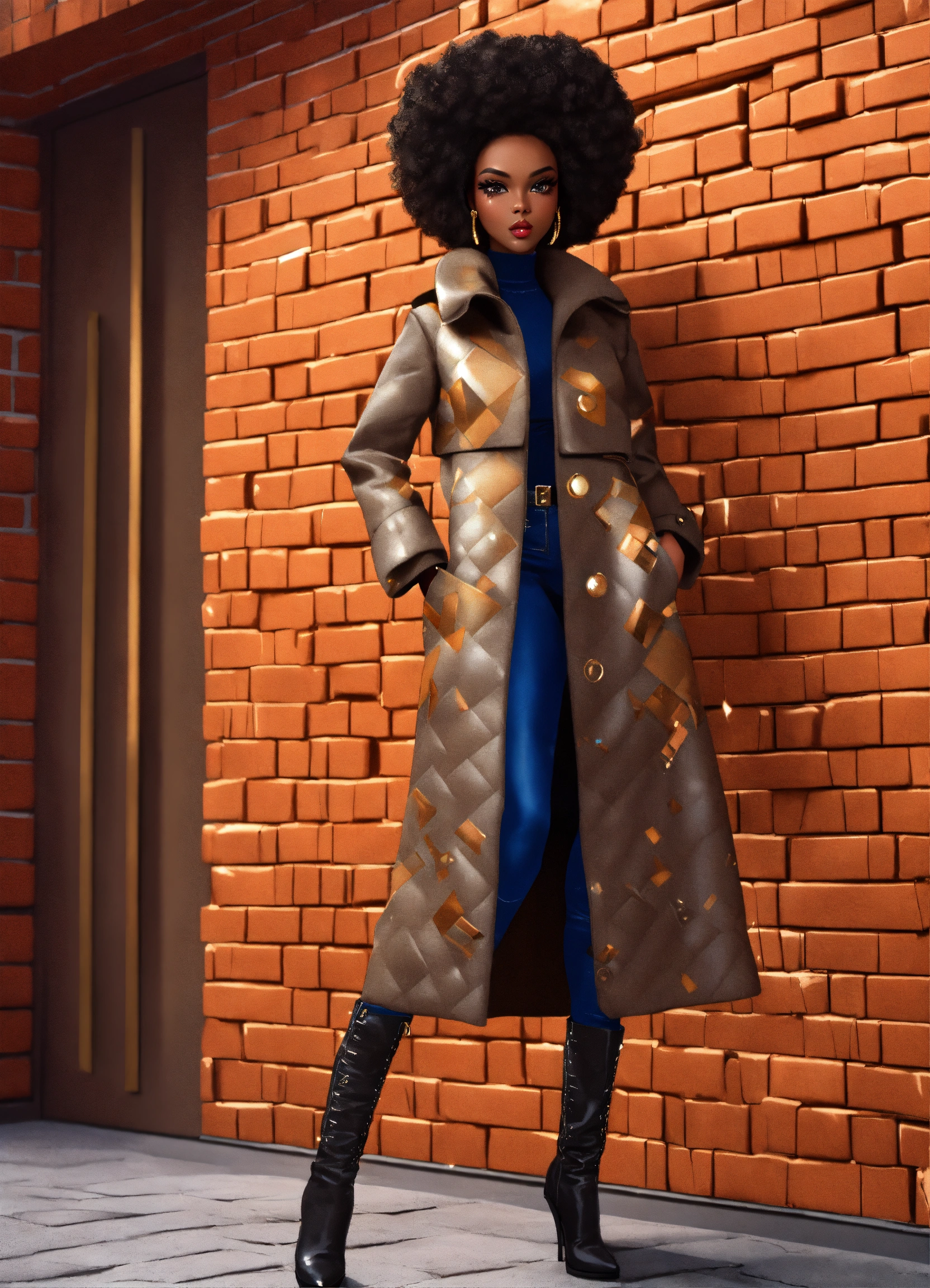 A captivating three-dimensional beautiful african american cartoon style model with striking big eyes, long lashes, and full lips. she's adorned in a full-length louis vuitton coat paired with sleek thigh-high boots. the art captures the dynamic moment as she gracefully bursts through a brick wall with bricks flying, creating shimmering metallic textures.