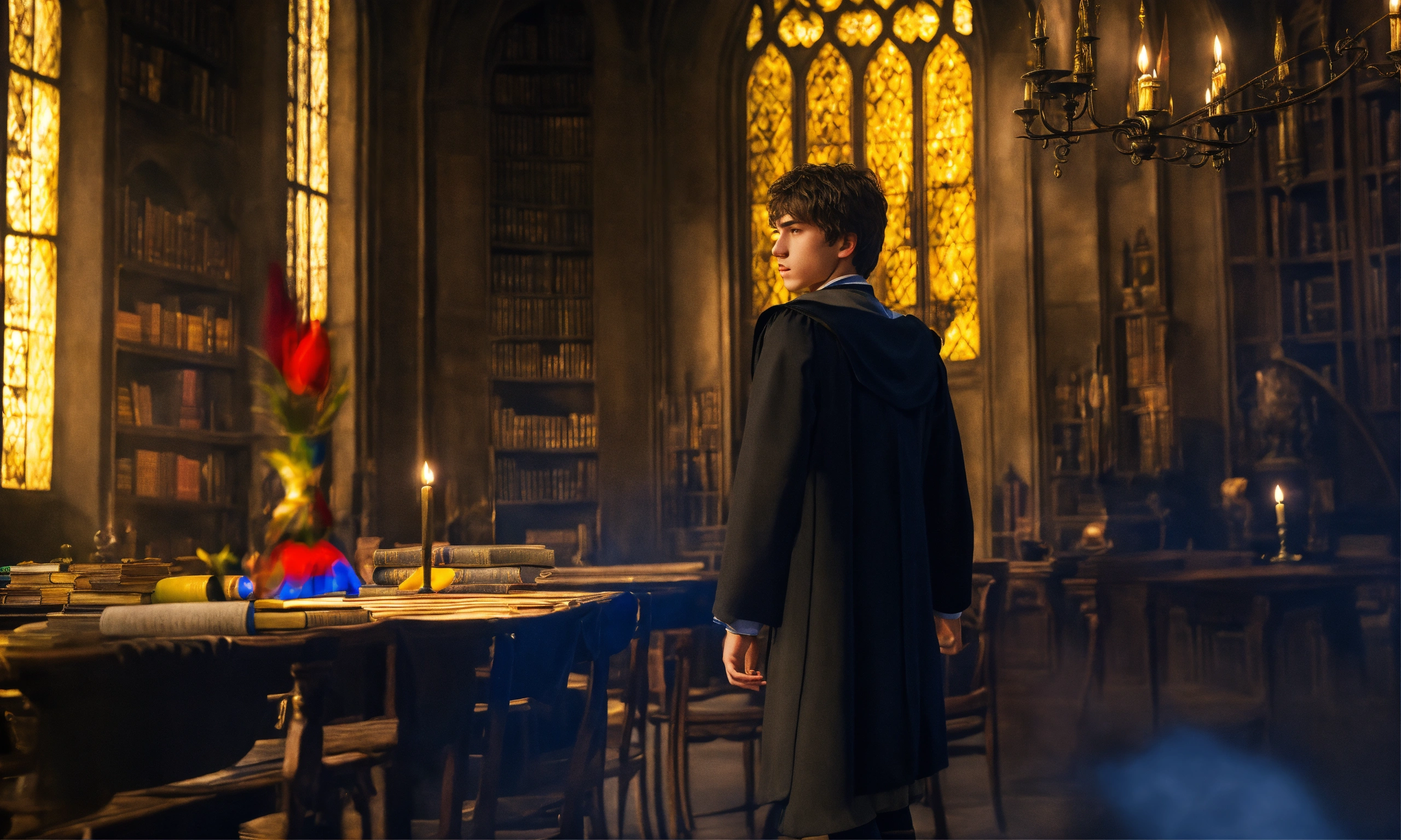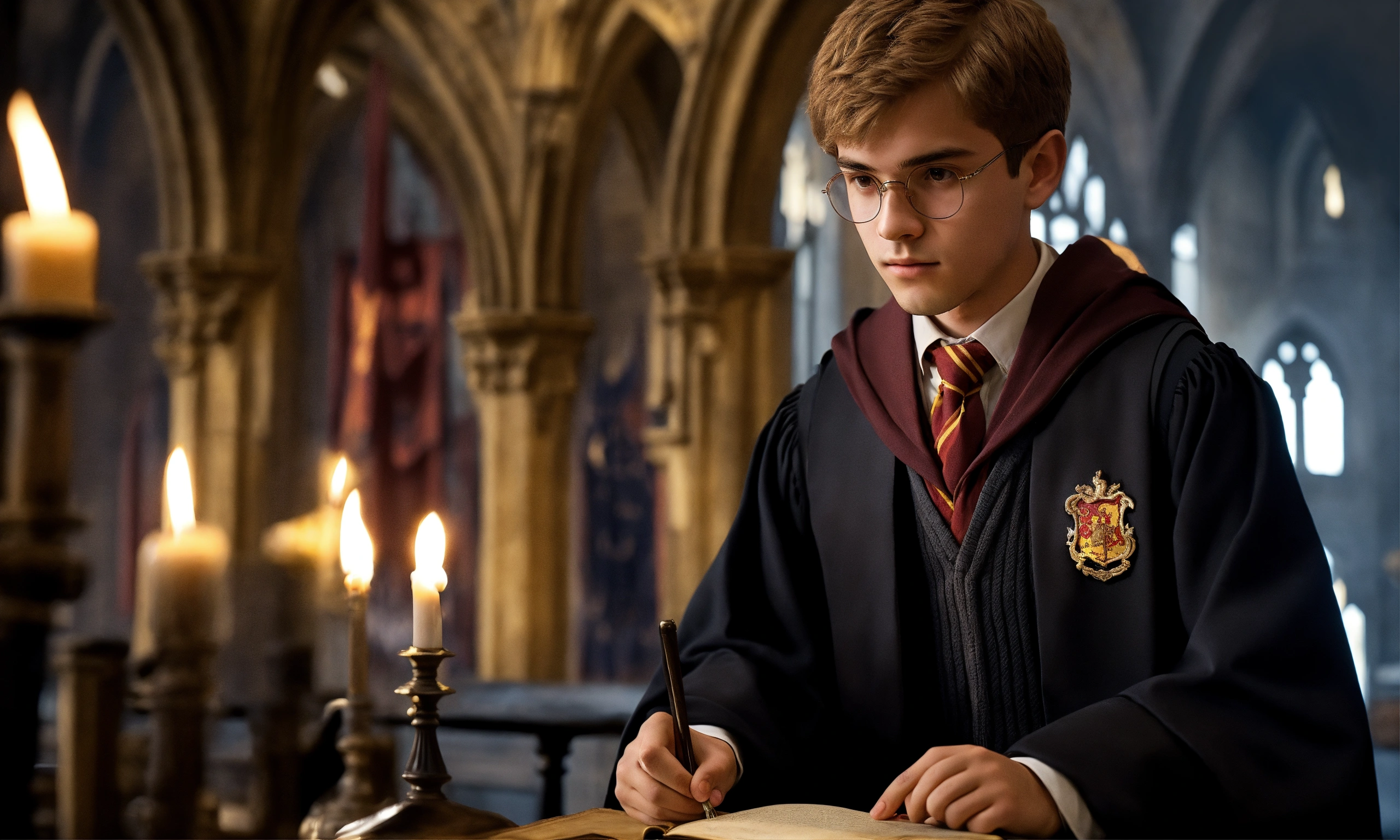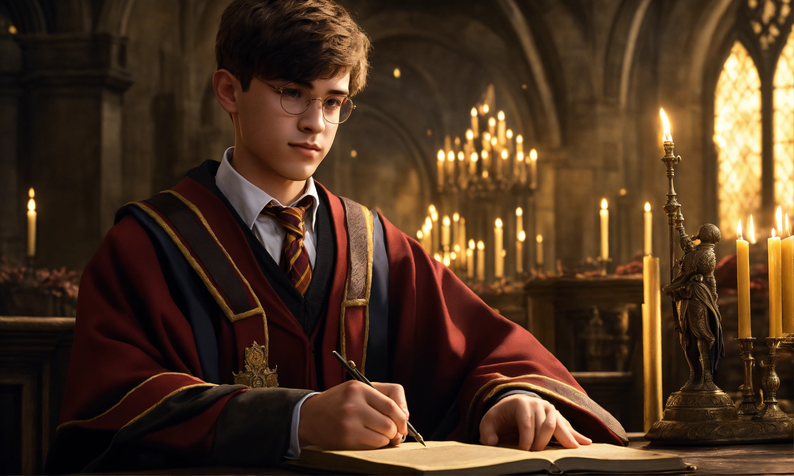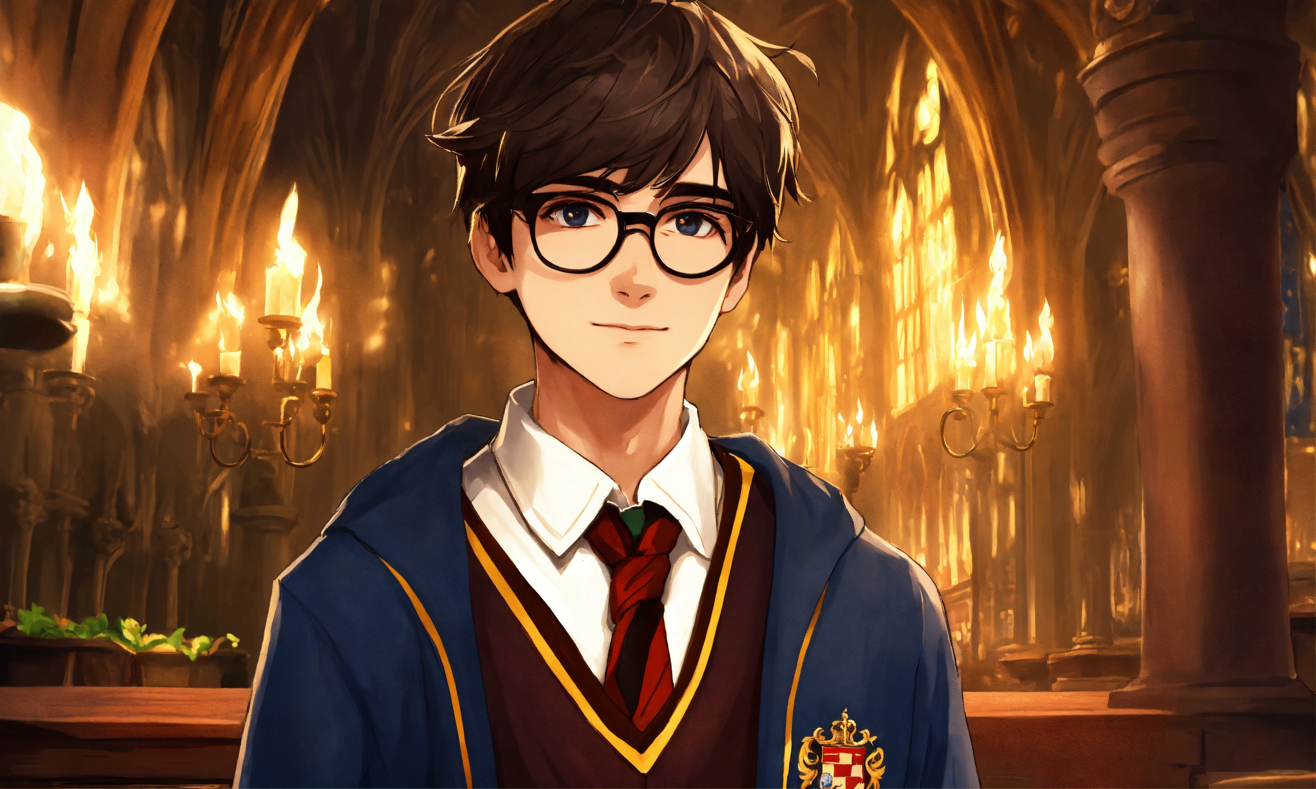 Create a description of a senior student attending hogwarts, the school of witchcraft and wizardry. portray him as a charismatic and talented young wizard with a sophisticated sense of humor. focus on his appearance, including a confident and perceptive gaze that reflects his deep knowledge of magic and experience. highlight his choice of attire, combining the hogwarts school uniform with individual details that reflect his strengths and personality. describe his influential friends and achievements in magical competitions and academic subjects.