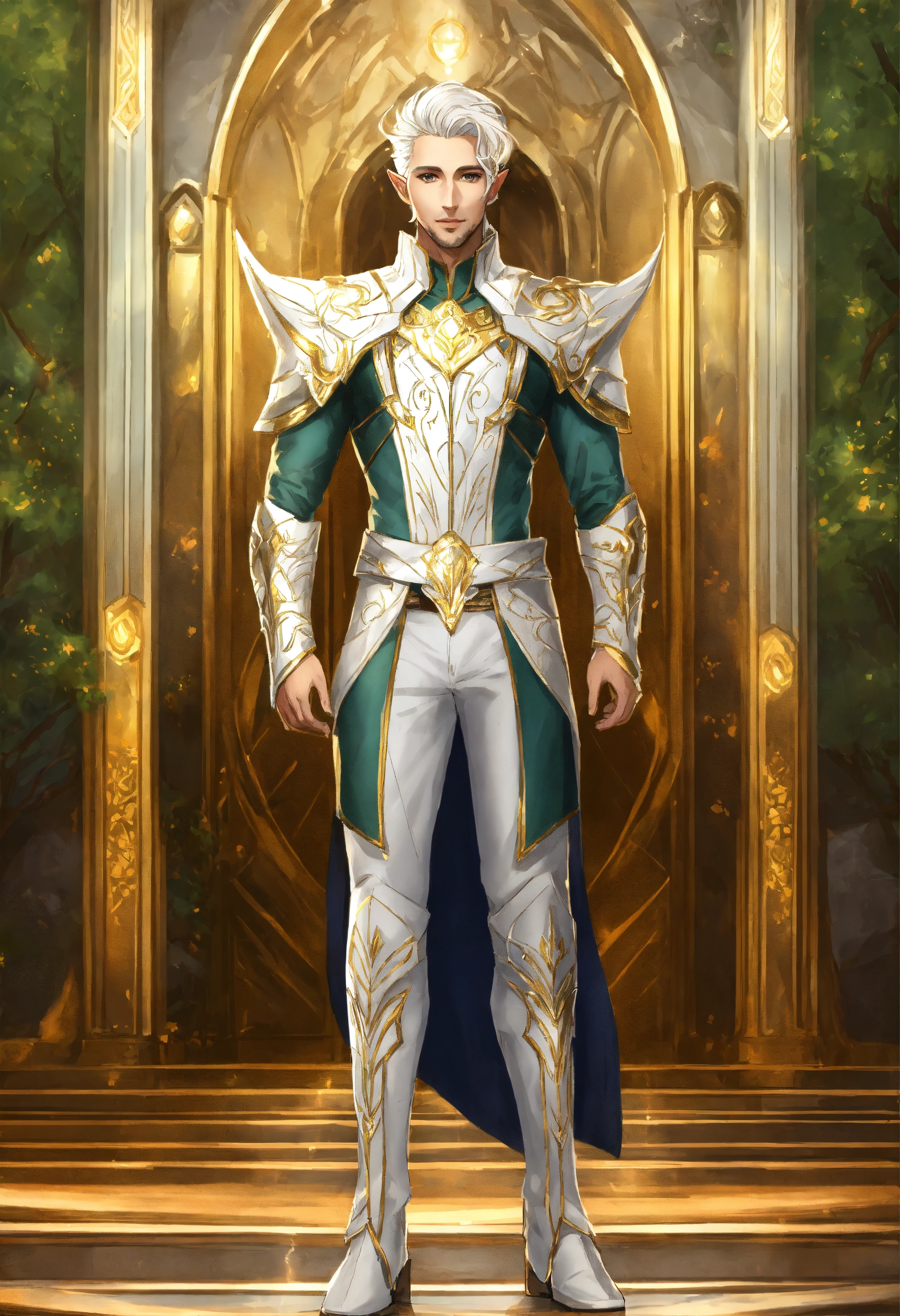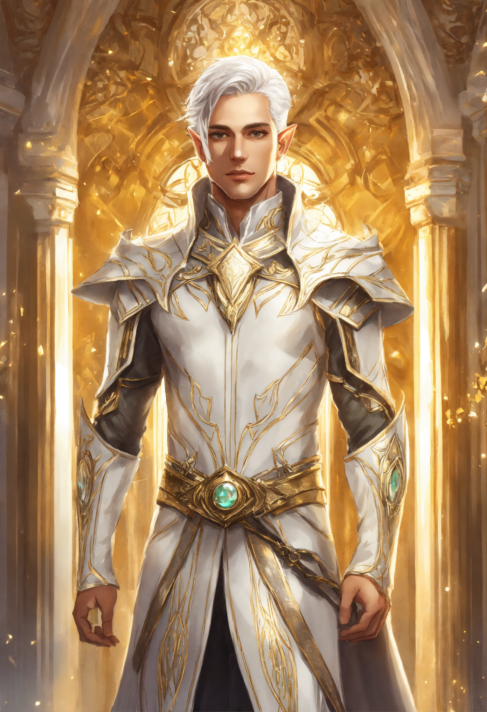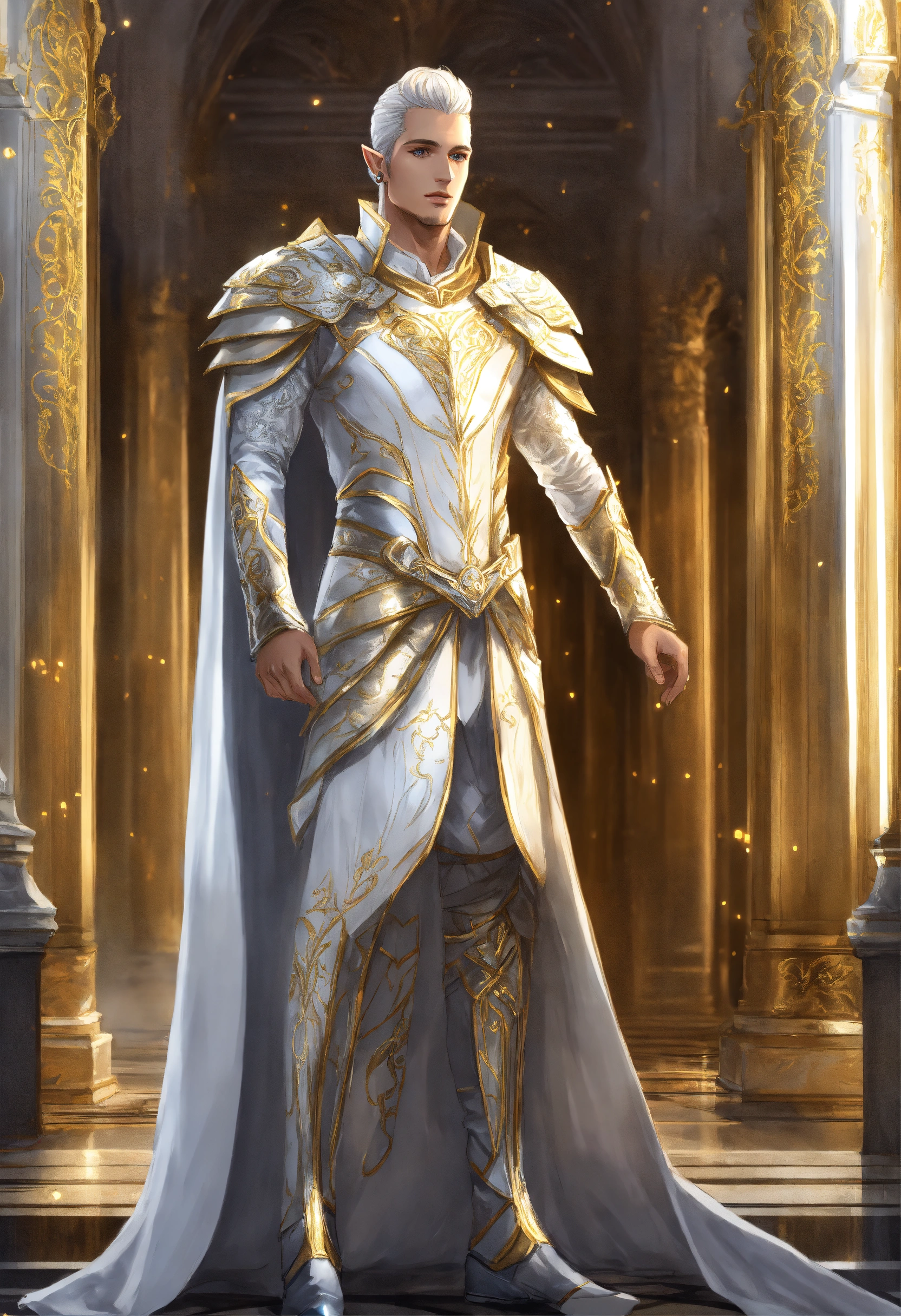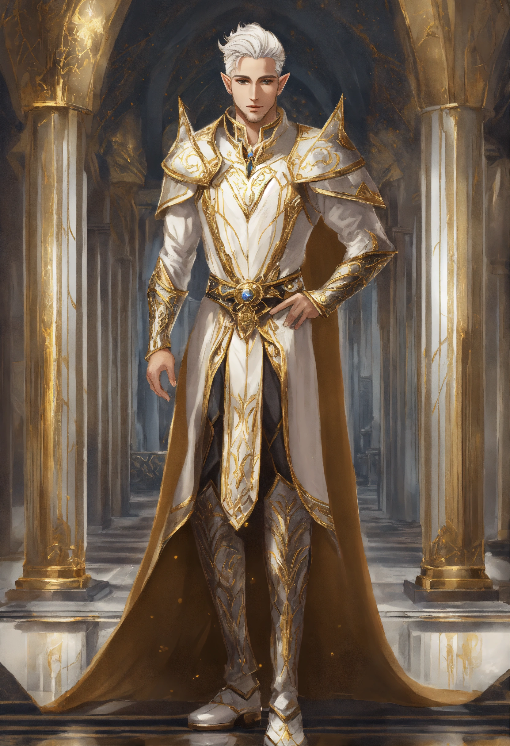 Drawing of an elf king, royalty, sci fi, cybernetic, white and gold royal sci fi outfit, silver hair, standing in an elegant marble elven palace, handsome, male high elf, 34 years old, elf ear