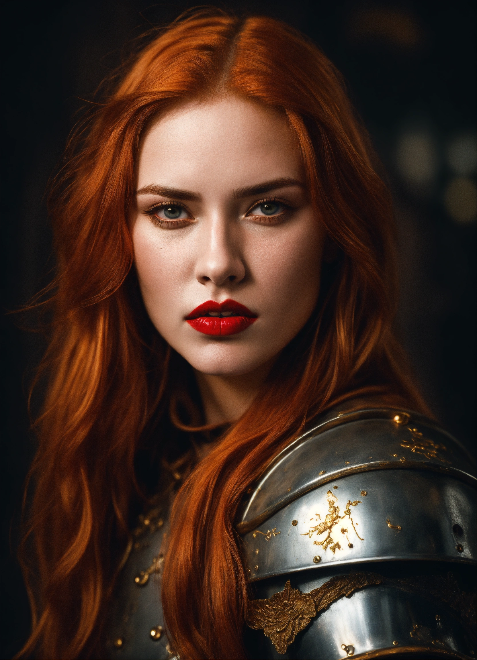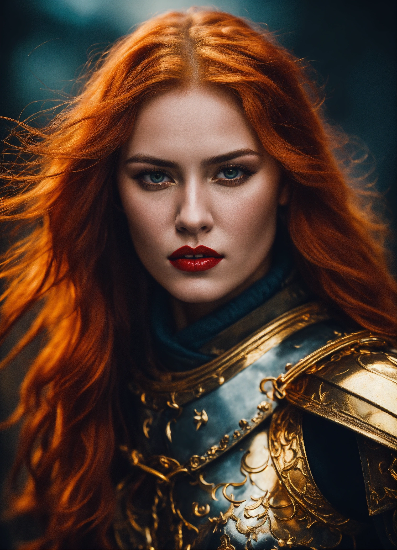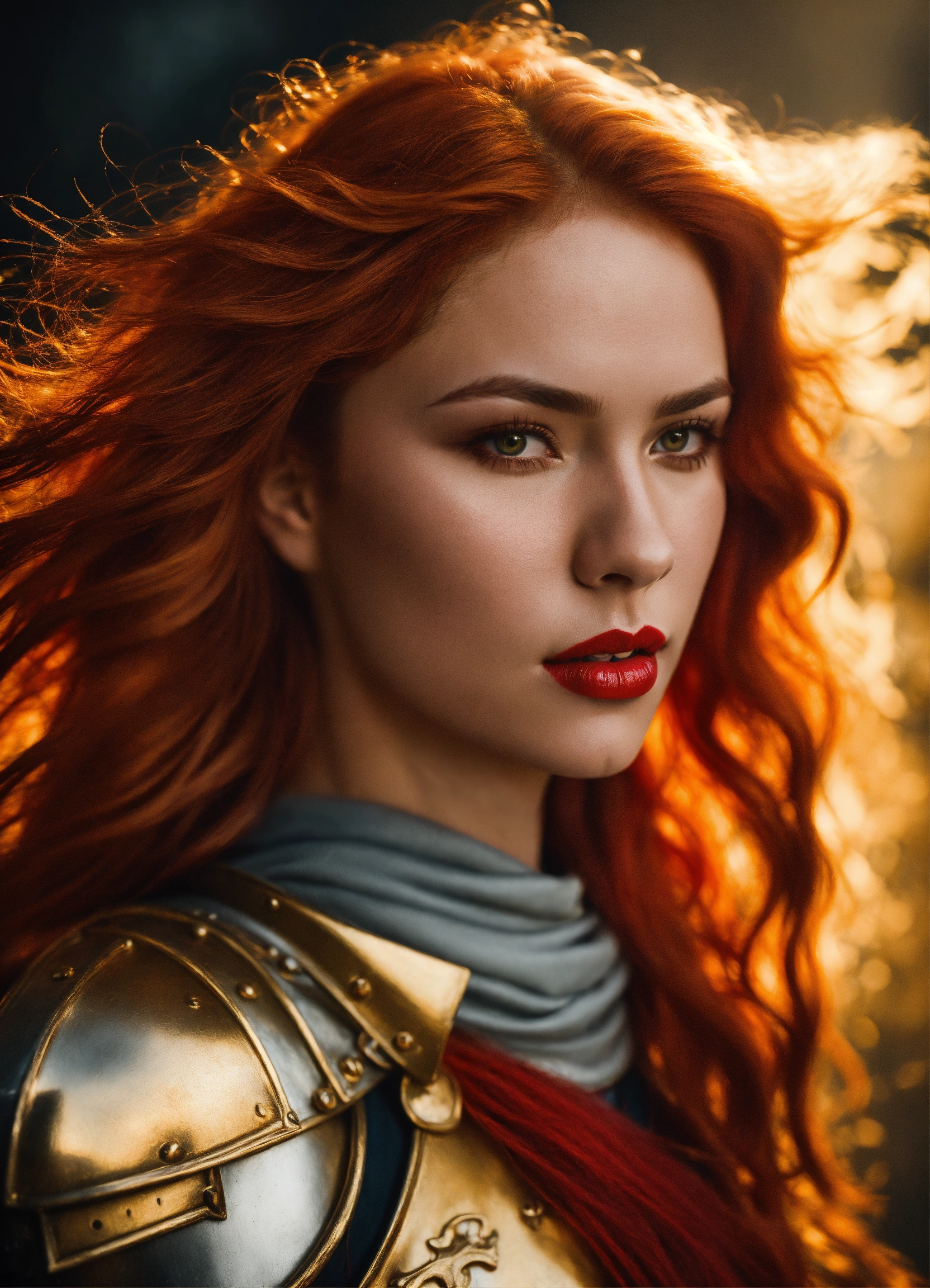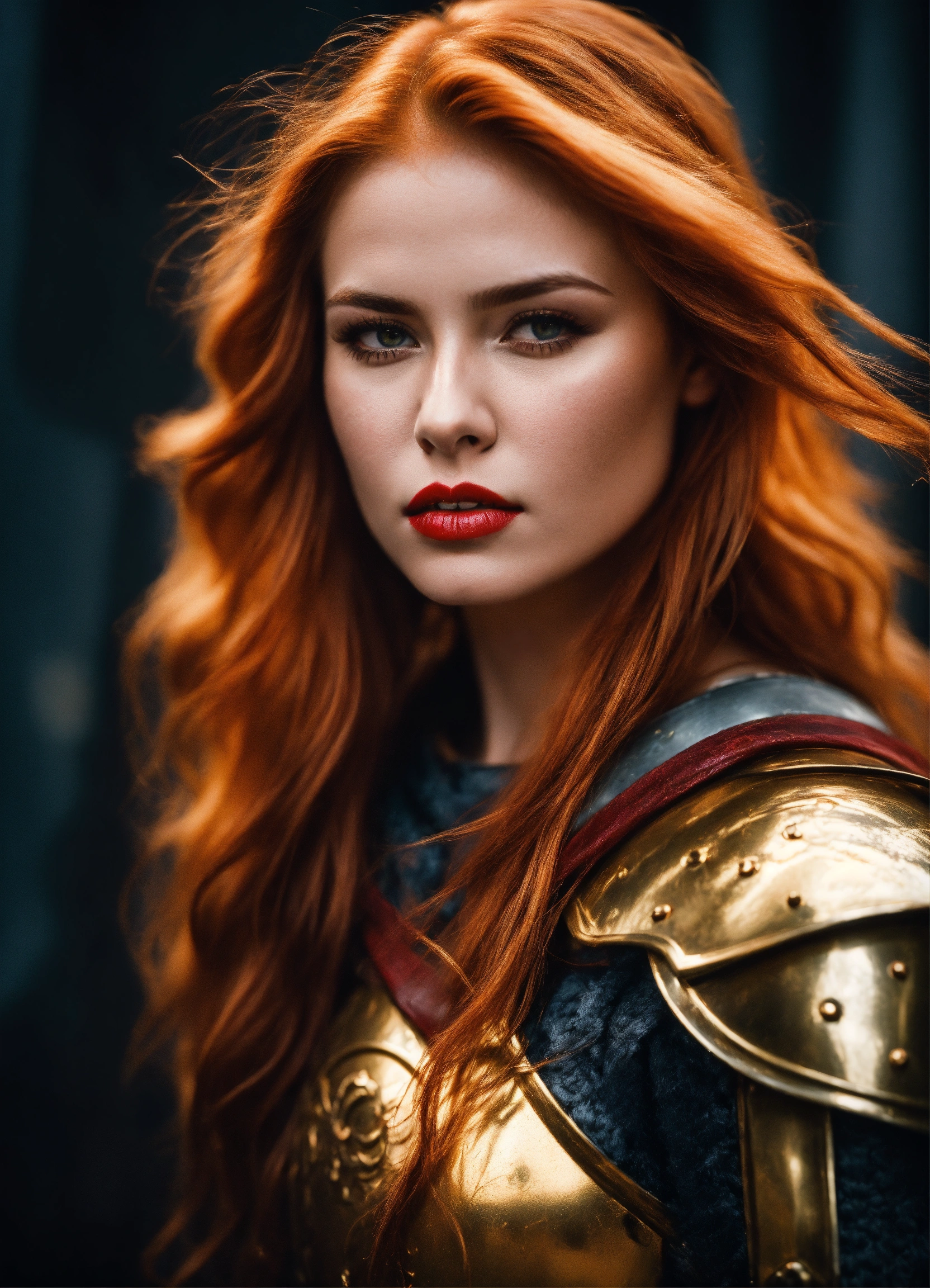 Photo quality portrait of mighty female knight with flowing streaked red-golden hair, crimson lips and fierce glare