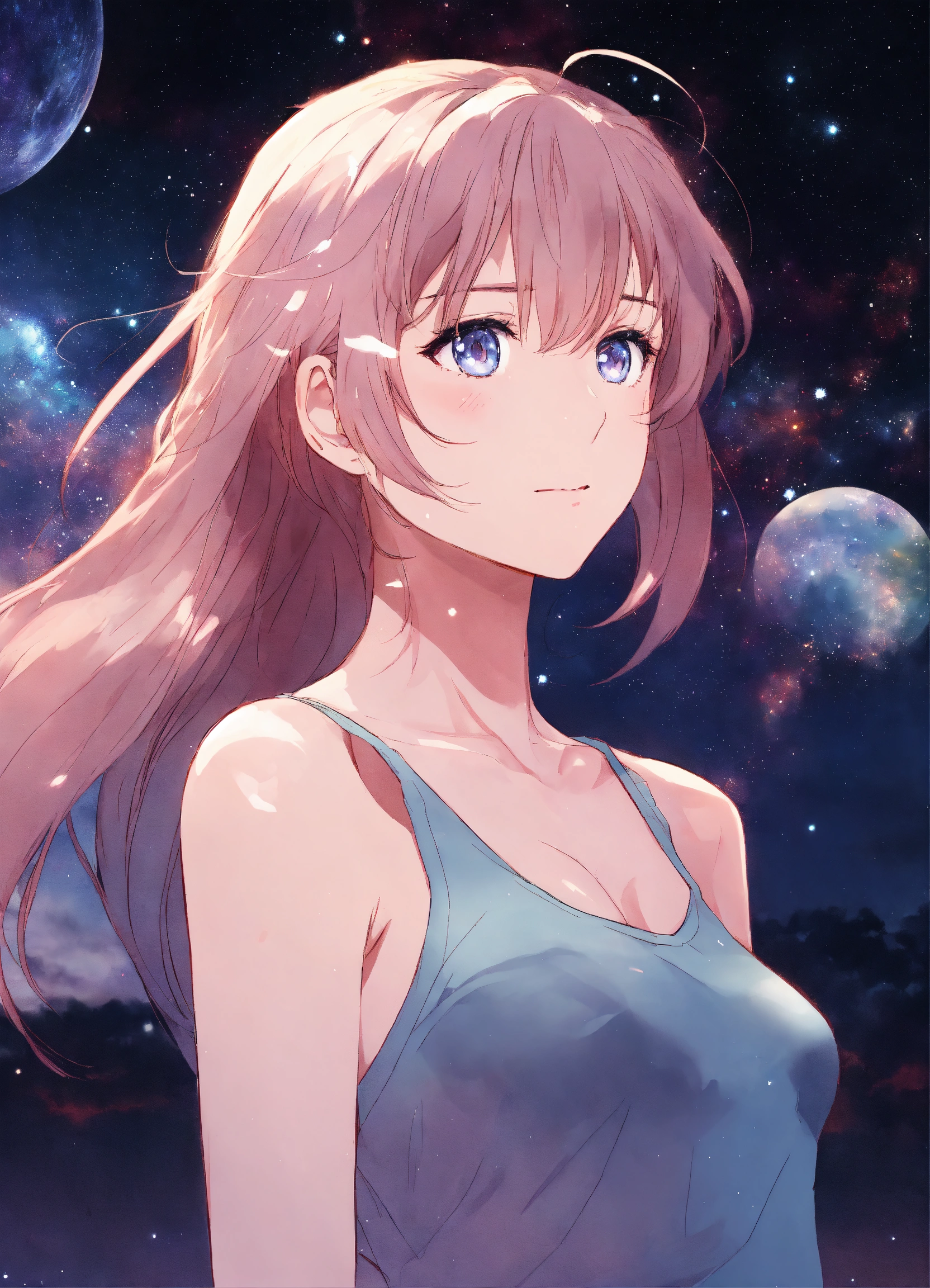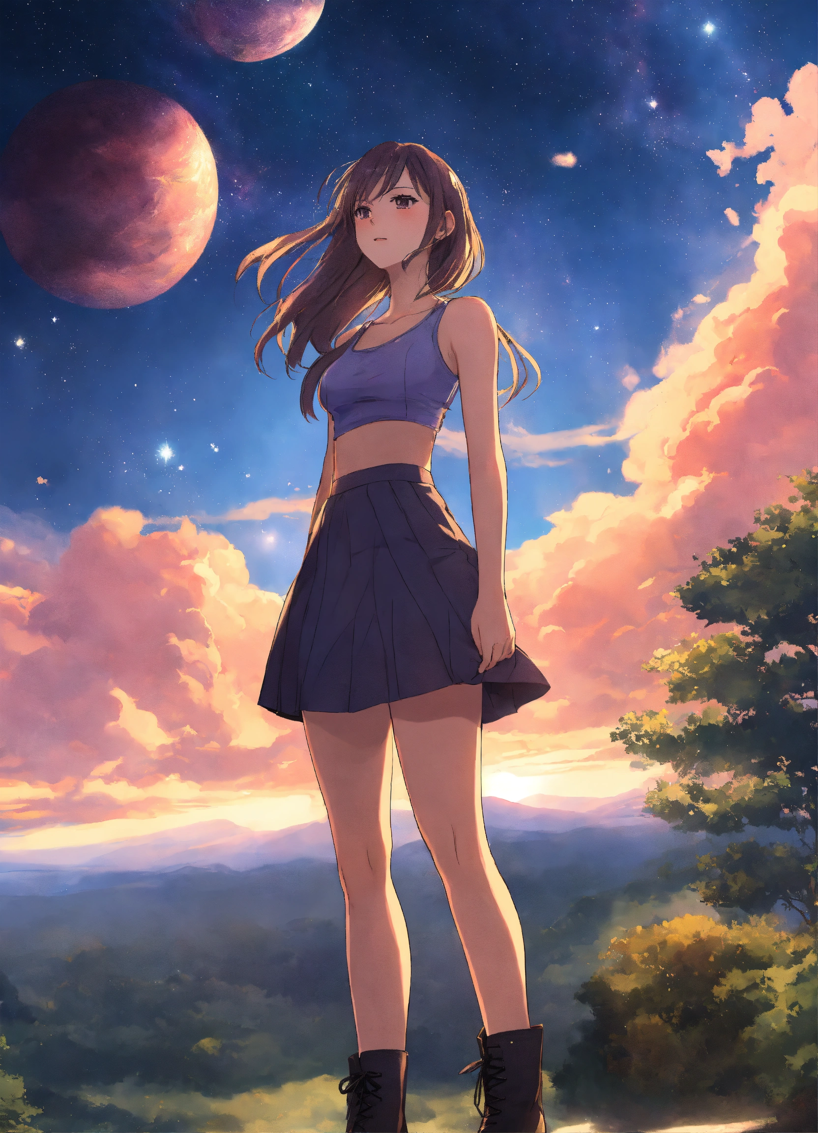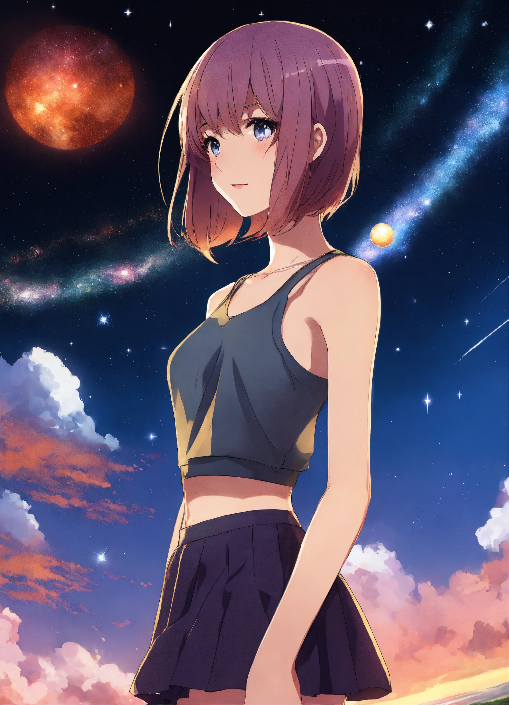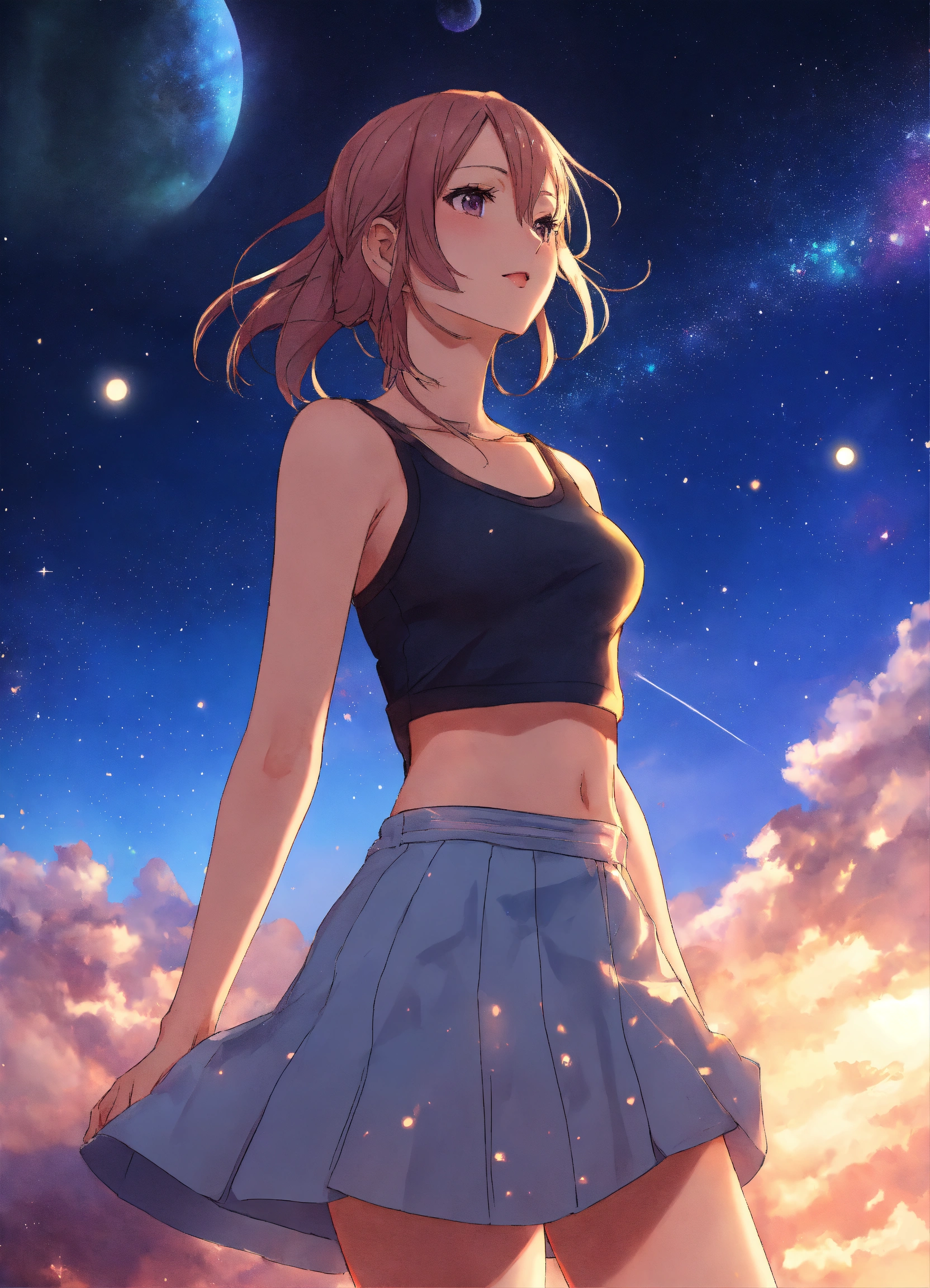 A anime drawing of a 23 year old girl, she is wearing a tight tank-top and a skirt, in the sky we see the galaxy