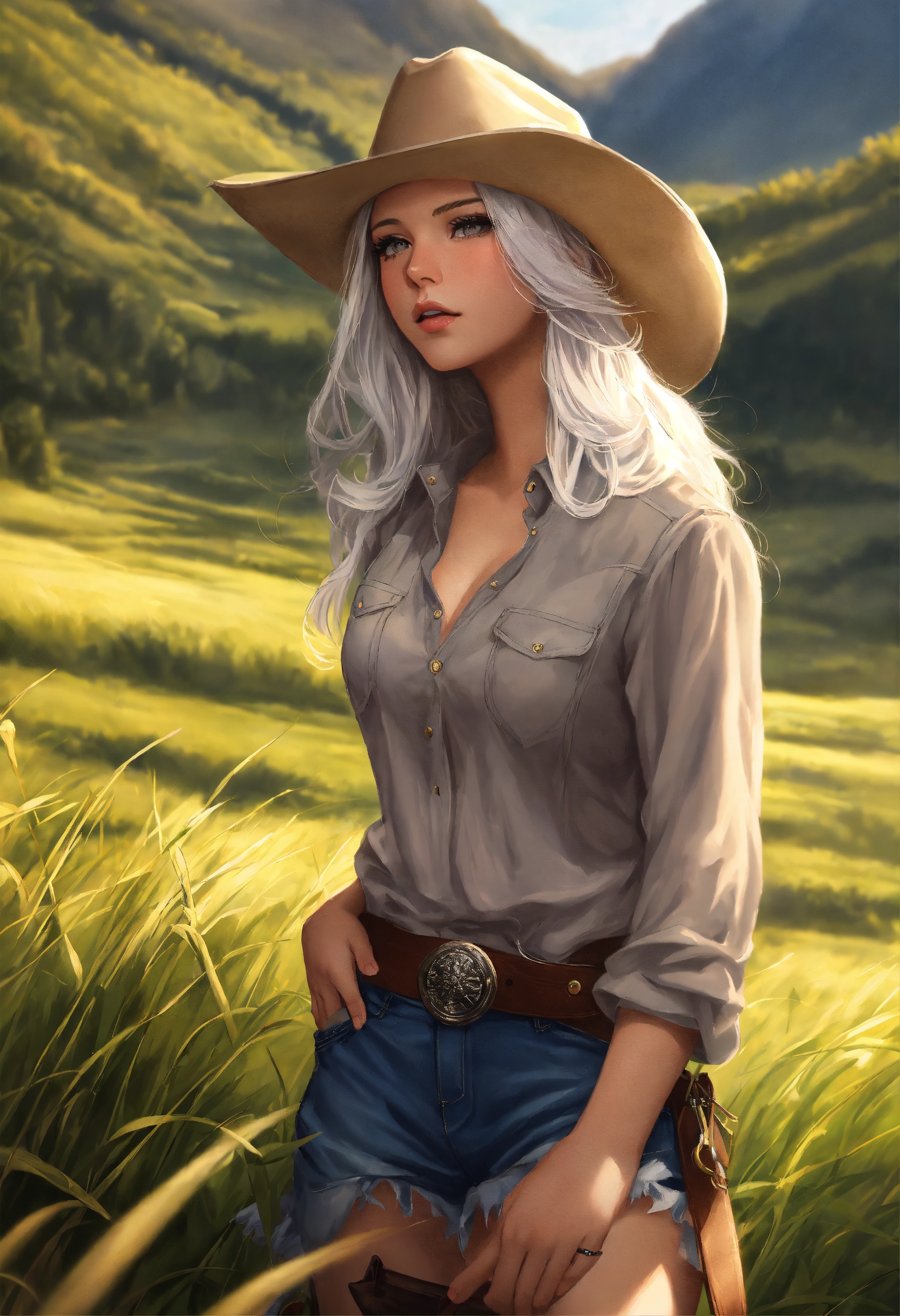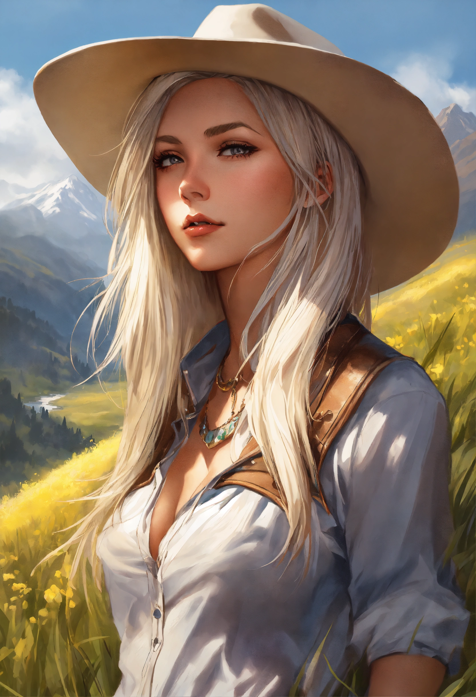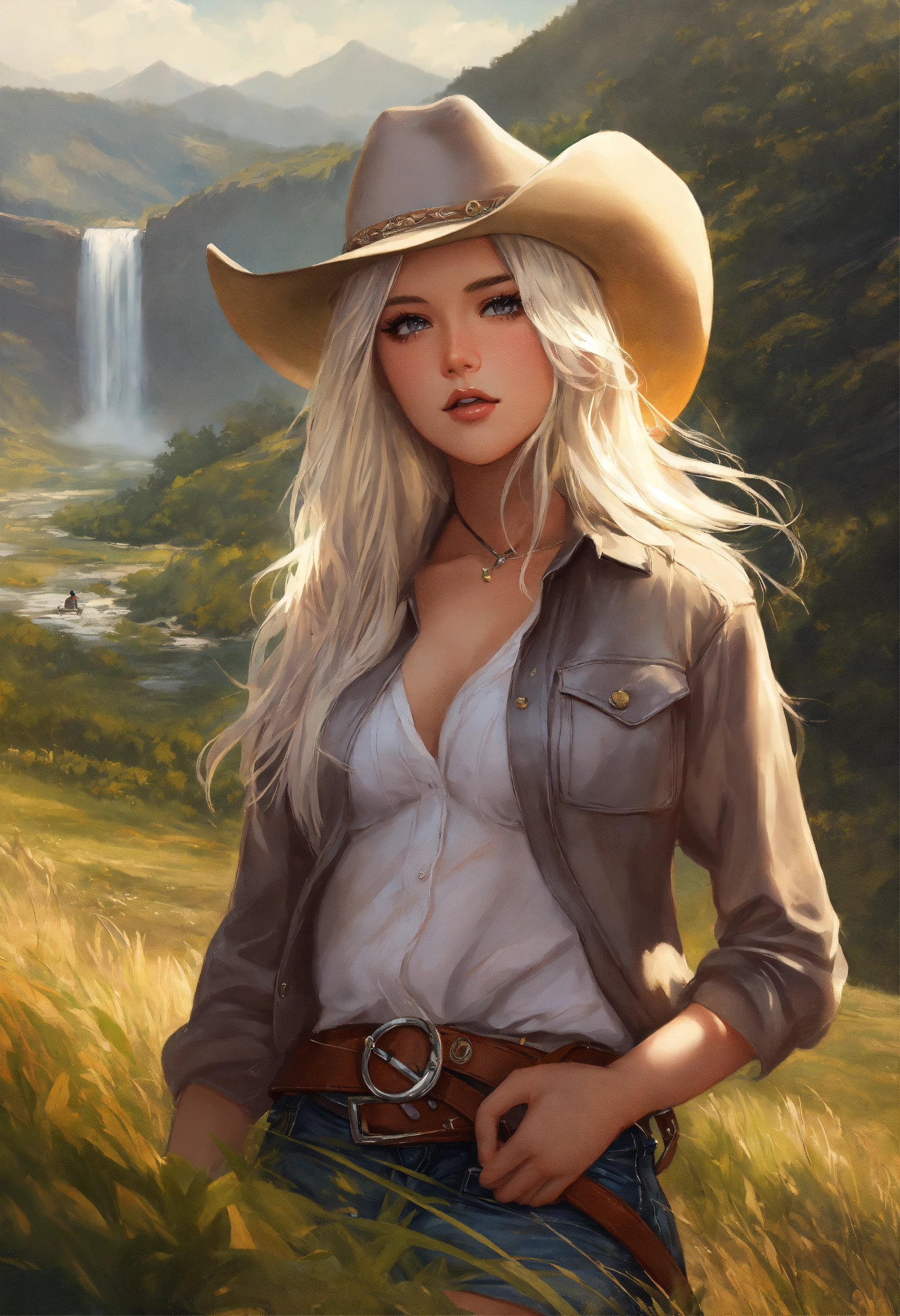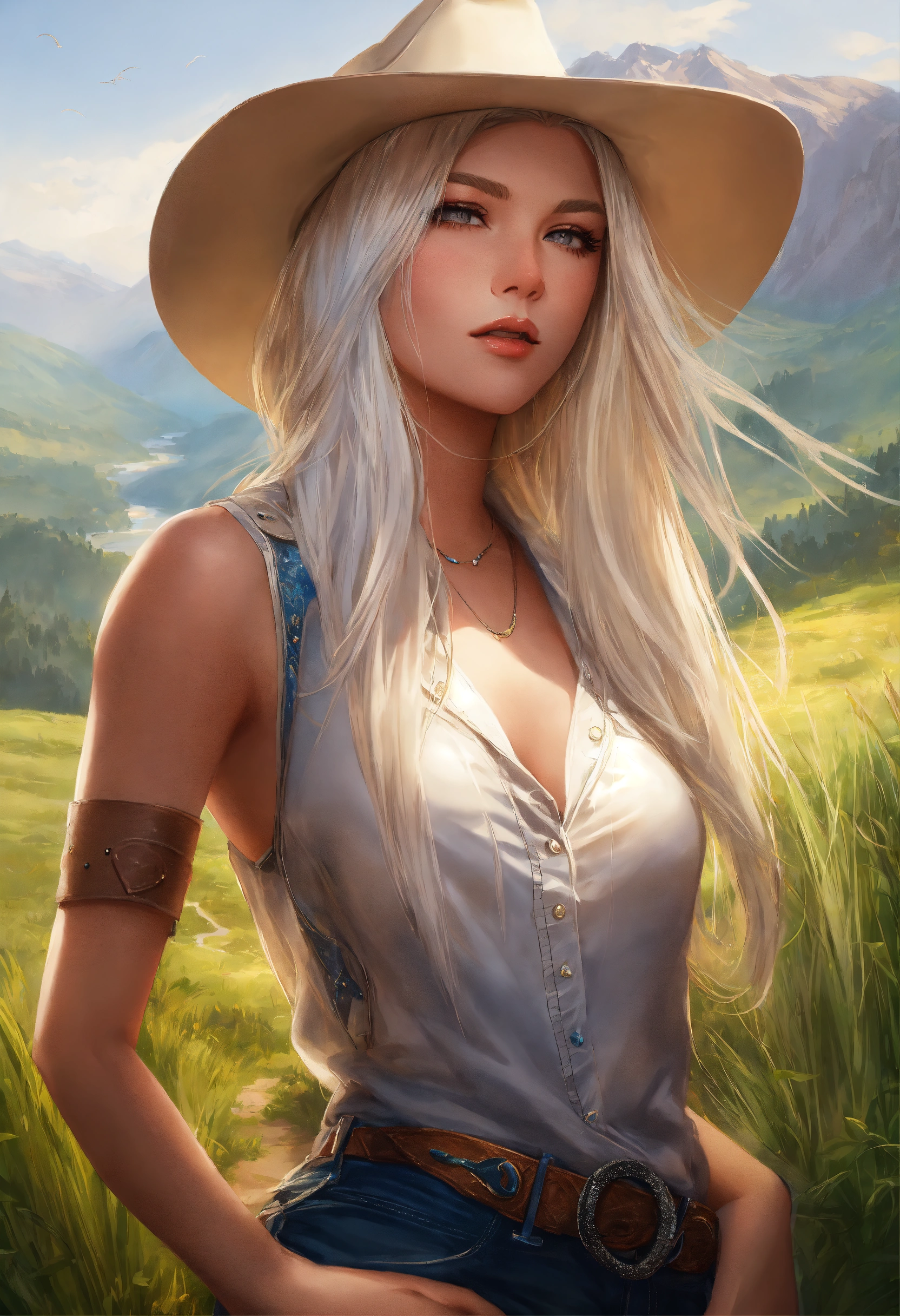Artgerm, 20 years old woman, platinum hair, grey eyes, ((cowgirl)) hight grass filed, waterfall, mountain, summer, sunhat, large scale angle