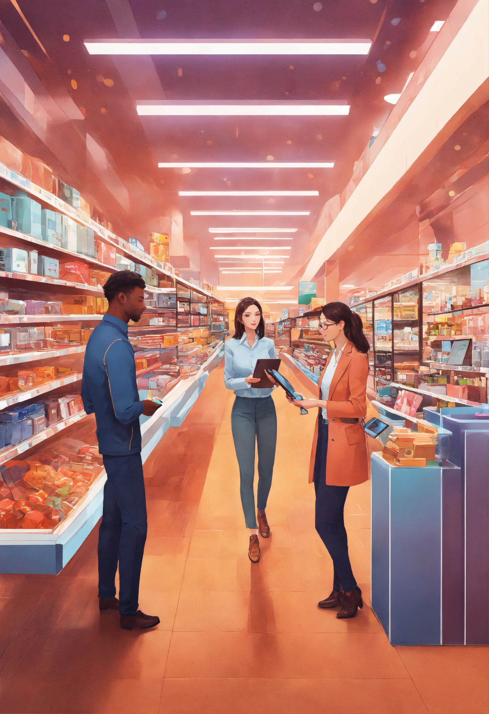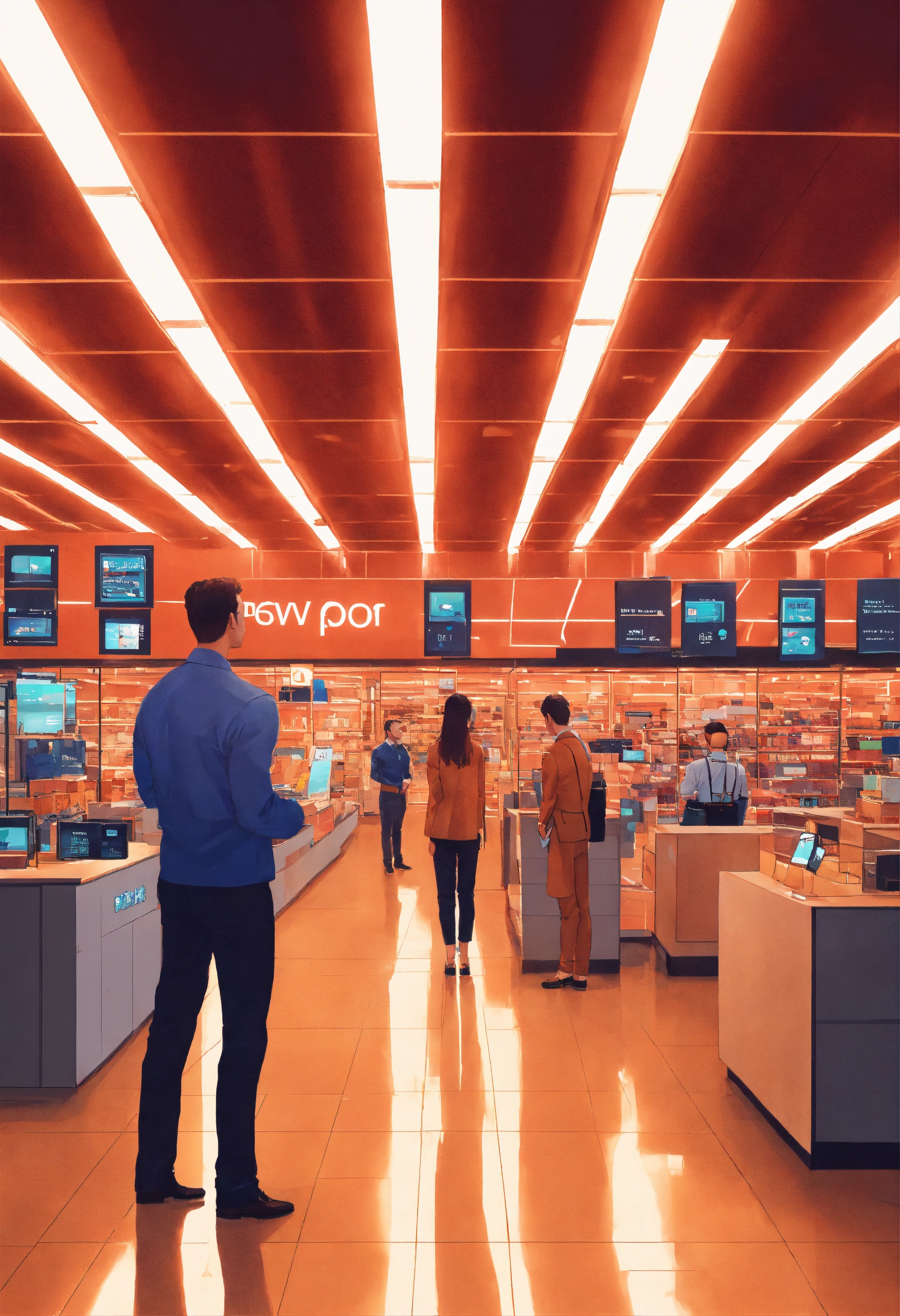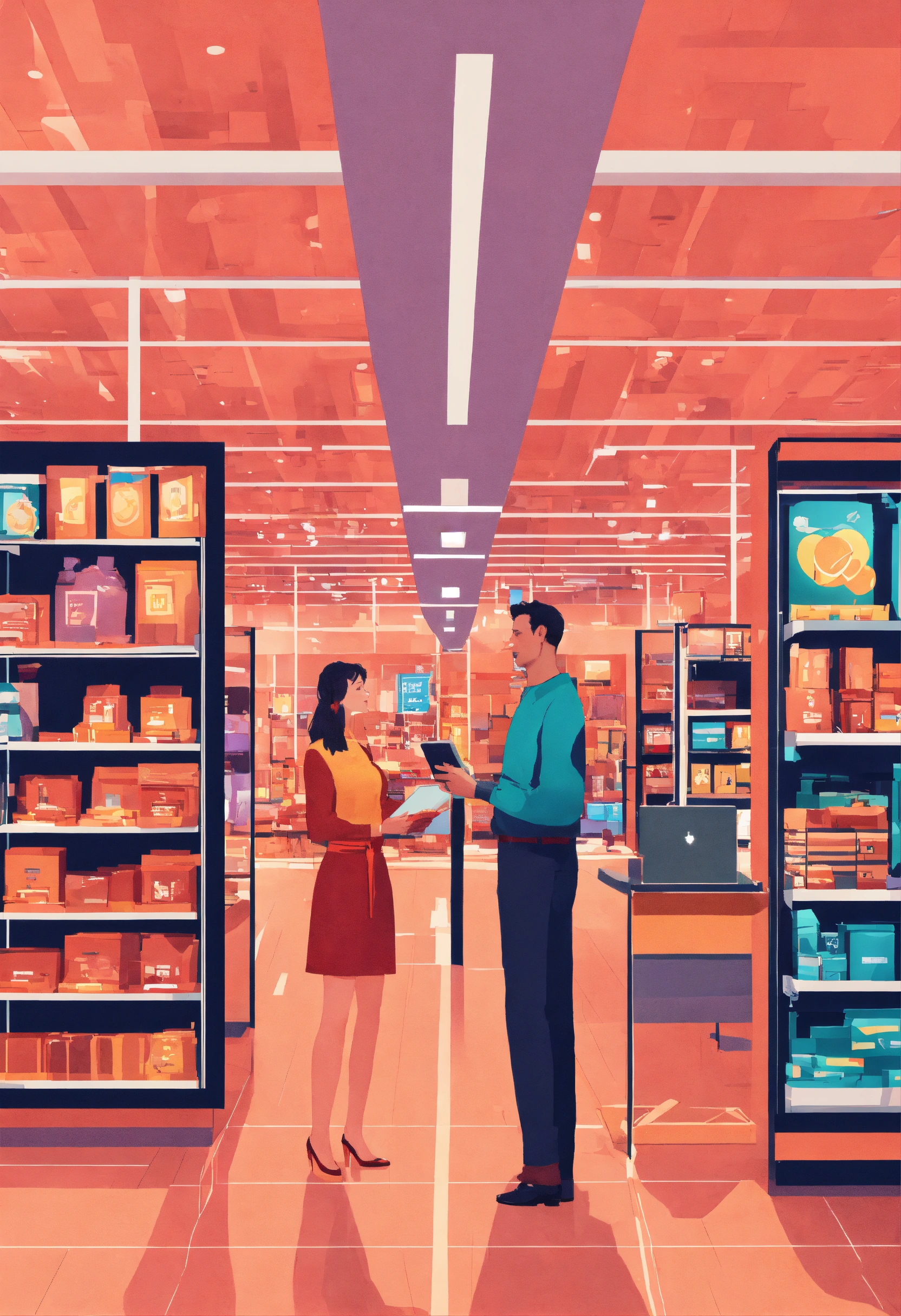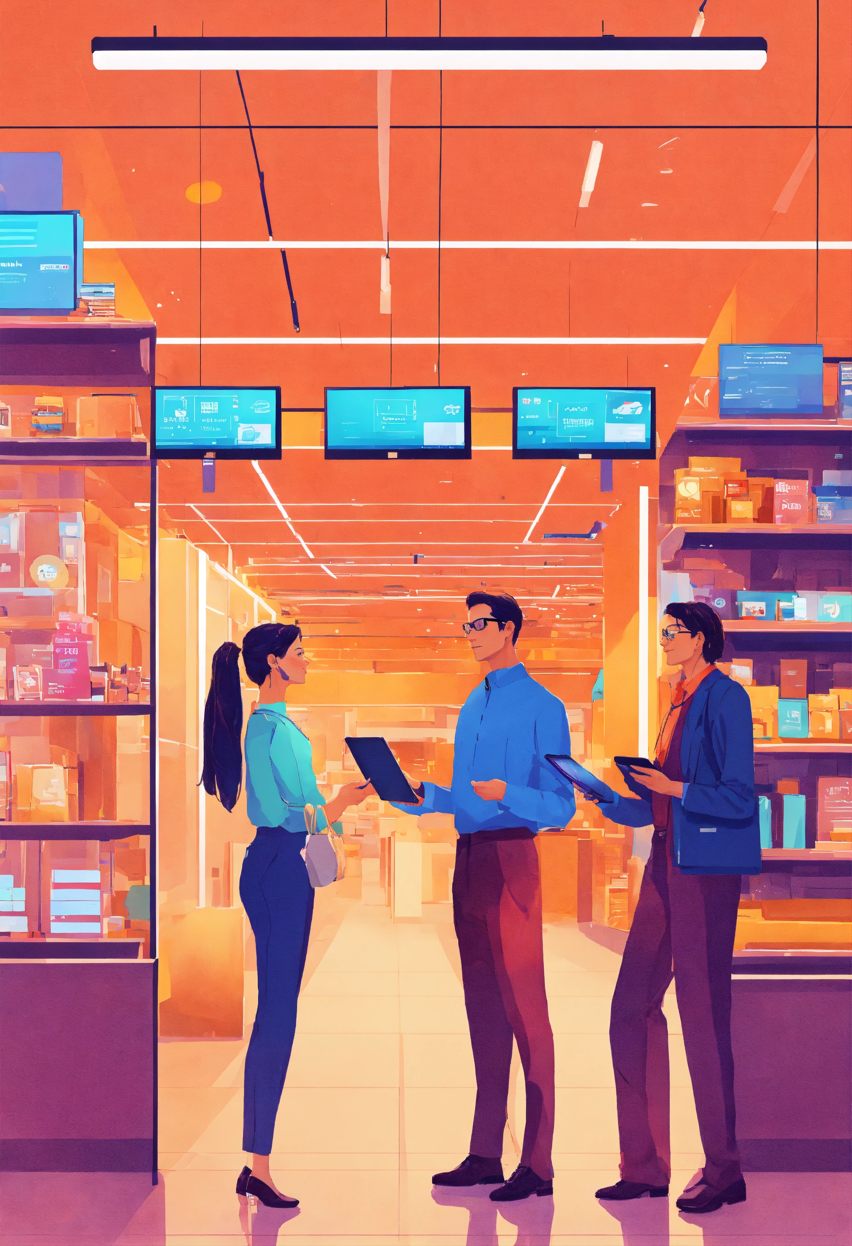 Photo of a man and a woman in a department store, lots of technology, data, ai, and customer care in a rather realistic style