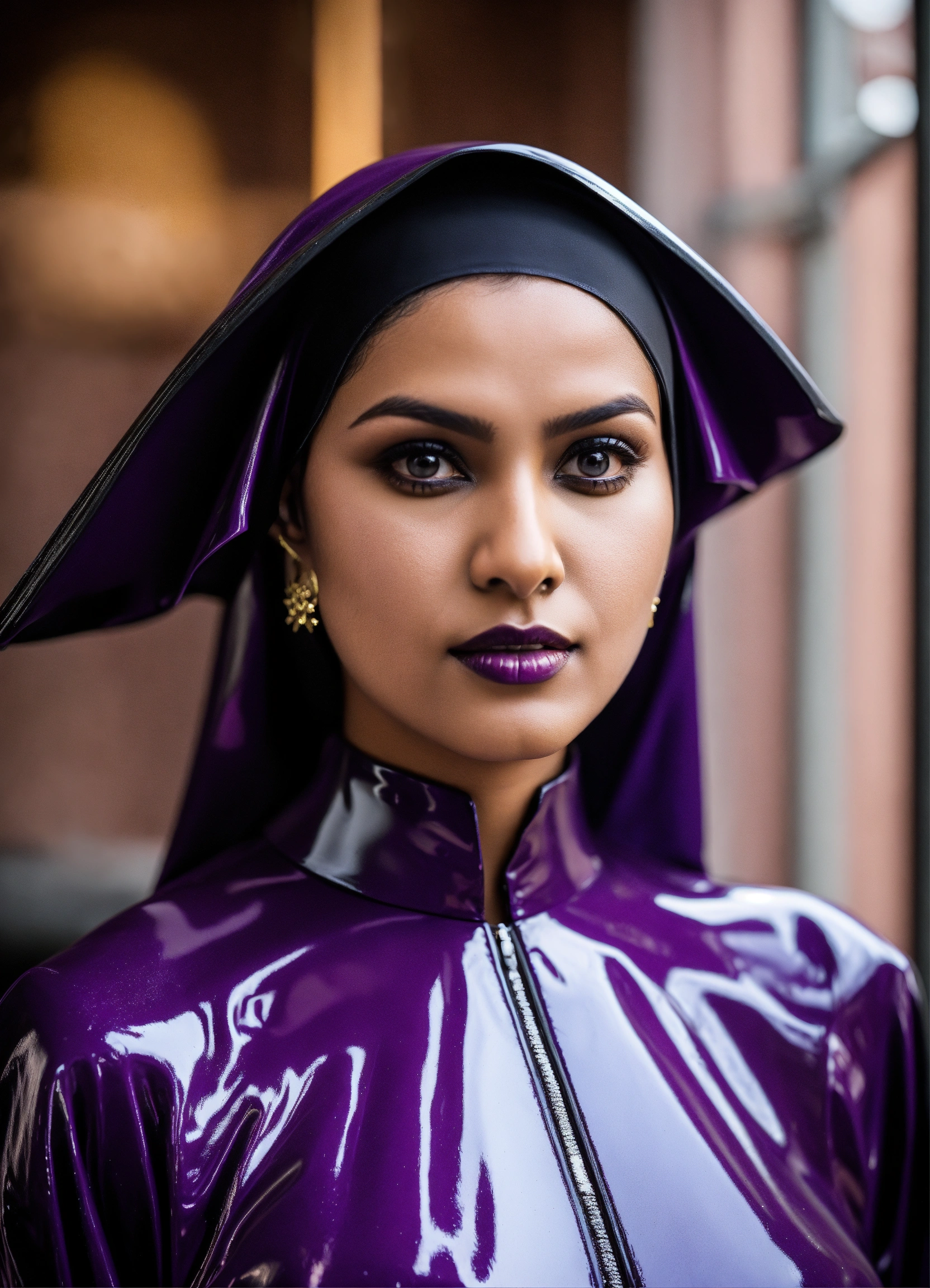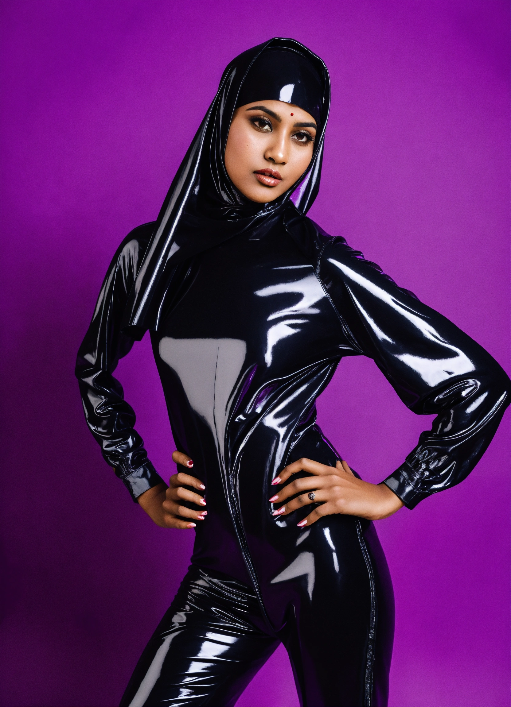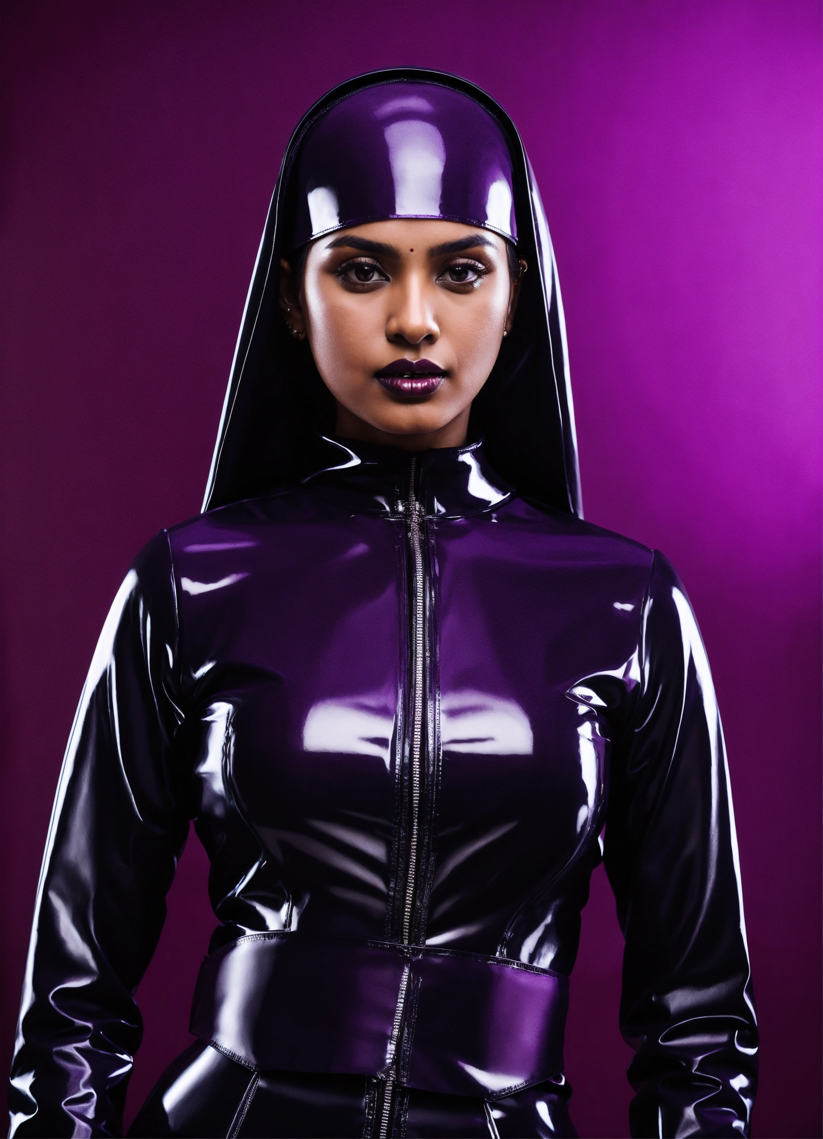 Slim indian woman wearing purple and black glossy rubber nun outfit