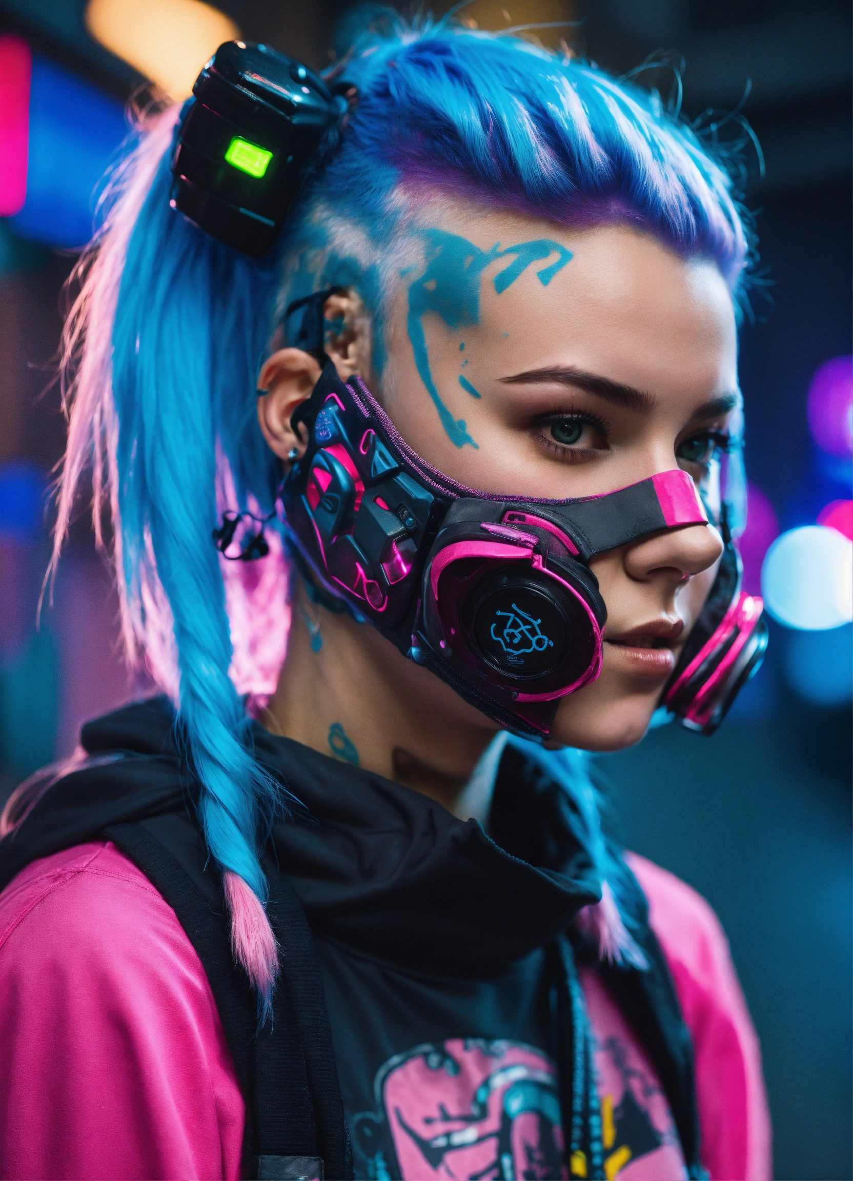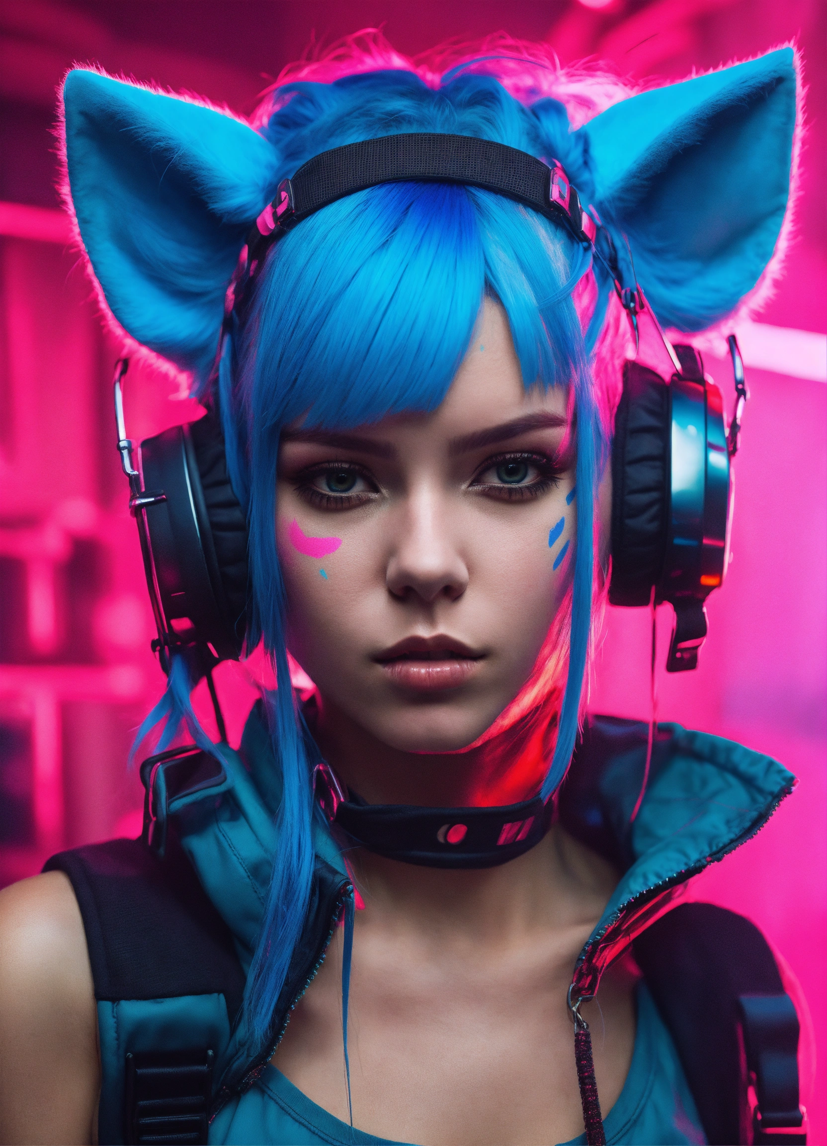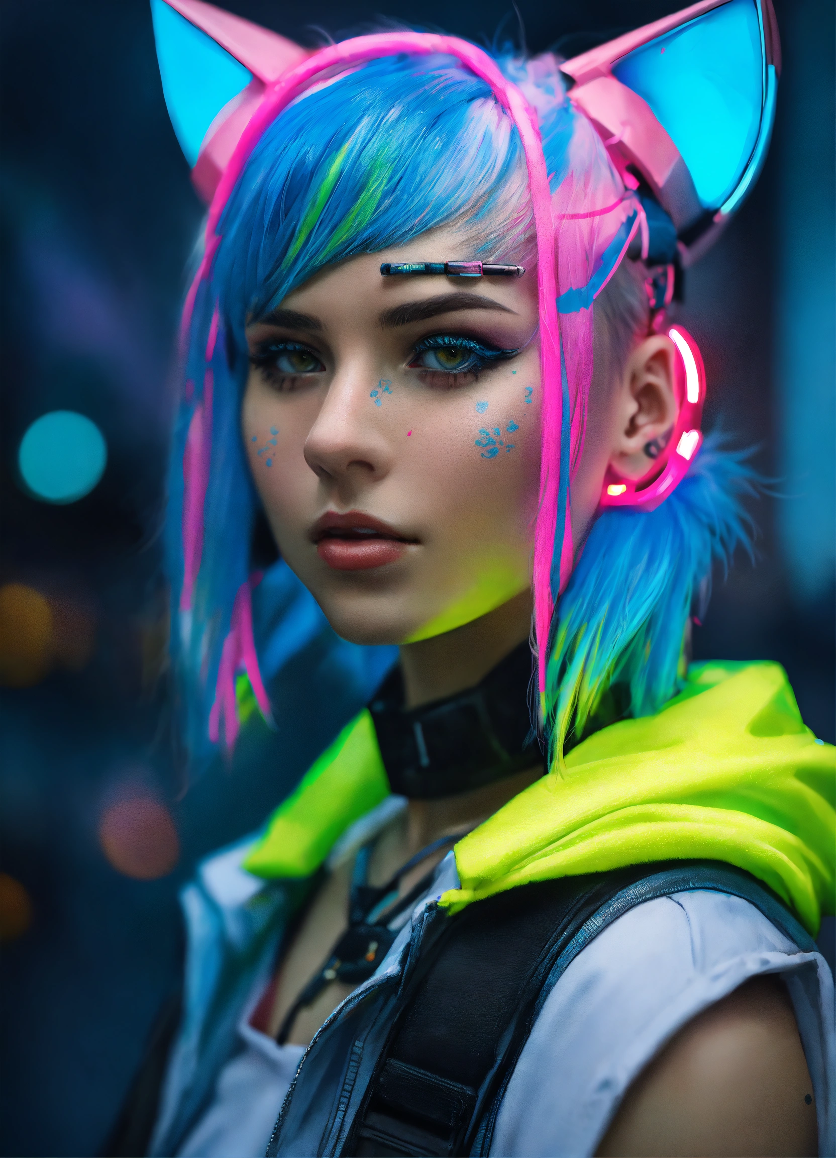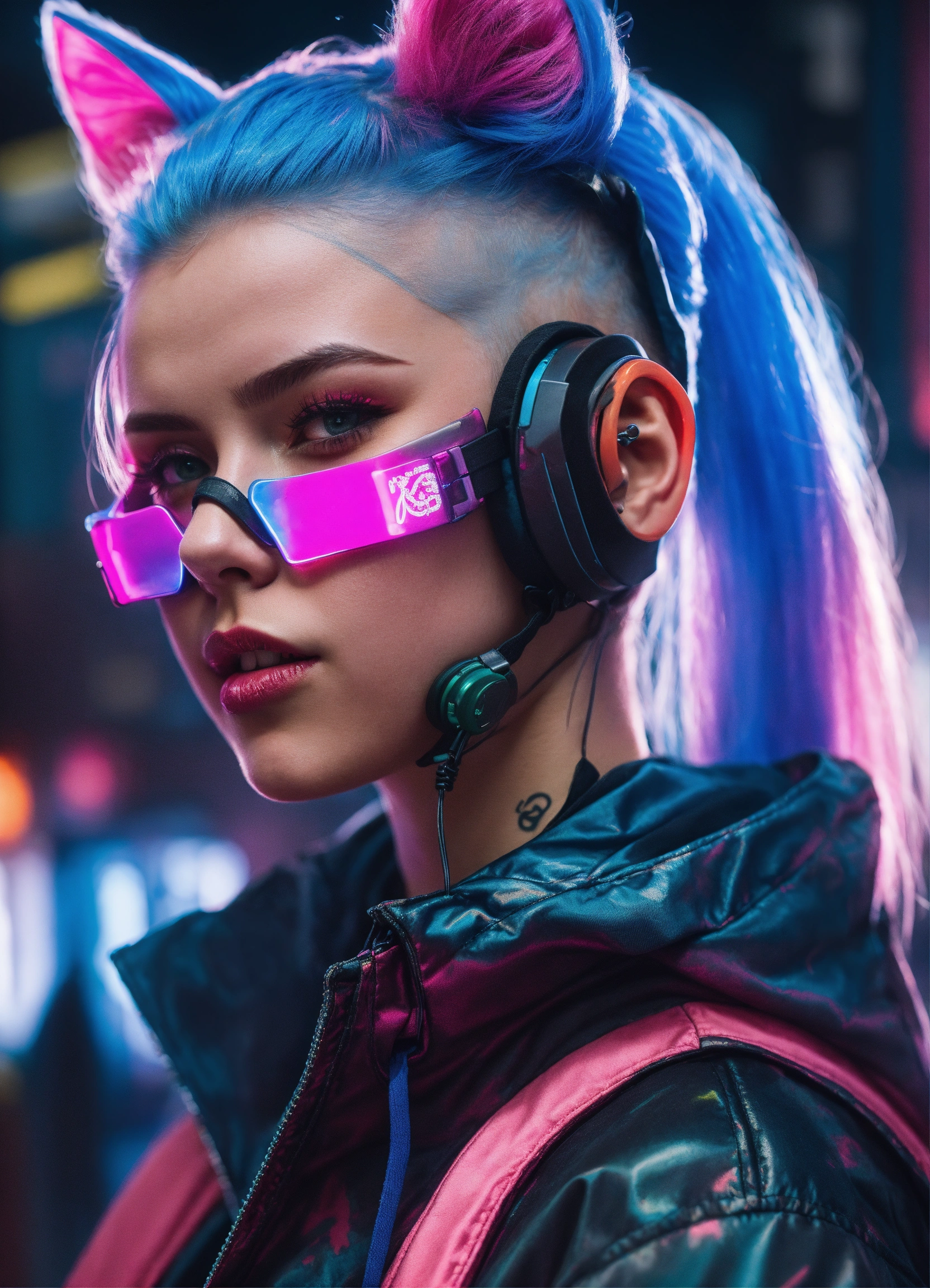 Highly detailed portrait of a 20 year old russian cyberpunk woman wearing a full neon cat mask, ponytails, shaven sides, blue and pink hair, sleeveless hood, grungy!!