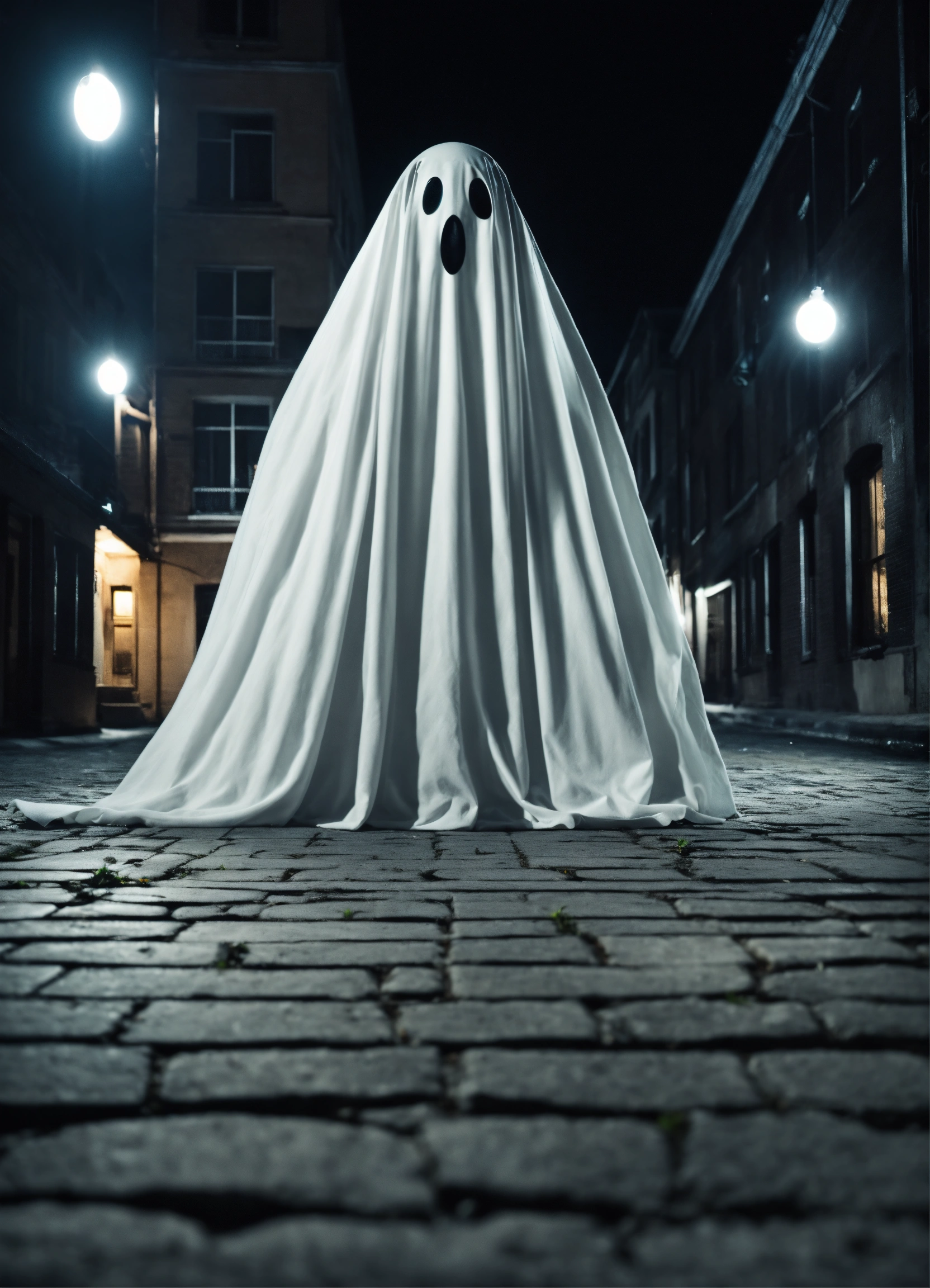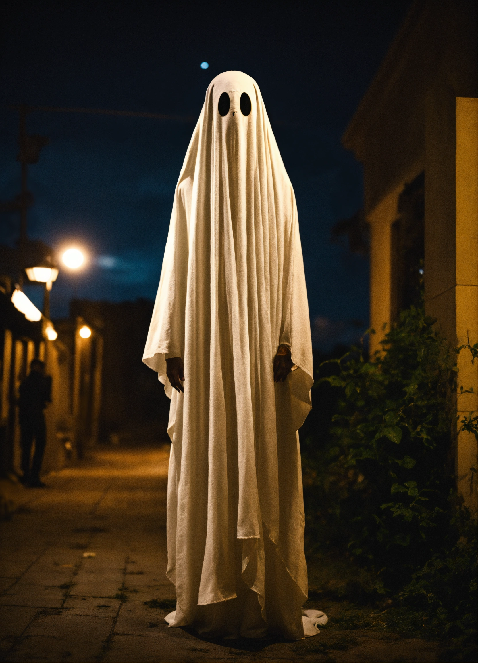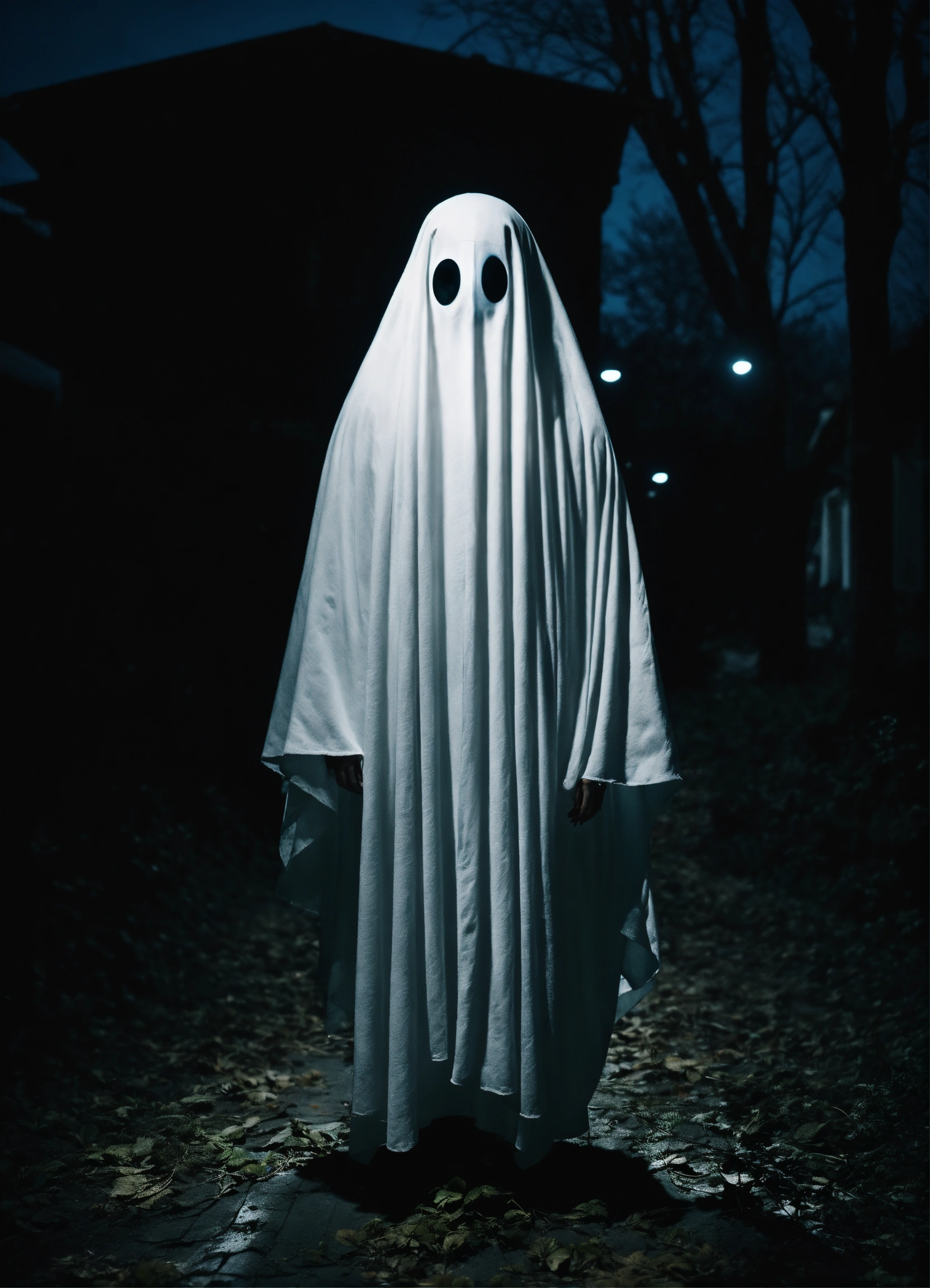 Very cute, realistic white ghost whit many eyes standing in background complete black, unsettling, wide angle, night time, shot on leica