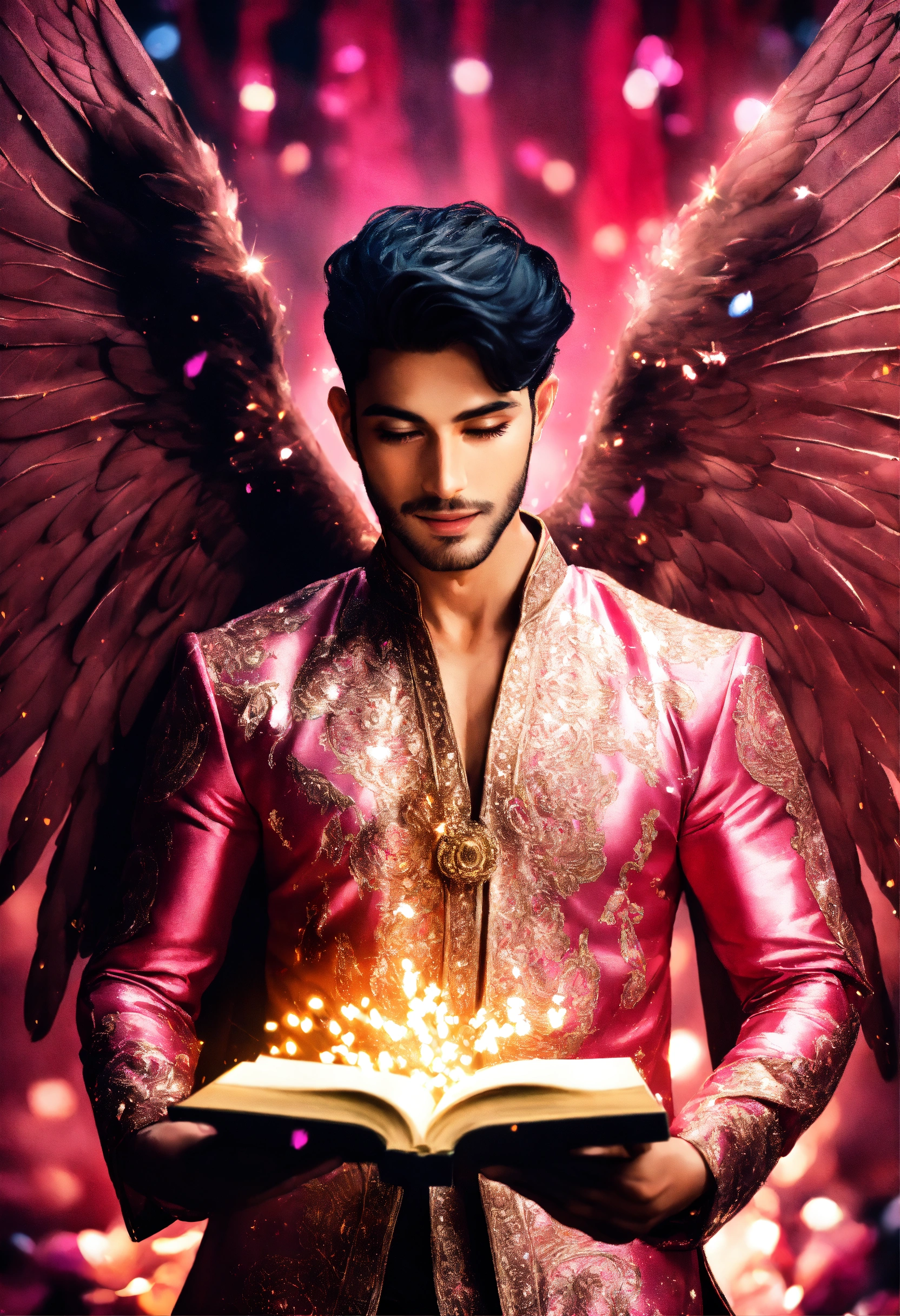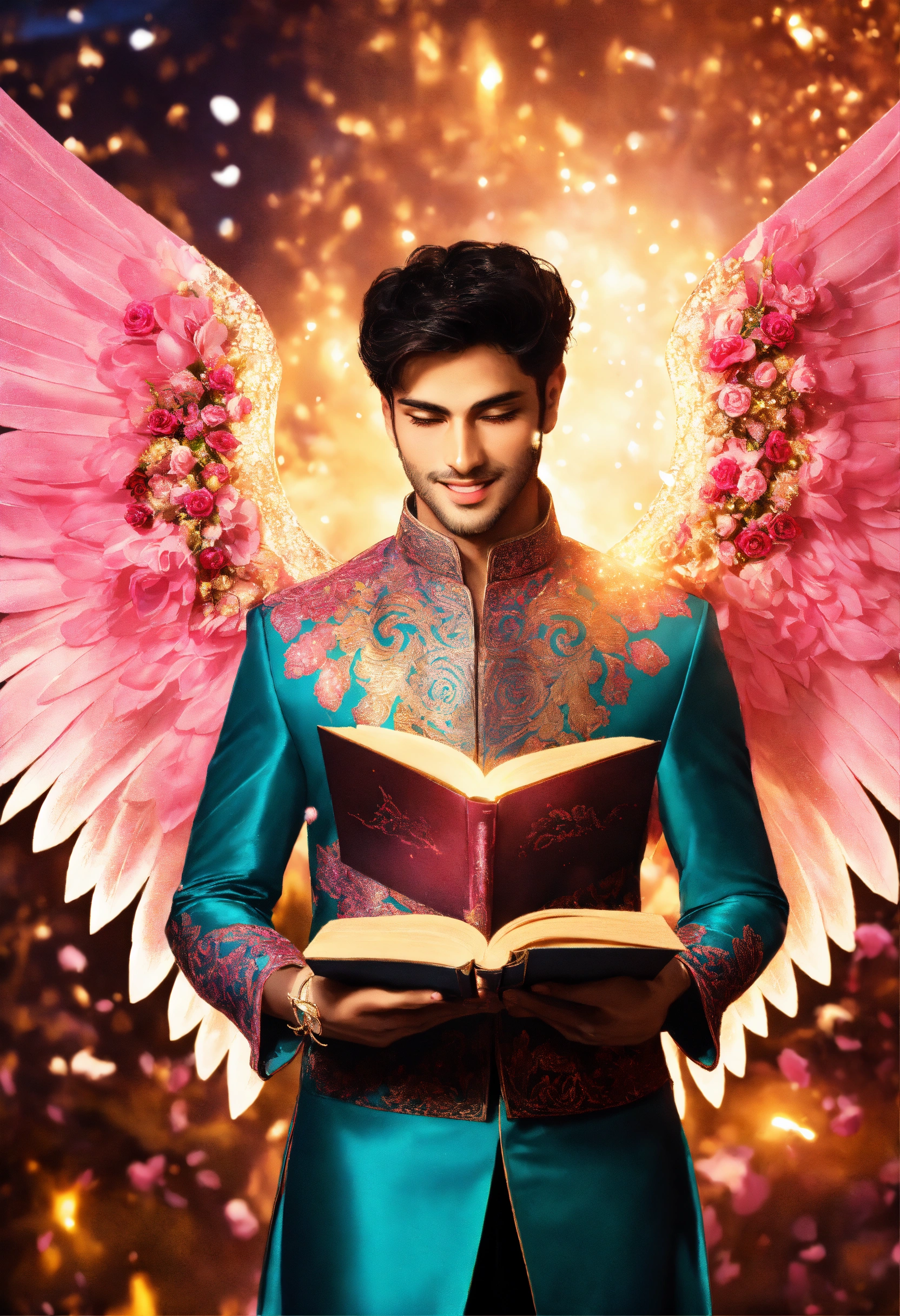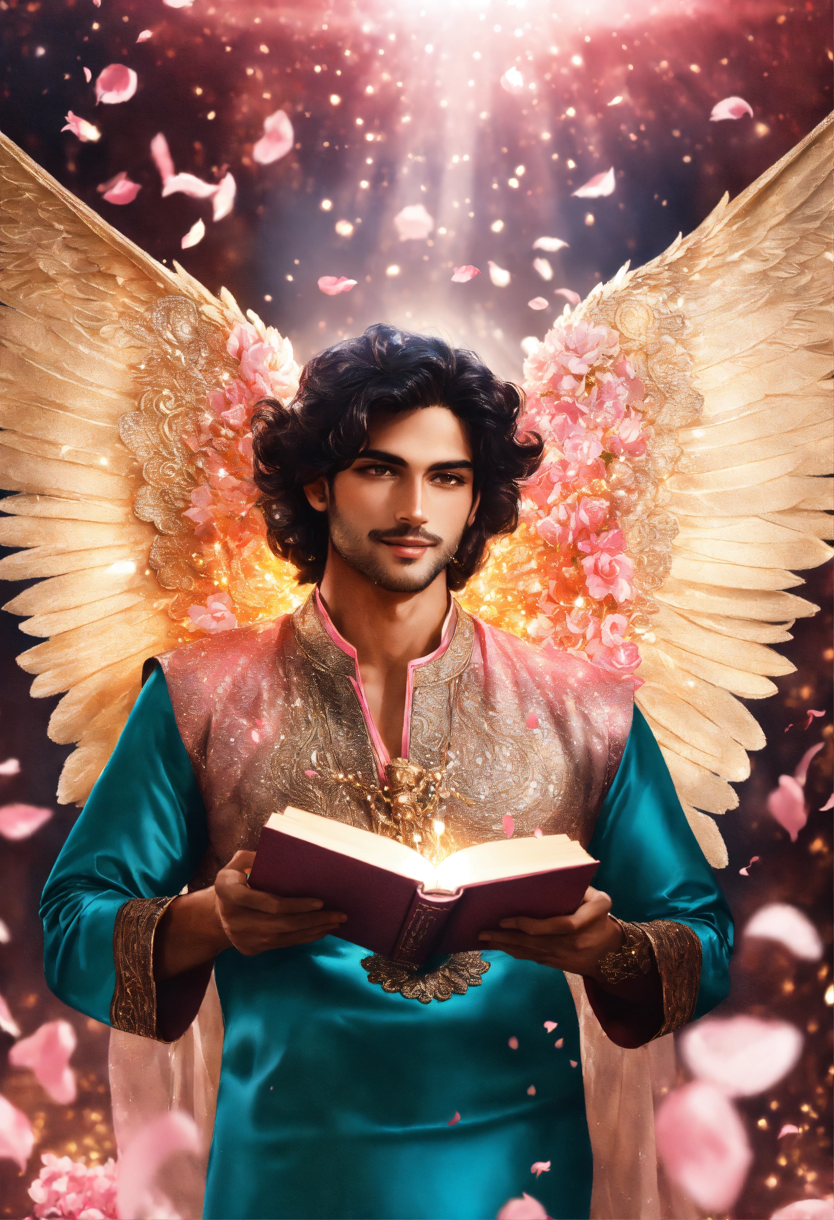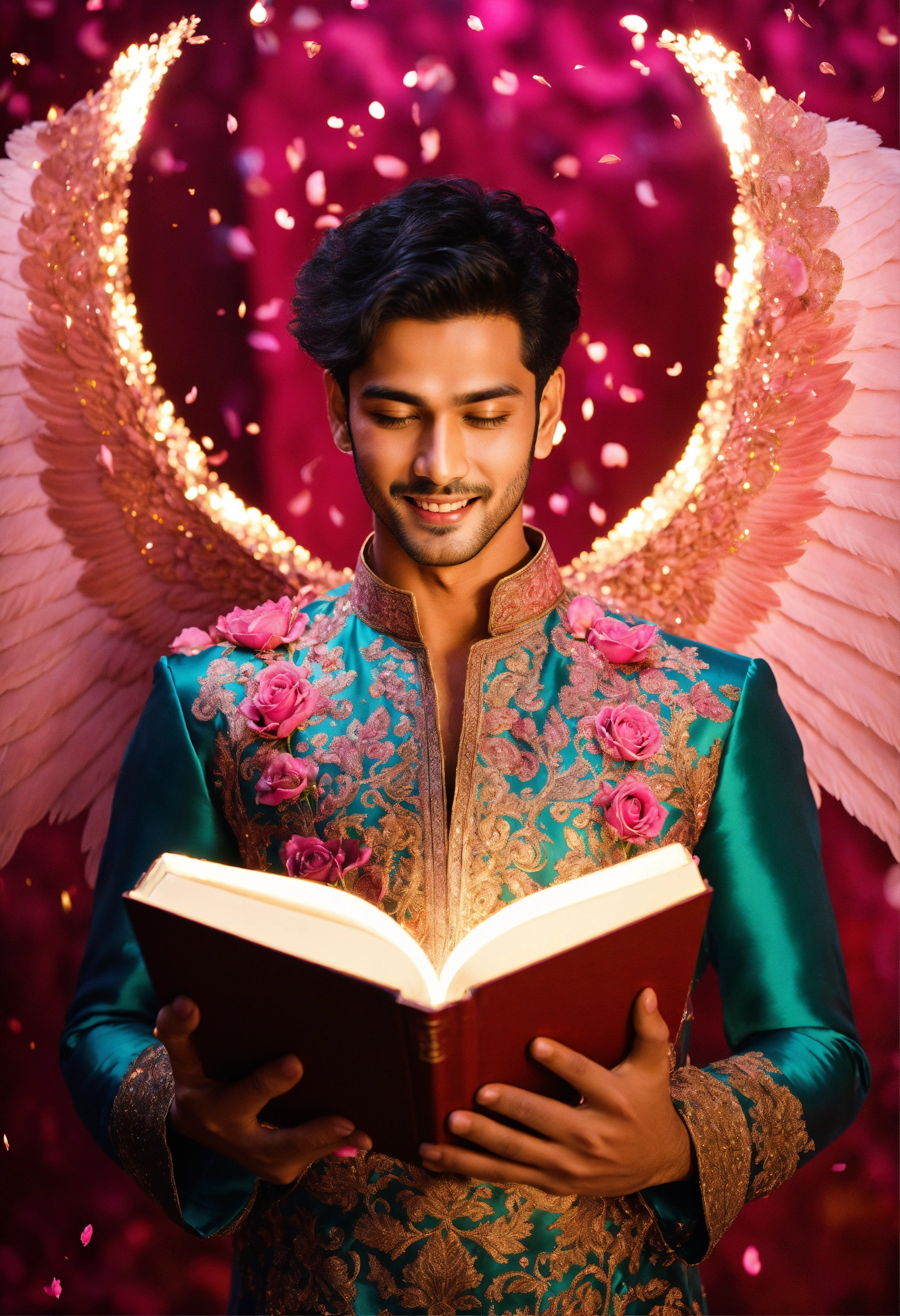 Surrealistic close up photograph portrait of handsome masculine gorgeous archangel of wisdom young indian supermodel male with massive angel wings, background is holy spirit explosion of sparkles, loving friendly smile, holding an open heavenly-lit glowing book surrounded by swirling sparkling rose petals in the air, staring lovingly straight ahead directly into camera at me, short black hair, loving brown eyes centred towards me, wearing satin teal and pink intricately designed indian dhoti kurta with high neckline, fantasy magazine photoshoot, .