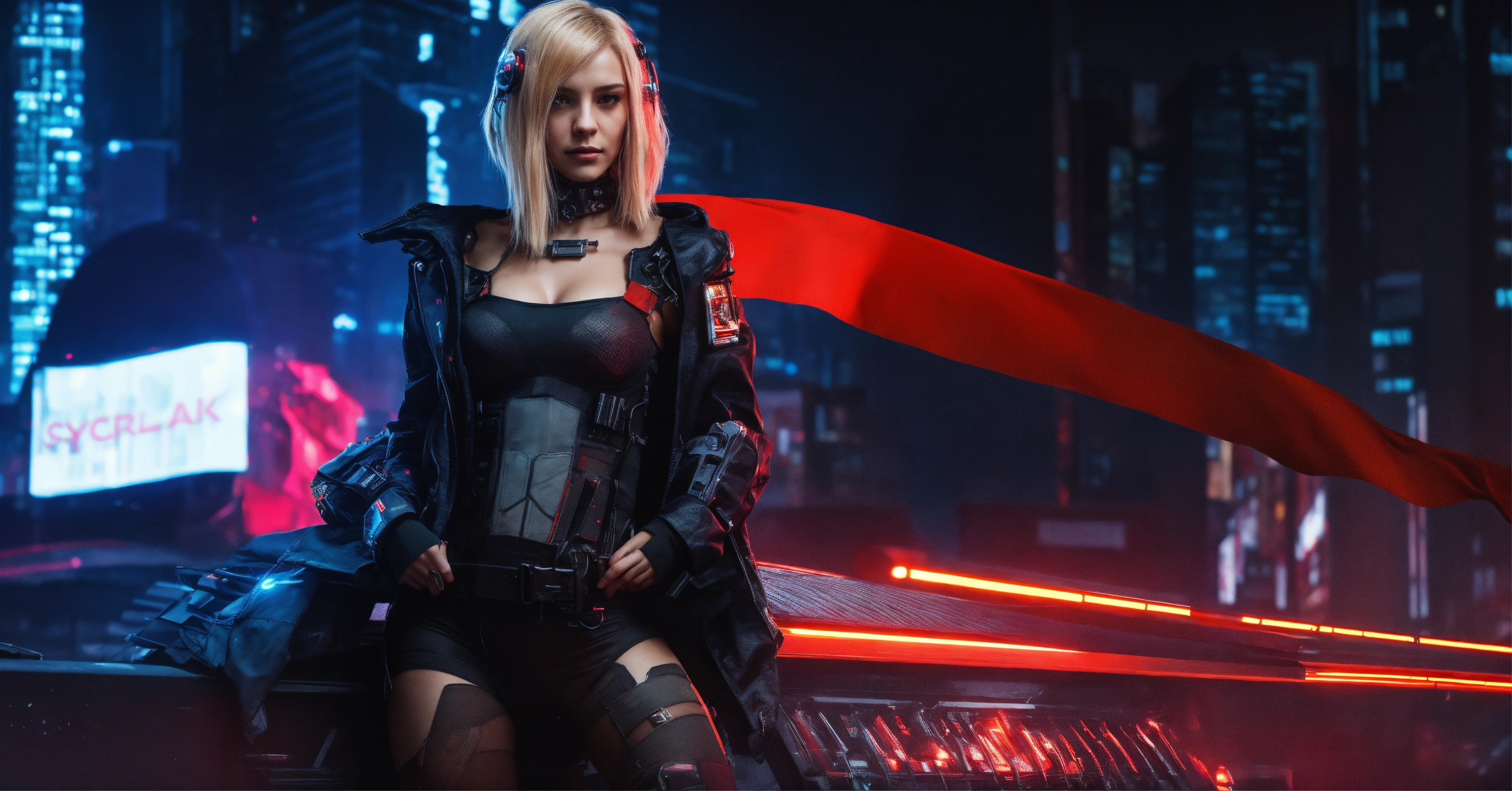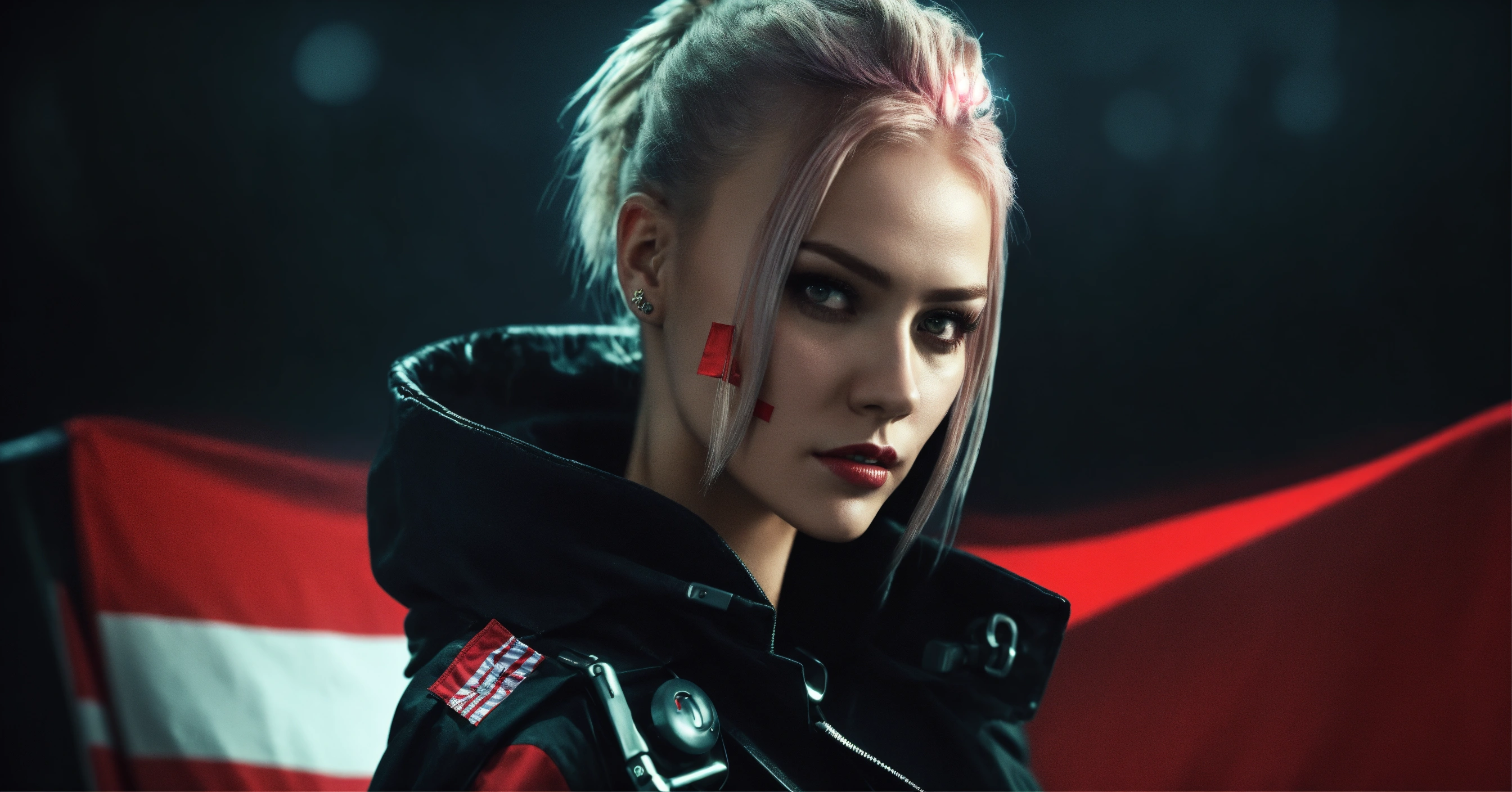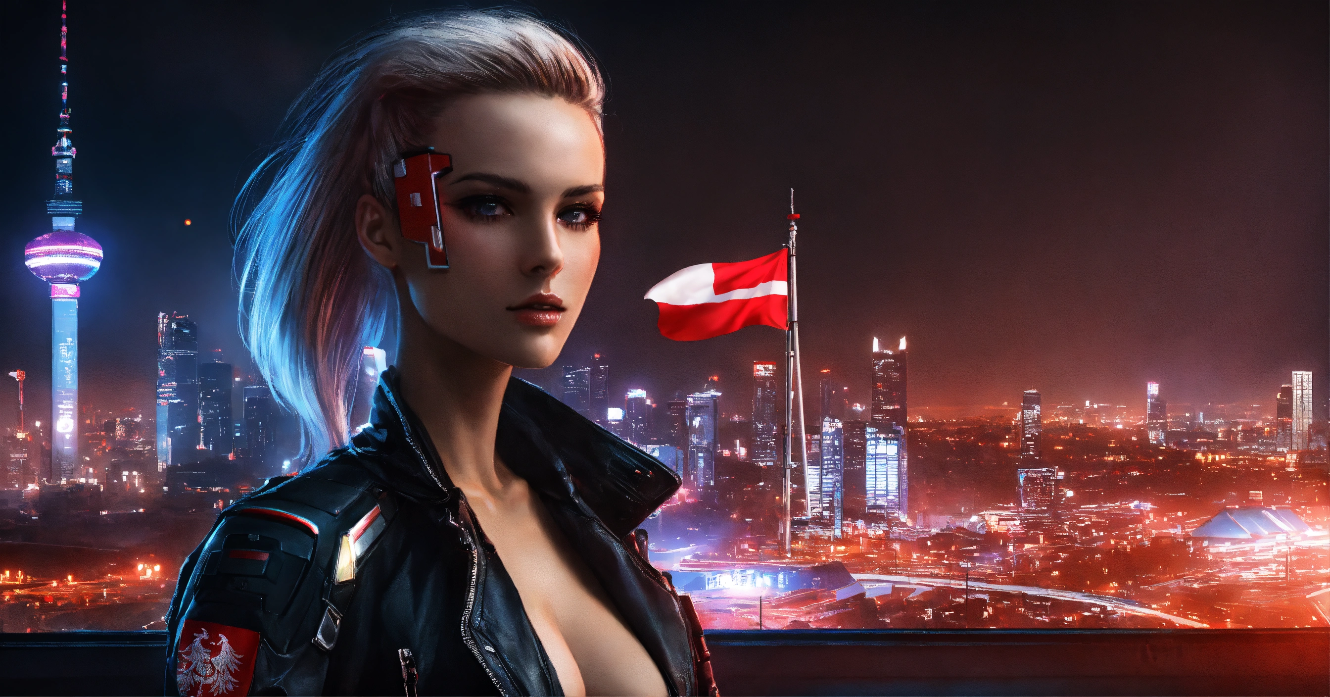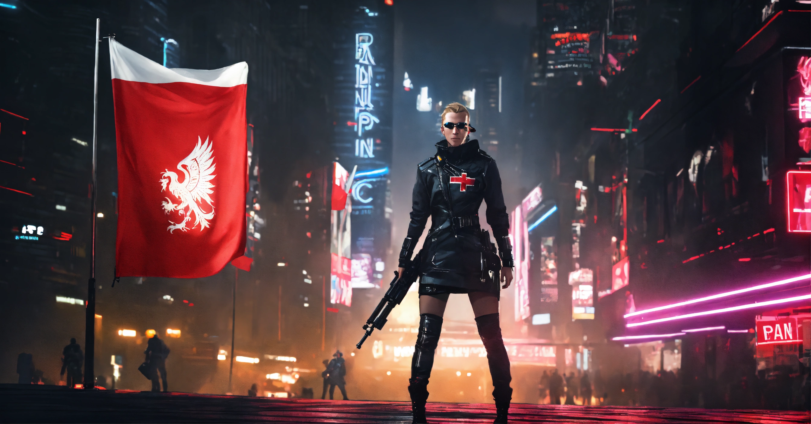 Cyberpunk style, woman nice man on cyberpunk, cyberpunk style, cyberpank city, add flag poland, black background, with poland flag, light hair, long legs looks at the camera