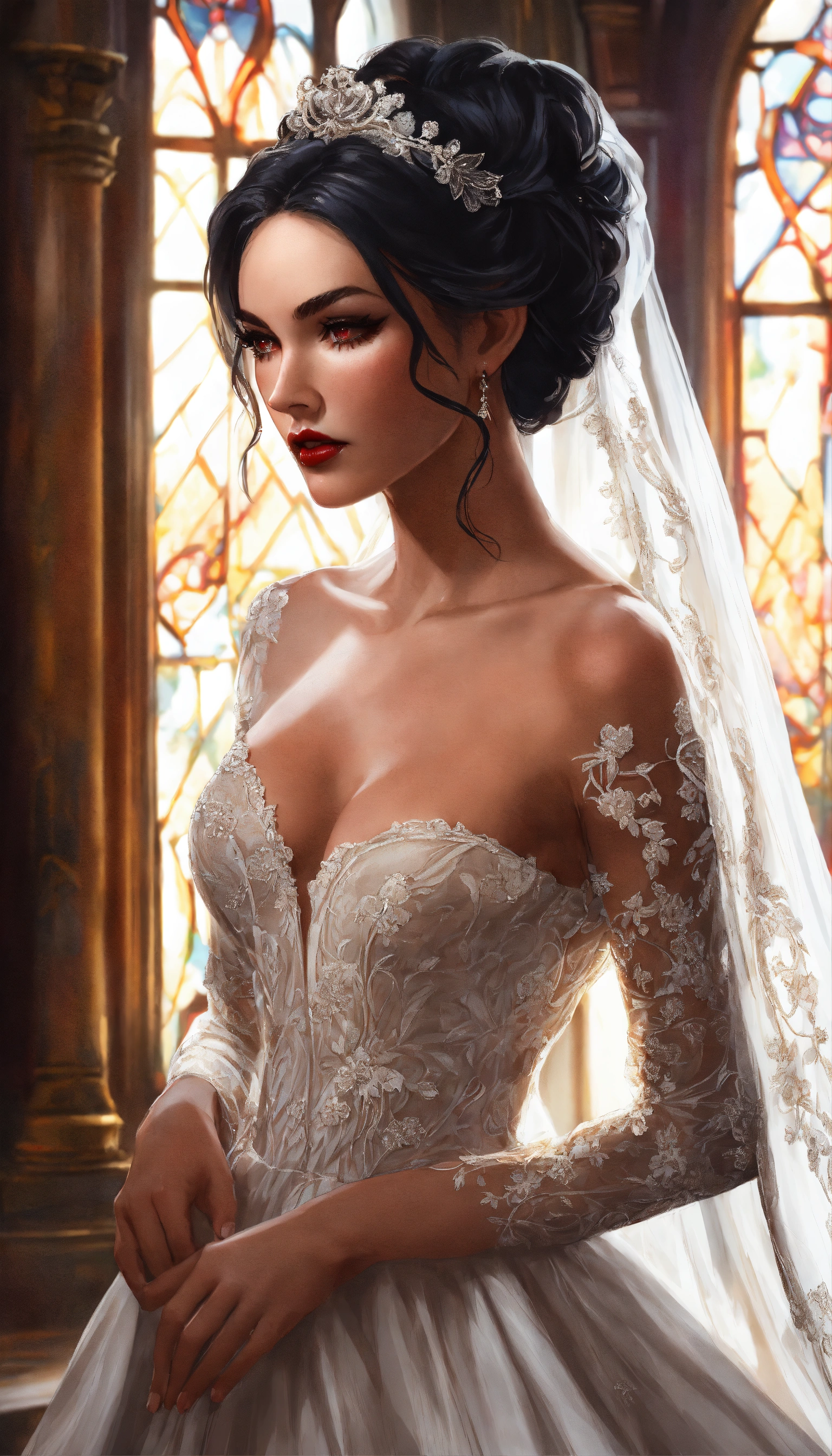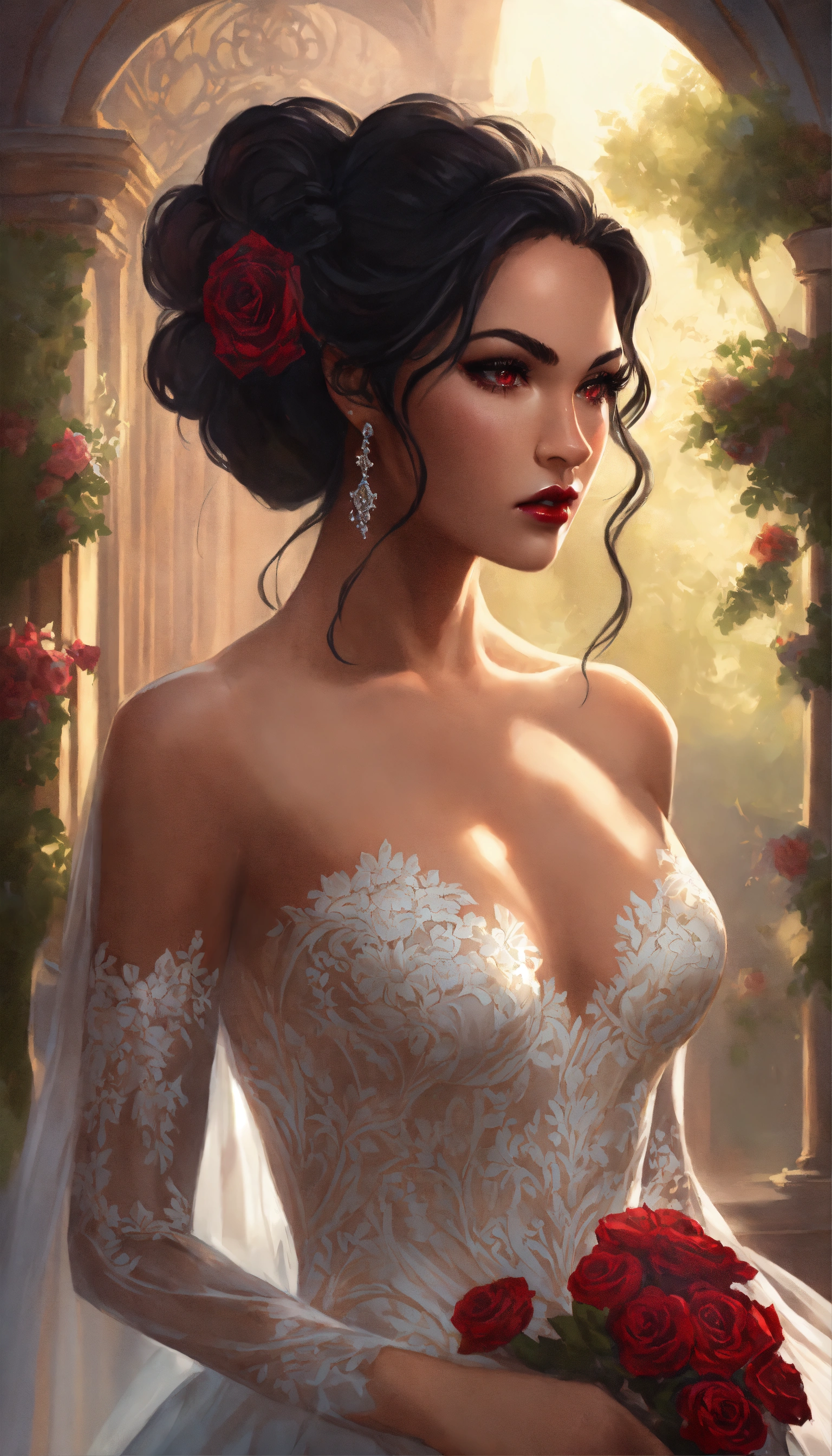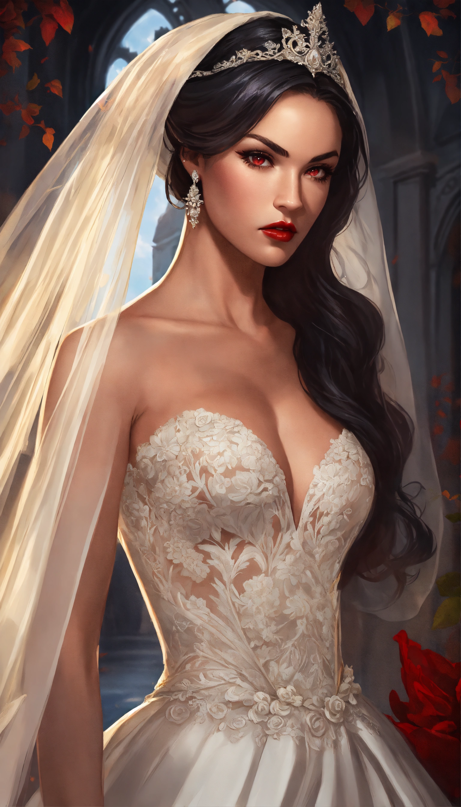 Concept art of ravenna, megan fox, glowing red eyes, curled voluminous flowing black hair in a formal wedding updo, hair in a bun, updo, bun, curled black hair tied up in a wedding bun, beautiful, tan skin, realistic, sabine rich, artgerm, j scott campbell, artgerm, perfect body, detailed, intricate, round face, slim nose, long black eyelashes, red lips, sharp jawline, perfect detailed face, realistic, floor length white veil, full body view, evil dark sorceress, gloomy grey castle background, gloomy dark flowers forest castle, white floor length fitted full skirts a-line bridal gown, low cut neckline, gold high heels, voluminous curled long hair, white train veil, a-line bridal gown, very long ivory long veil and hair tied up, ivory fitted bridal gown, big voluminous long train full skirt gown, forest, yennefer, zuhair murad bridal, zuhair murad bridal a-line gown, ivory patterned textured silk shimmer fabric embroidered dress, train wedding dress, full body view, lace long sleeves